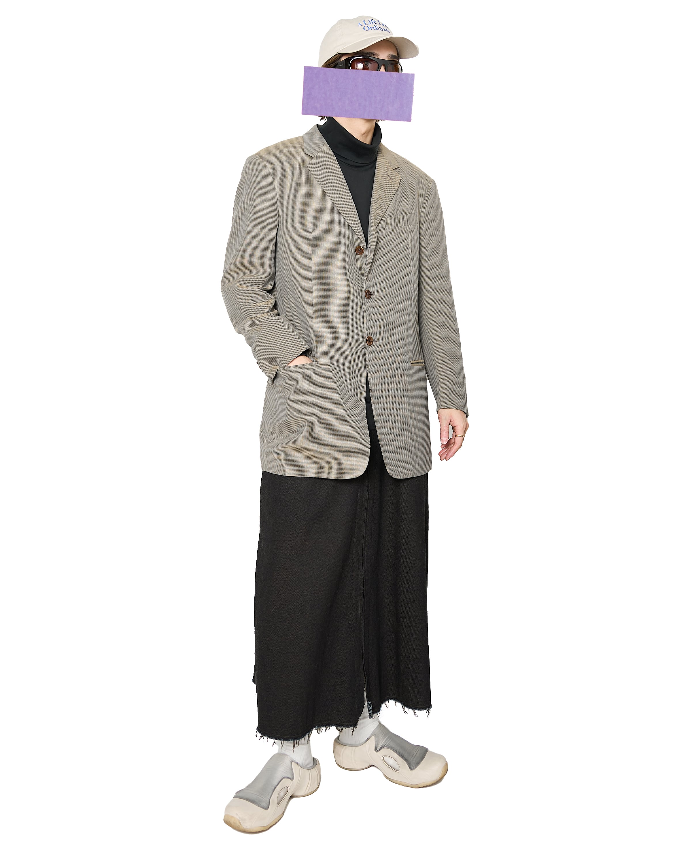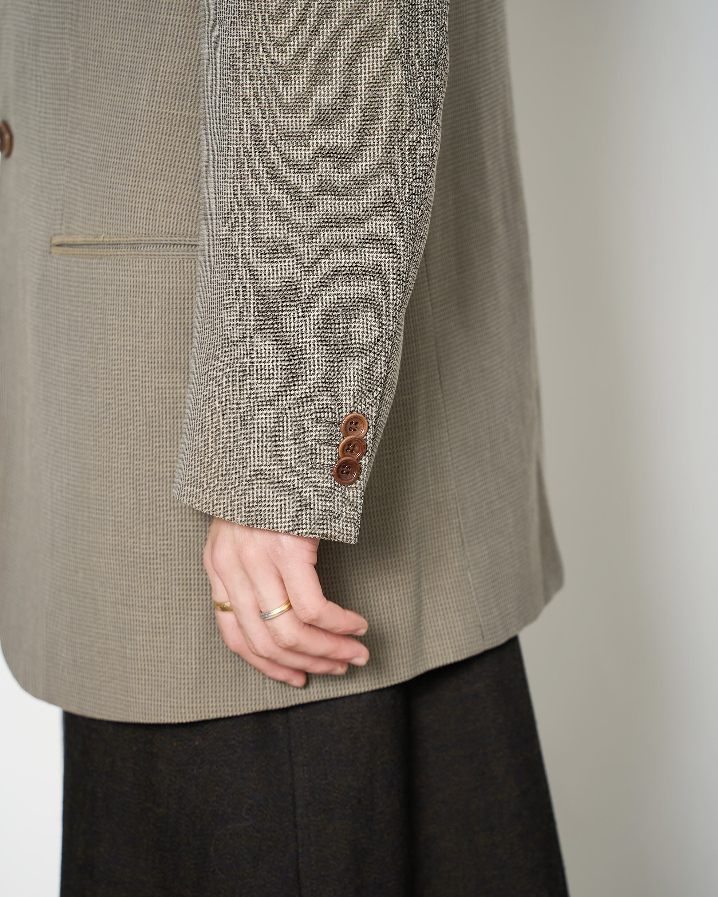 雰囲気のいいドビー織りのシングルブレステッド。古くはありませんが、ヴィンテージのような雰囲気を持ち、やりすぎていないフォルムがスタイリングにすんなり溶け込んでくれます。