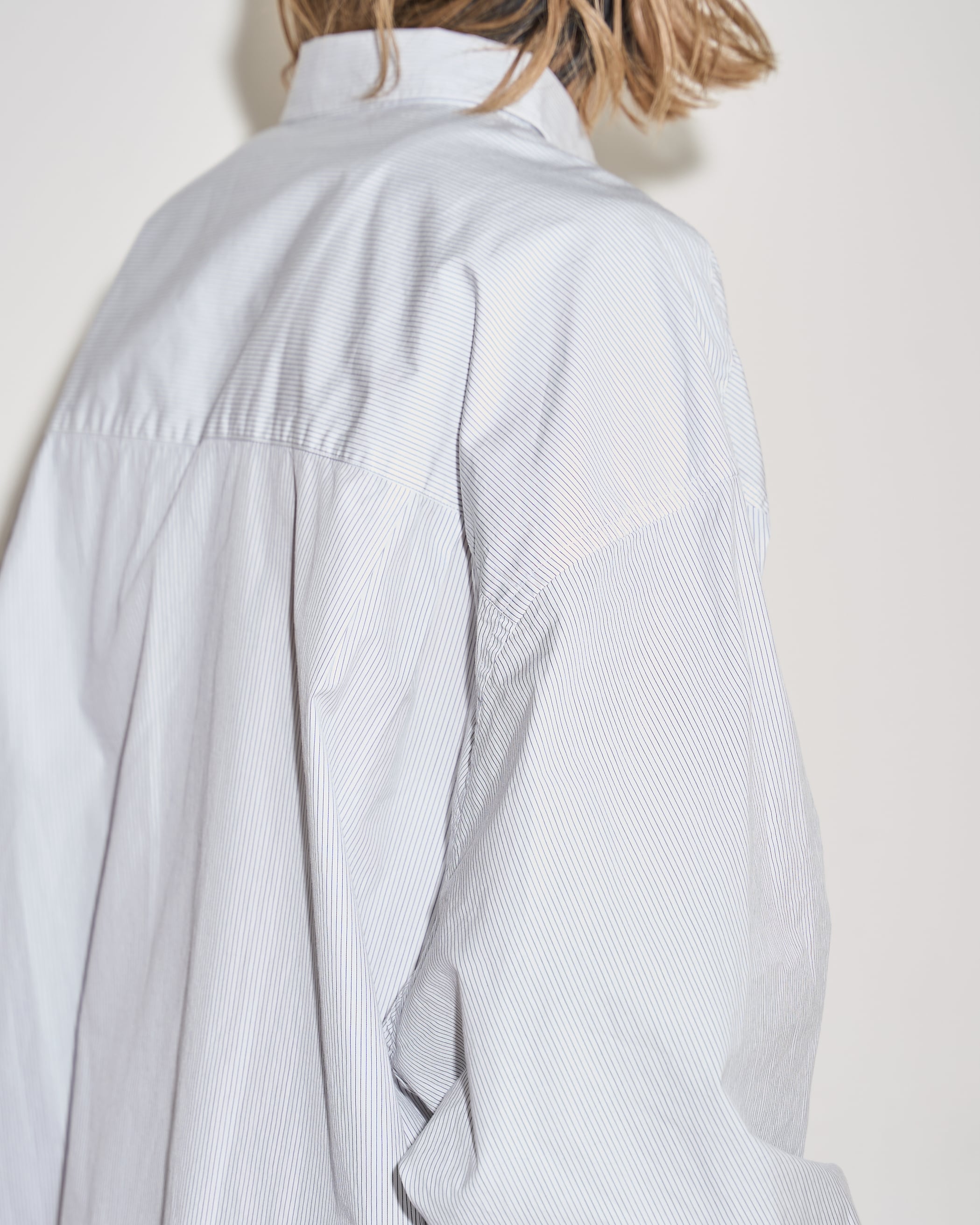 肩を落とし、ルーズに仕上げたオーバーサイズシャツ。背中にはタックを余分に取り、袖には別地でパッチを施しているのもアクセントに。サイズ4まで仕入れているので、夏場の羽織感覚でもどうぞ。