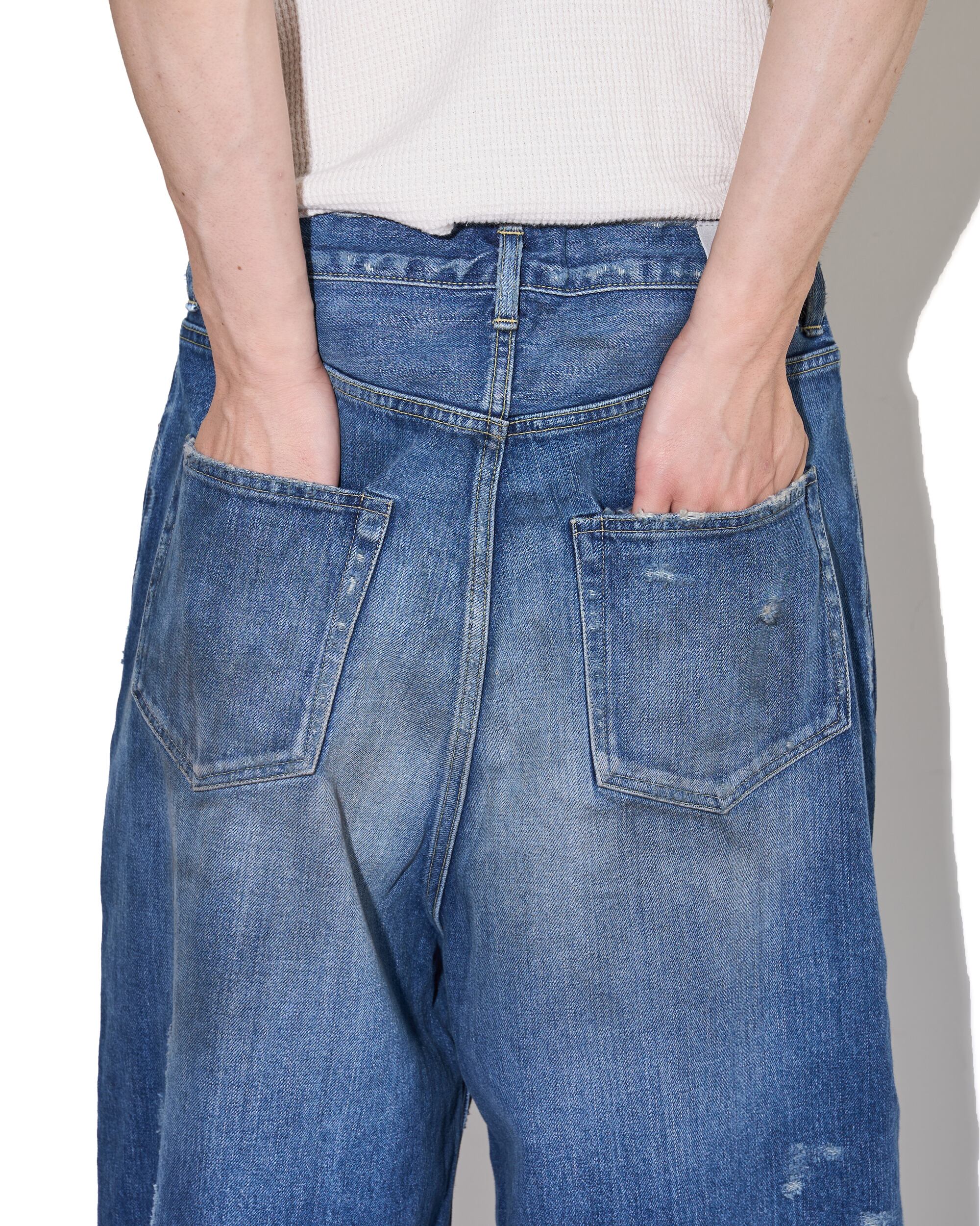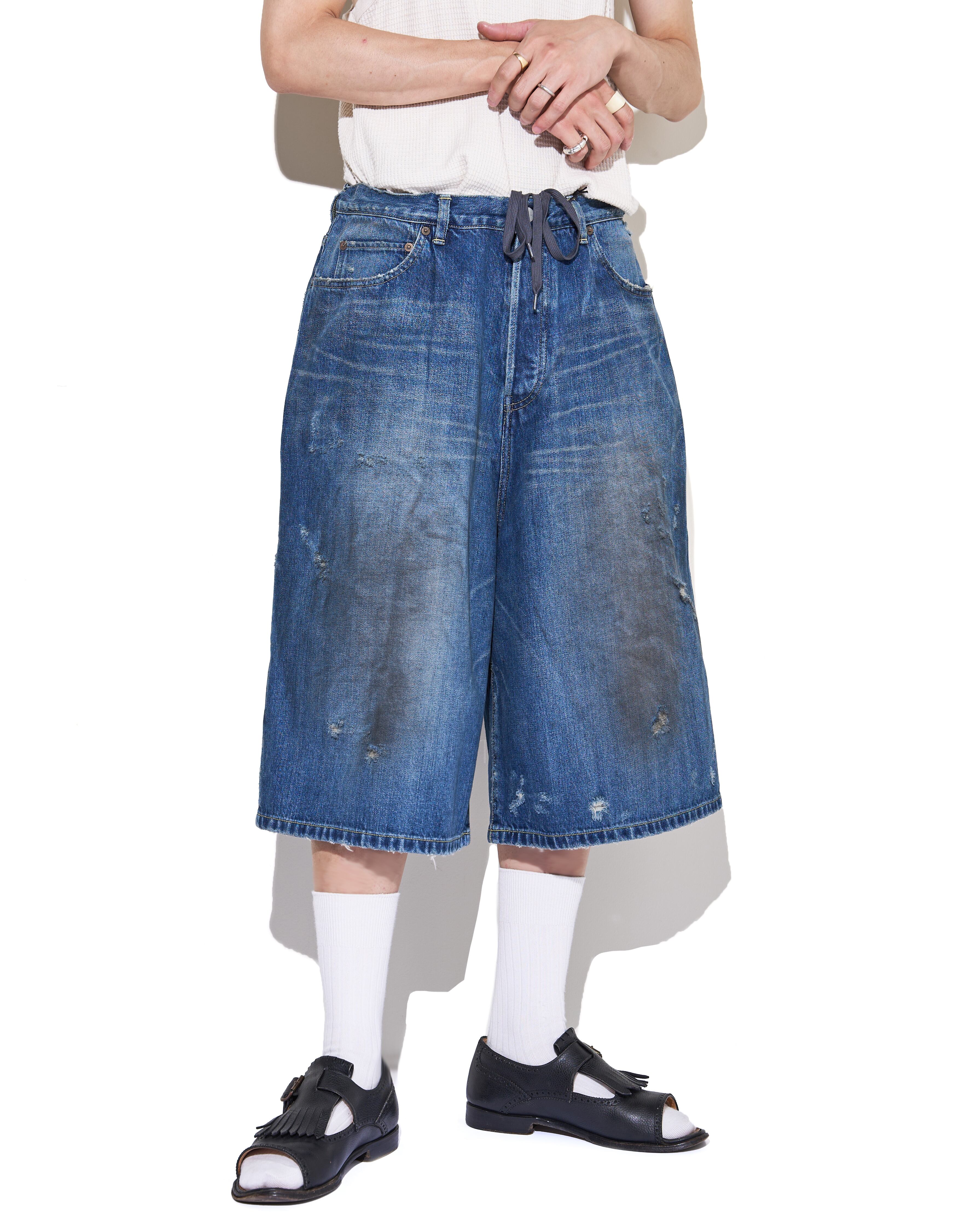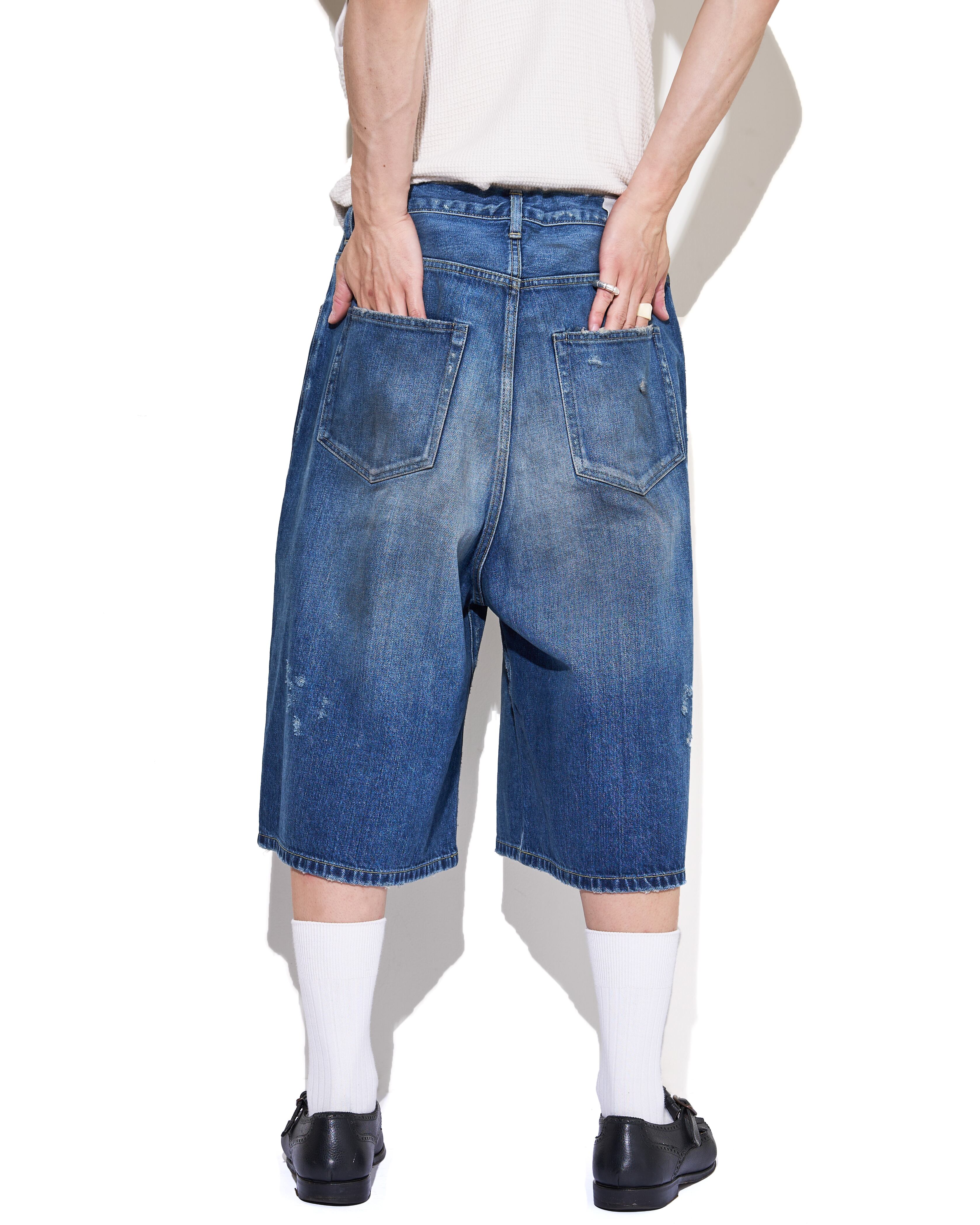 ダメージ、ヴィンテージフェード加工を施した新型のデニムショーツ。旧式力織機でゆっくりと時間をかけて織られたヴィンテージの表情が特徴の硫化染めロープ染色を施したデニム生地を使用し、タテのムラ糸はシャープな形状で、エイジングにより、リアルな色落ち感が出ています。ワイドシルエットでやや長めの丈に設定されているので、ブーツと合わせても素敵です。