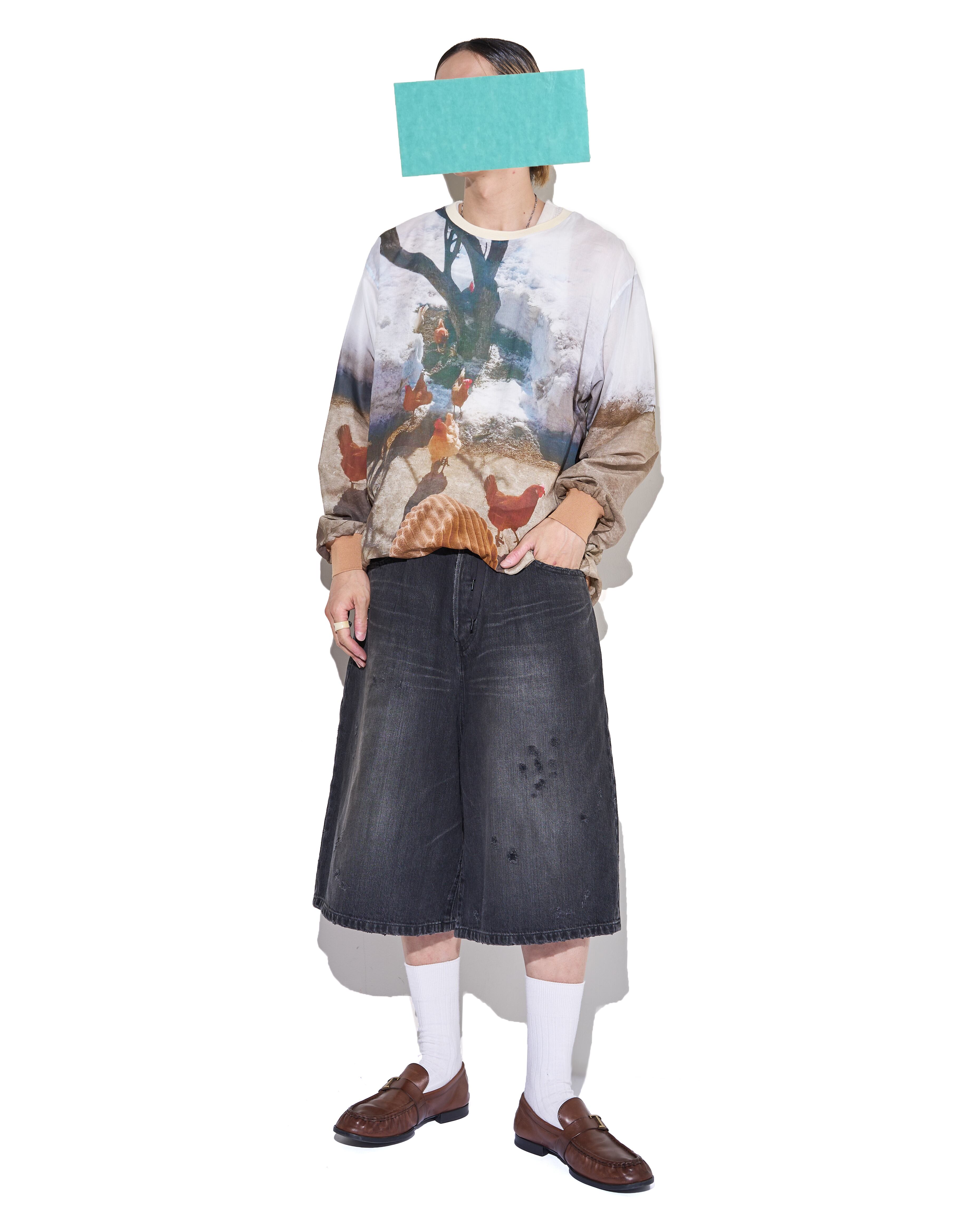 ダメージ、ヴィンテージフェード加工を施した新型のデニムショーツ。旧式力織機でゆっくりと時間をかけて織られたヴィンテージの表情が特徴の硫化染めロープ染色を施したデニム生地を使用し、タテのムラ糸はシャープな形状で、エイジングにより、リアルな色落ち感が出ています。ワイドシルエットでやや長めの丈に設定されているので、ブーツと合わせても素敵です。