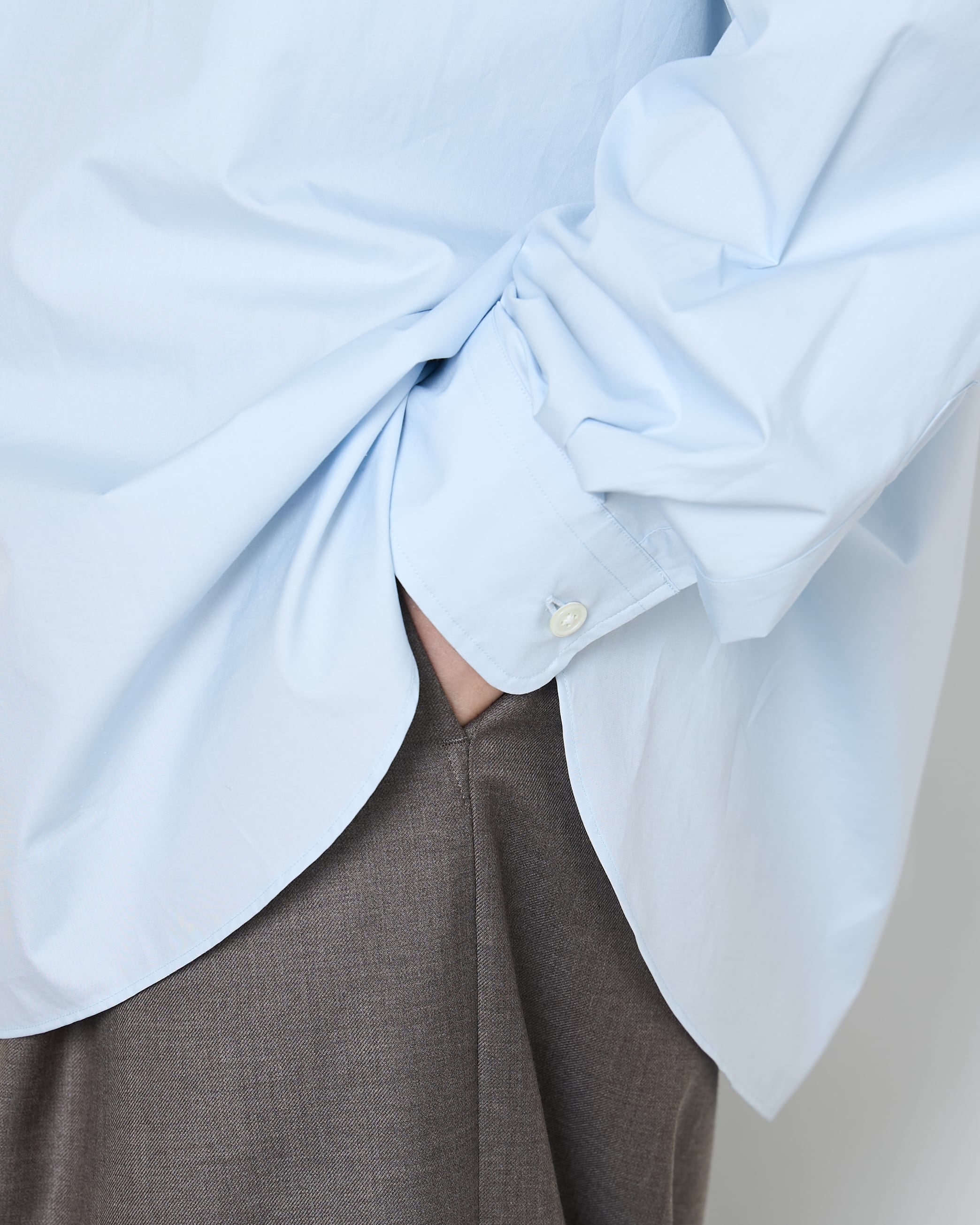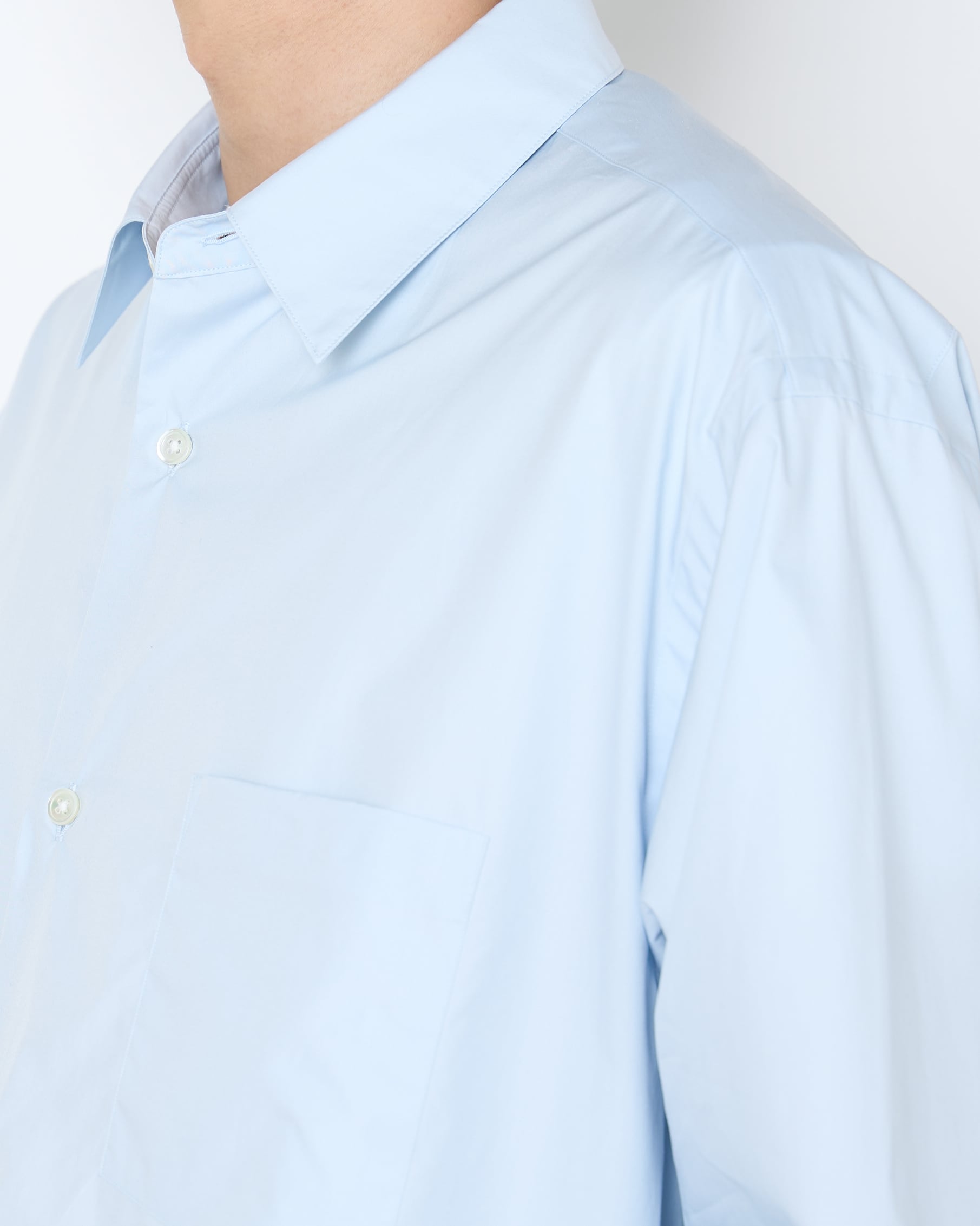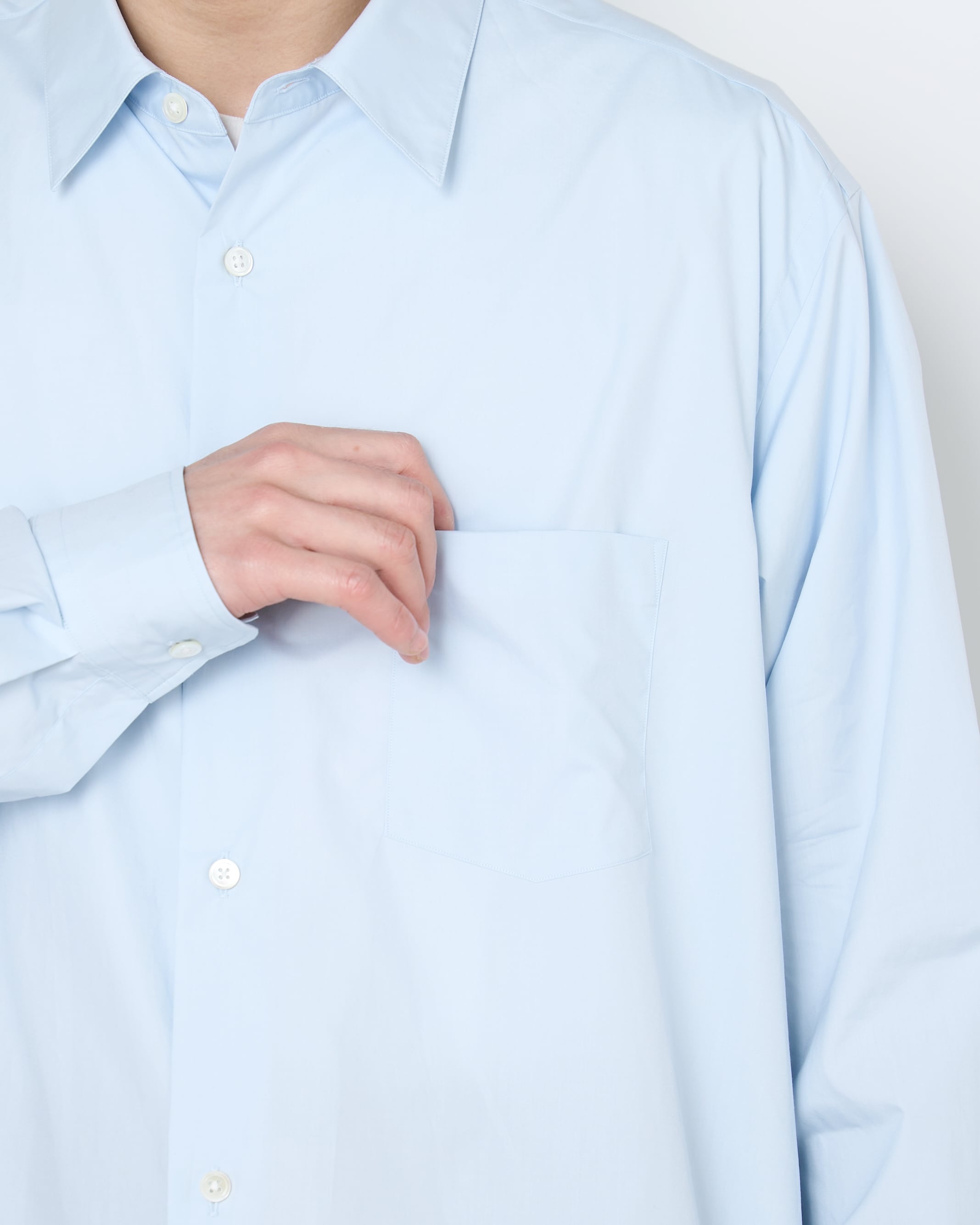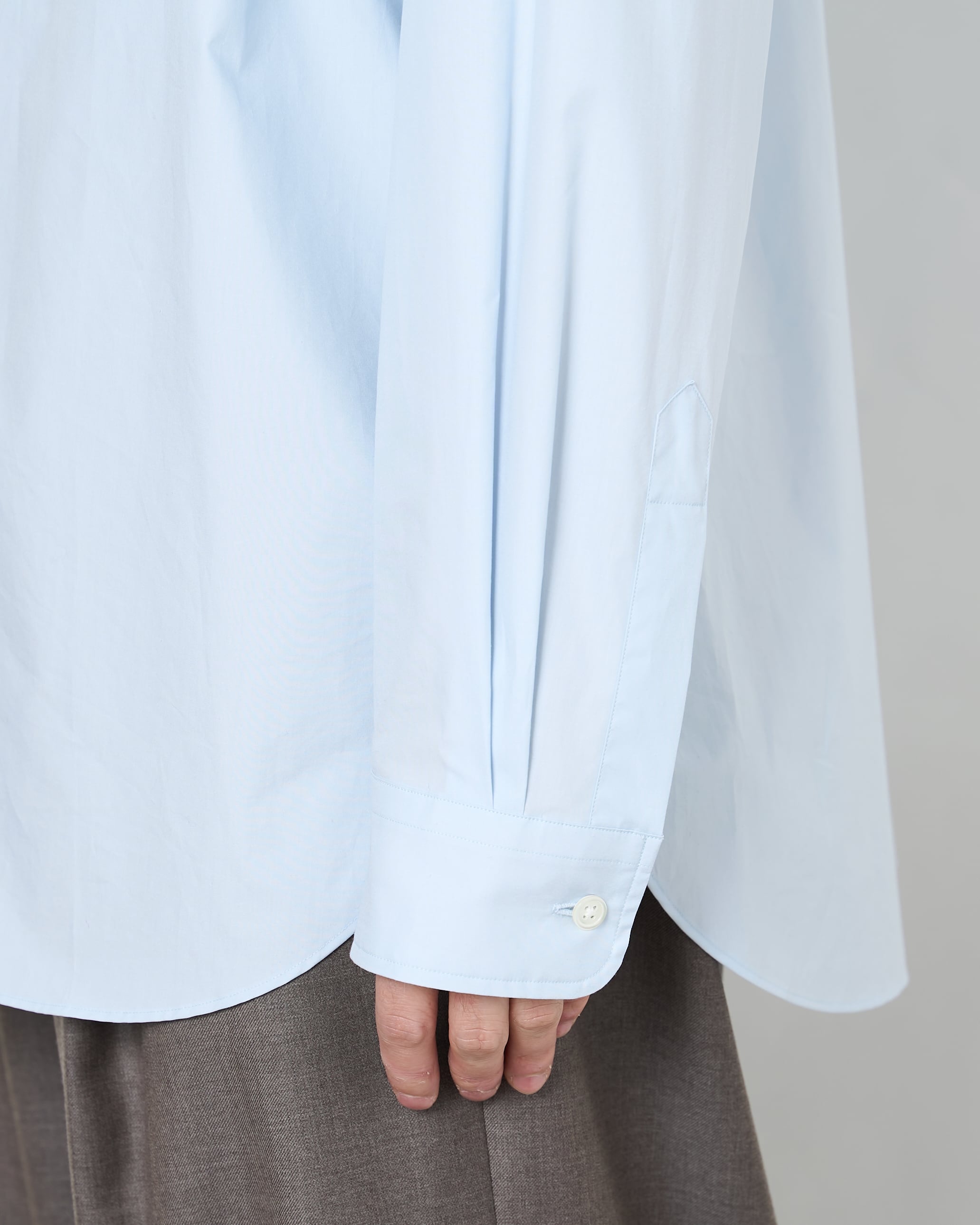 定番で展開しているスビンコットンを使用した、上品な光沢のあるオーバーサイズシャツ。目面の美しいドレッシーな仕上がりで、新色の薄いサックスブルーが差し色に最適です。ホワイトのシャツと同じ容量で使っていただくと、もっと魅力を感じていただけるはず。