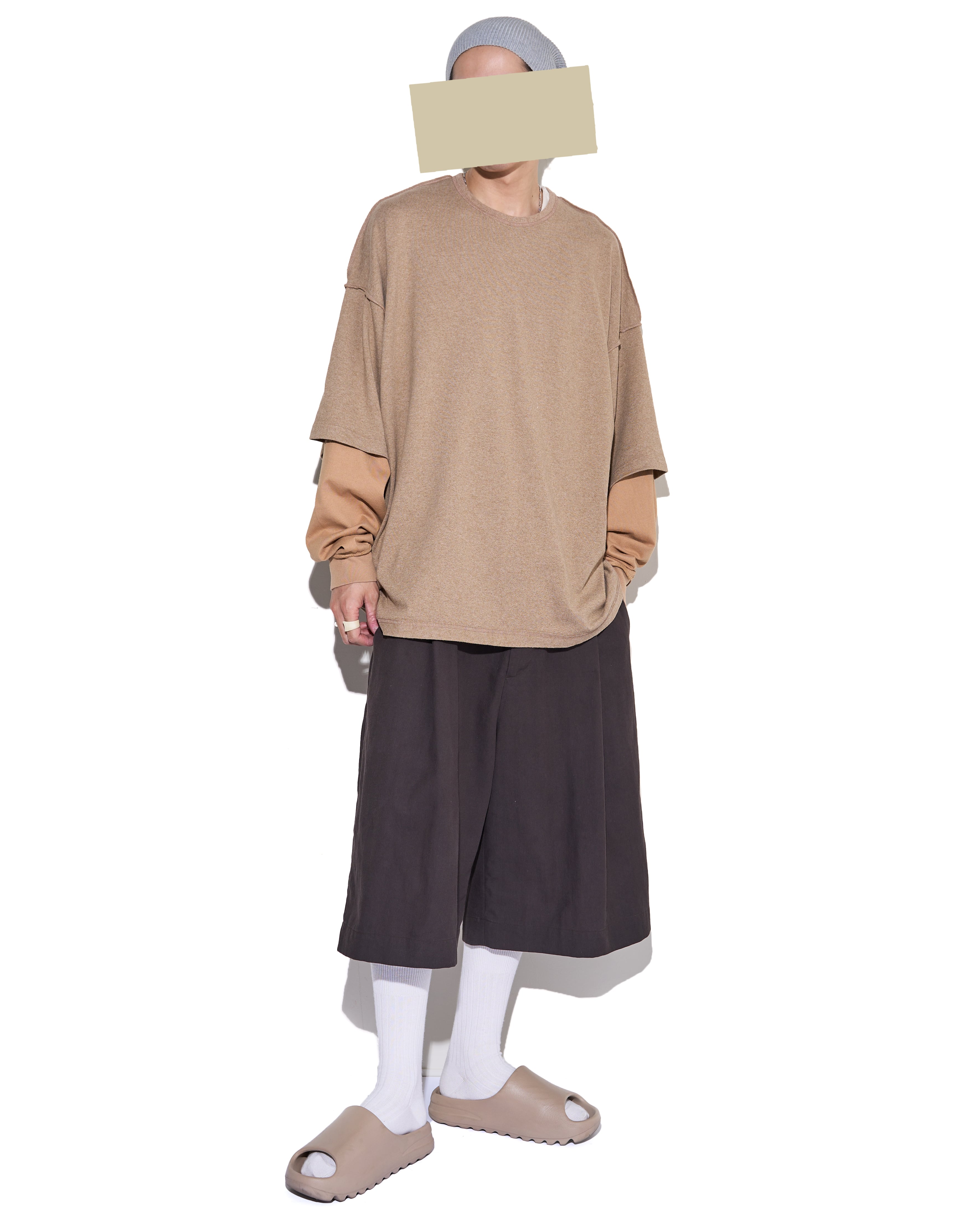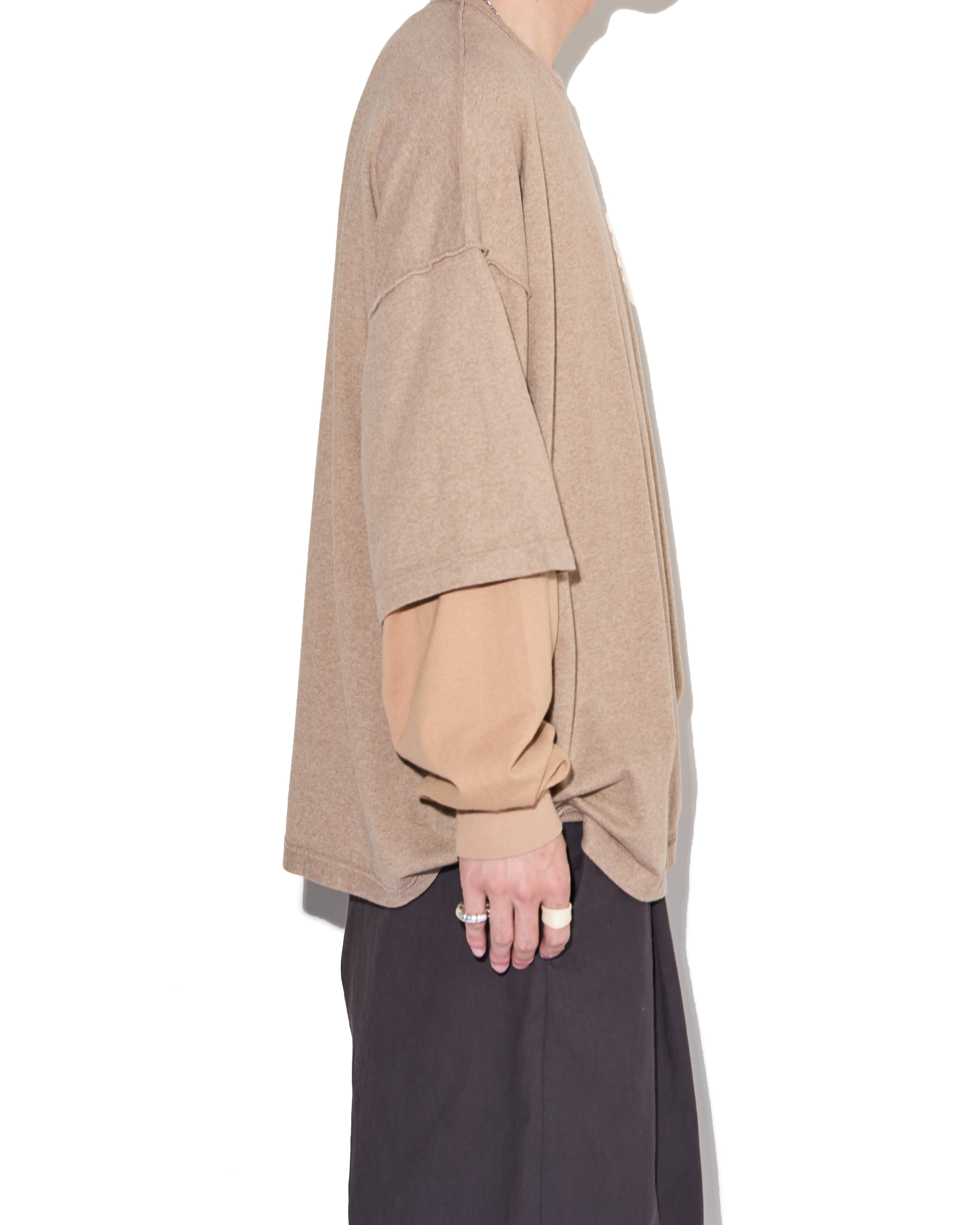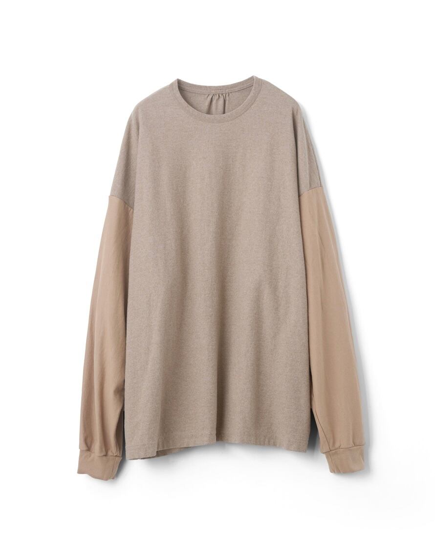 リバーシブル仕様のオーバーサイズロンTee。BEIGEは同色ながら異なる生地で色のコントラストもあり、NAVYはメリハリのあるベースボールTeeのように仕上がっています。ドライな質感で夏からもお使いいただける一着。