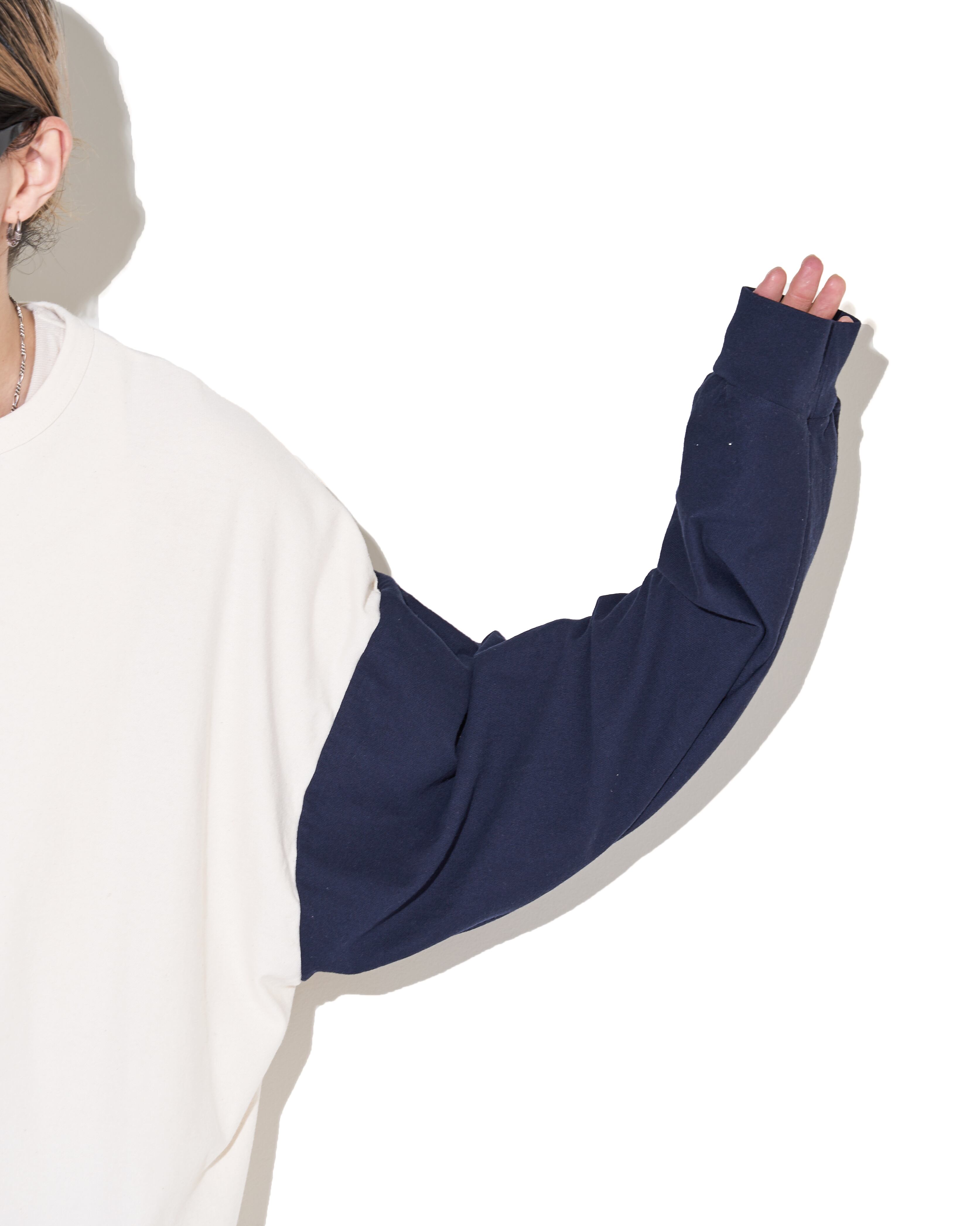 リバーシブル仕様のオーバーサイズロンTee。BEIGEは同色ながら異なる生地で色のコントラストもあり、NAVYはメリハリのあるベースボールTeeのように仕上がっています。ドライな質感で夏からもお使いいただける一着。