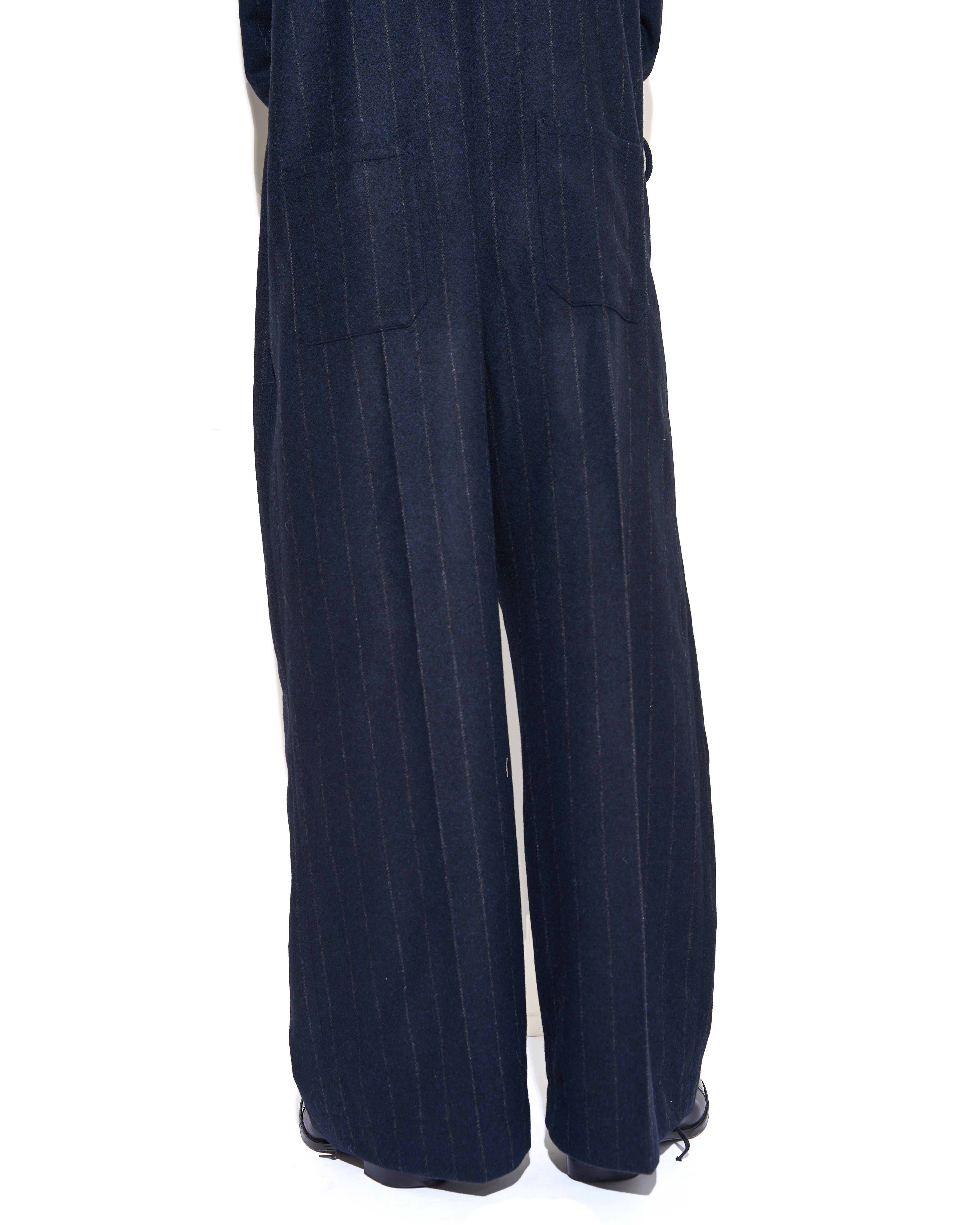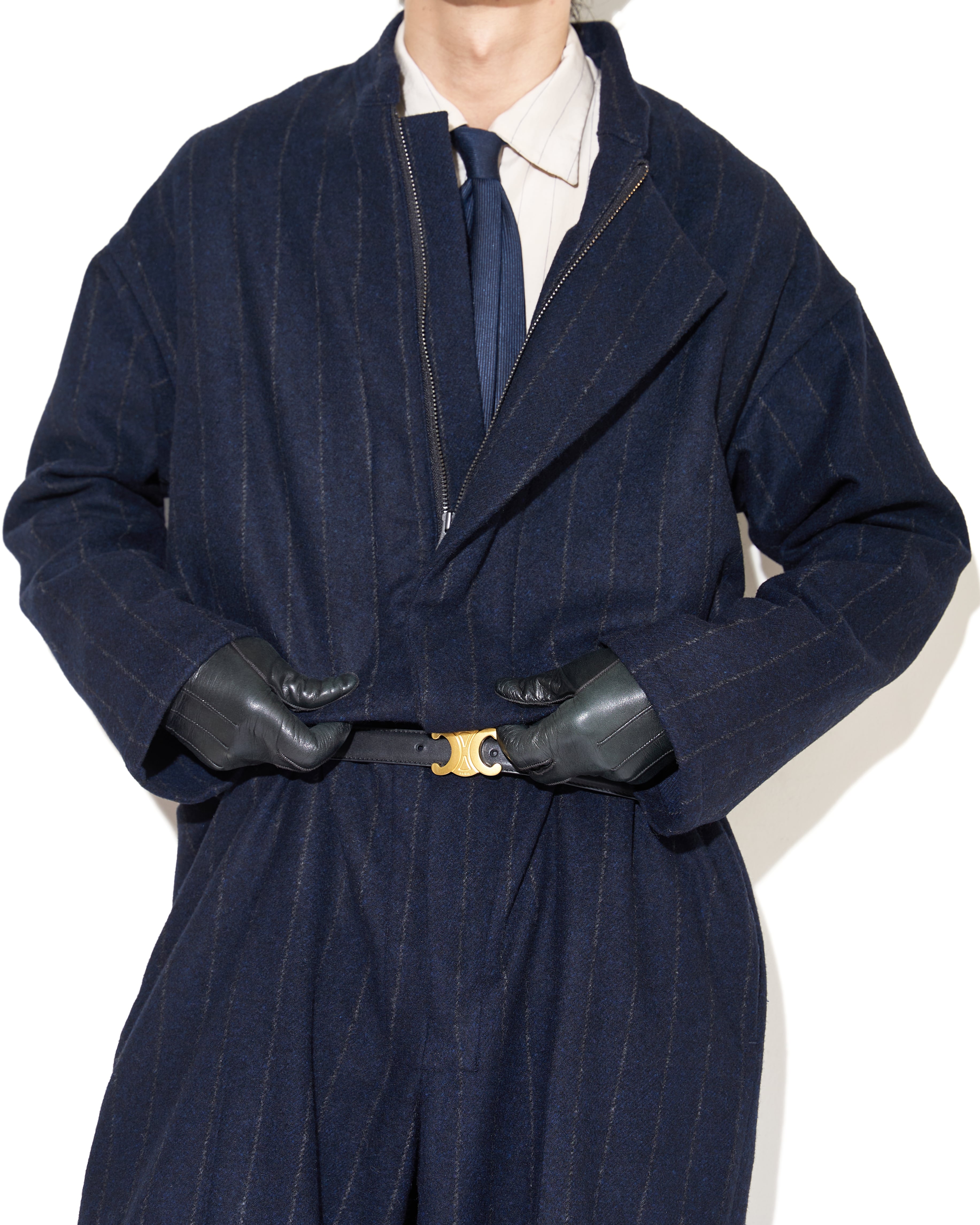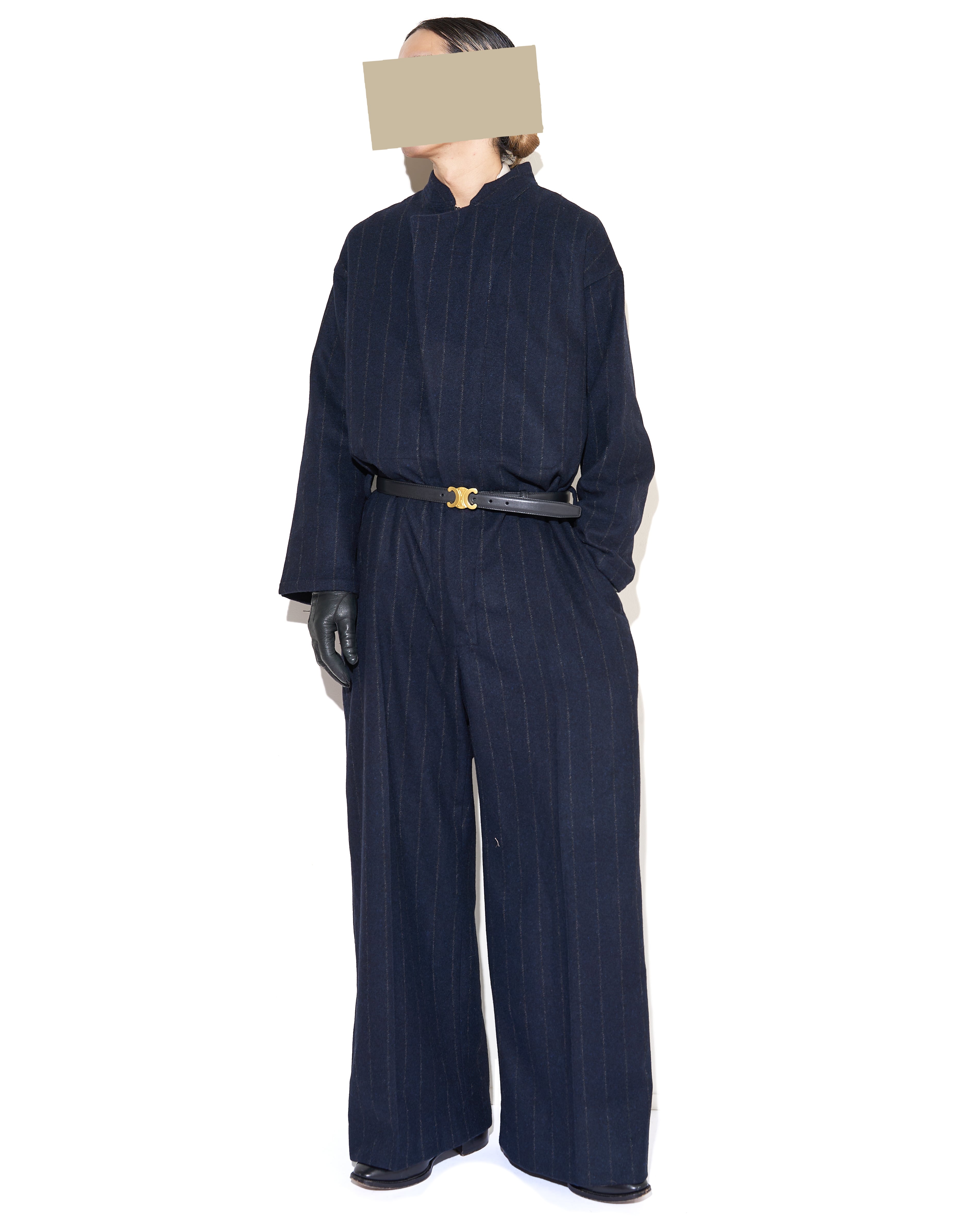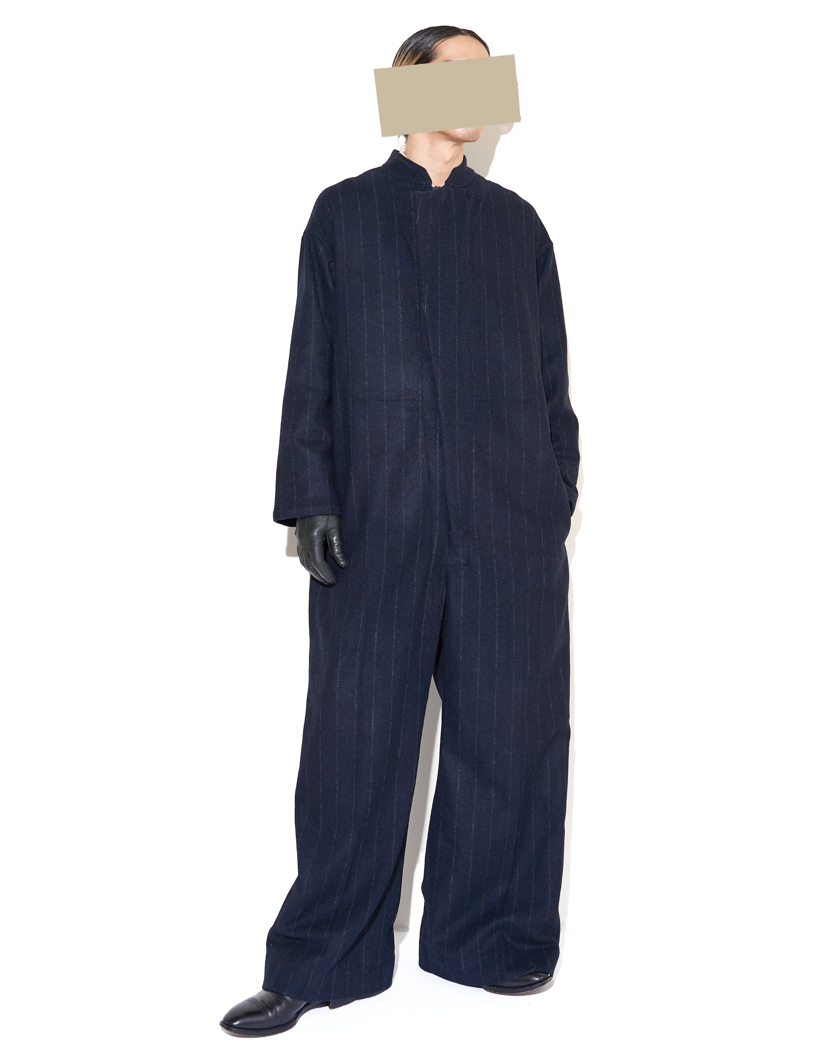 ネイビーストライプのデッドストック生地を使用したロングスリーブのジャンプスーツ。片方のみラペルのついたデザインになっており、スタンドカラーながら開くと綺麗なVゾーンに。シャツやタイドアップなど、さまざまな見せ方ができるのも強みな、モードとカジュアルの中間を指すような1着です。また、ジップはダブルジップになり下からも開くようにアップデートされているので、日常的な使いやすさも魅力的。