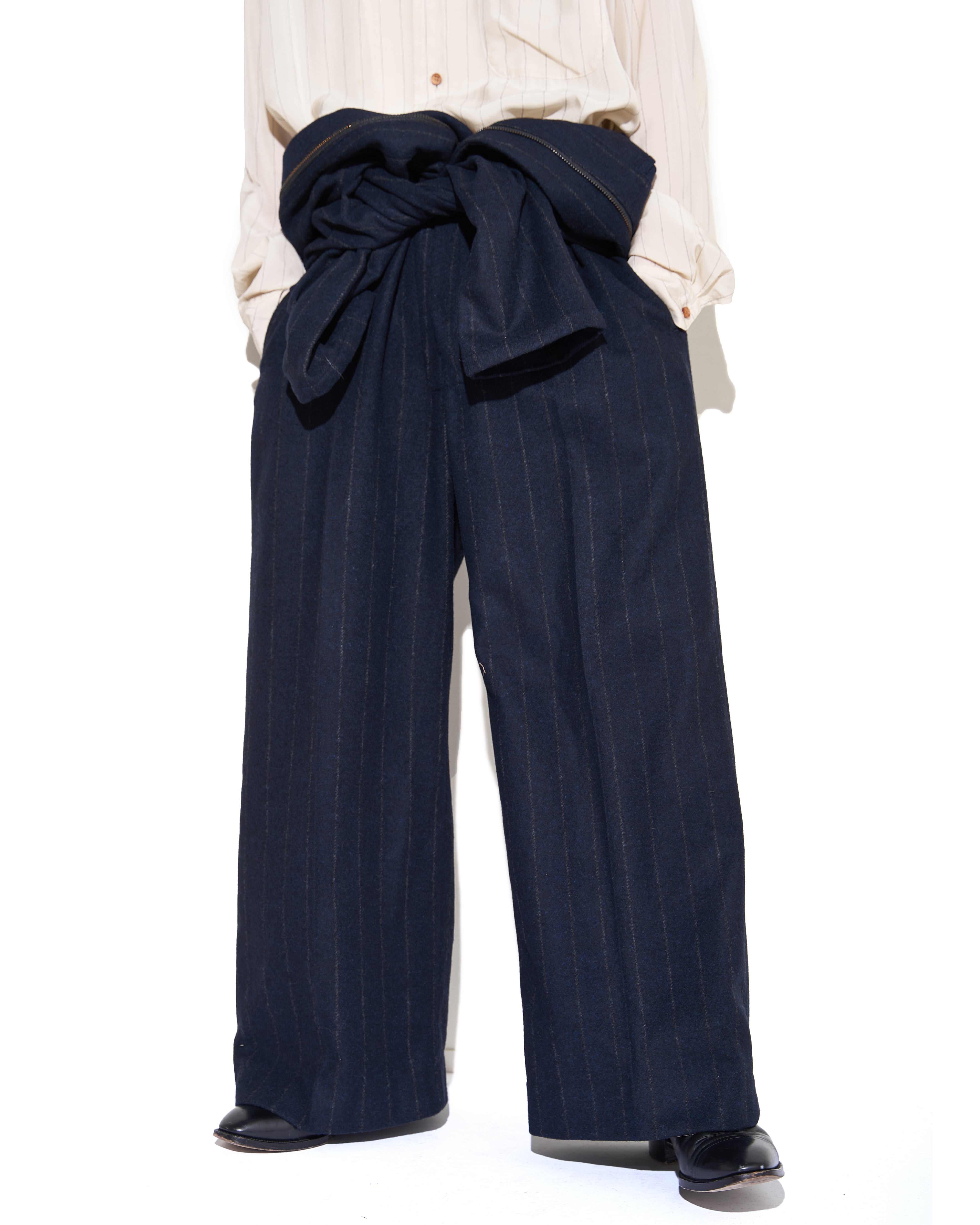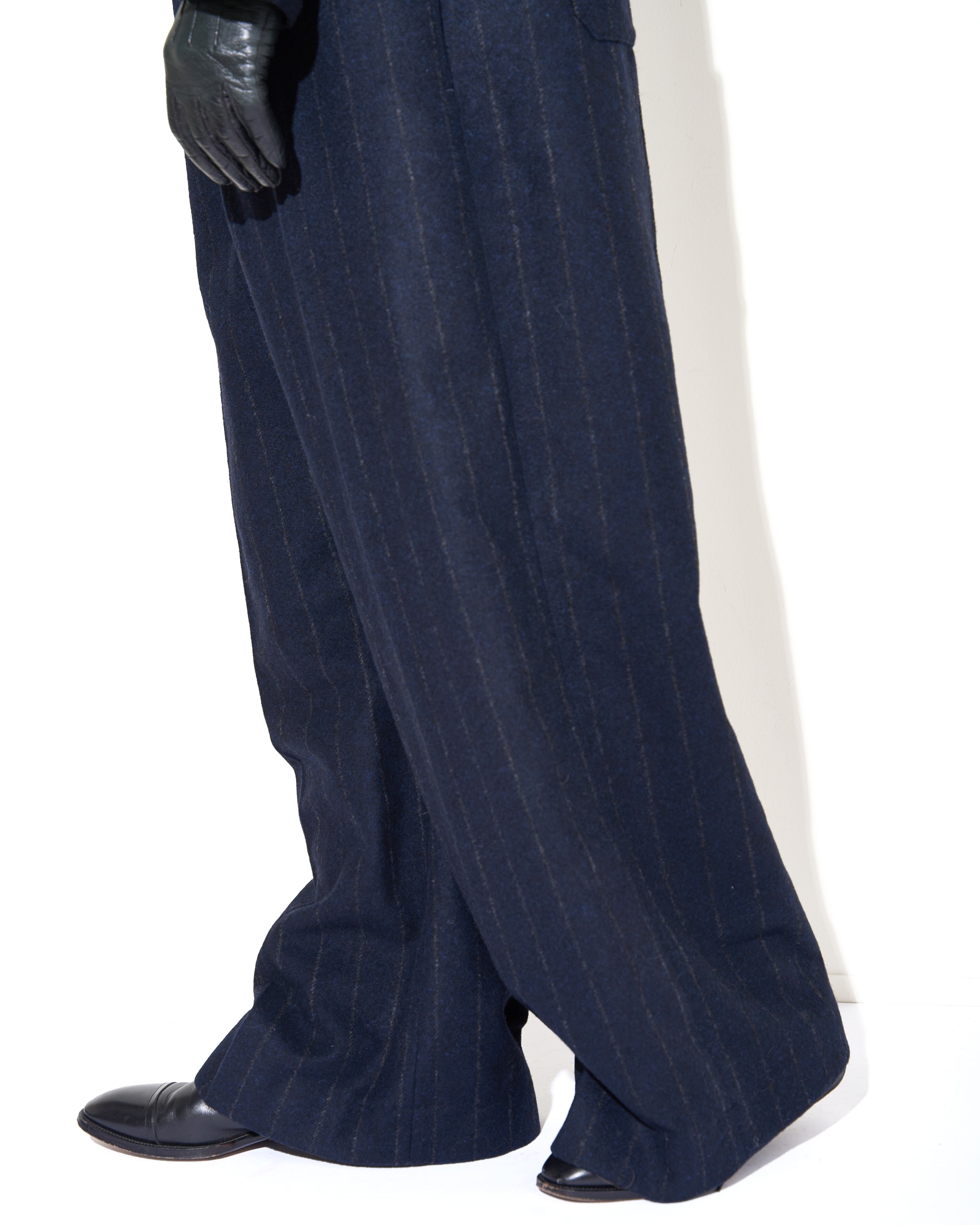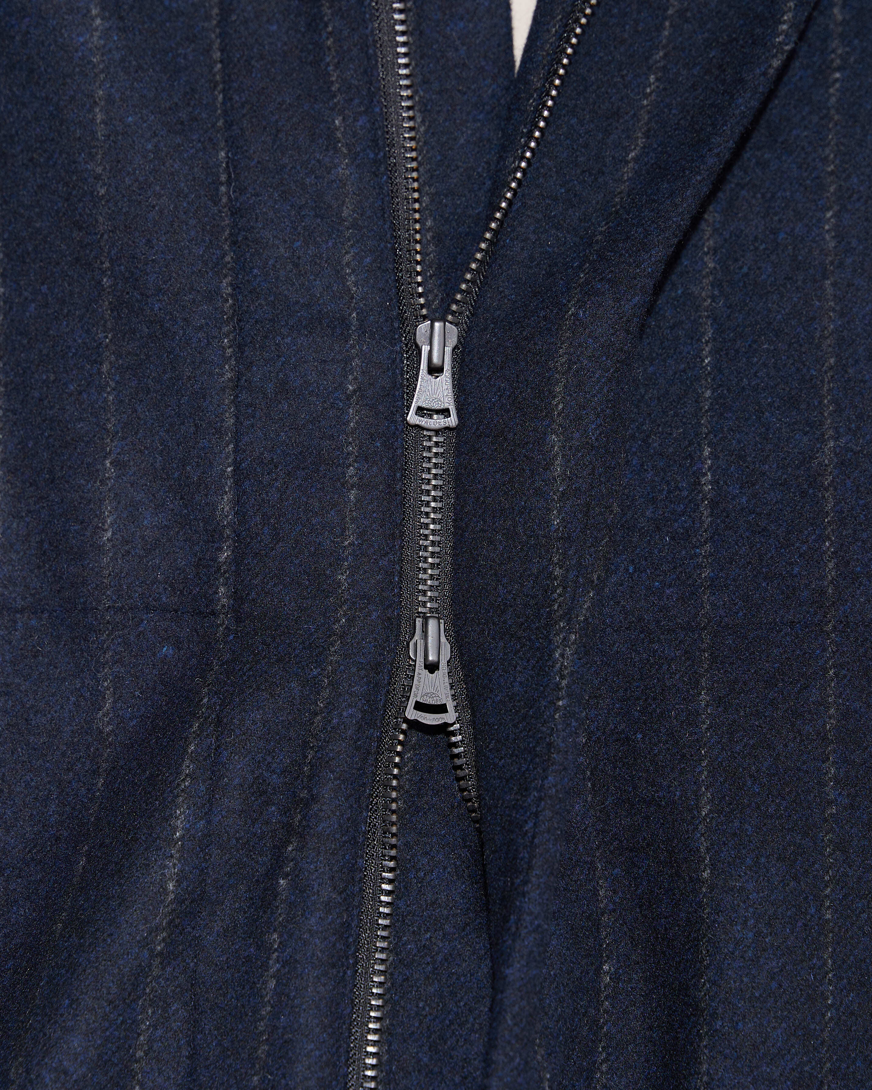 ネイビーストライプのデッドストック生地を使用したロングスリーブのジャンプスーツ。片方のみラペルのついたデザインになっており、スタンドカラーながら開くと綺麗なVゾーンに。シャツやタイドアップなど、さまざまな見せ方ができるのも強みな、モードとカジュアルの中間を指すような1着です。また、ジップはダブルジップになり下からも開くようにアップデートされているので、日常的な使いやすさも魅力的。