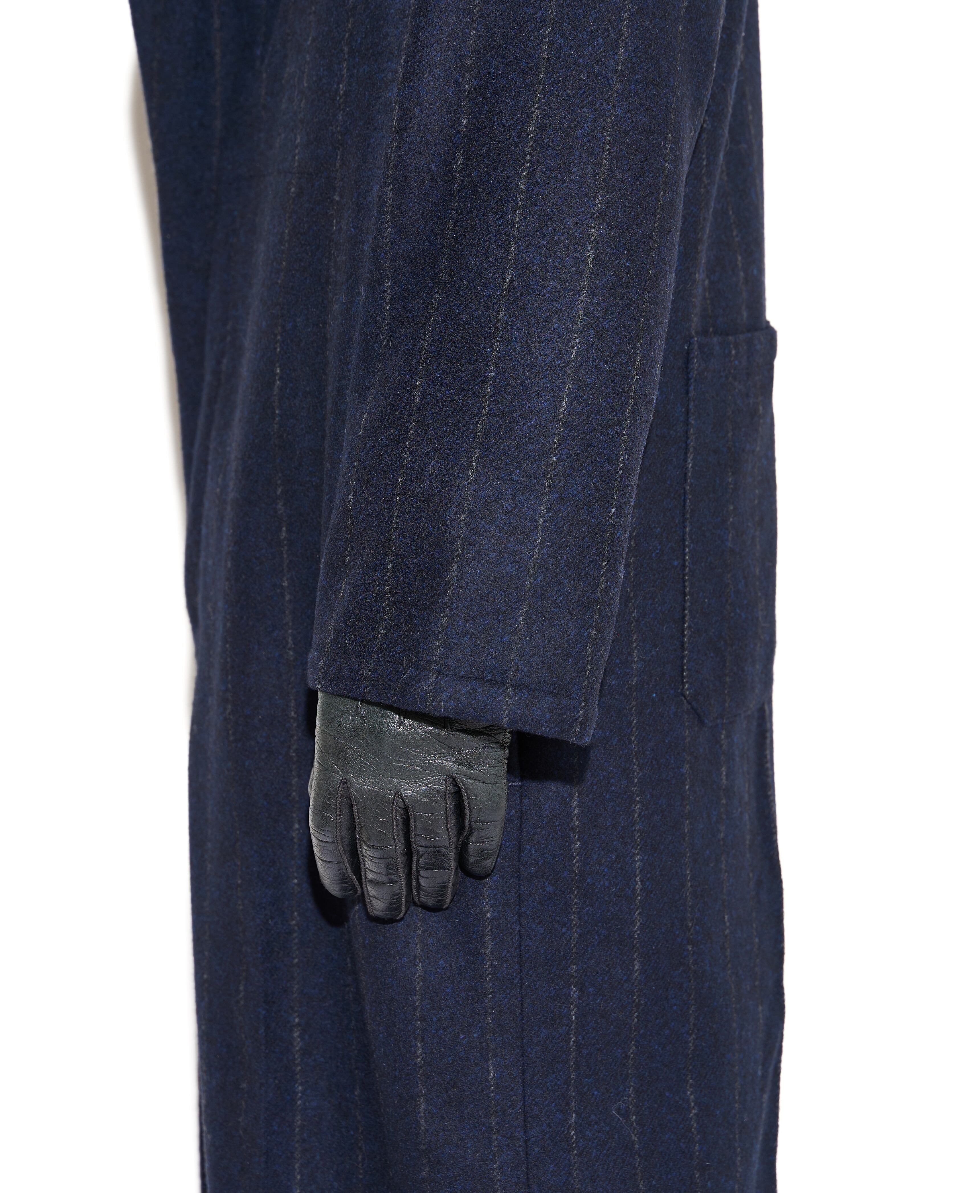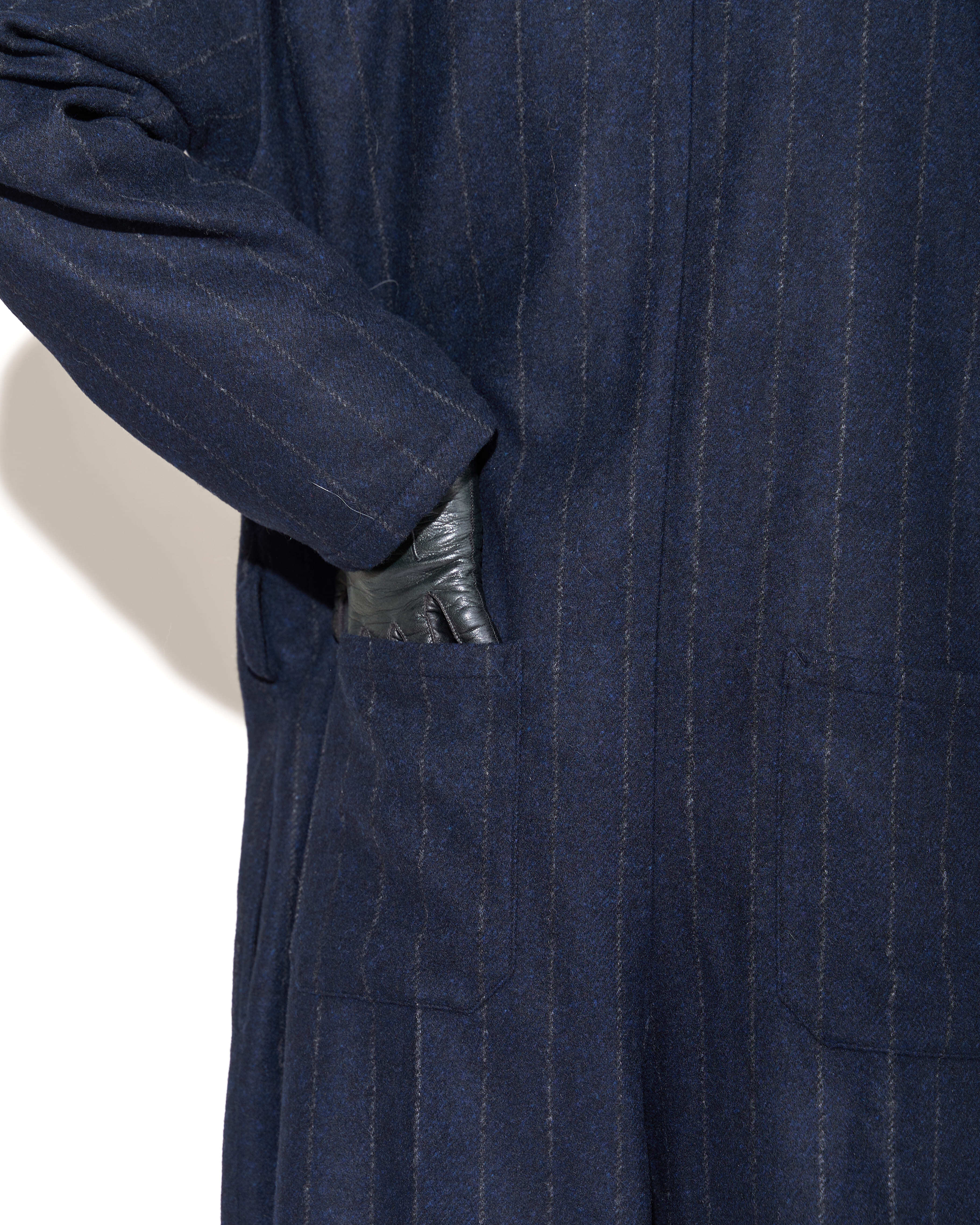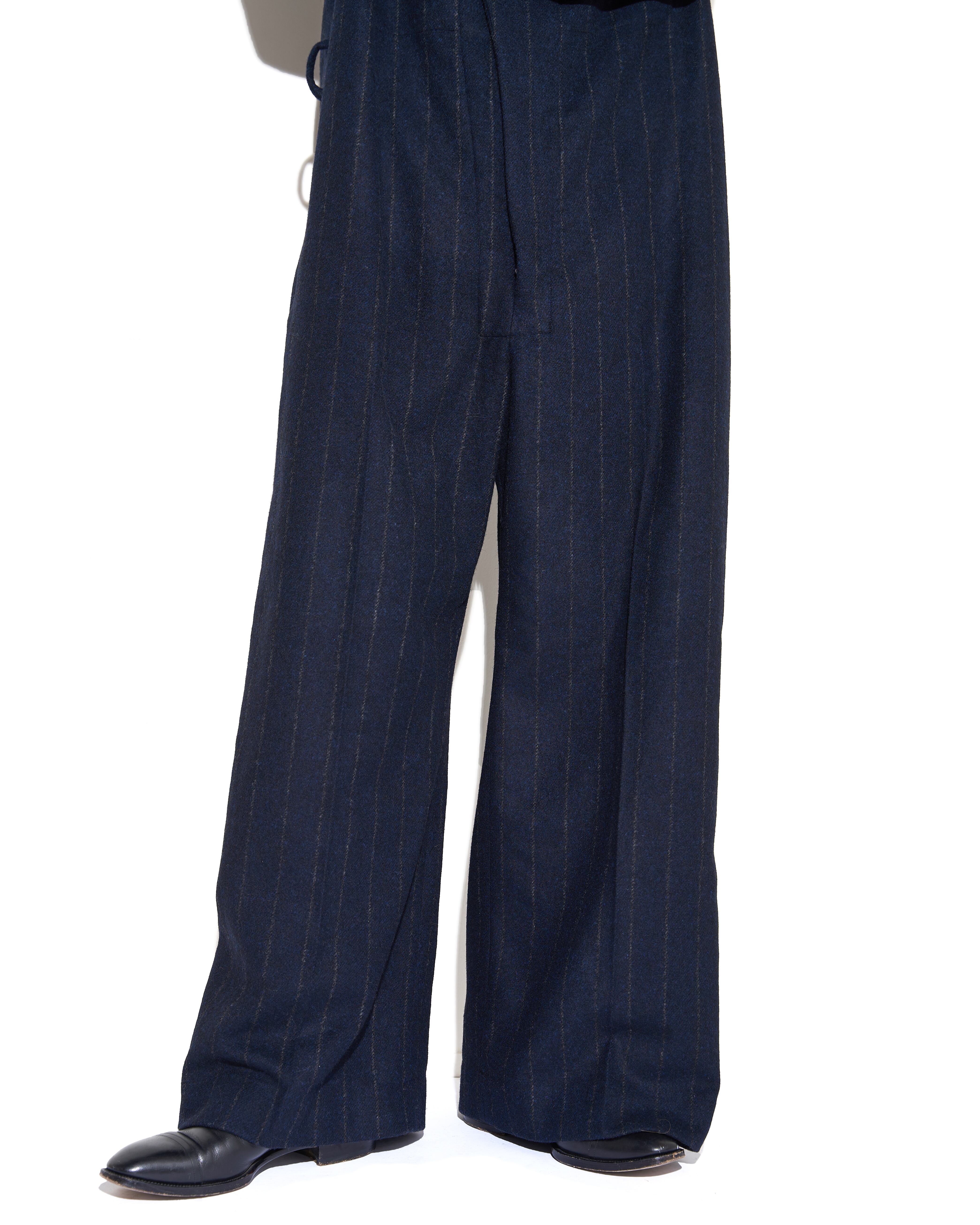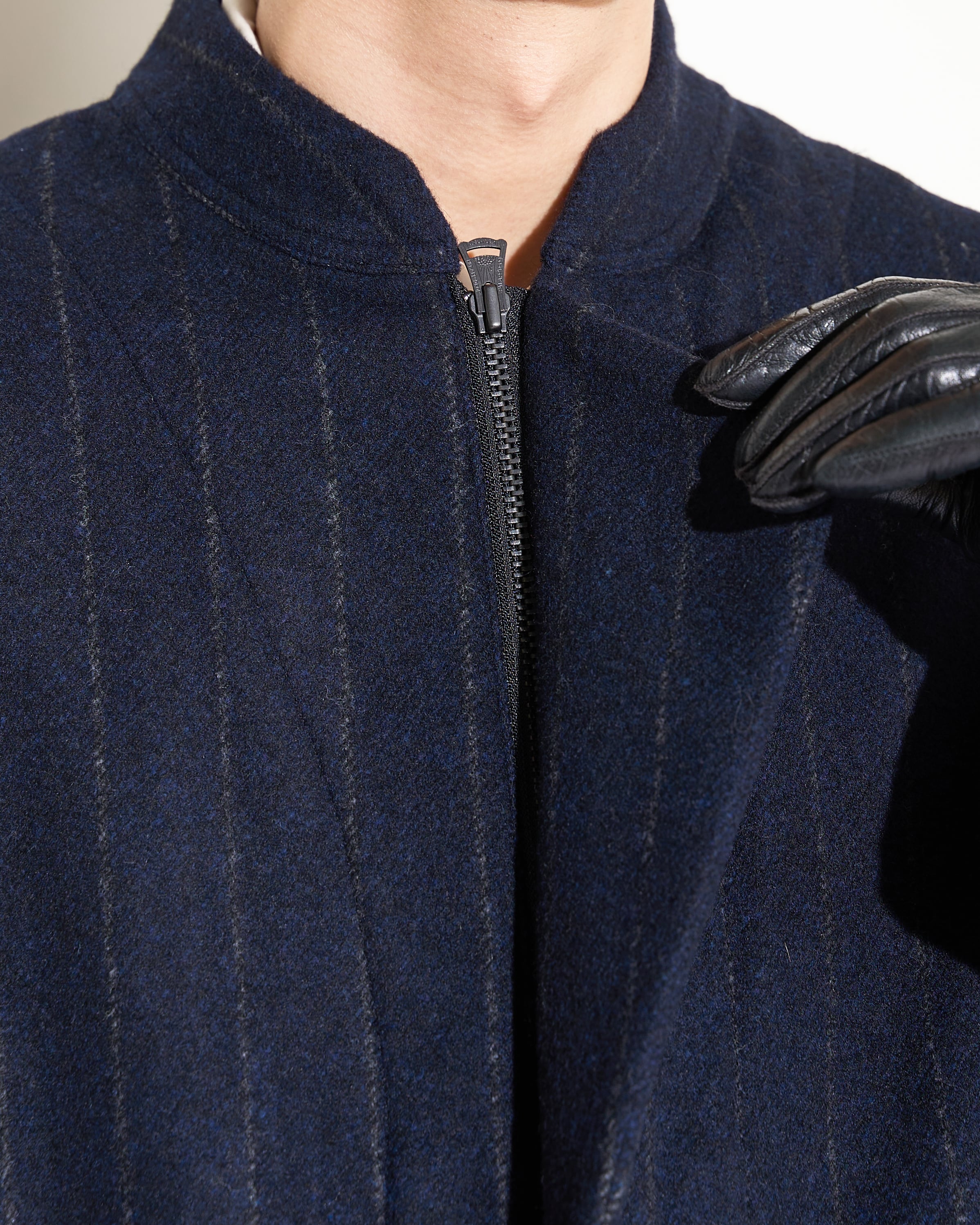 ネイビーストライプのデッドストック生地を使用したロングスリーブのジャンプスーツ。片方のみラペルのついたデザインになっており、スタンドカラーながら開くと綺麗なVゾーンに。シャツやタイドアップなど、さまざまな見せ方ができるのも強みな、モードとカジュアルの中間を指すような1着です。また、ジップはダブルジップになり下からも開くようにアップデートされているので、日常的な使いやすさも魅力的。