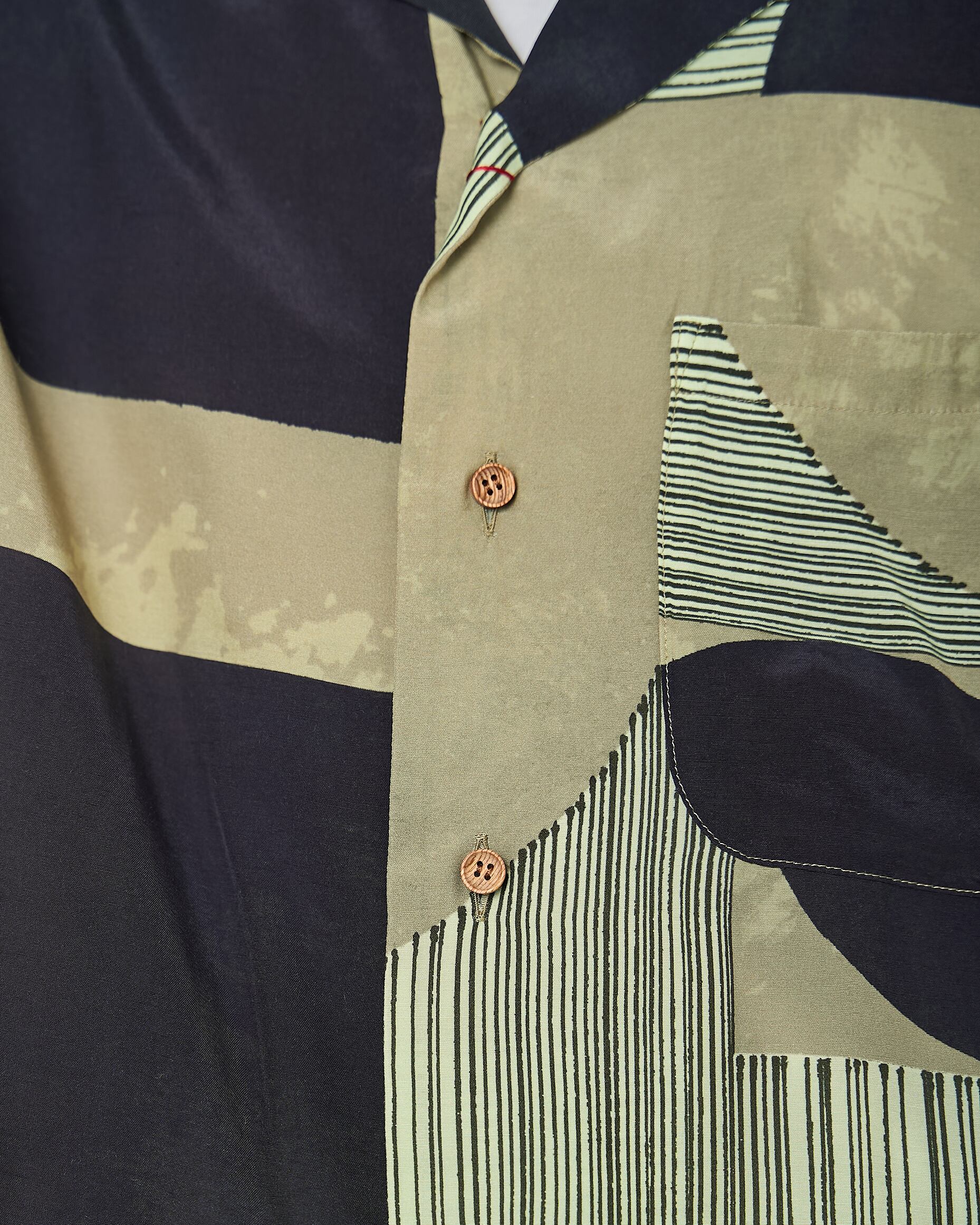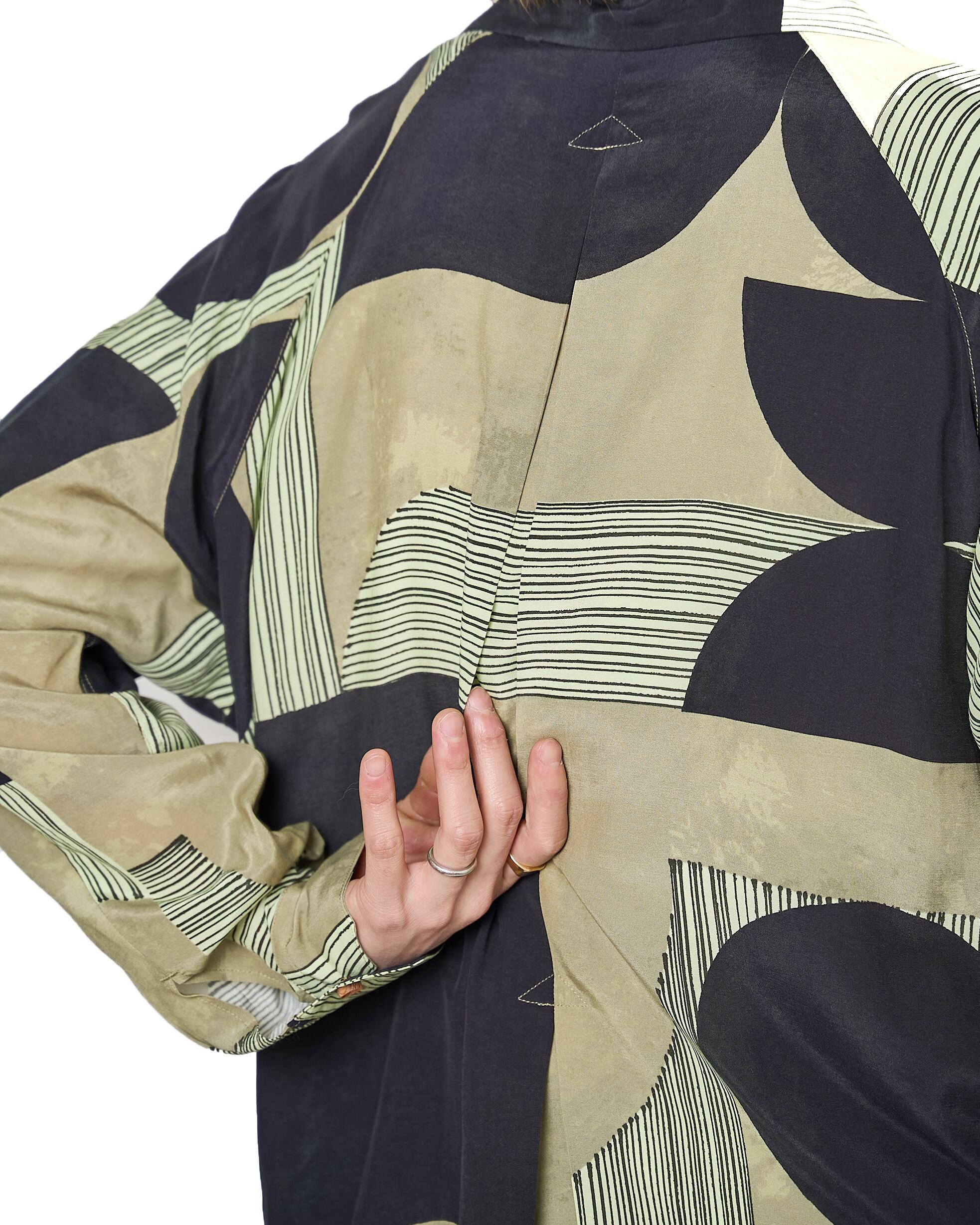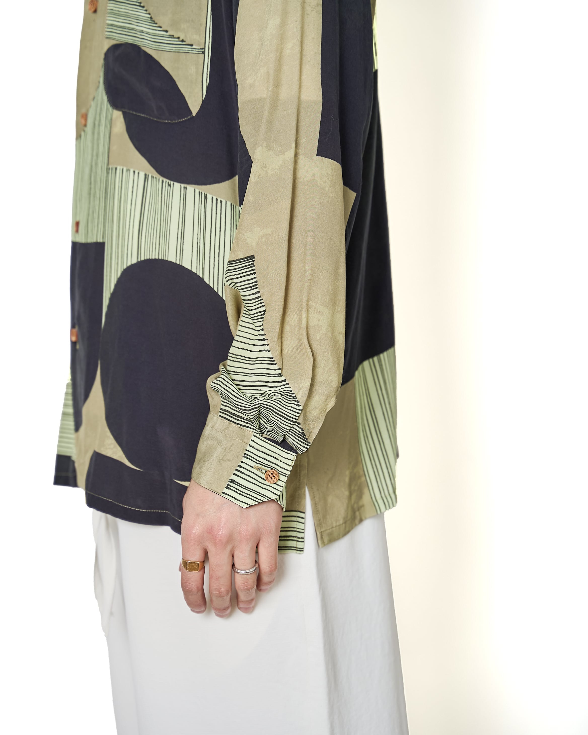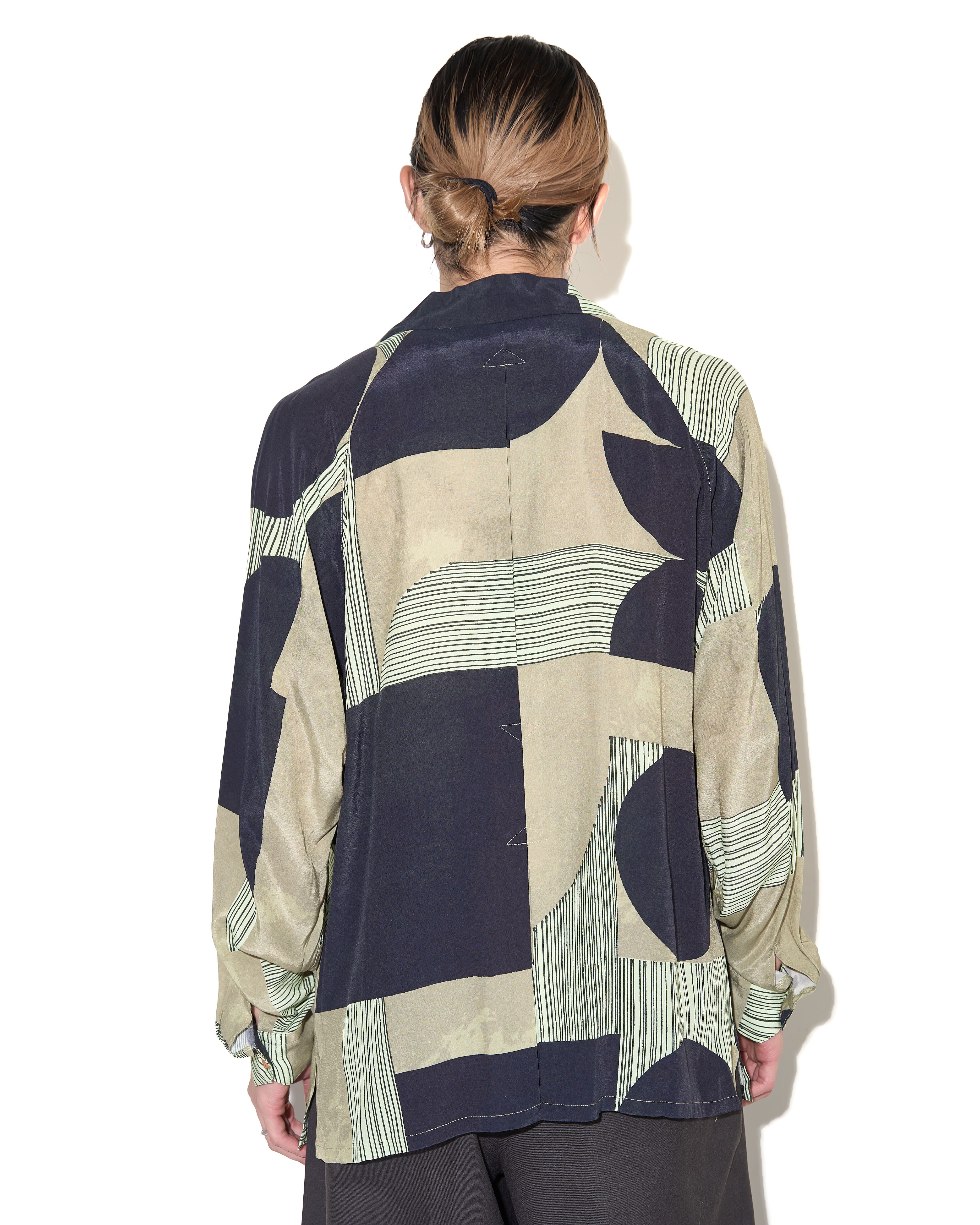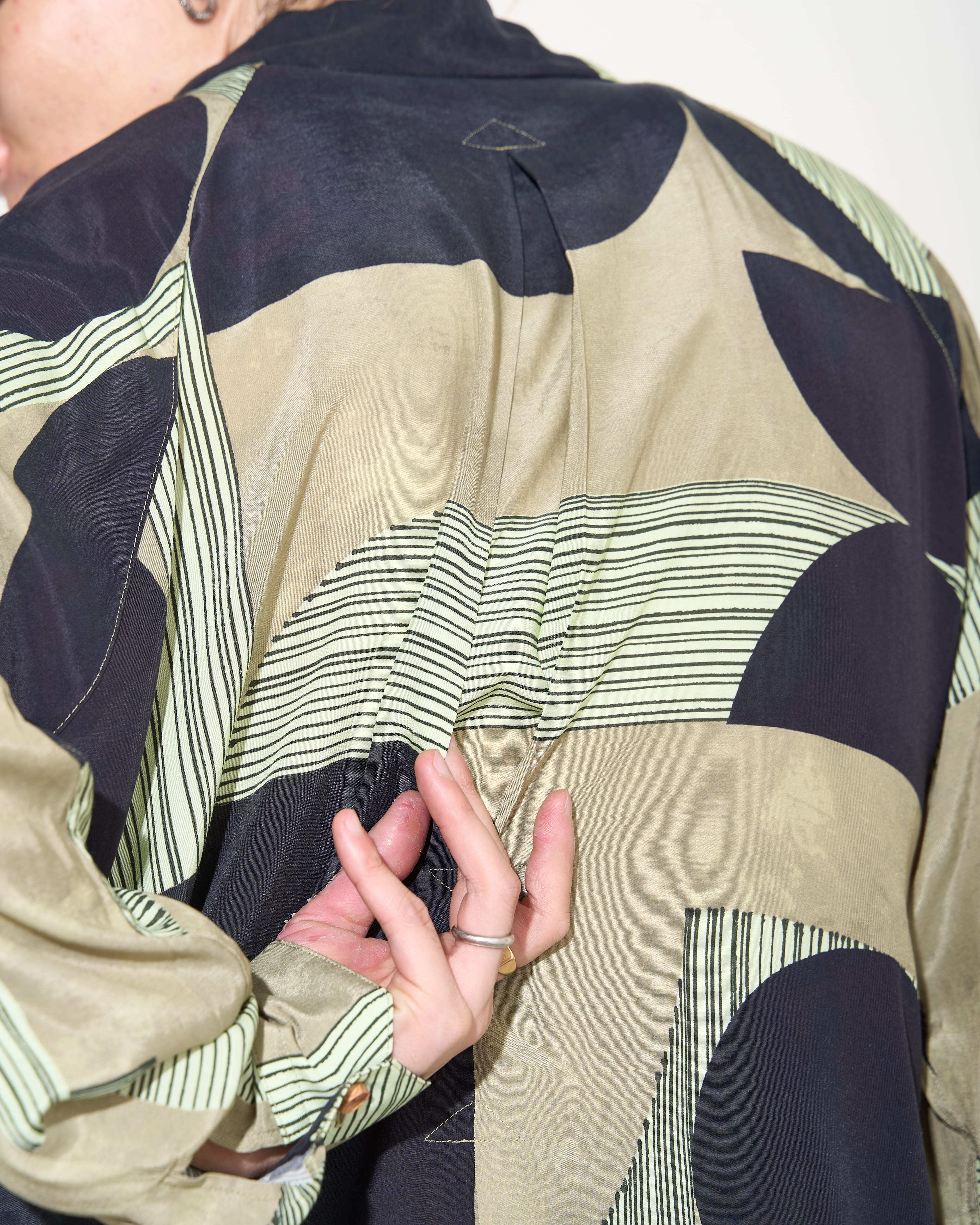 キュプラとレーヨンの軽やかな素材を使用したアロハシャツ。派手な印象ながら、それぞれカラーが落ち着いており、粗野な印象と品の良い印象のバランスが特徴的。ゆったりとしたサイズ感なので、夏場からの着用もでき、インナーとしても活躍する一枚。