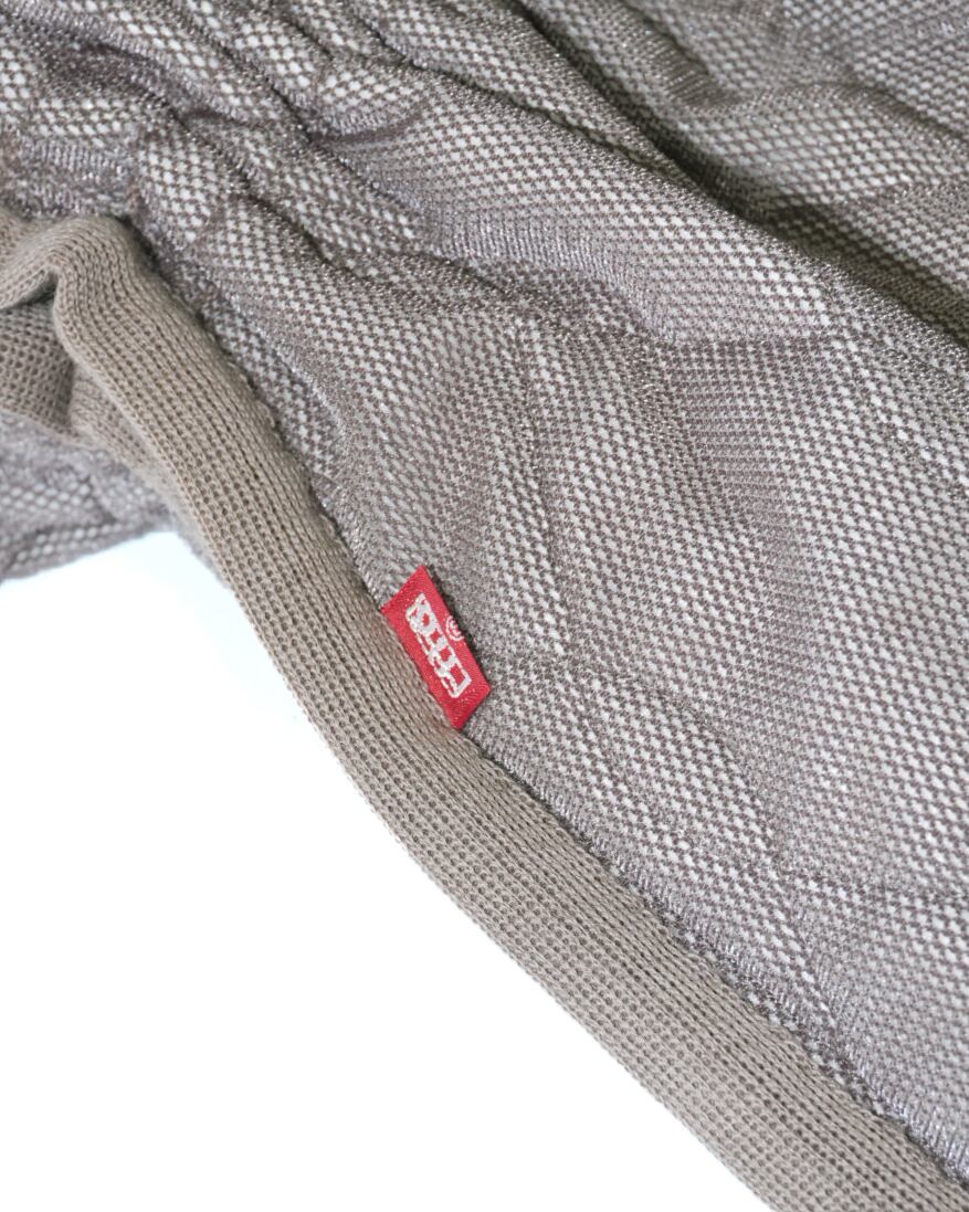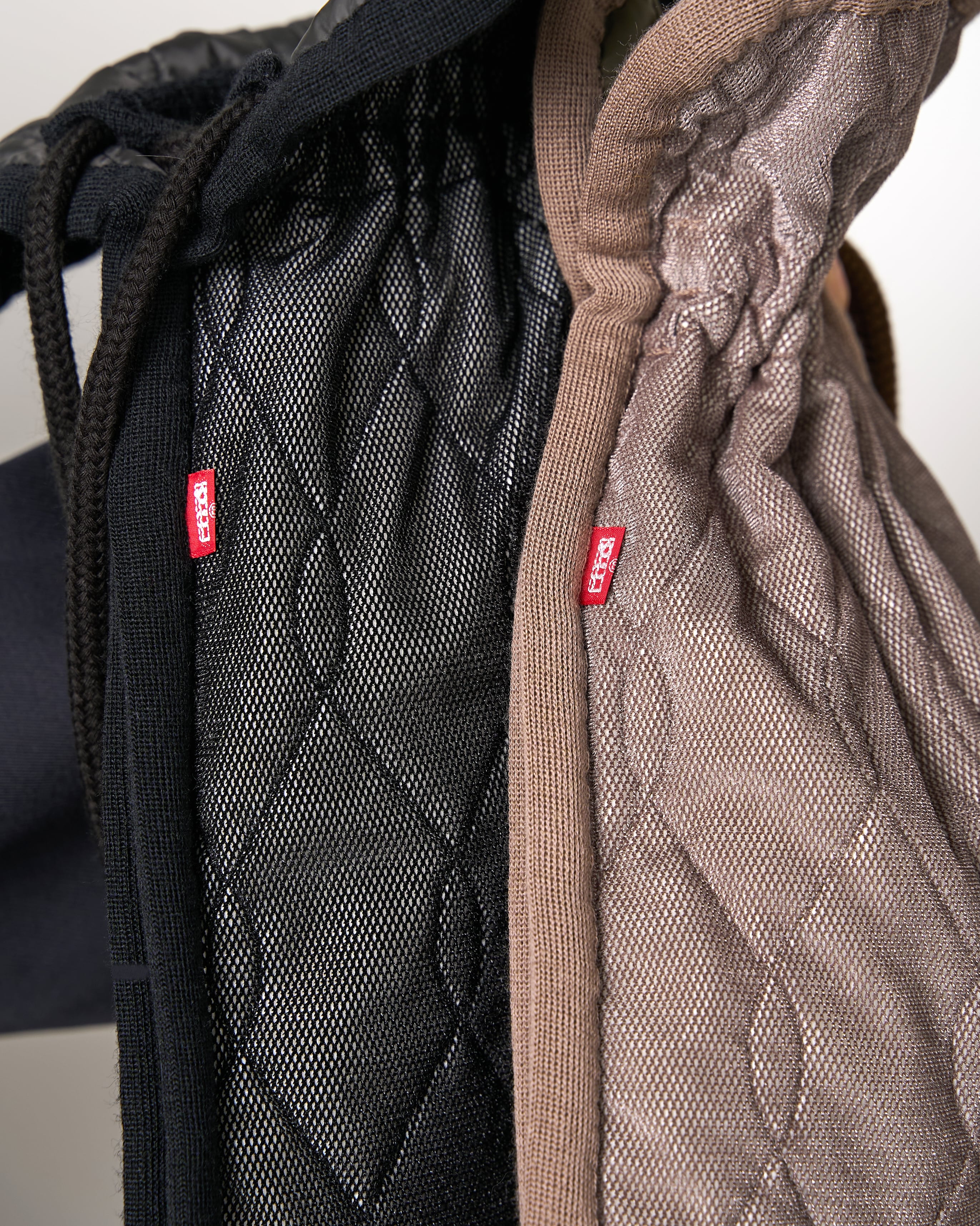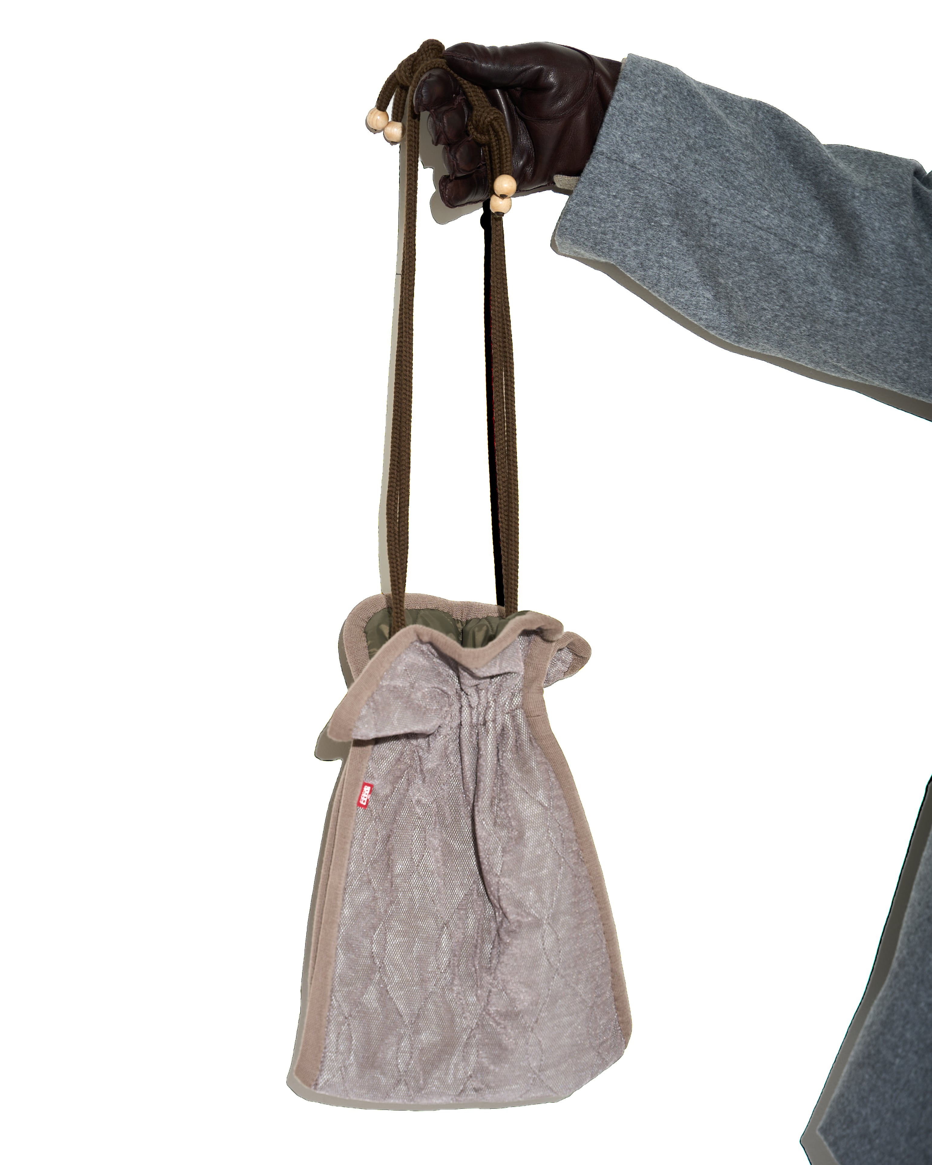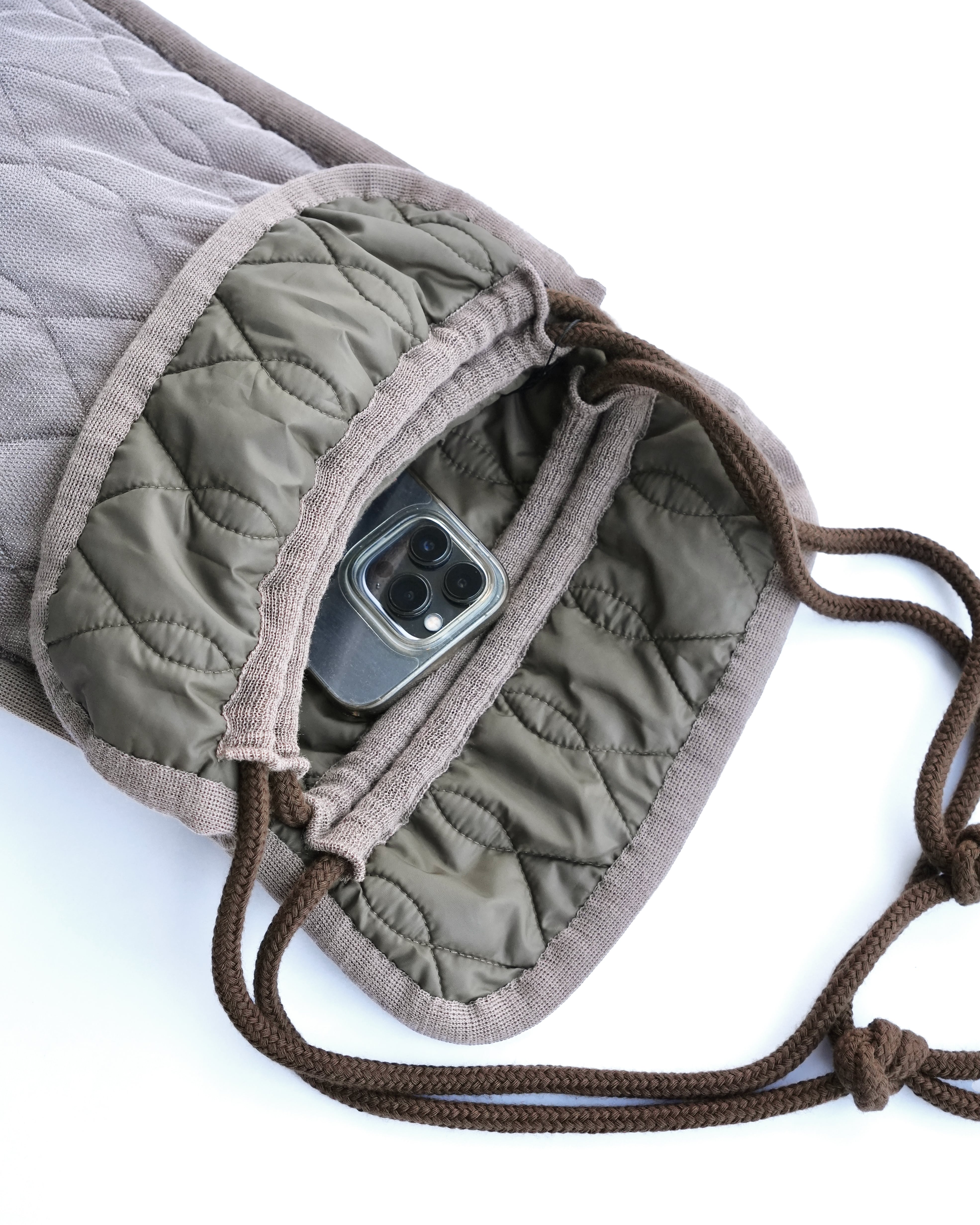 キルティング素材の上からメッシュを被せることで奥行きのあるデザインに仕上がっている巾着バッグ。ボリューム感が出るように中綿も入っており、シルク原料をシート状にしたSILKLOFTを使用しています。程よく季節感も感じられるアクセントとしてぜひご活用下さい。