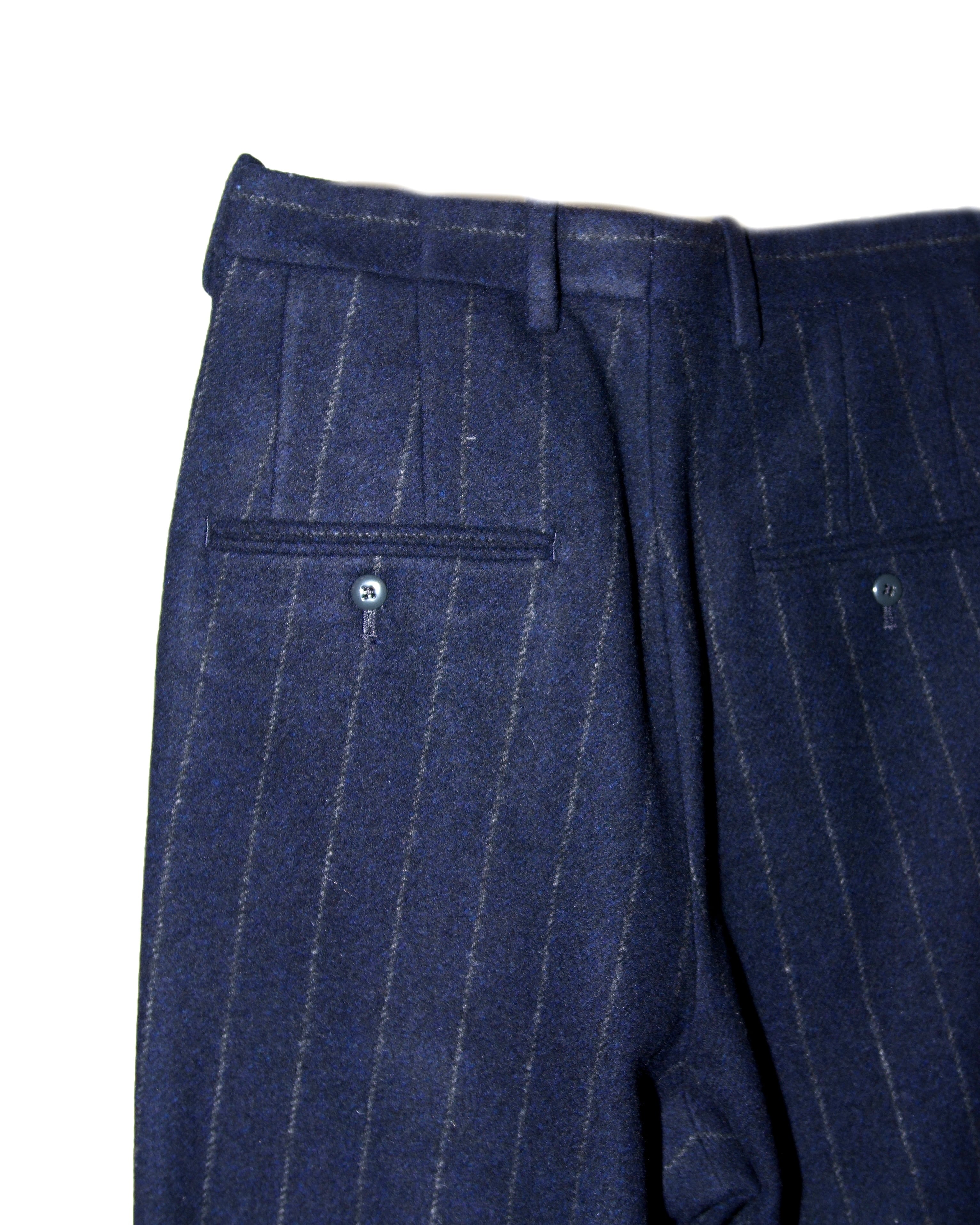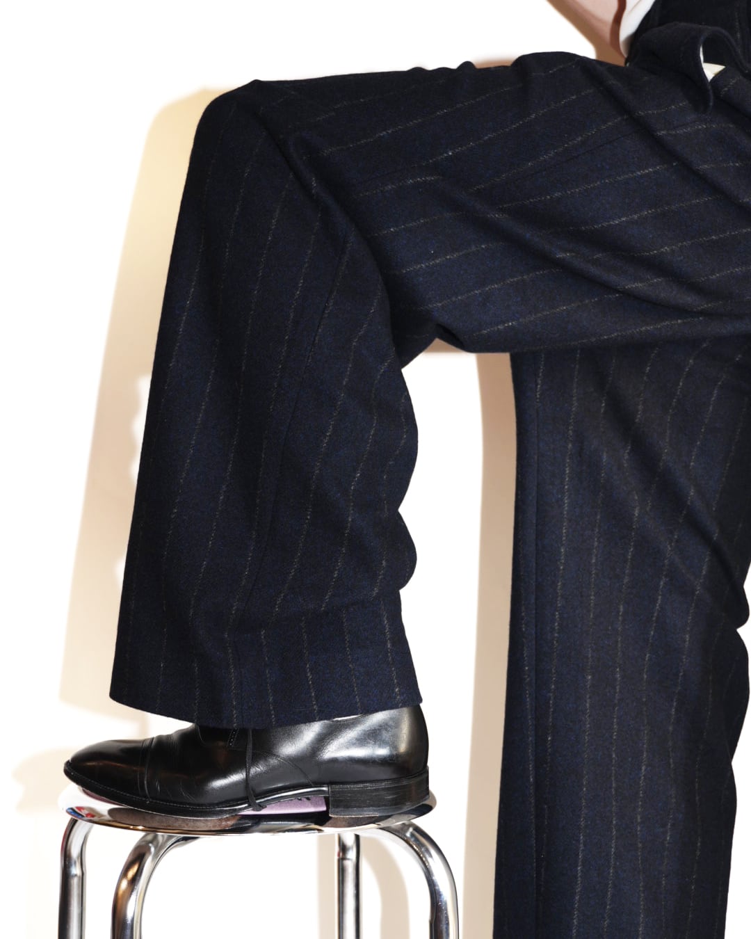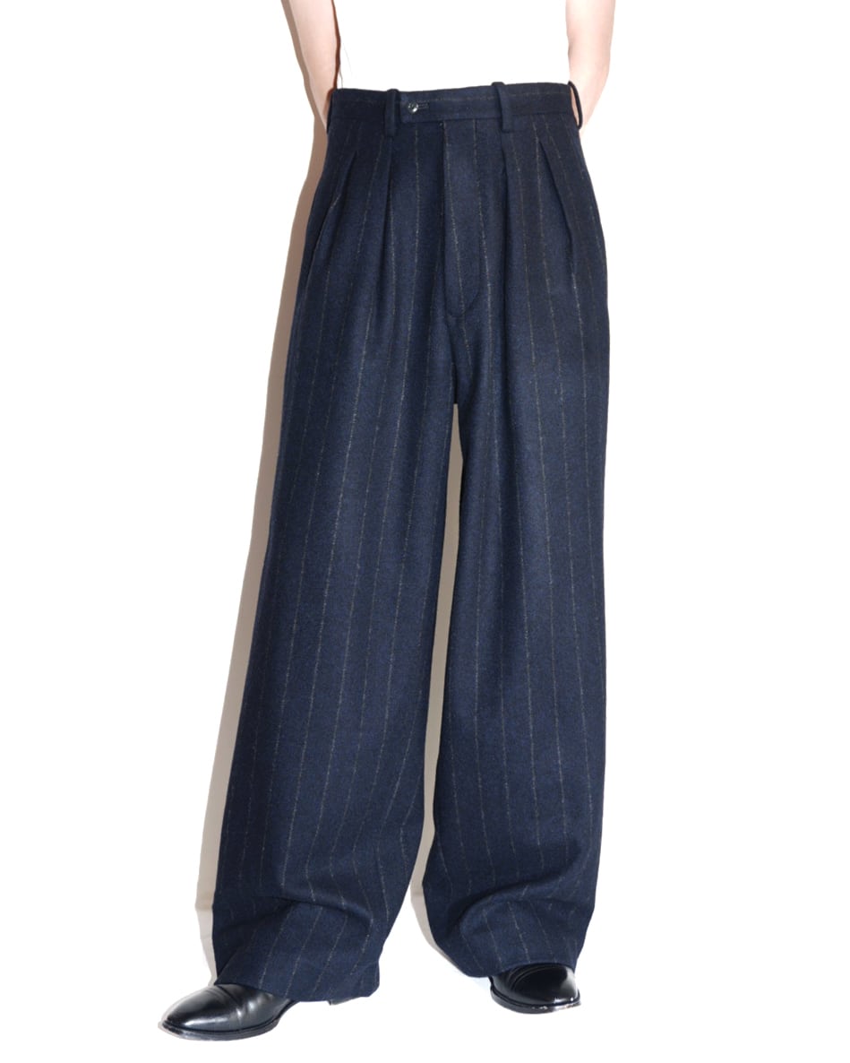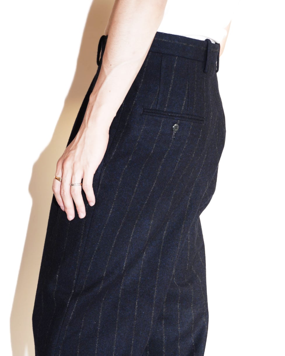 ネイビーストライプのデッドストック生地を使用した、ブランドのアイコンでもある美しいシルエットのバギーパンツ。ウールのフラノ素材で、ドレープはありつつも、立体的なシルエットになっています。ワイドシルエットで存在感のあるパンツなので、ニットやスウェットを着用するだけで様になります。