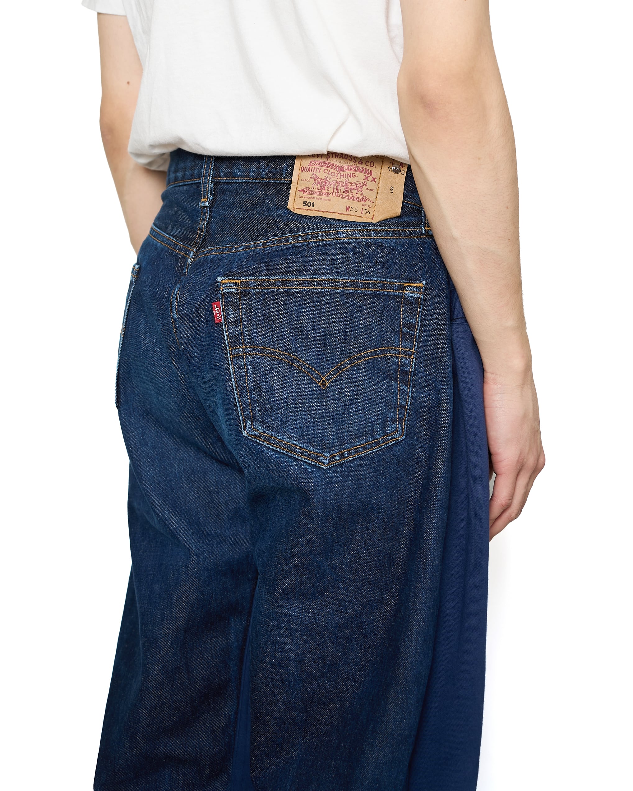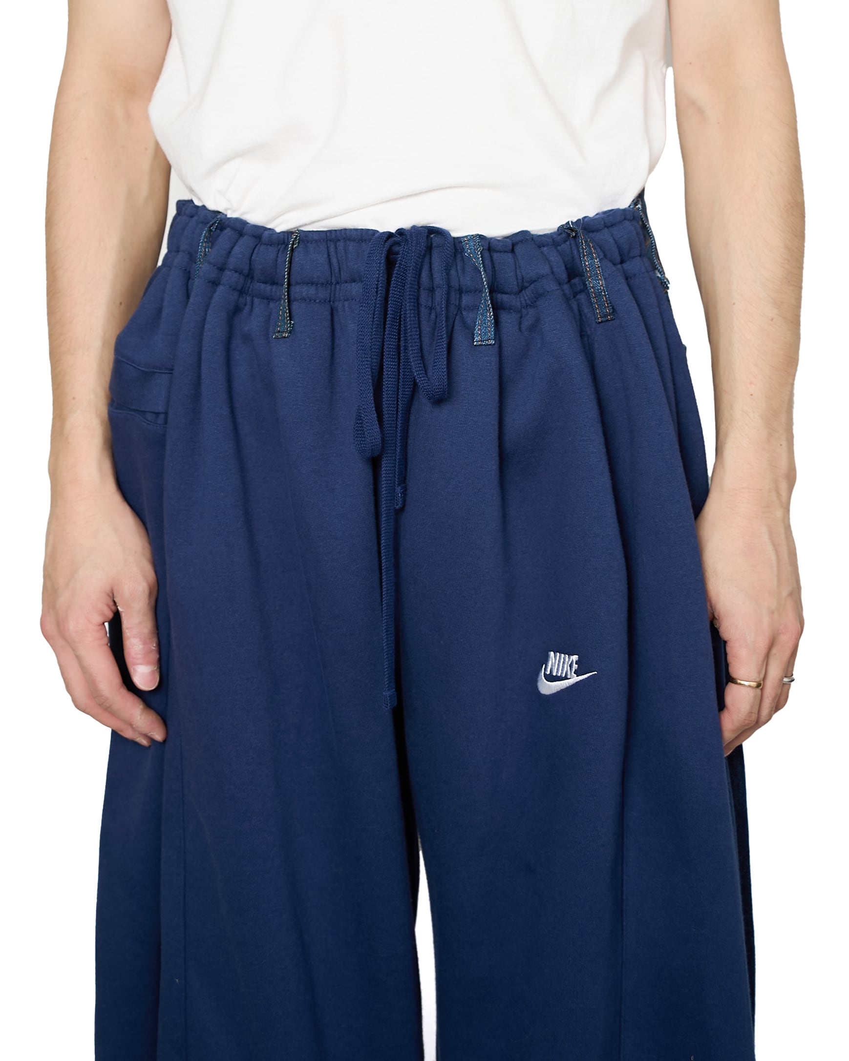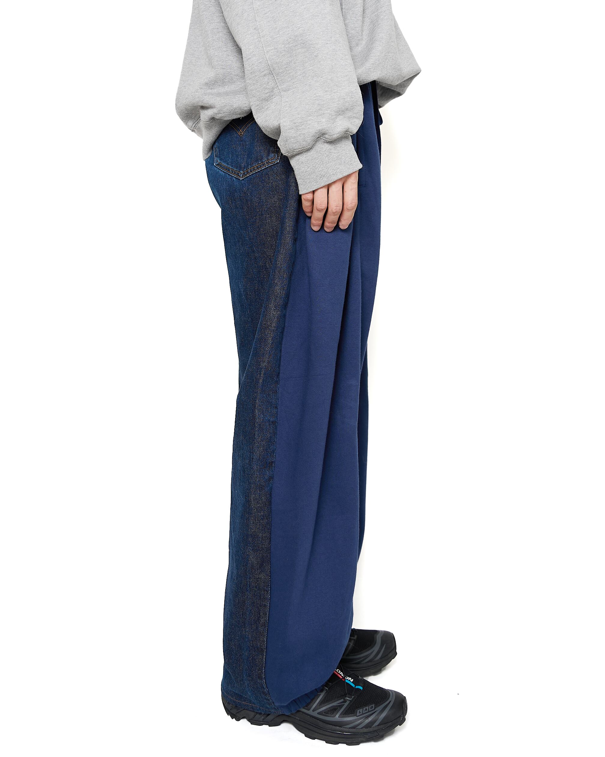 フロントにNIKEのスウェットパンツ、バックにLevi'sのジーンズをドッキングした、モノのアップサイクルを目的としたパンツ。不朽の名作、合わせやすさもさることながら、持っていると幸せな気分になれます。