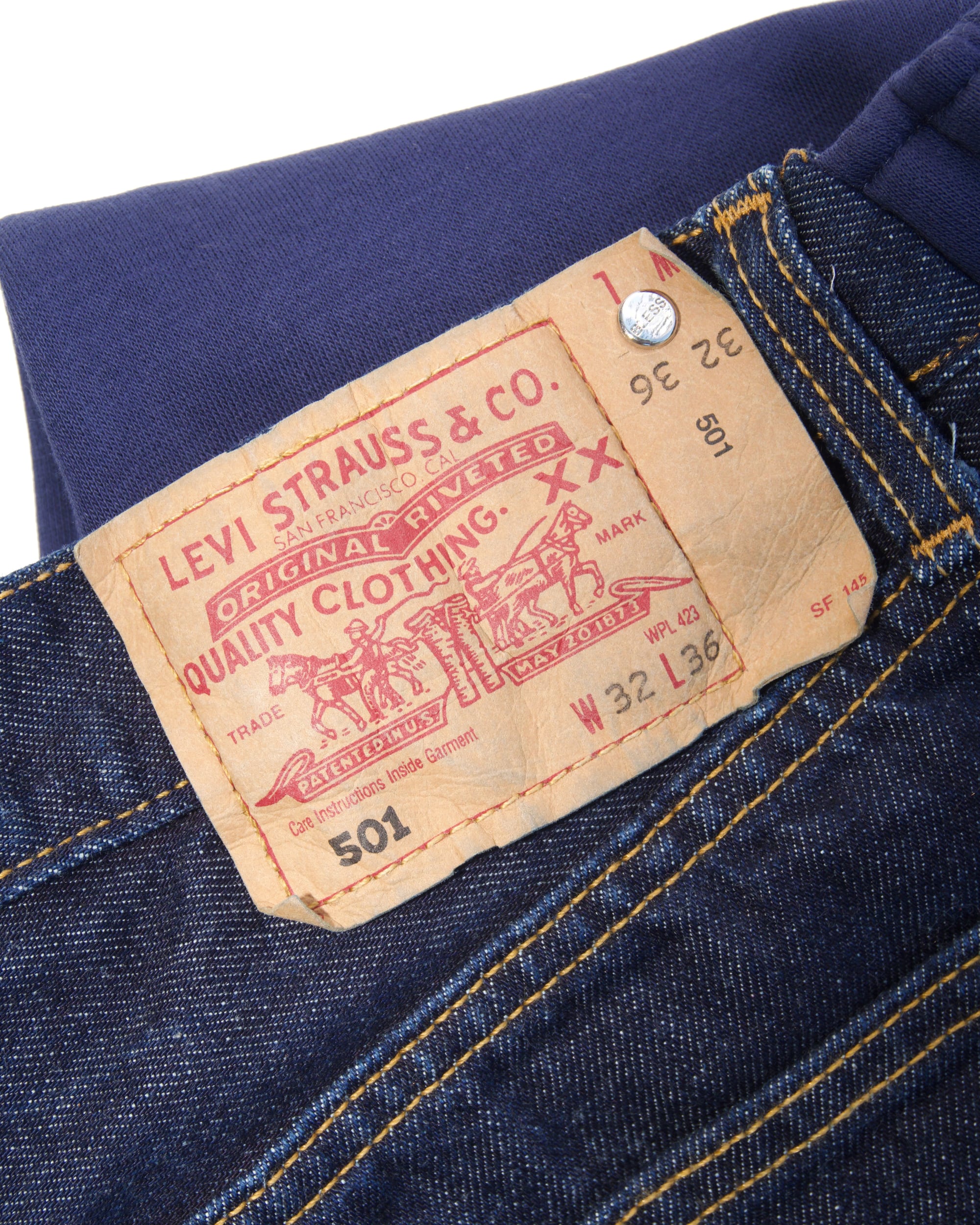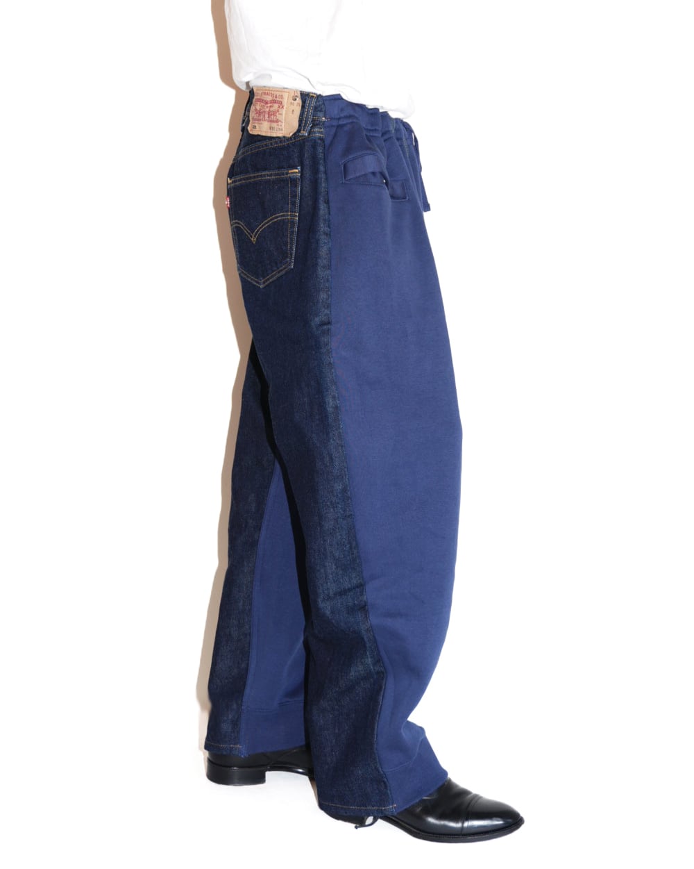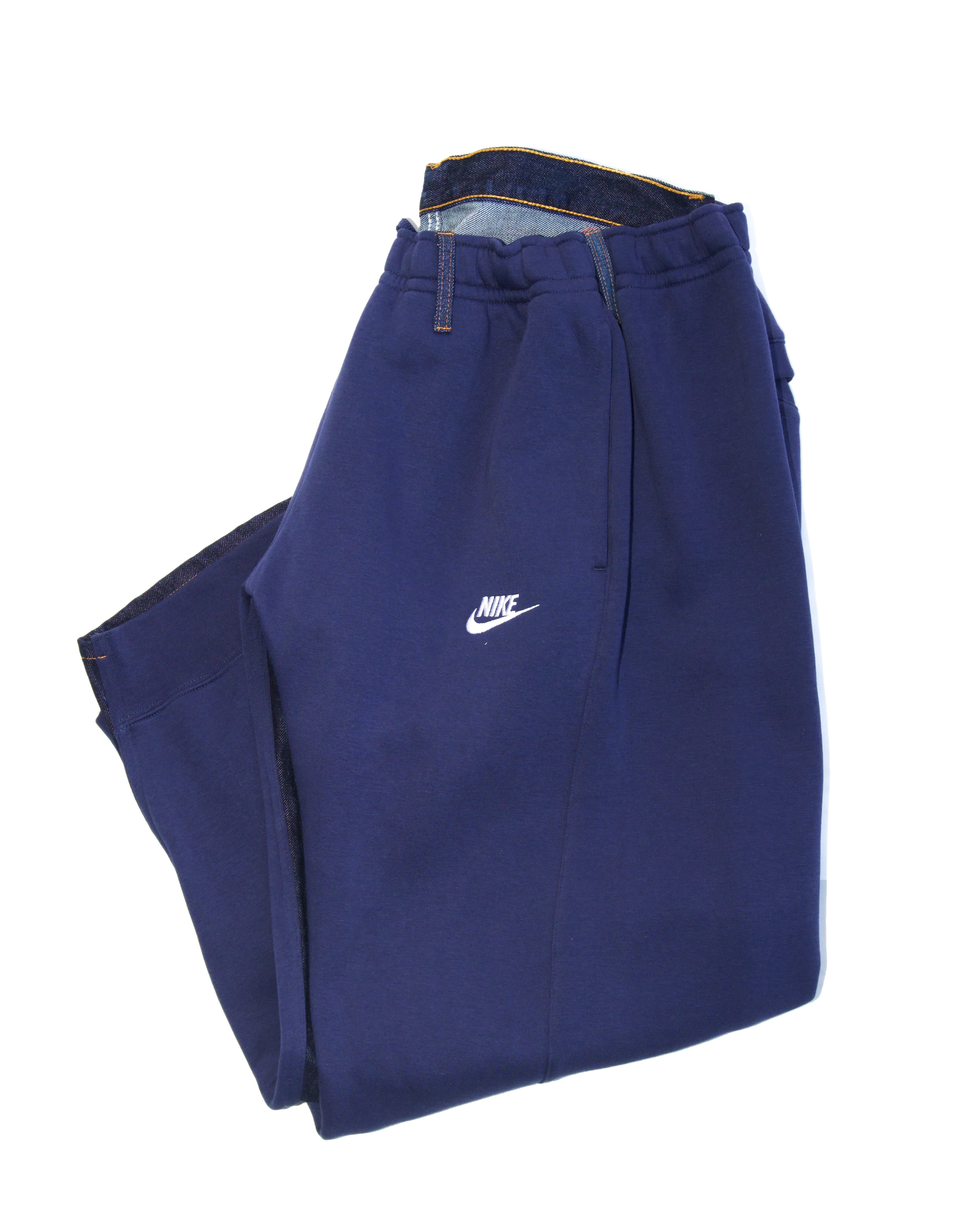 フロントにNIKEのスウェットパンツ、バックにLevi'sのジーンズをドッキングした、モノのアップサイクルを目的としたパンツ。不朽の名作、合わせやすさもさることながら、持っていると幸せな気分になれます。