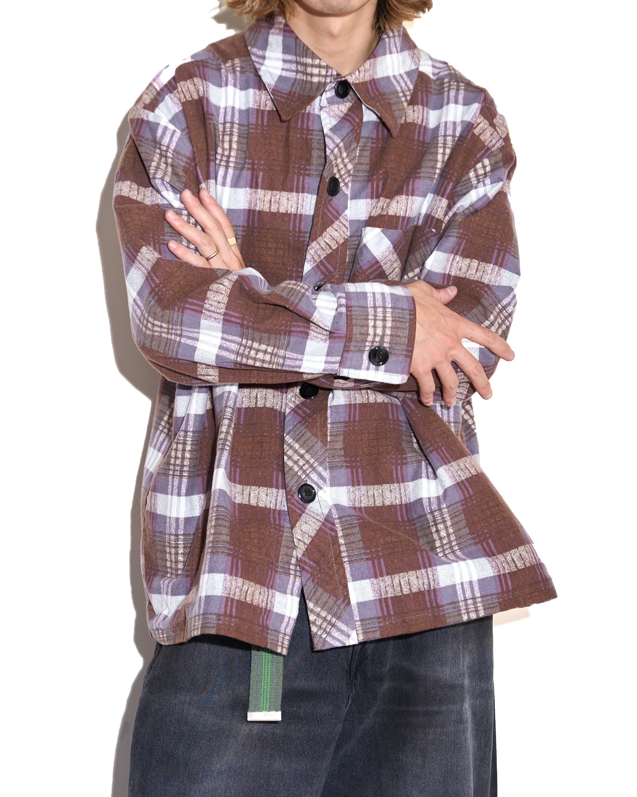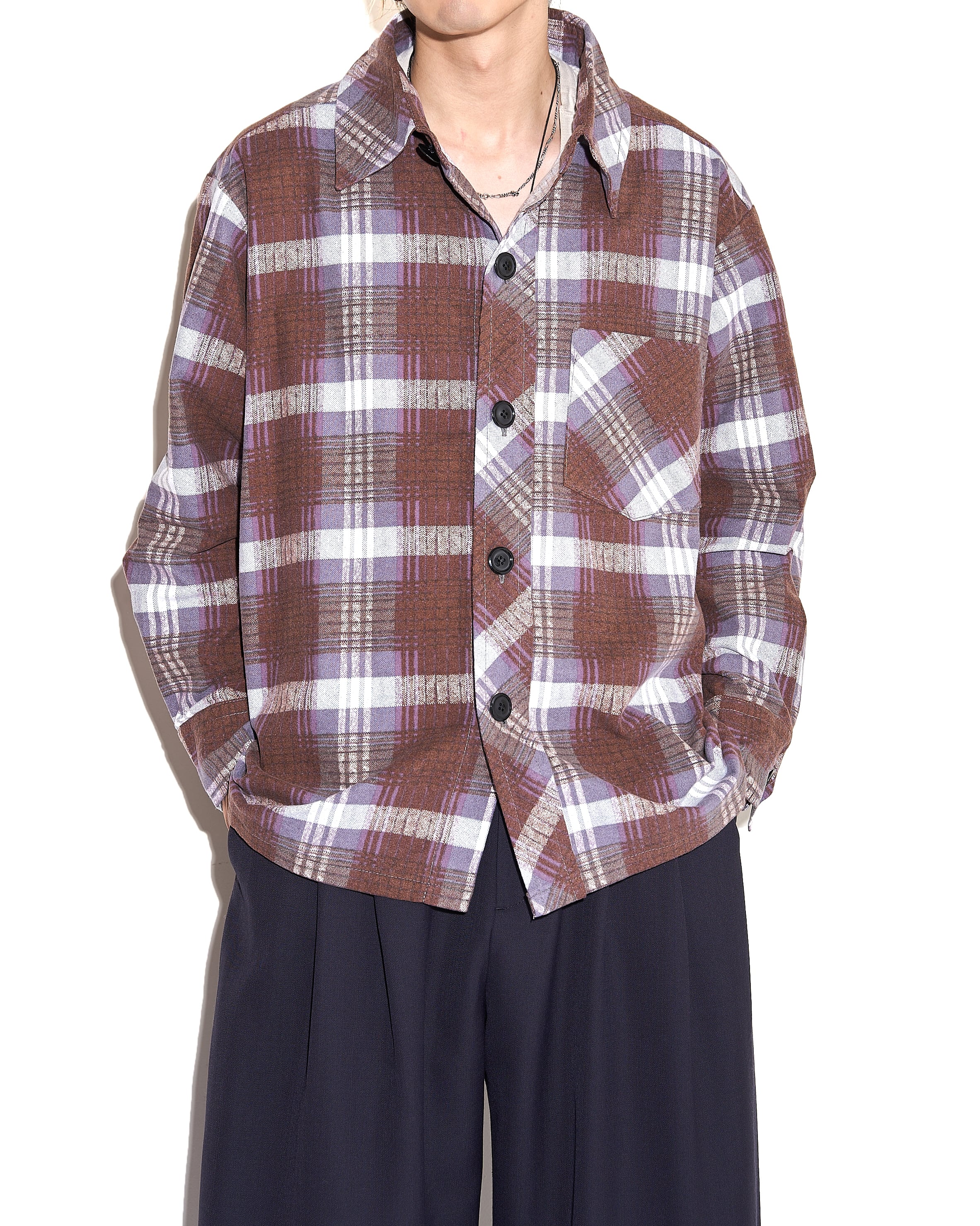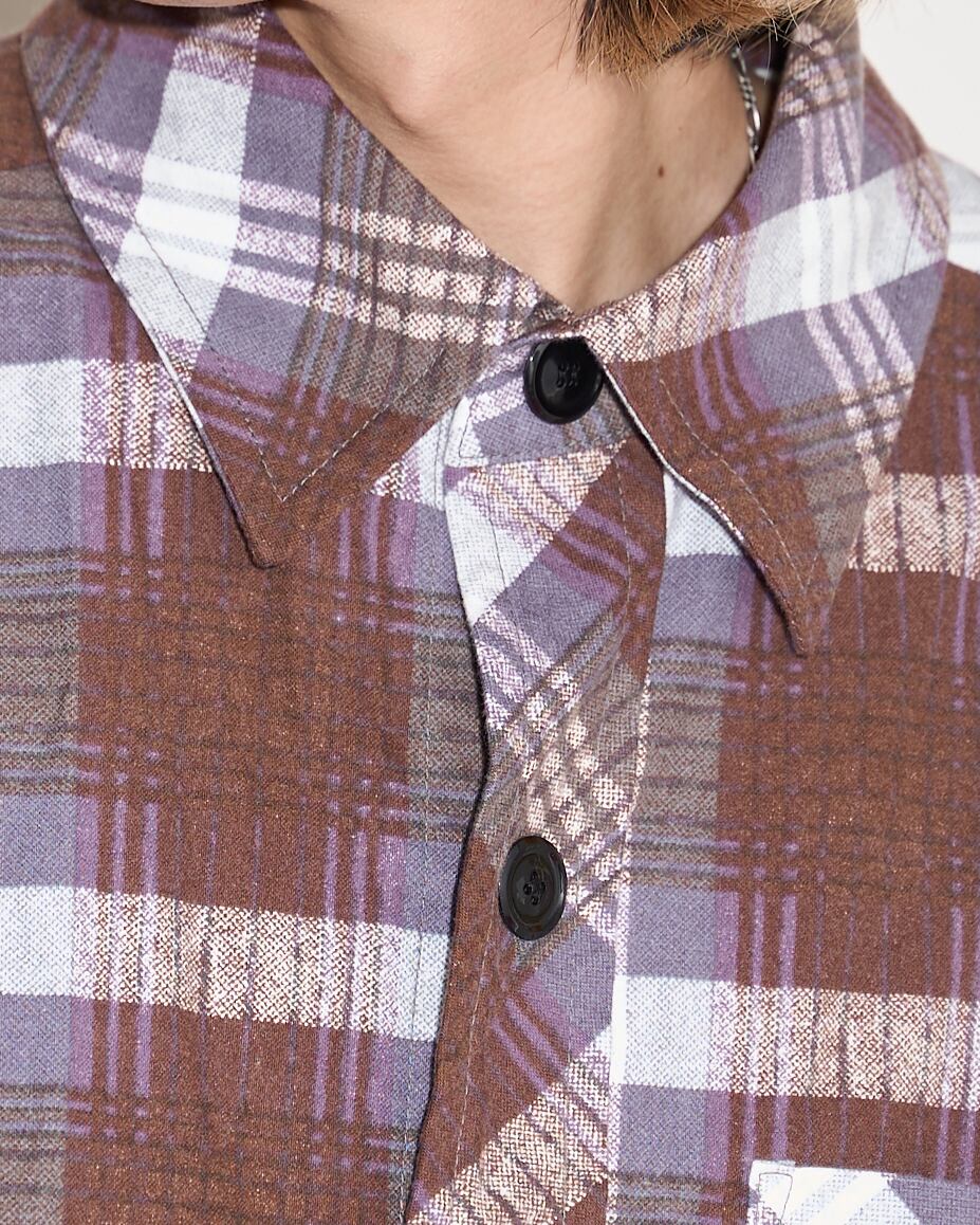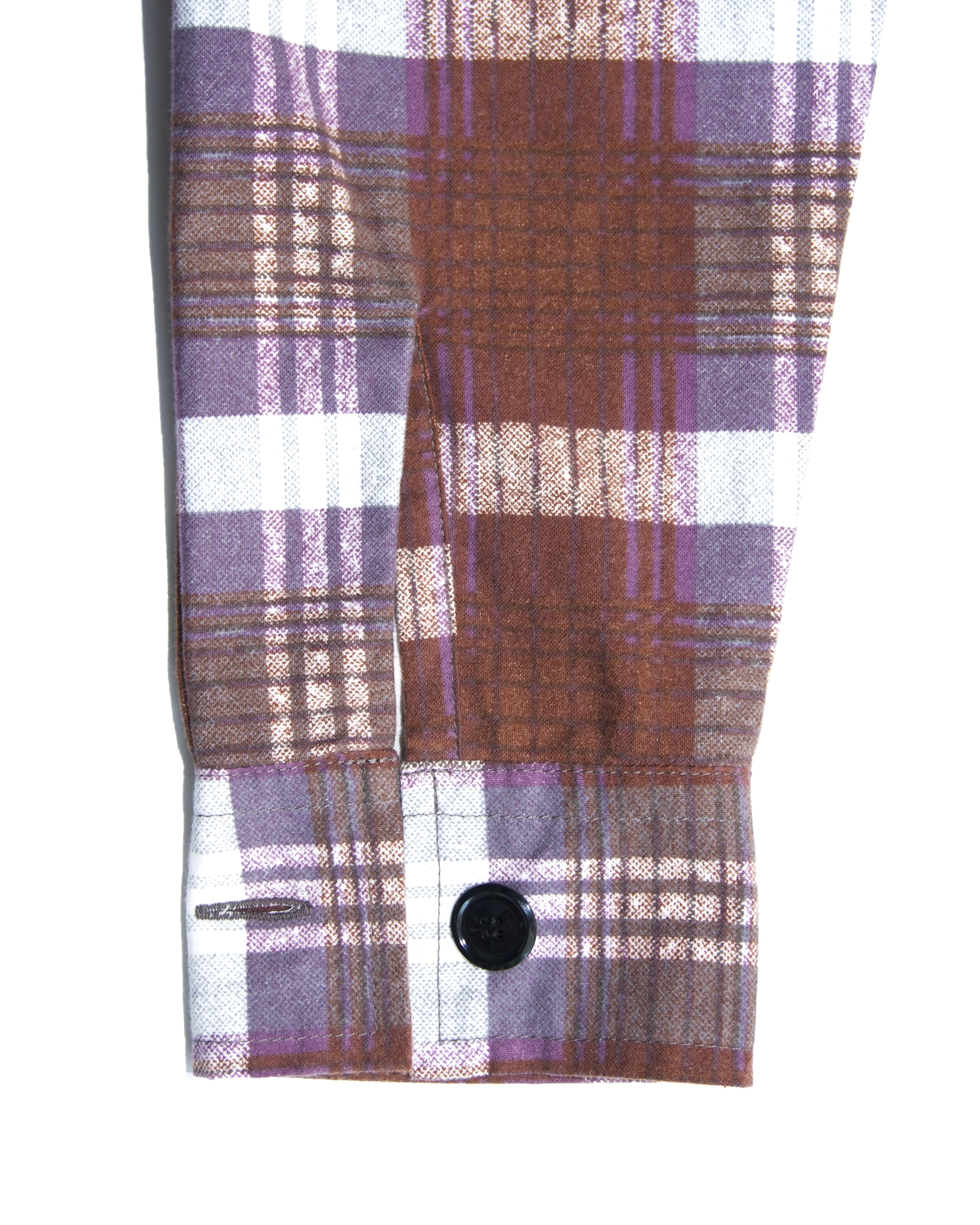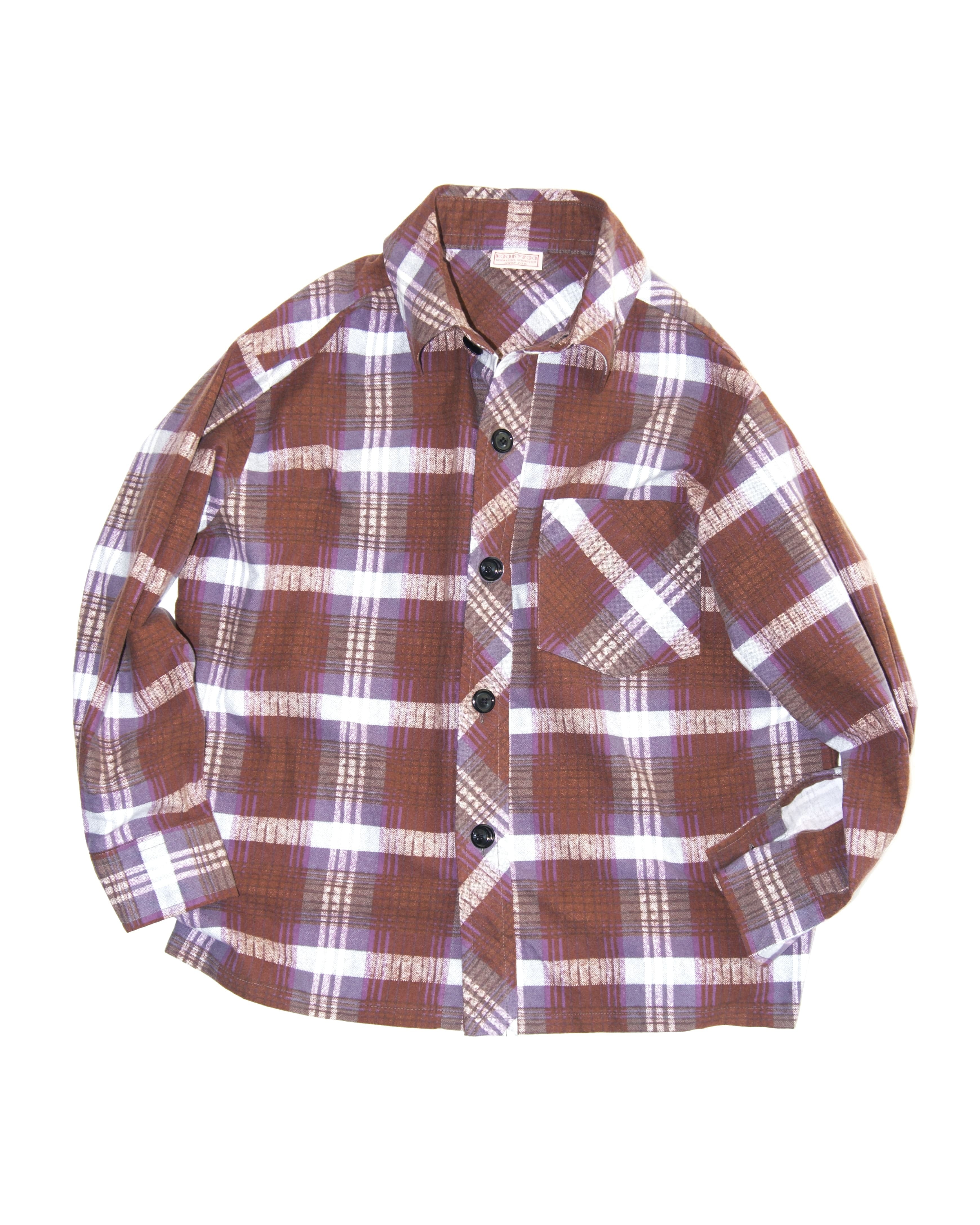 子供服らしい大きめで少ないボタン、やや大きめの襟など、どことなく違和感の感じられるデザインですが、主張が強すぎずオーセンティックにお使いいただけます。厚みのありそうな生地ですが、オーバーサイズのため夏〜秋の羽織としても最適。ブラウンにパープルなど絶妙な配色もありそうでなかった1着。