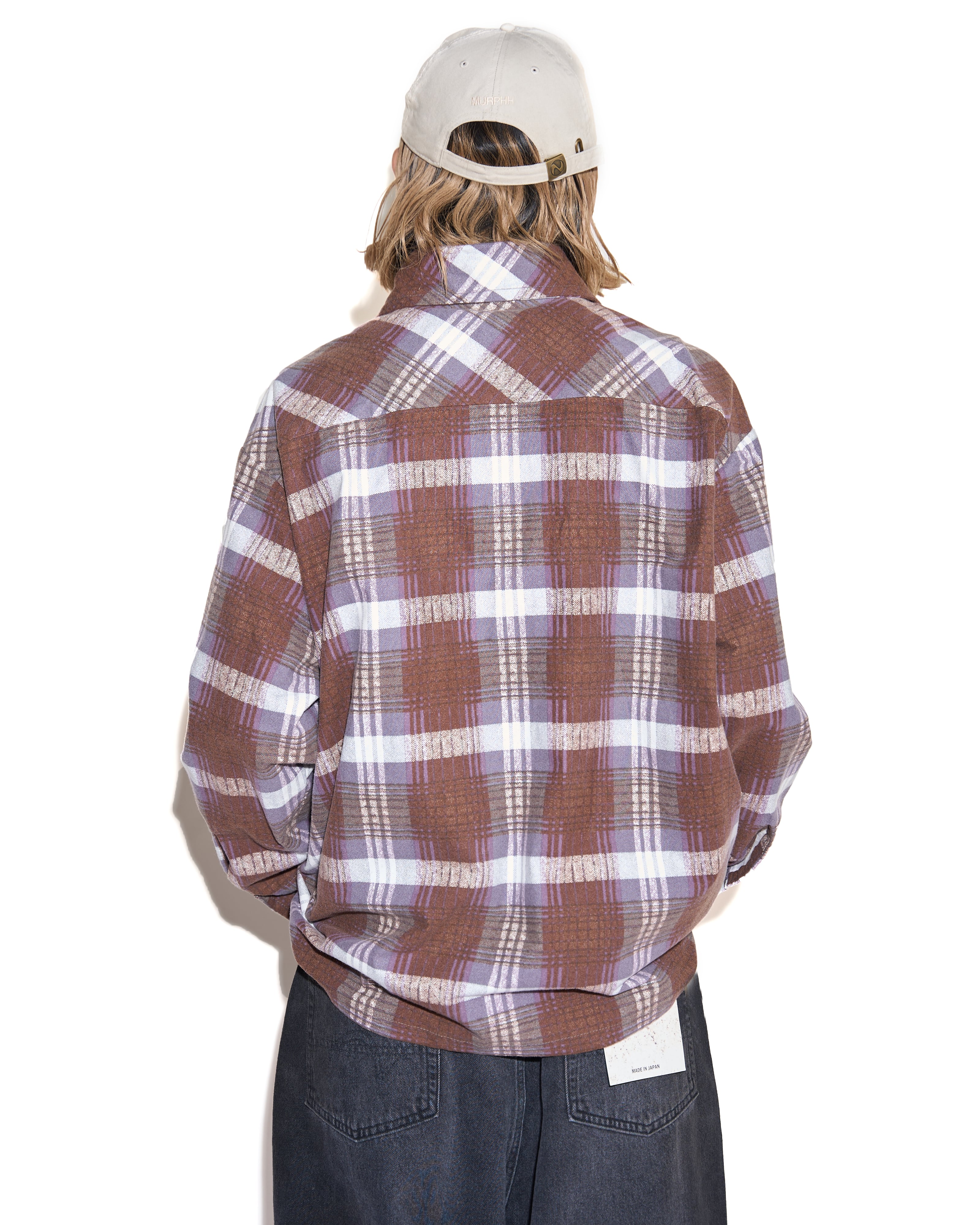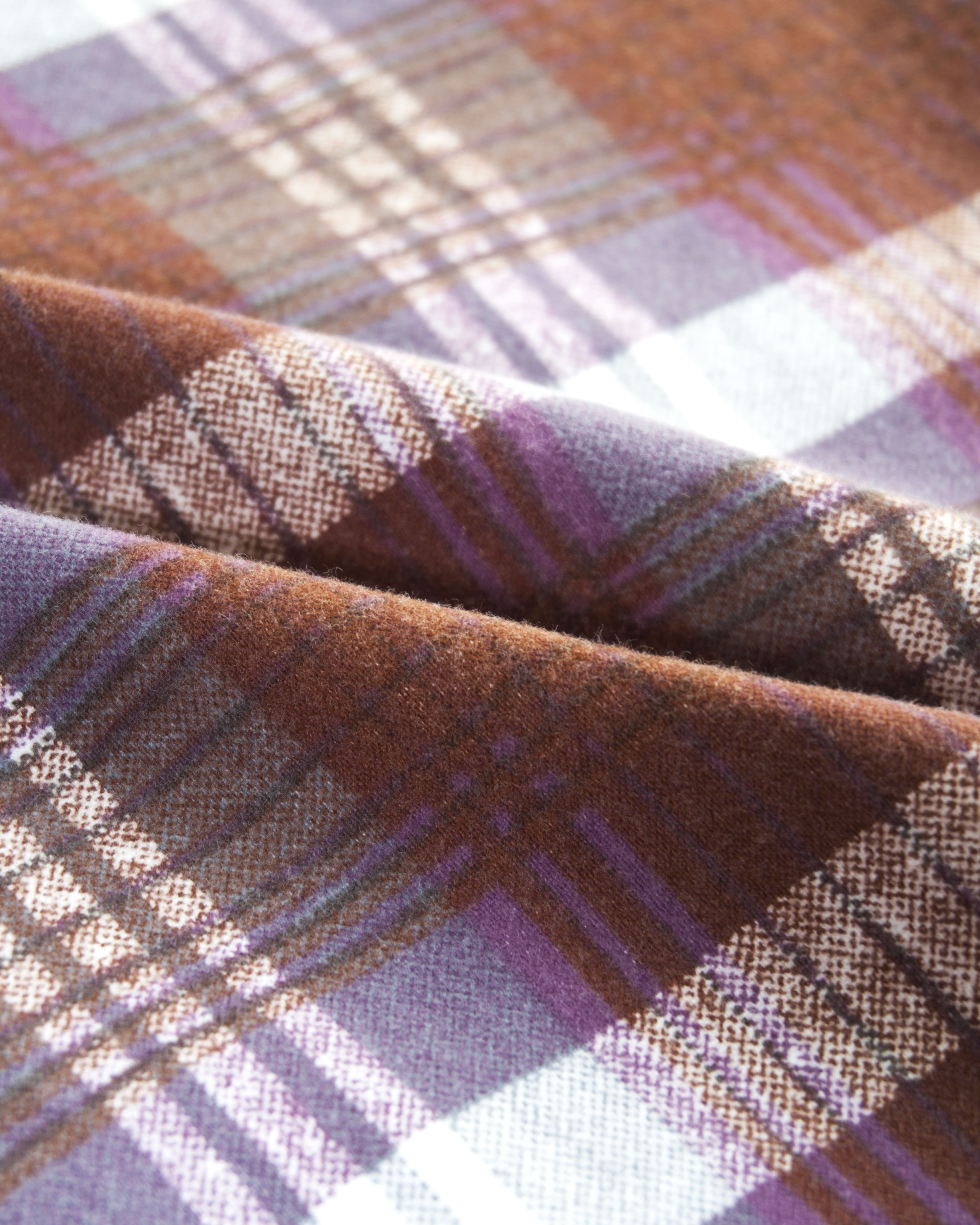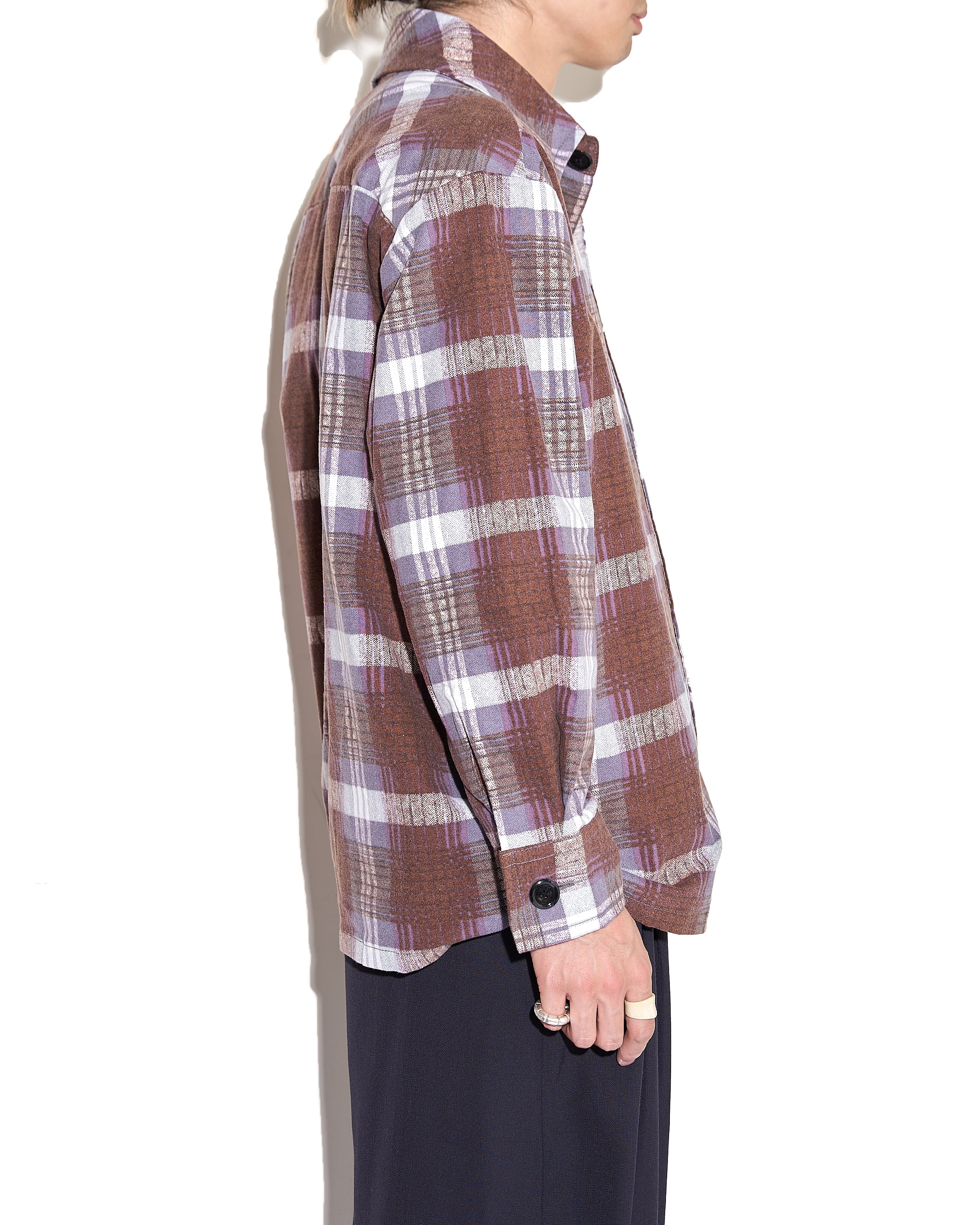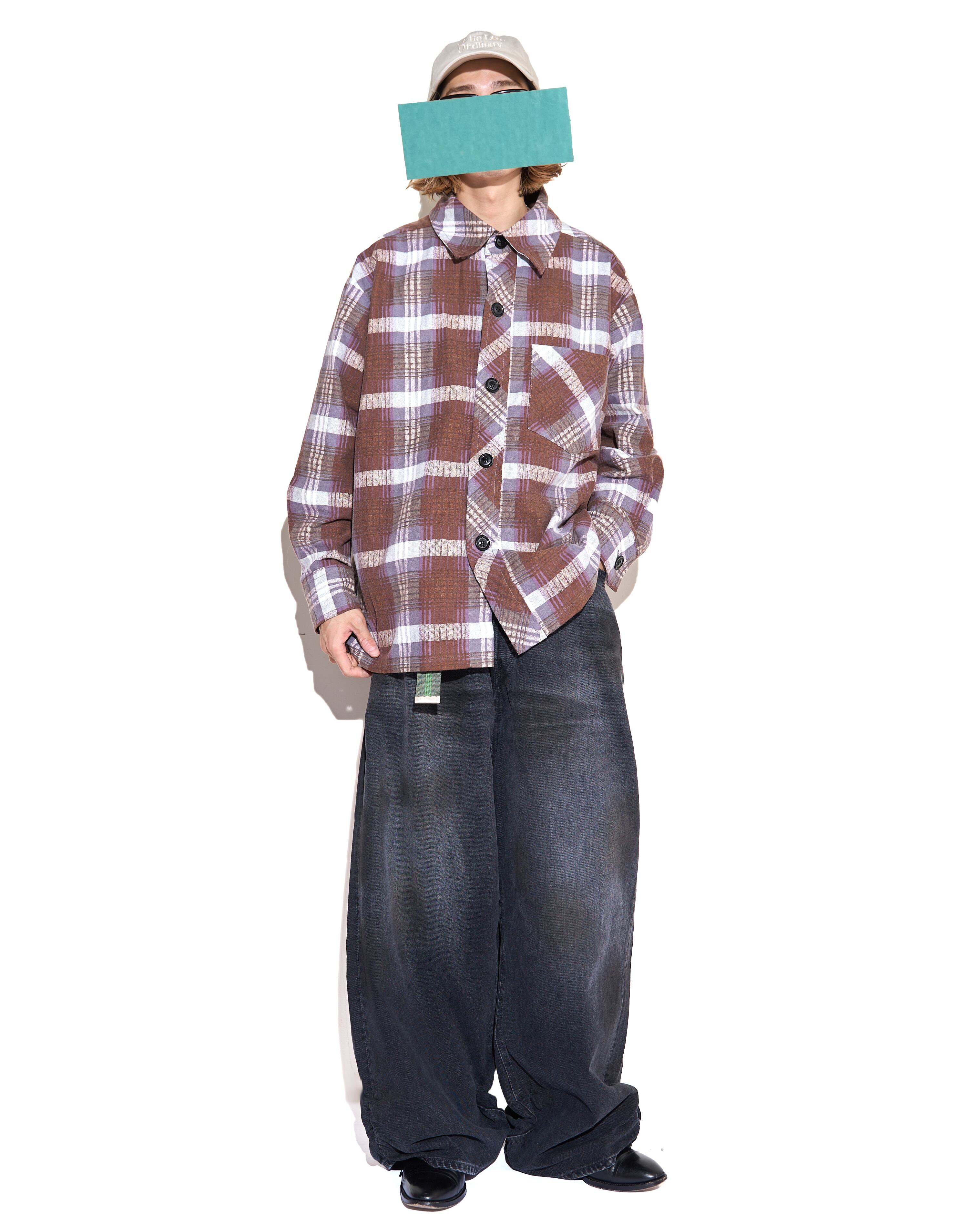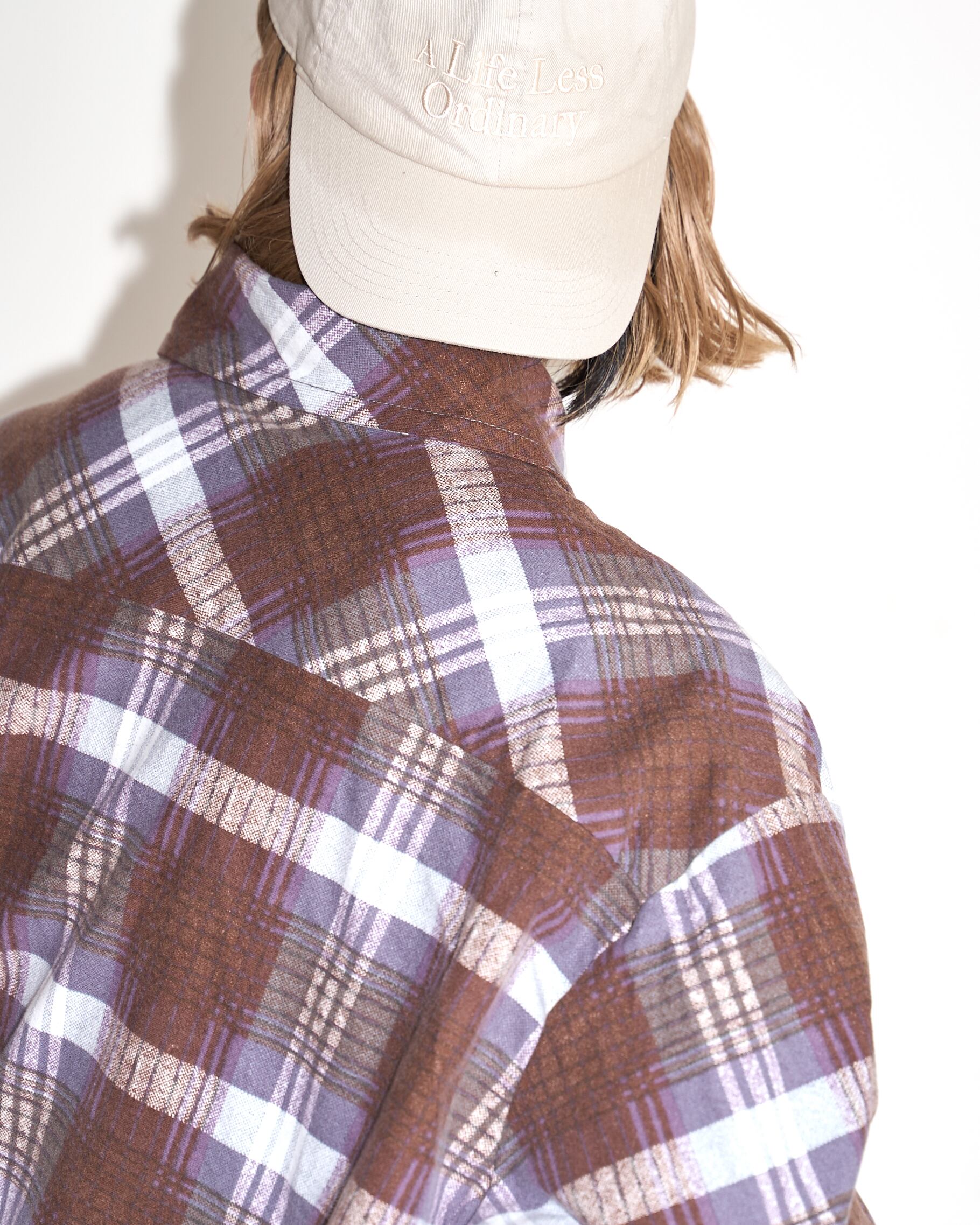 子供服らしい大きめで少ないボタン、やや大きめの襟など、どことなく違和感の感じられるデザインですが、主張が強すぎずオーセンティックにお使いいただけます。厚みのありそうな生地ですが、オーバーサイズのため夏〜秋の羽織としても最適。ブラウンにパープルなど絶妙な配色もありそうでなかった1着。