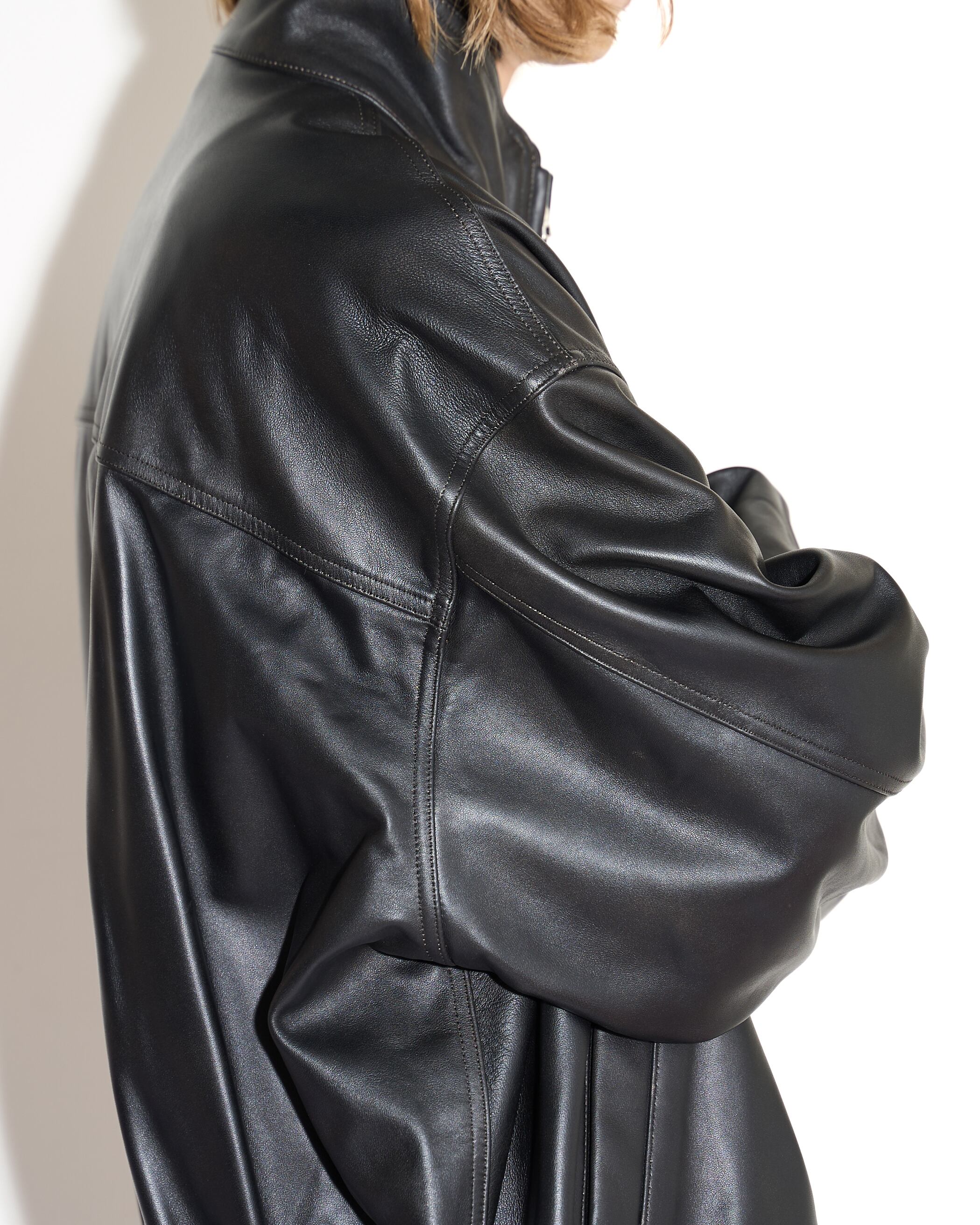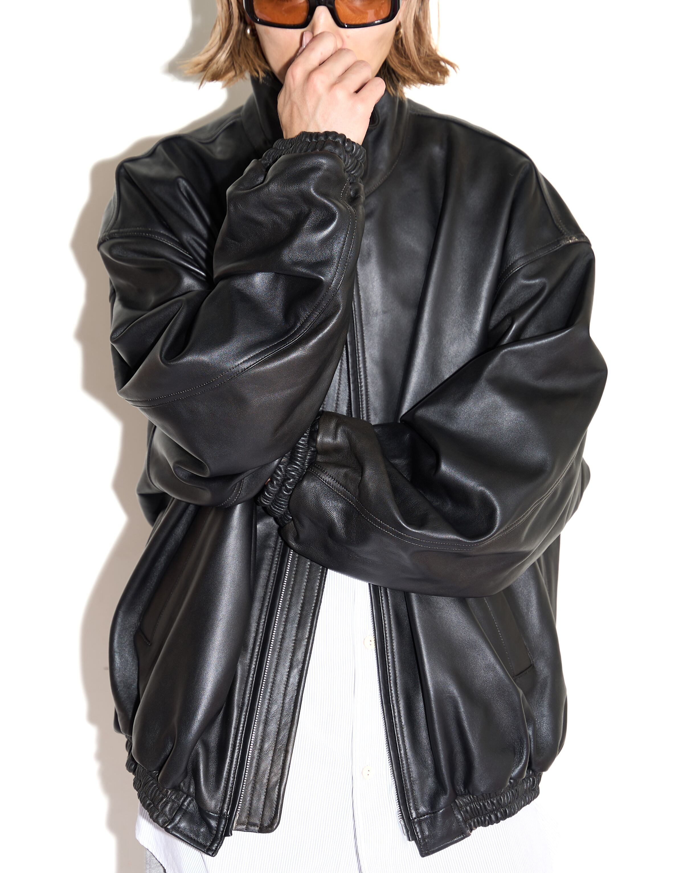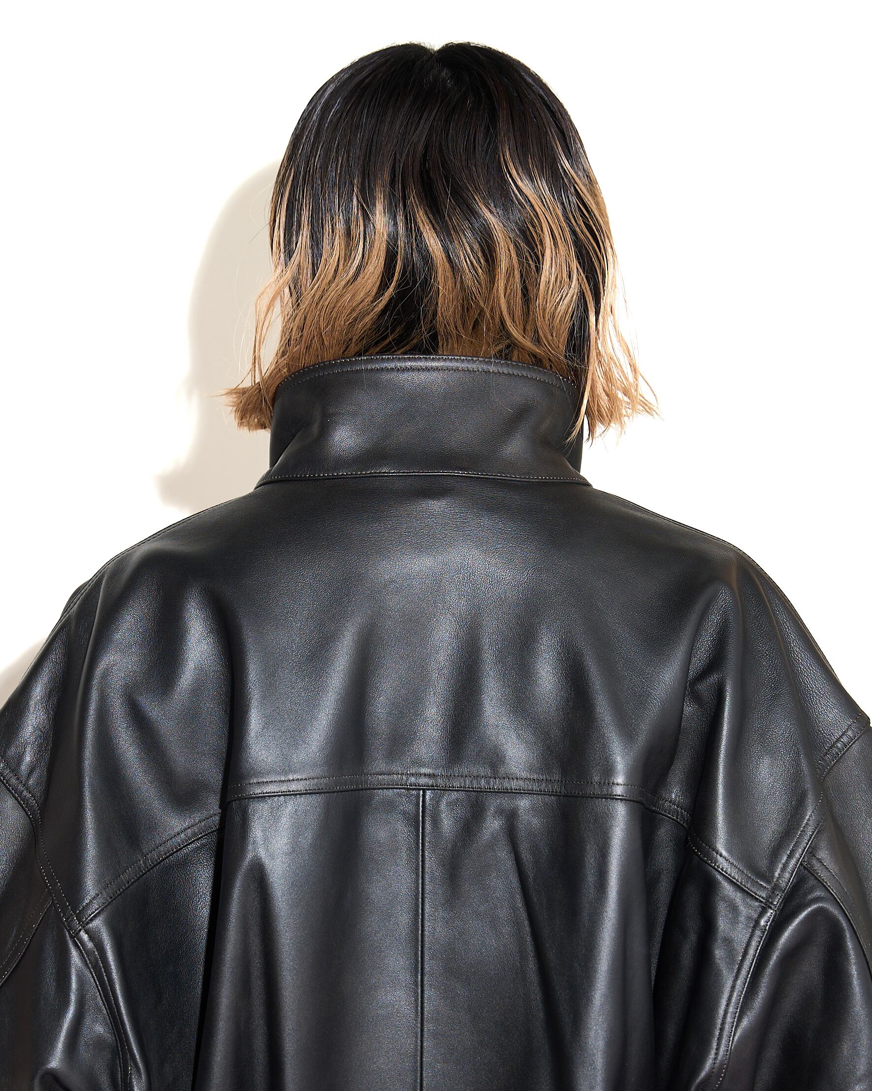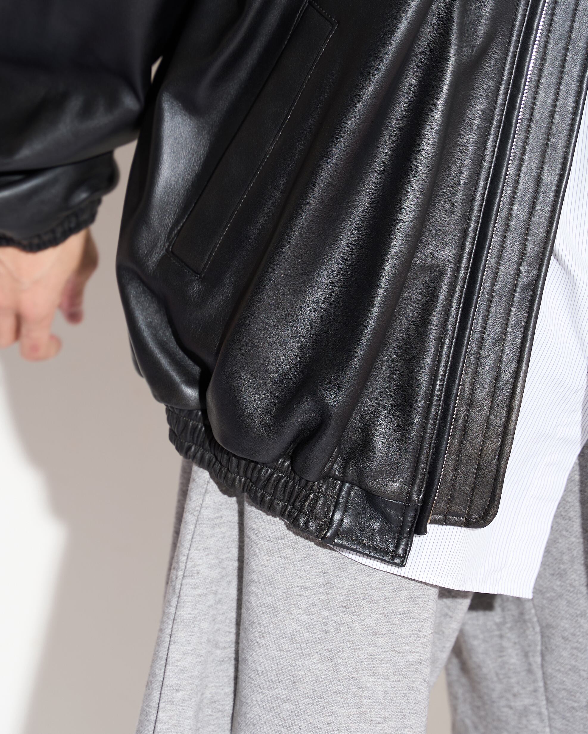 柔らかくしなやかなシープレザーを使用したスタンドカラージャケット。無駄を削ぎ落としたシンプルなデザインで、トラックジャケットのようなディテール。
