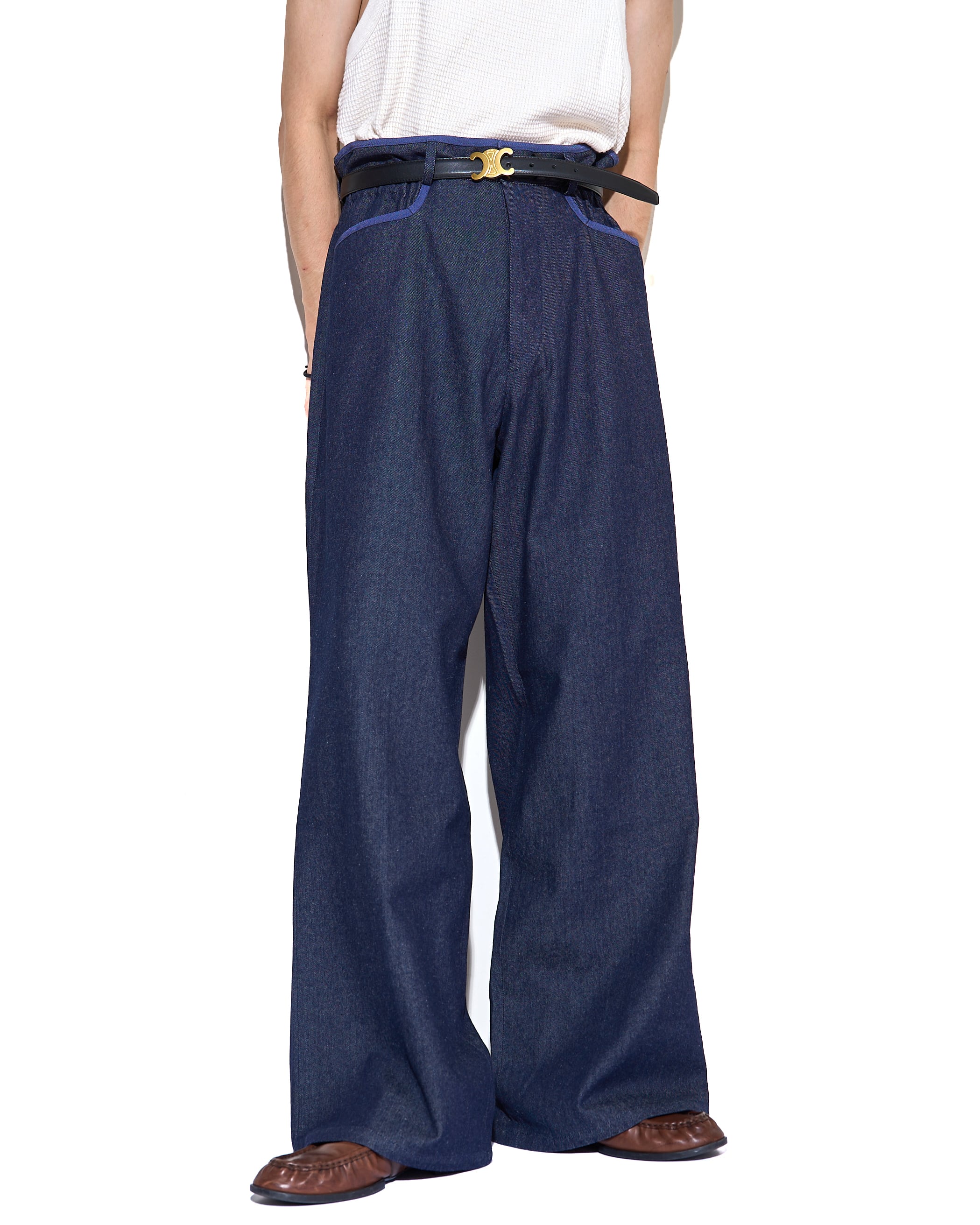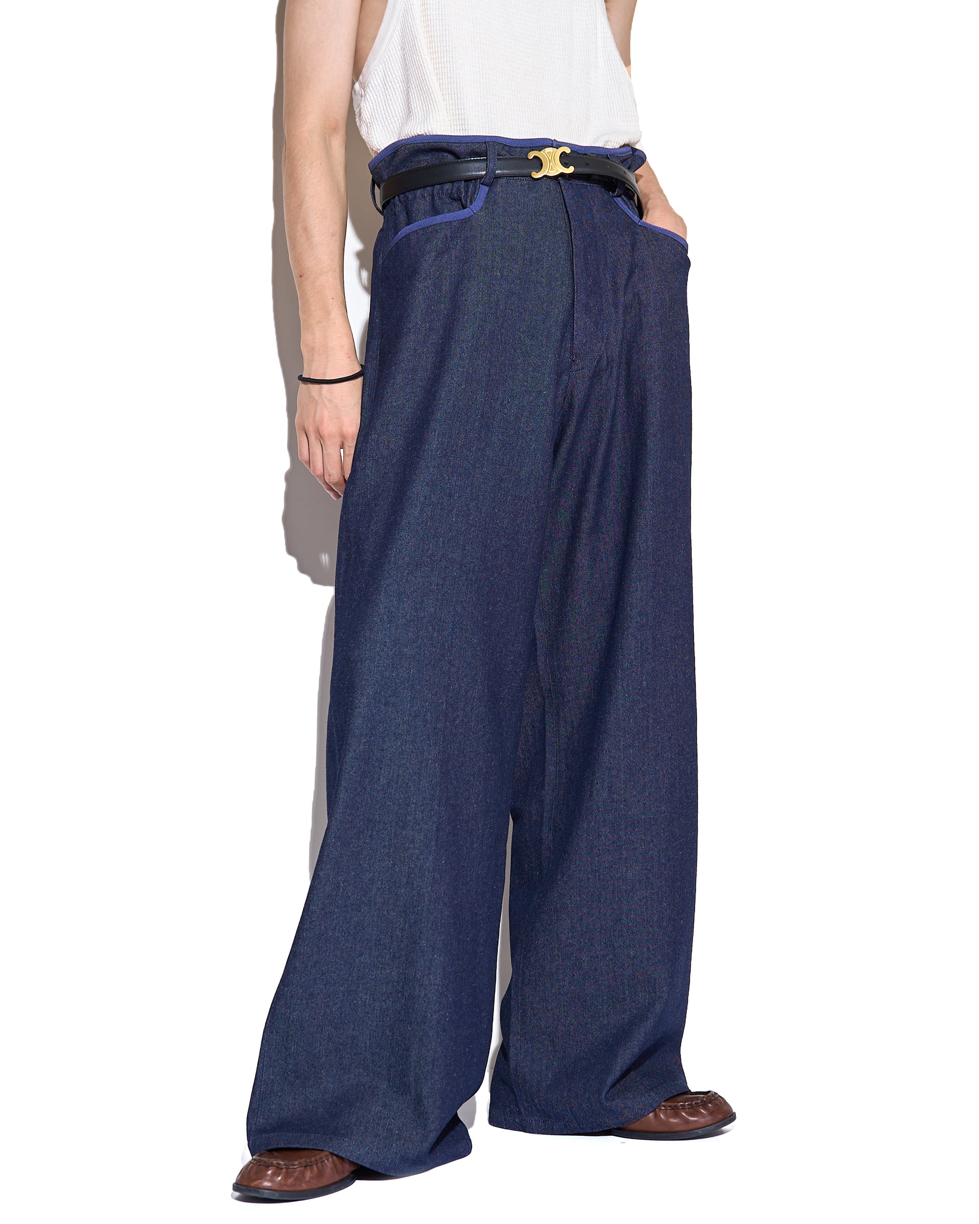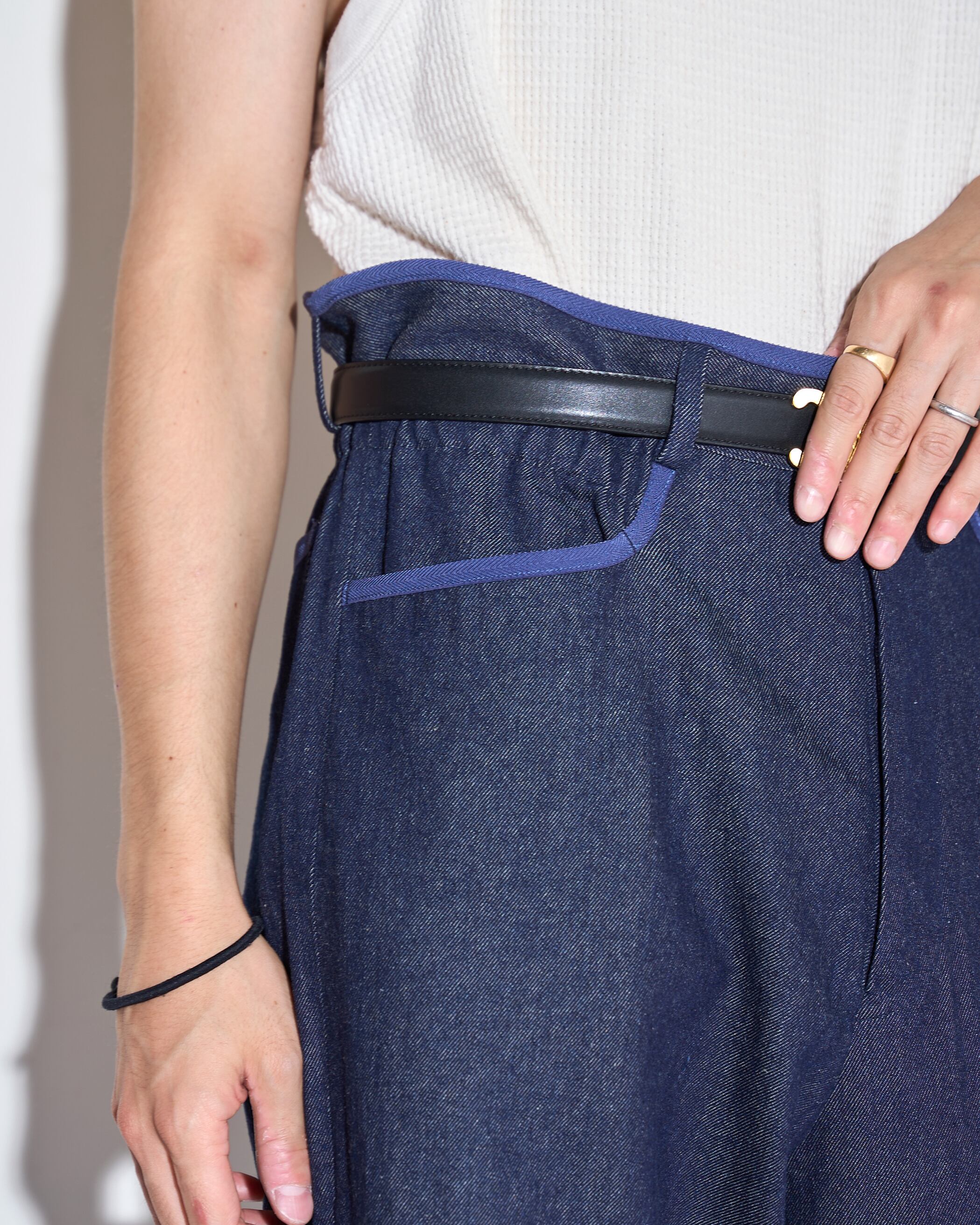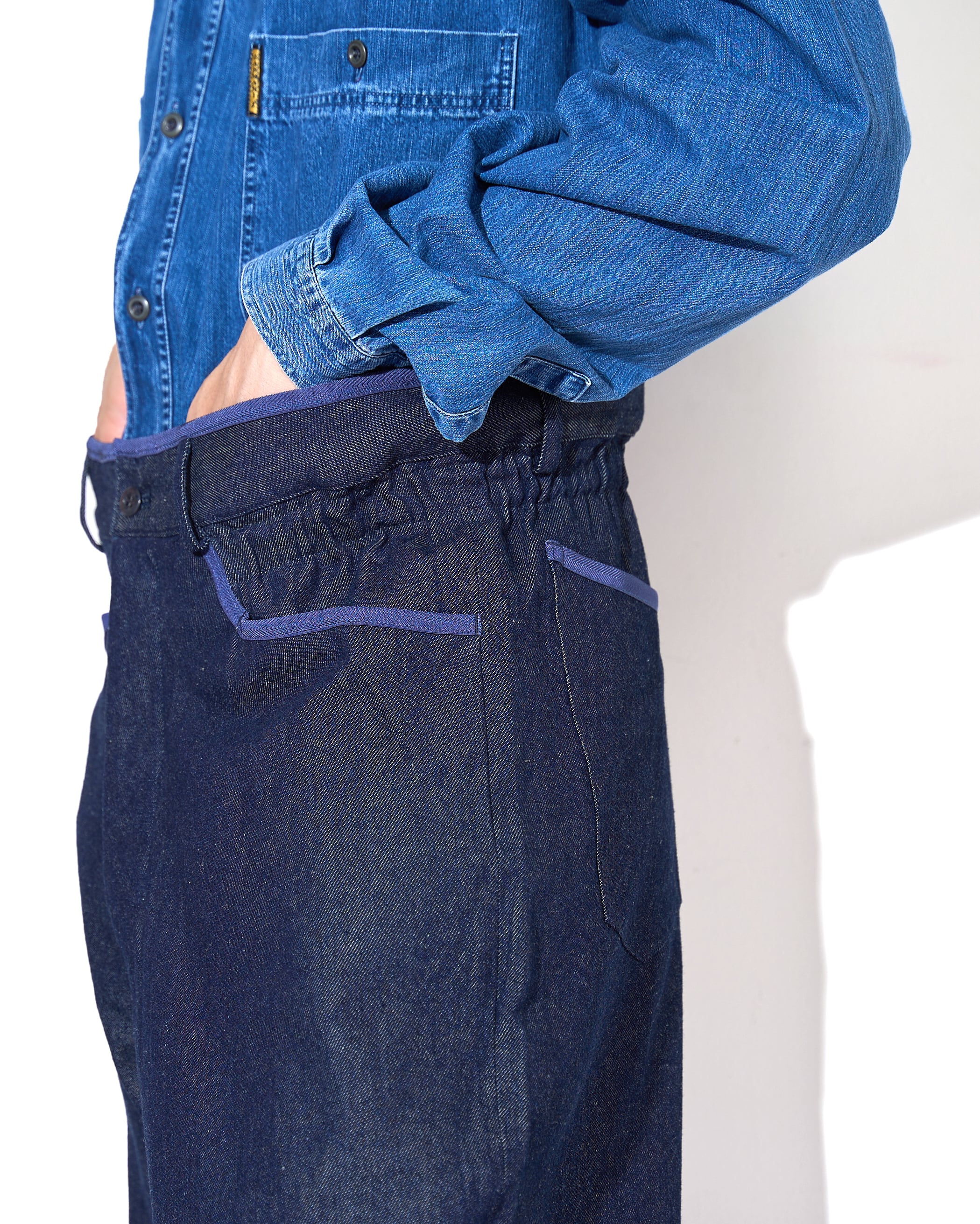 ウエストにあまりを設け、ギャザーを施した新型トラウザーズ。コットンリネンのワンウォッシュデニム生地を使用し、スタイリッシュな面構えと、程よくワイドな存在感が特徴的な一本。ウエストとポケットのパイピングがアクセントとなり、非常に品のいいデニムパンツに仕上がっています。