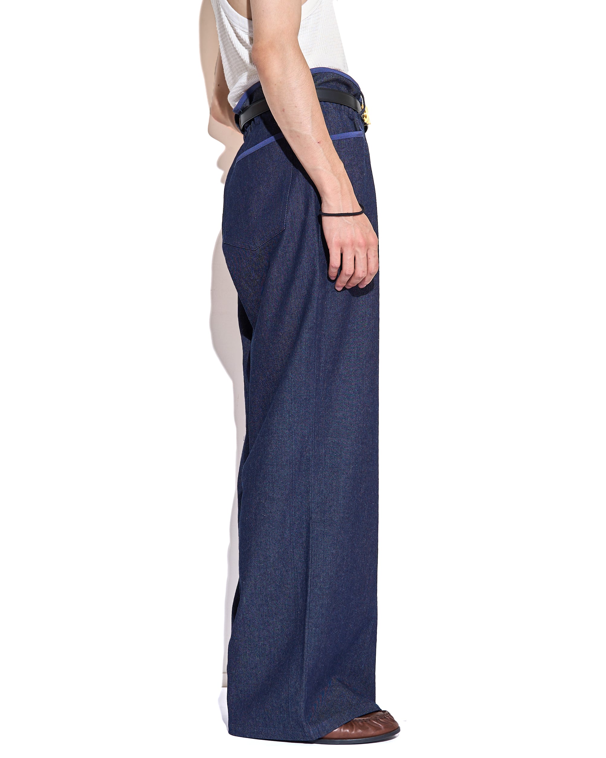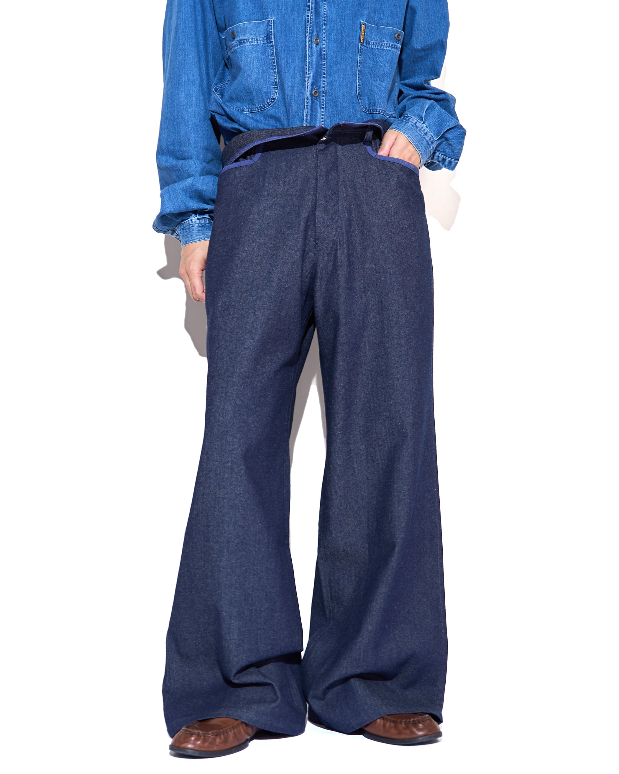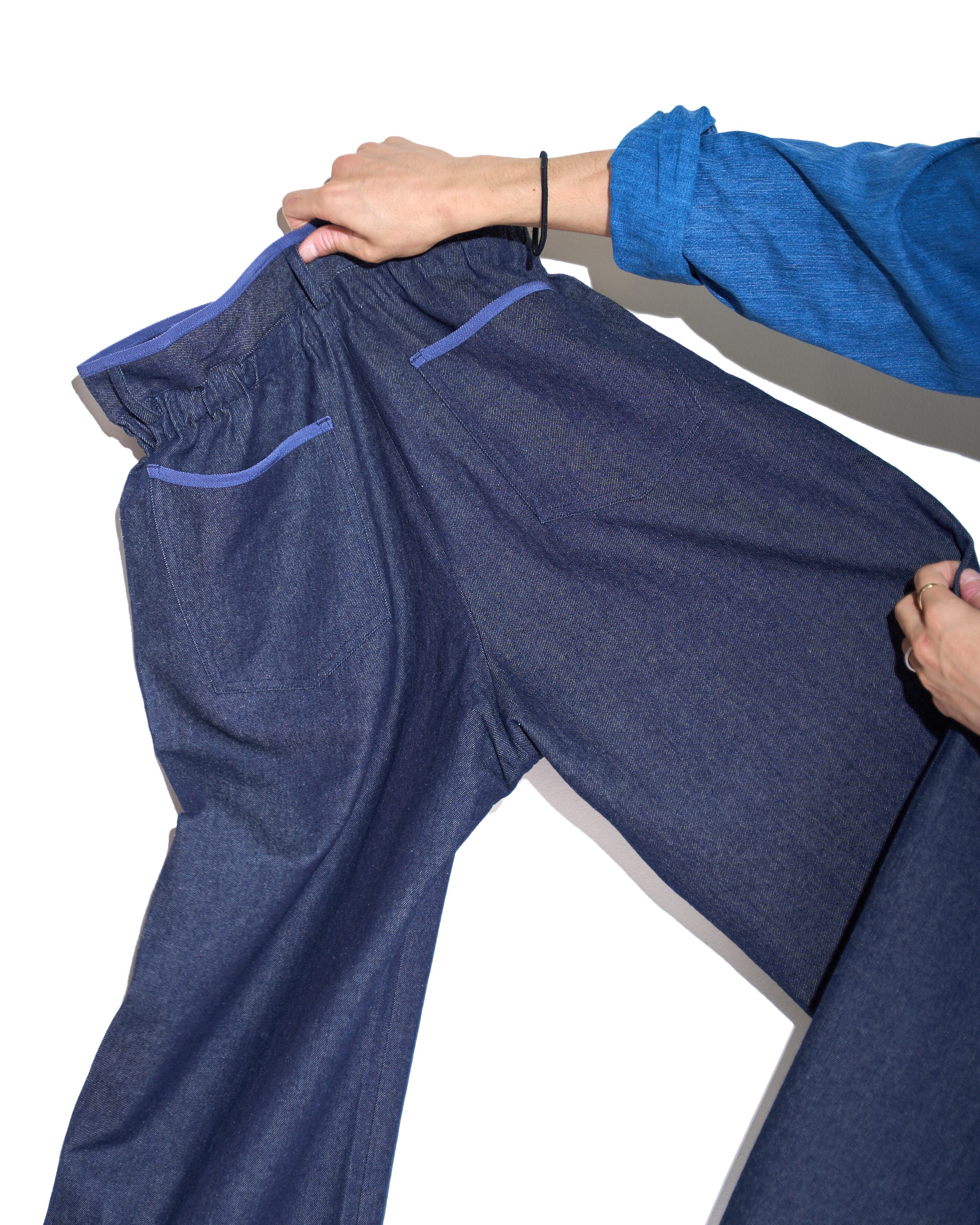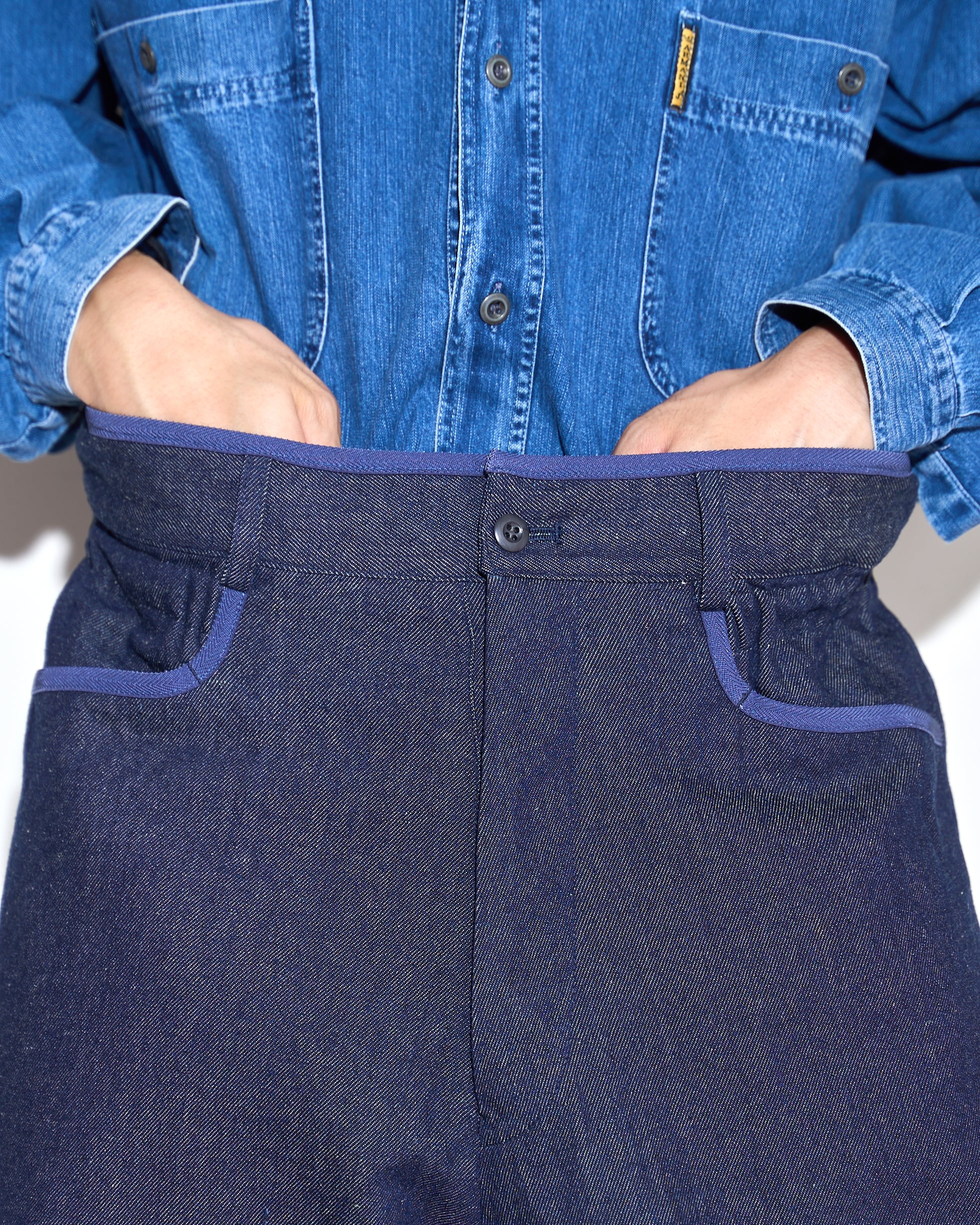ウエストにあまりを設け、ギャザーを施した新型トラウザーズ。コットンリネンのワンウォッシュデニム生地を使用し、スタイリッシュな面構えと、程よくワイドな存在感が特徴的な一本。ウエストとポケットのパイピングがアクセントとなり、非常に品のいいデニムパンツに仕上がっています。