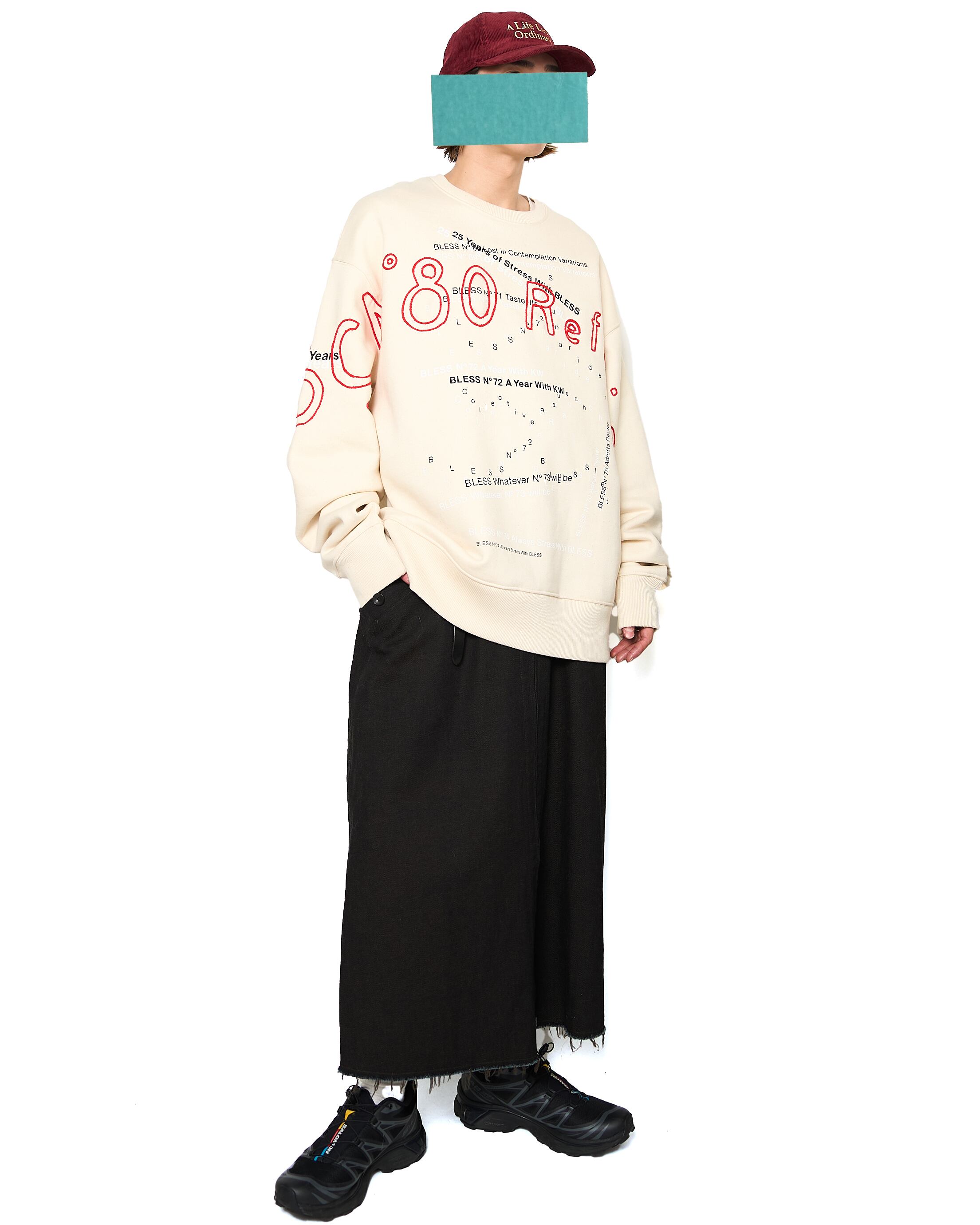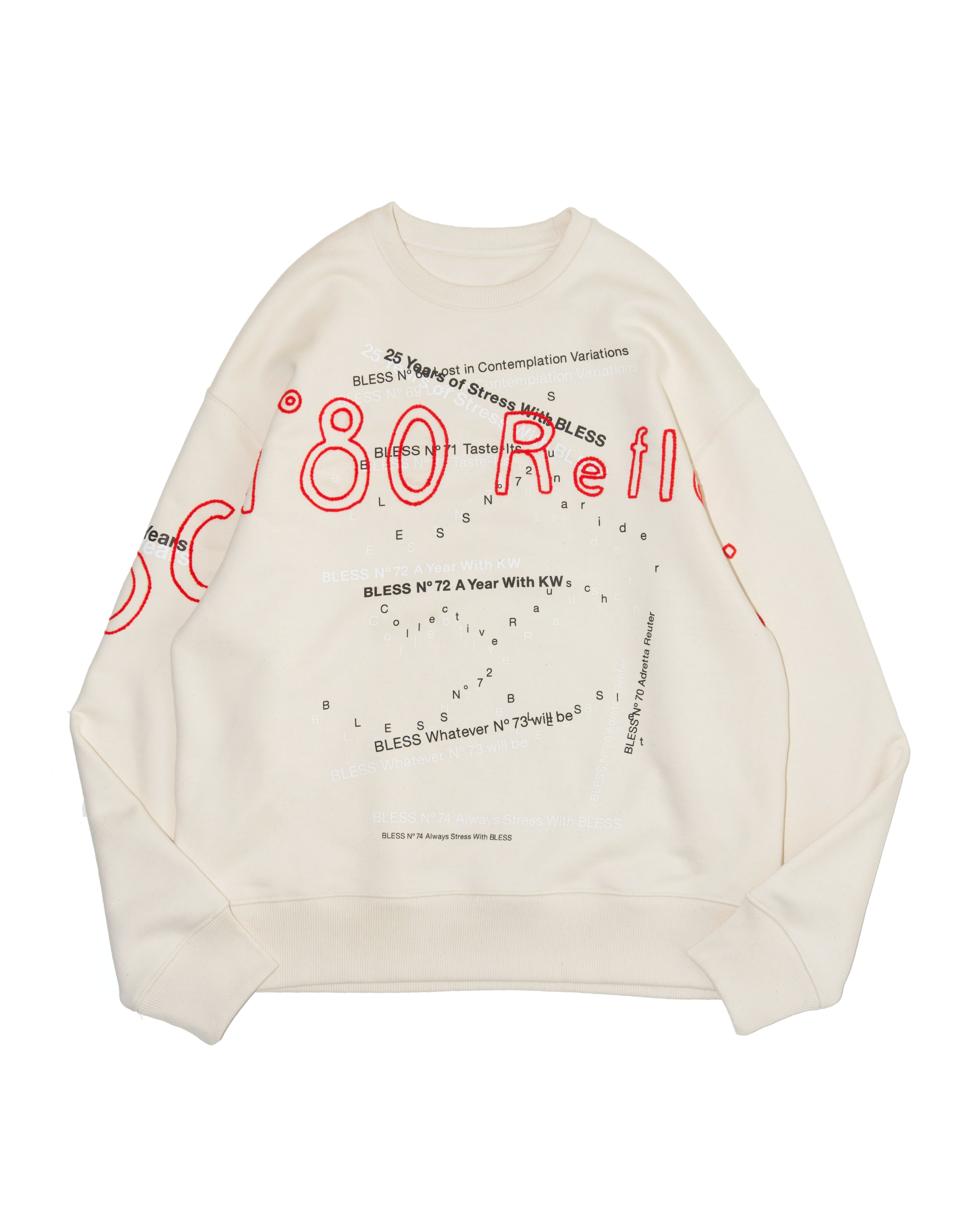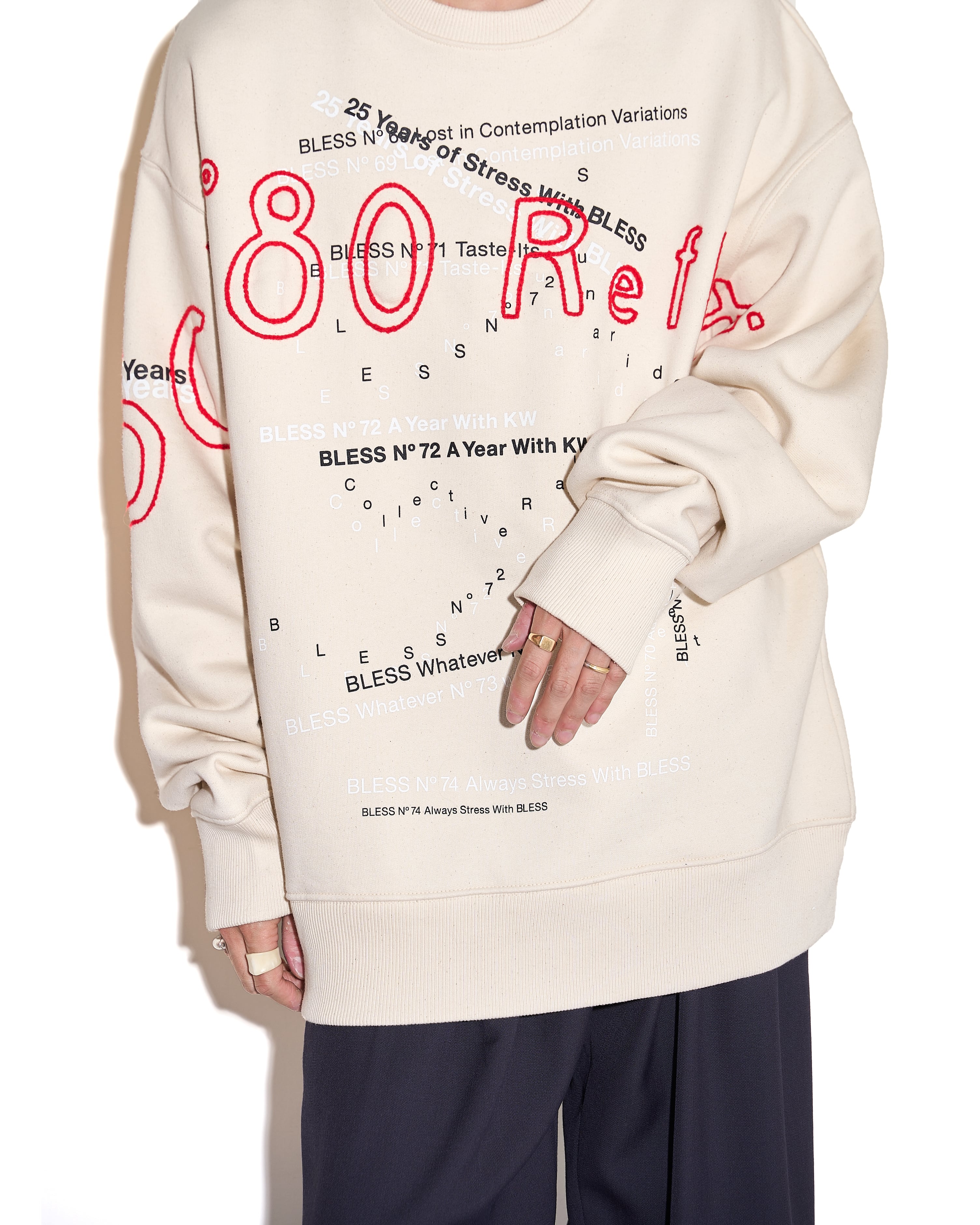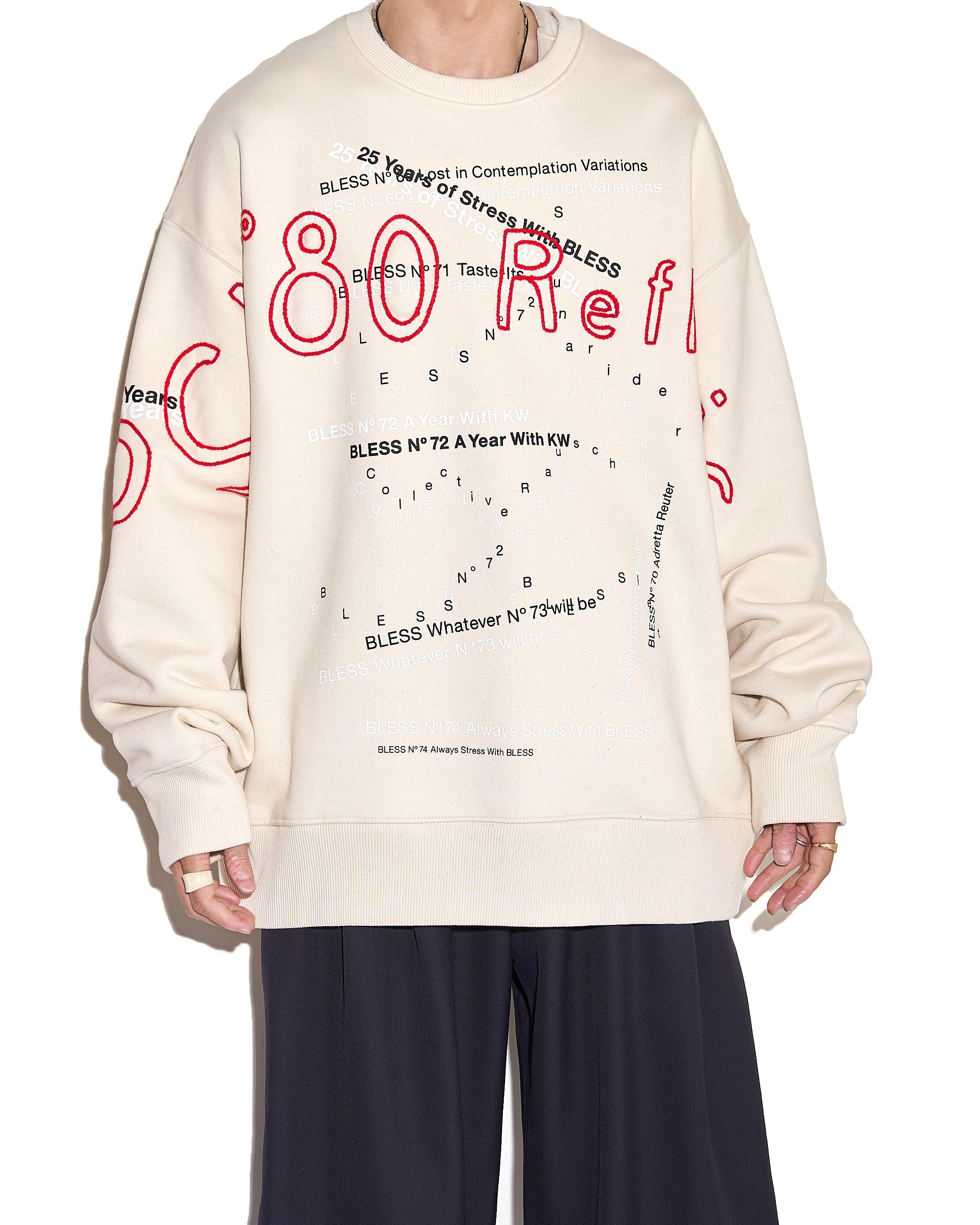 過去のシーズンテーマをプリントしたスウェットシャツに、刺繍を施した1着。生地特有のコシ、リブの厚みやバニラビーンズのような奥行きのある表情が特徴的です。赤の刺繍がブランドの世界観を存分に表現しています。