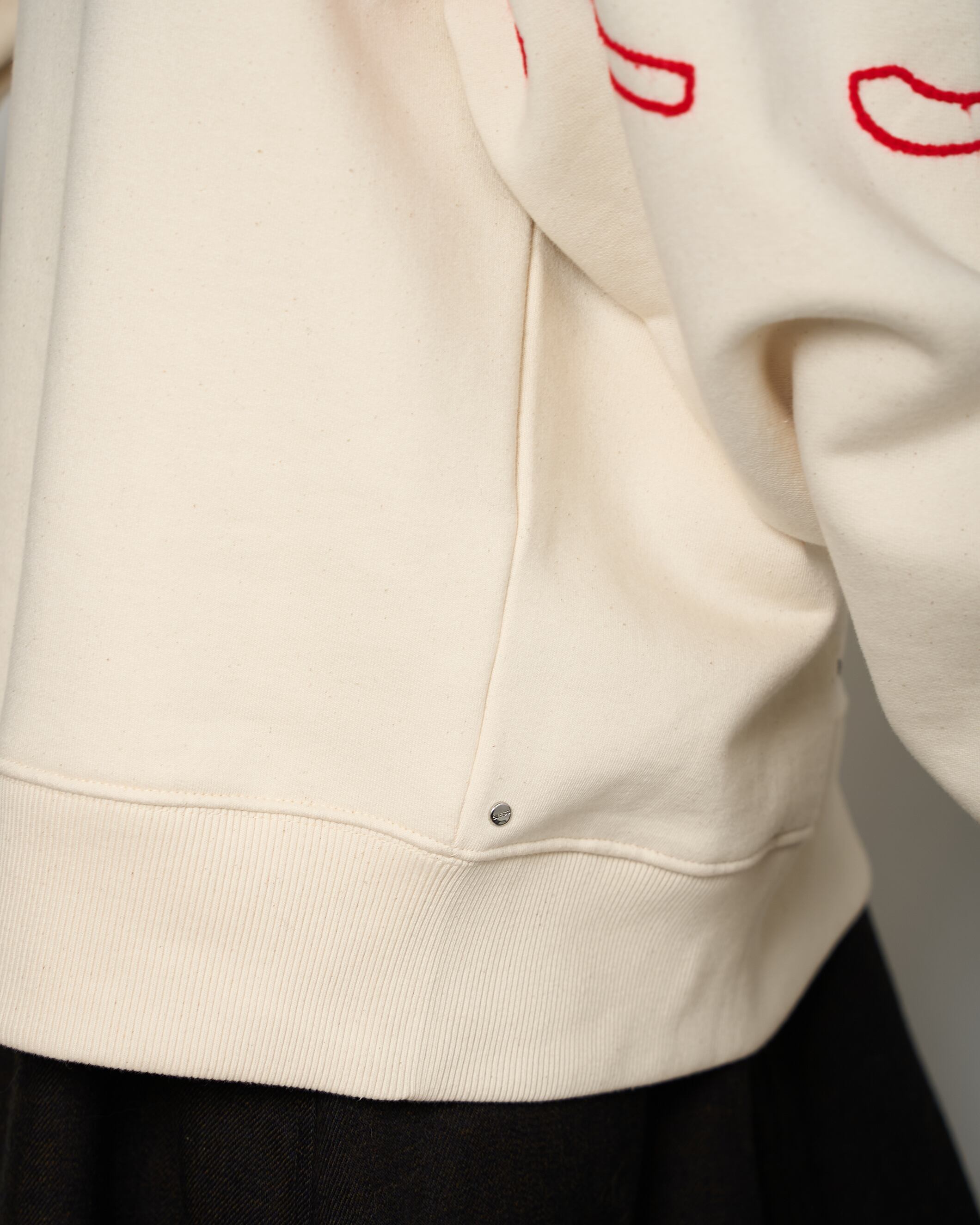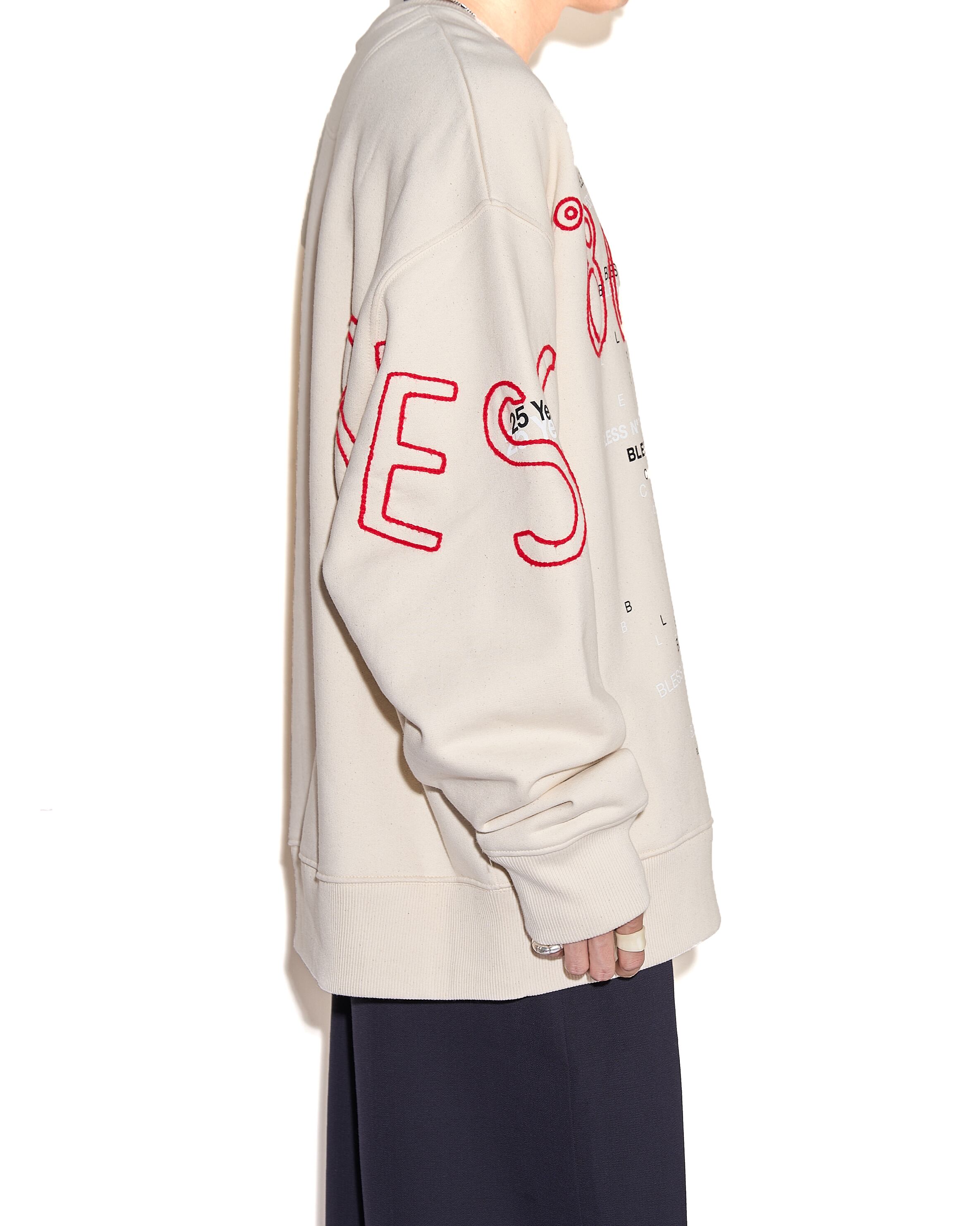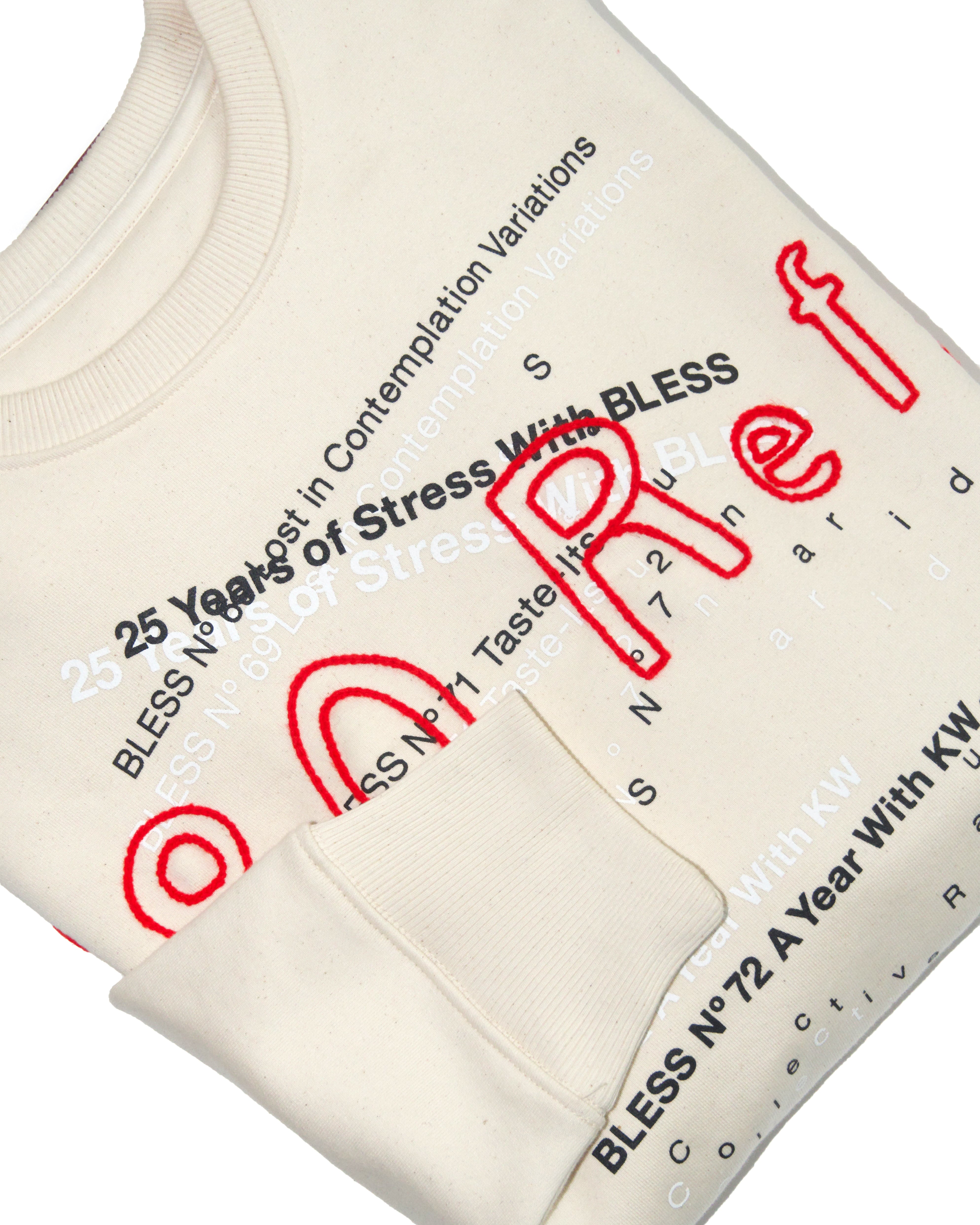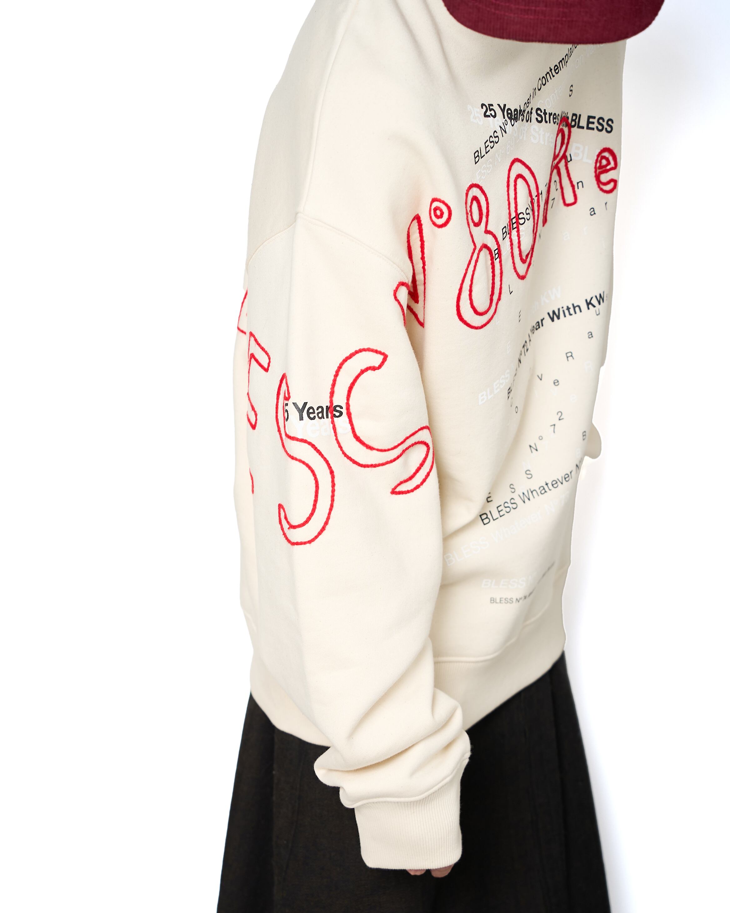 過去のシーズンテーマをプリントしたスウェットシャツに、刺繍を施した1着。生地特有のコシ、リブの厚みやバニラビーンズのような奥行きのある表情が特徴的です。赤の刺繍がブランドの世界観を存分に表現しています。