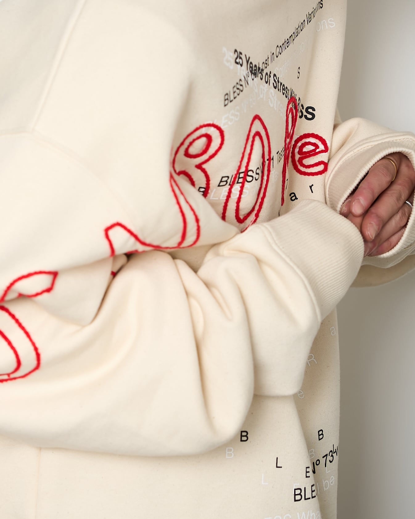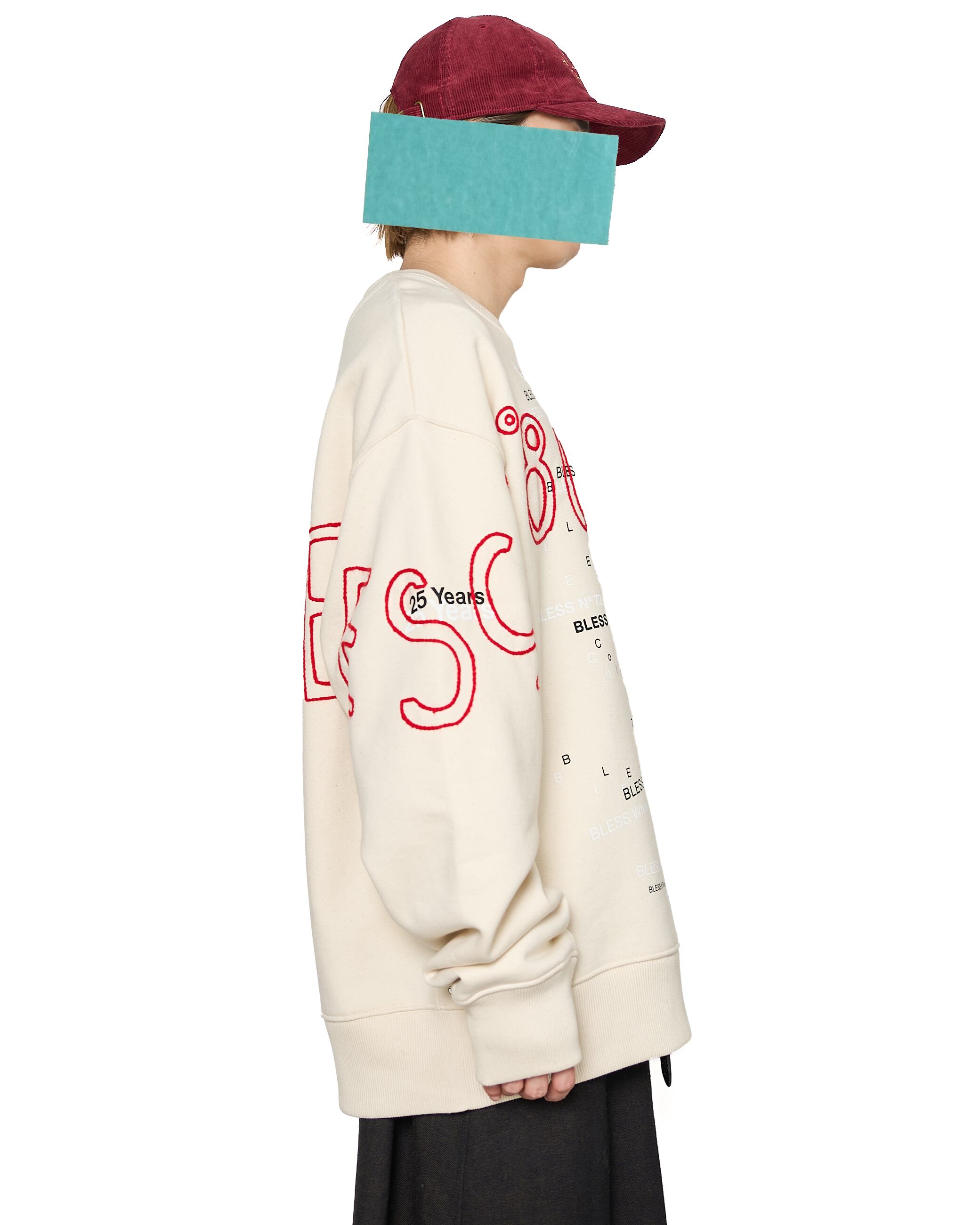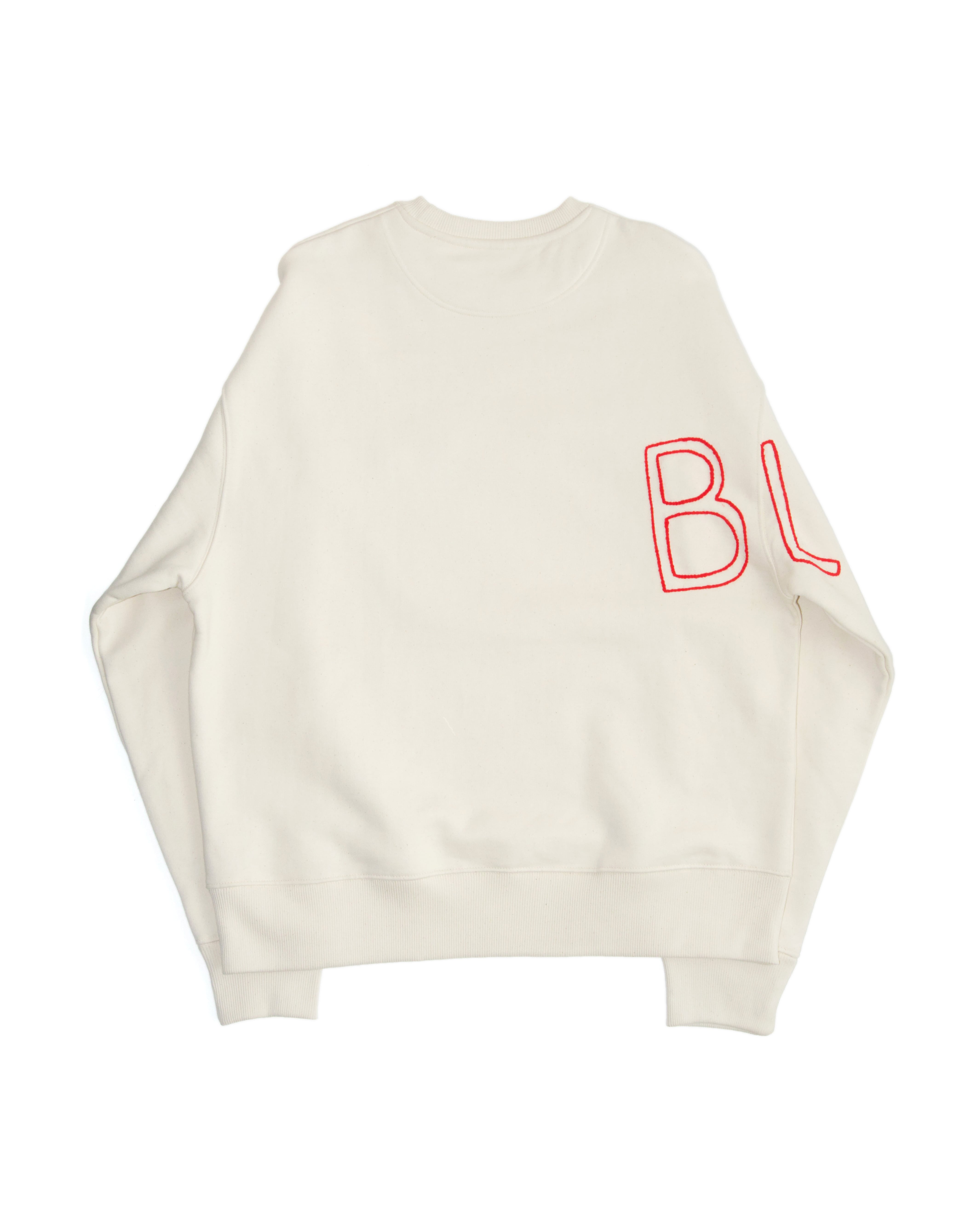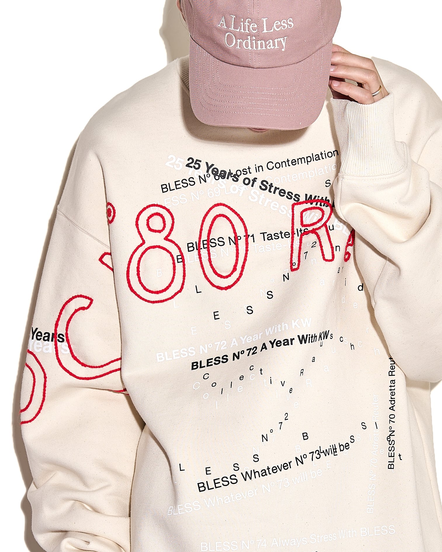 過去のシーズンテーマをプリントしたスウェットシャツに、刺繍を施した1着。生地特有のコシ、リブの厚みやバニラビーンズのような奥行きのある表情が特徴的です。赤の刺繍がブランドの世界観を存分に表現しています。