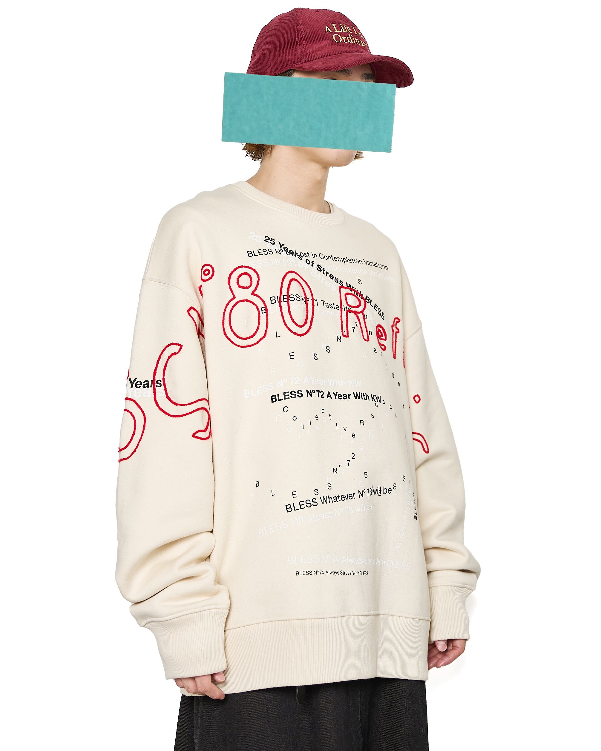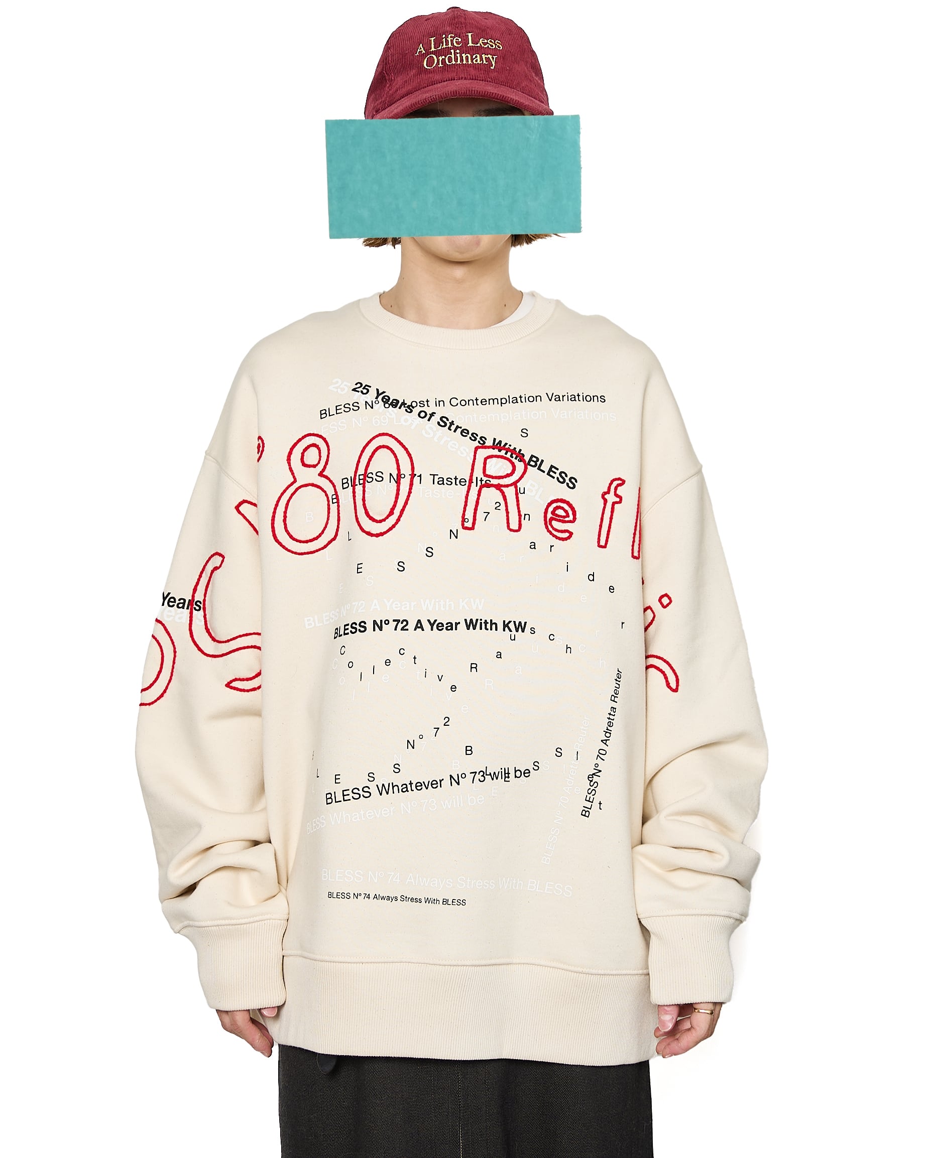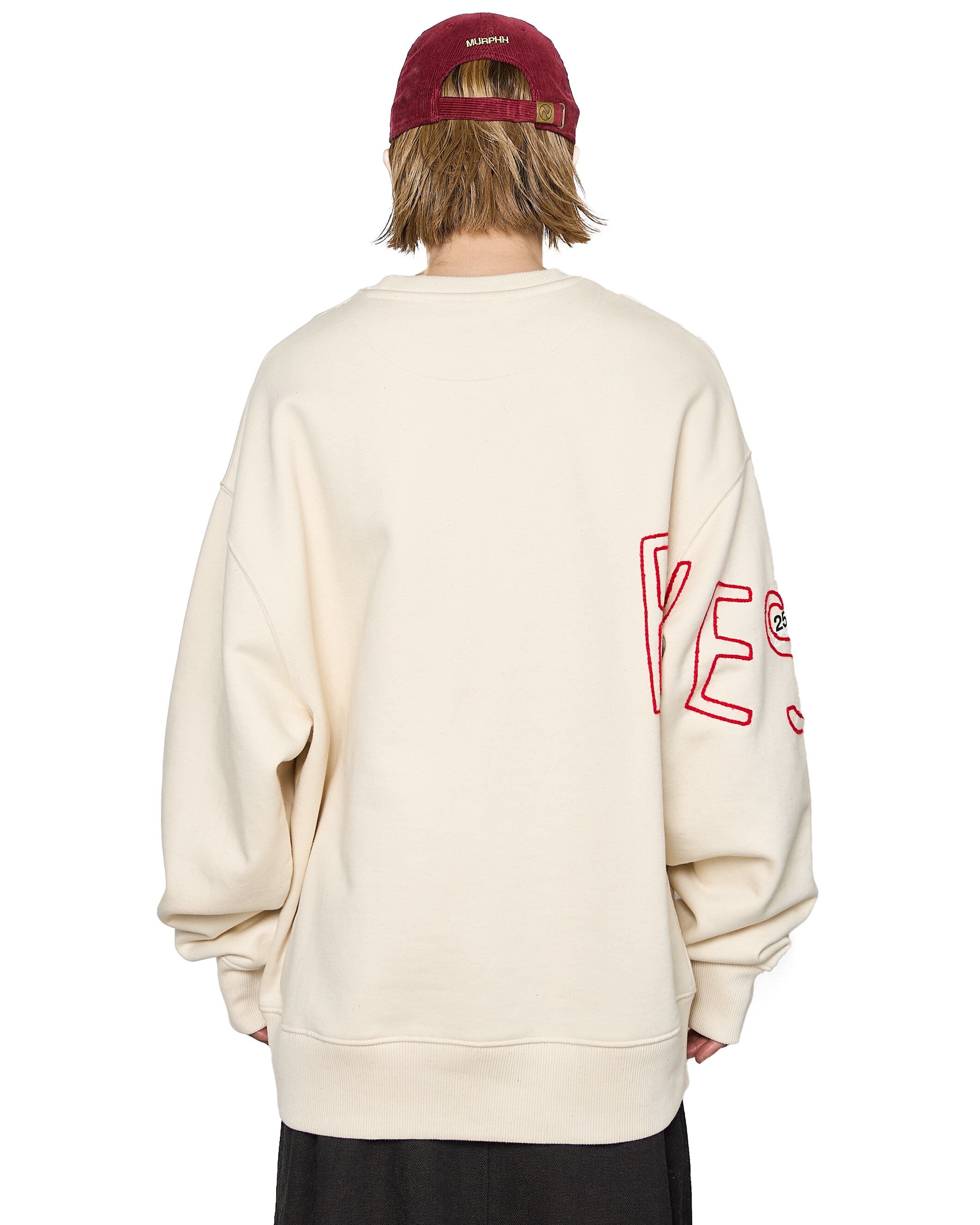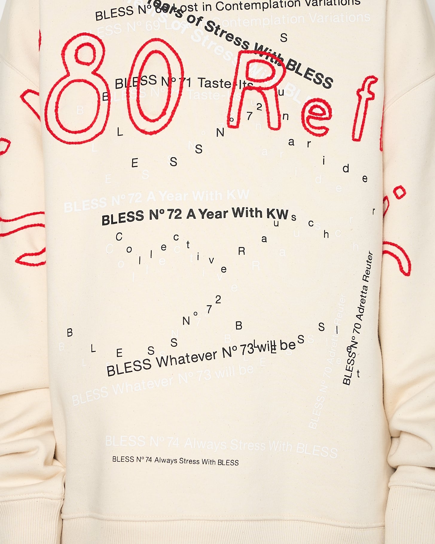 過去のシーズンテーマをプリントしたスウェットシャツに、刺繍を施した1着。生地特有のコシ、リブの厚みやバニラビーンズのような奥行きのある表情が特徴的です。赤の刺繍がブランドの世界観を存分に表現しています。