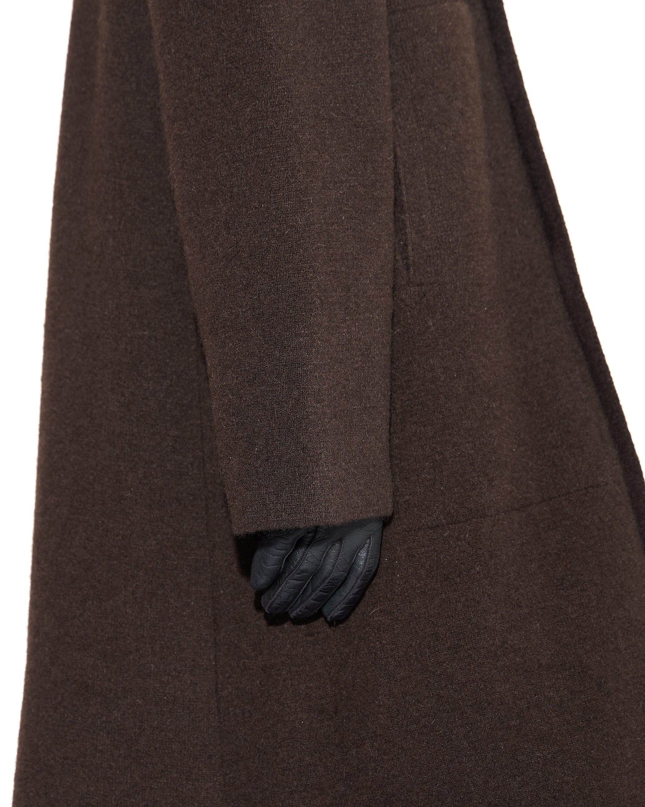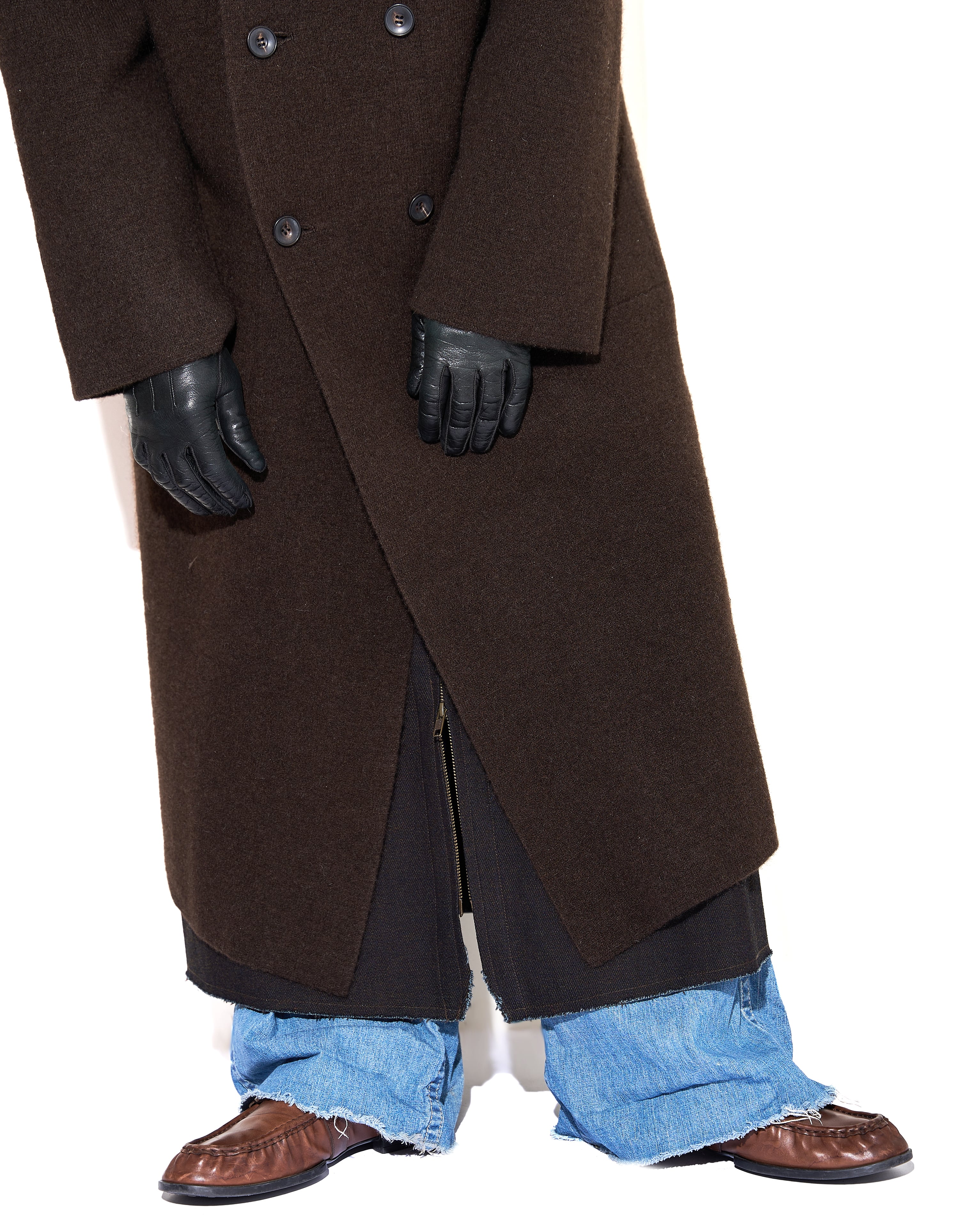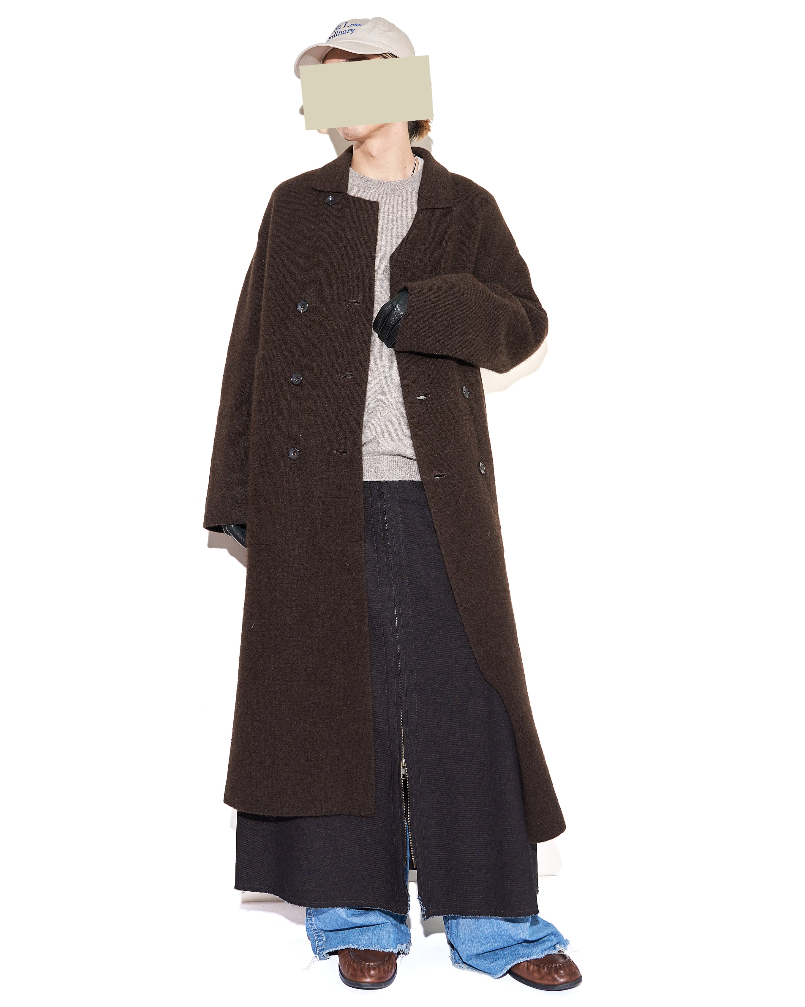 今シーズンのテーマでもある、ヤクを使用したニット仕立てのダブルブレステッドコート。野生的な風合いを残しながらも、しなやかな触り心地が特徴的で、編み地を厚く設計することで、しなやかで力強いフォルムに仕上げています。