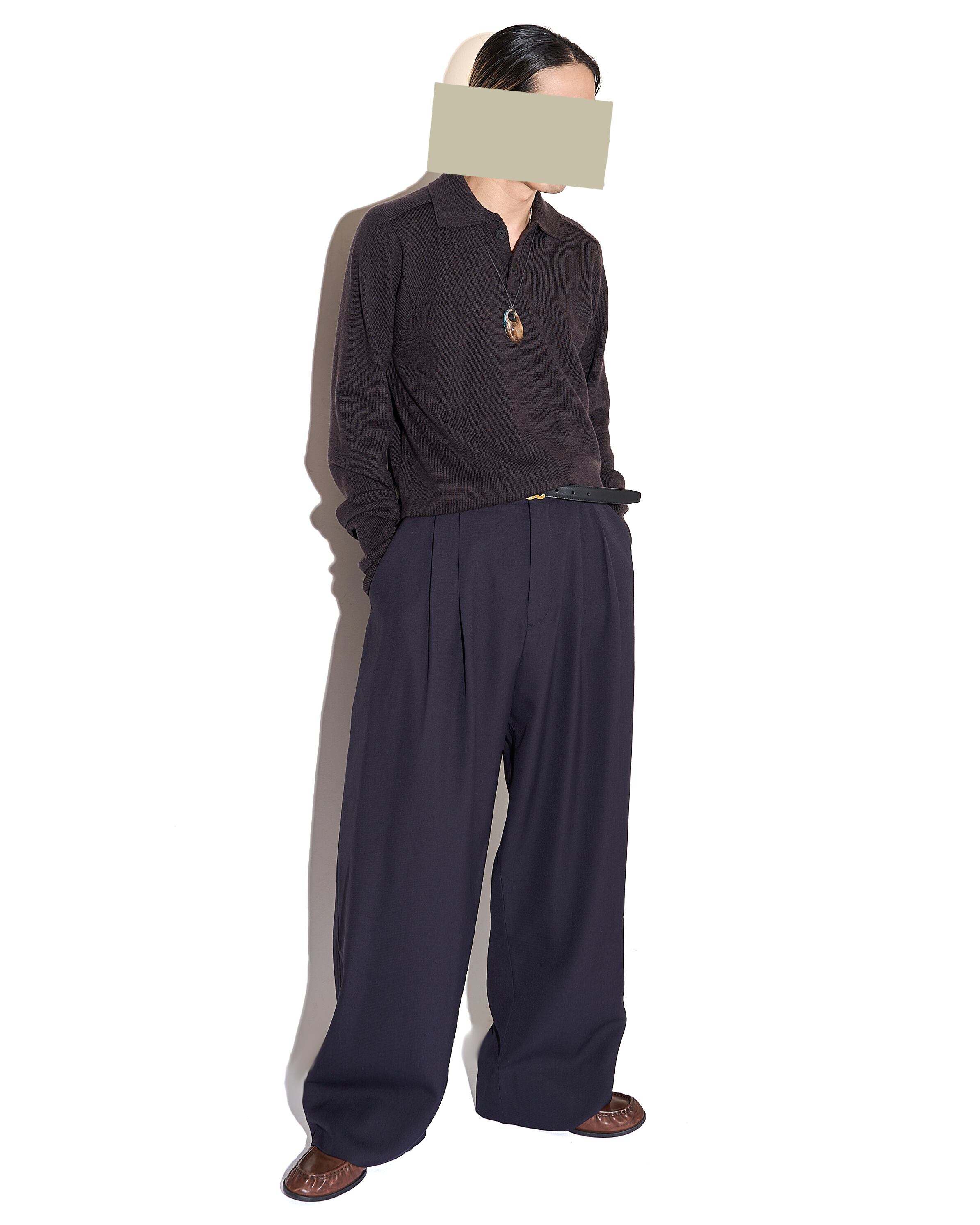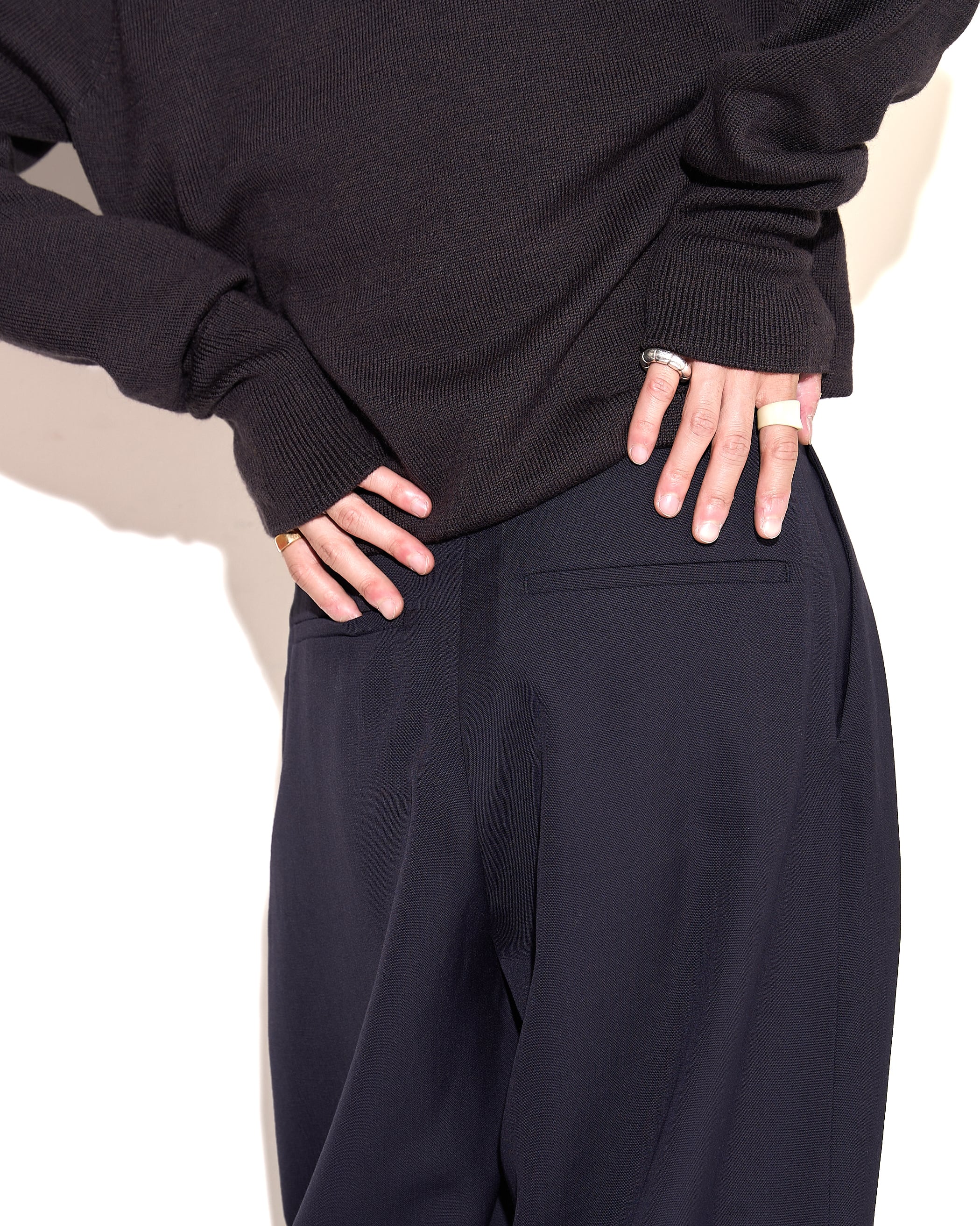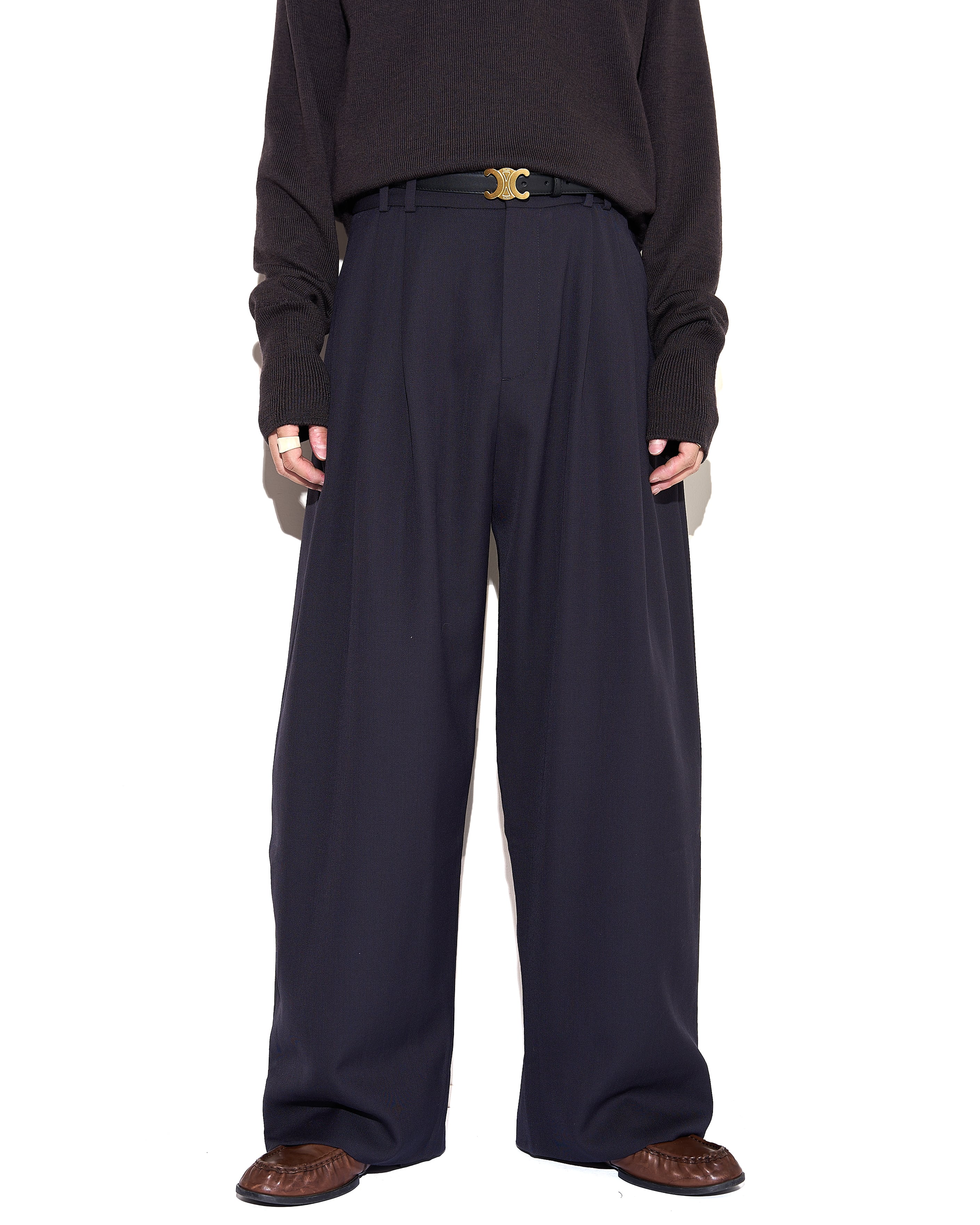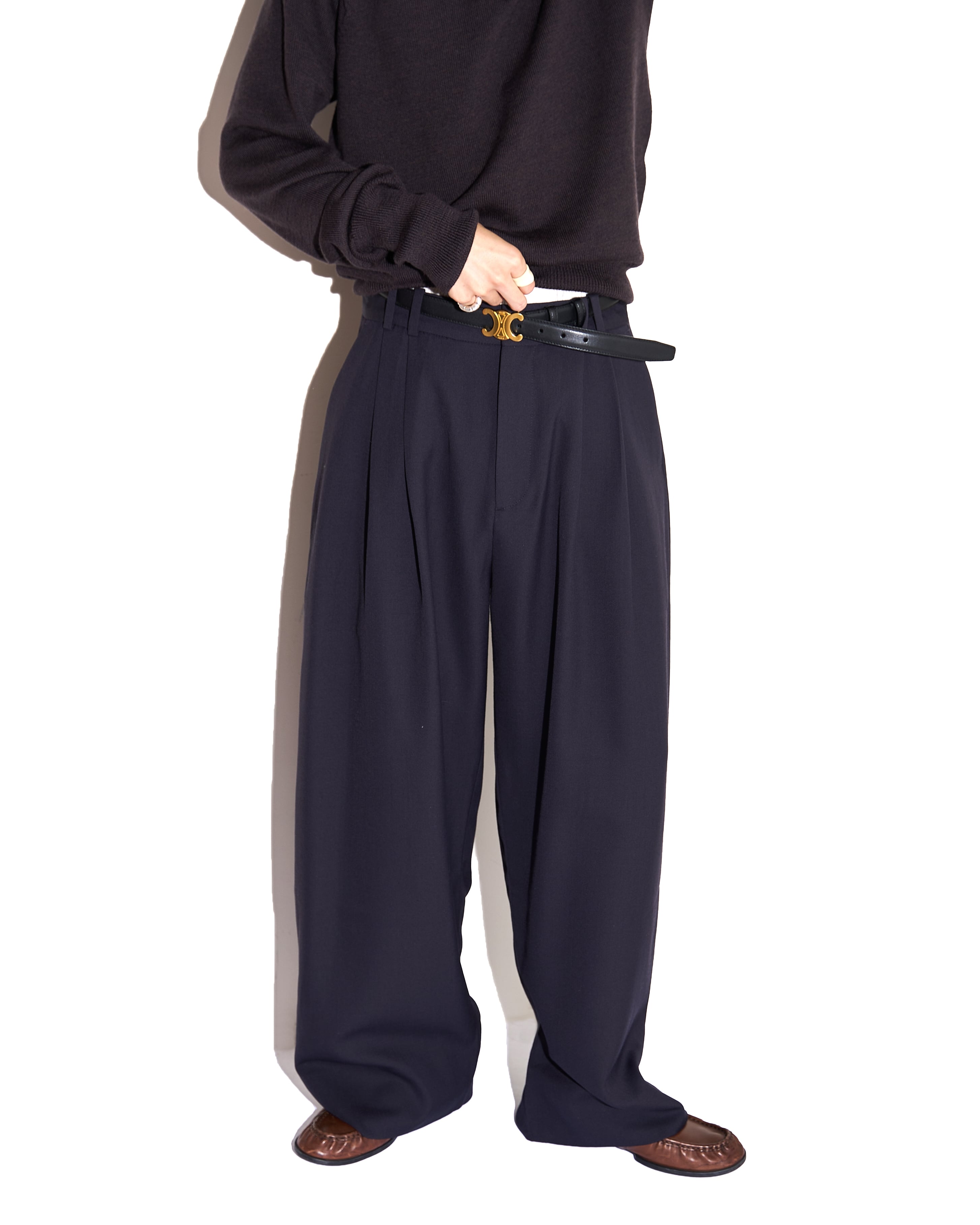 ウールポリエステルを使用した、ドレープの美しいワイドパンツ。深く入った2タック、曲線を描くような立体的なフォルムが特徴的で、90sのムードを漂わせつつ、ドレッシーに仕上げた一本です。PEWTERというチャコールグレーとネイビーを混ぜたような絶妙なカラーも魅力的。