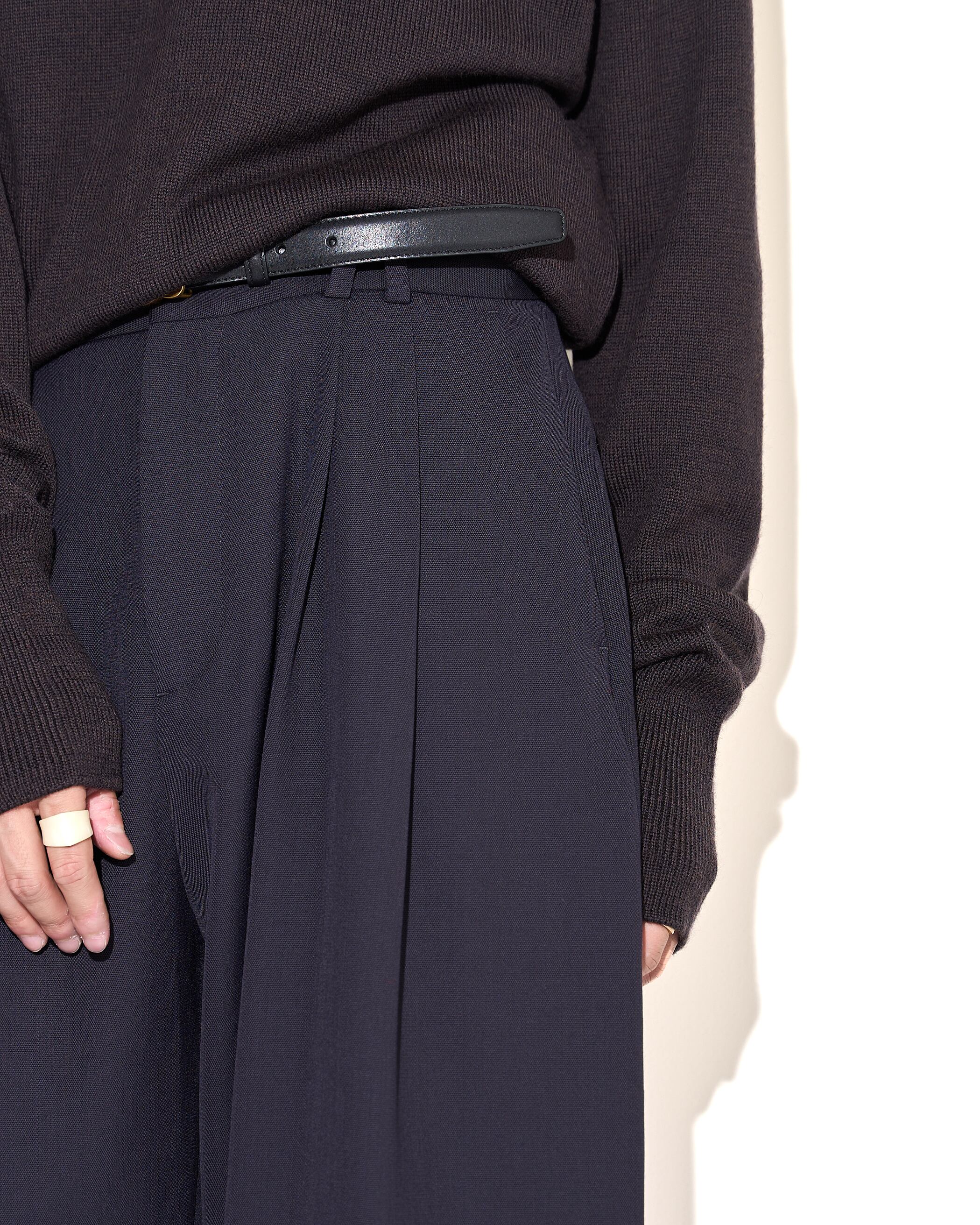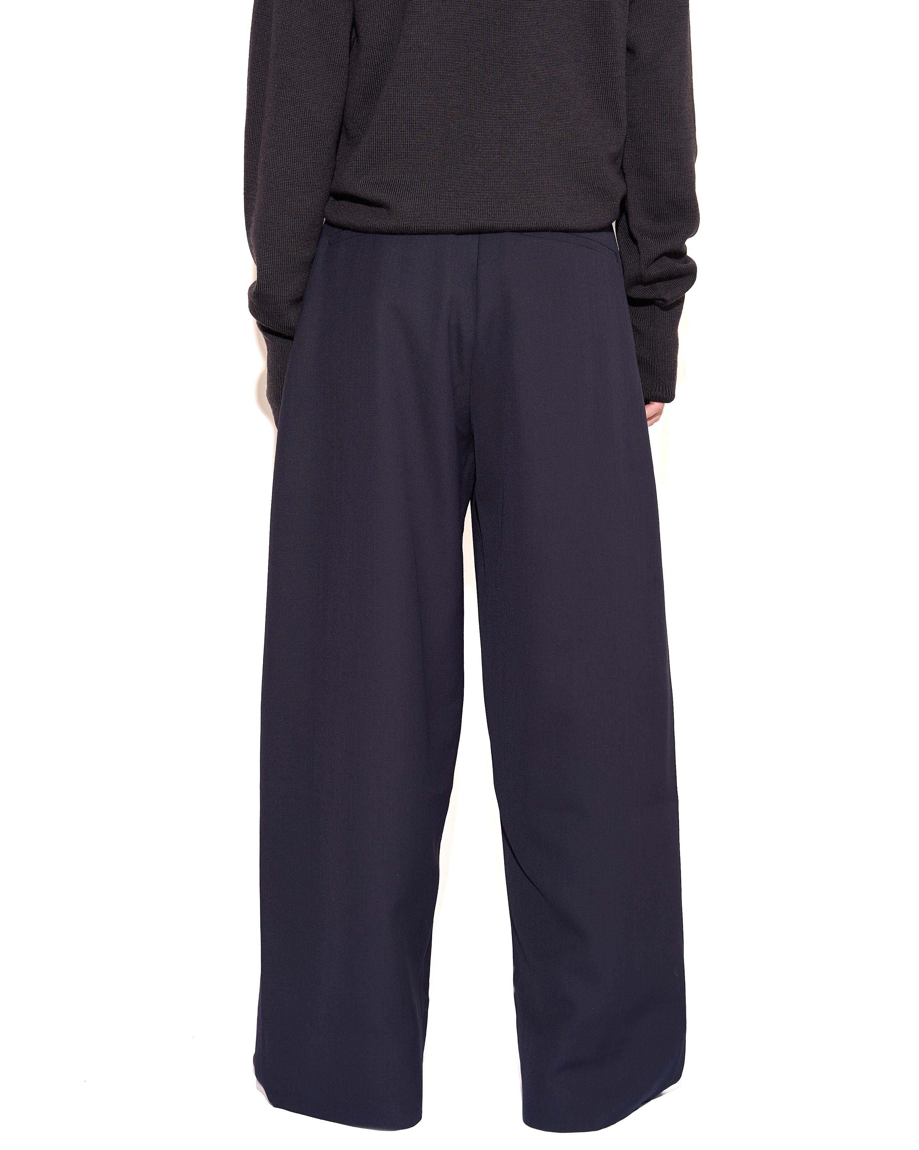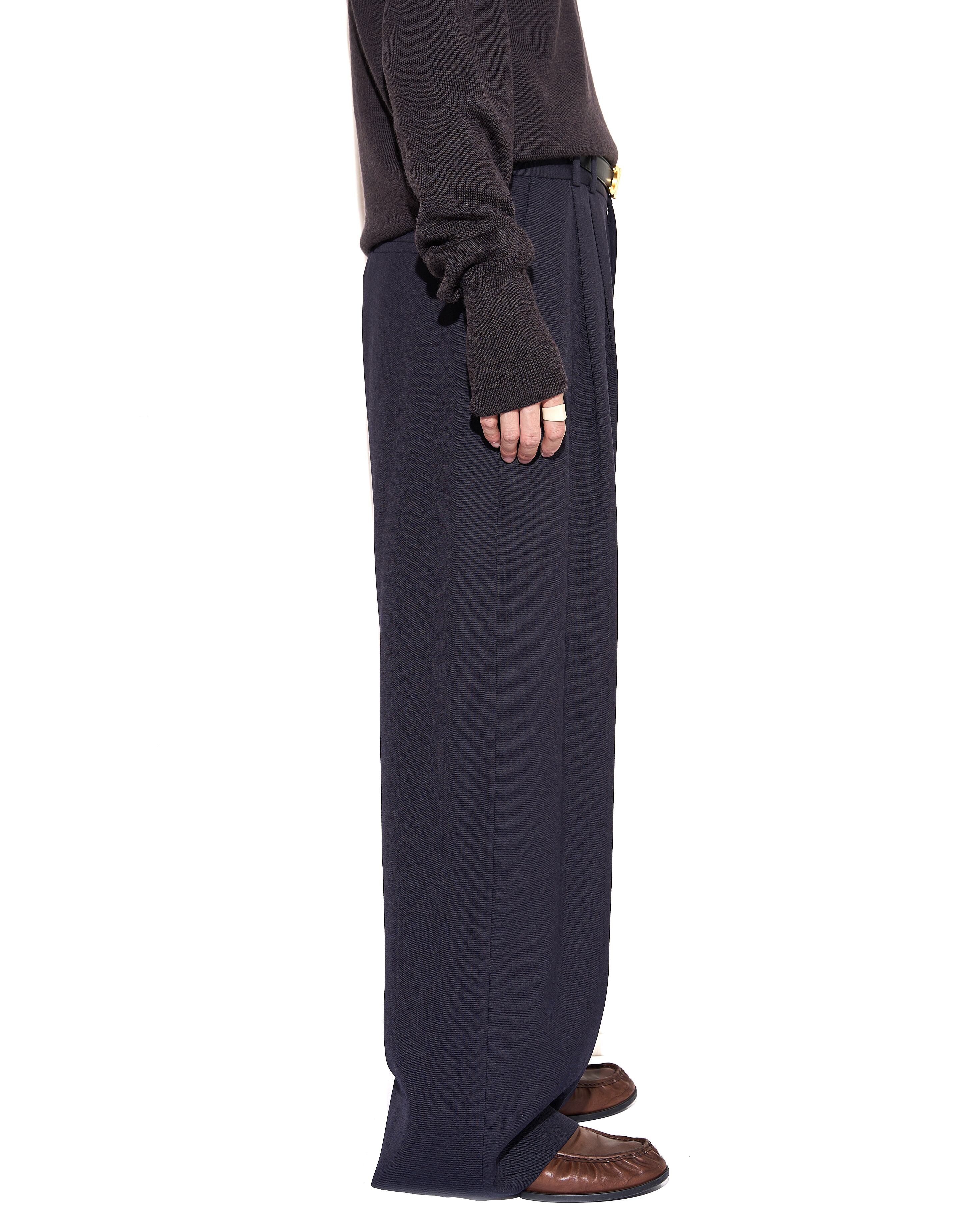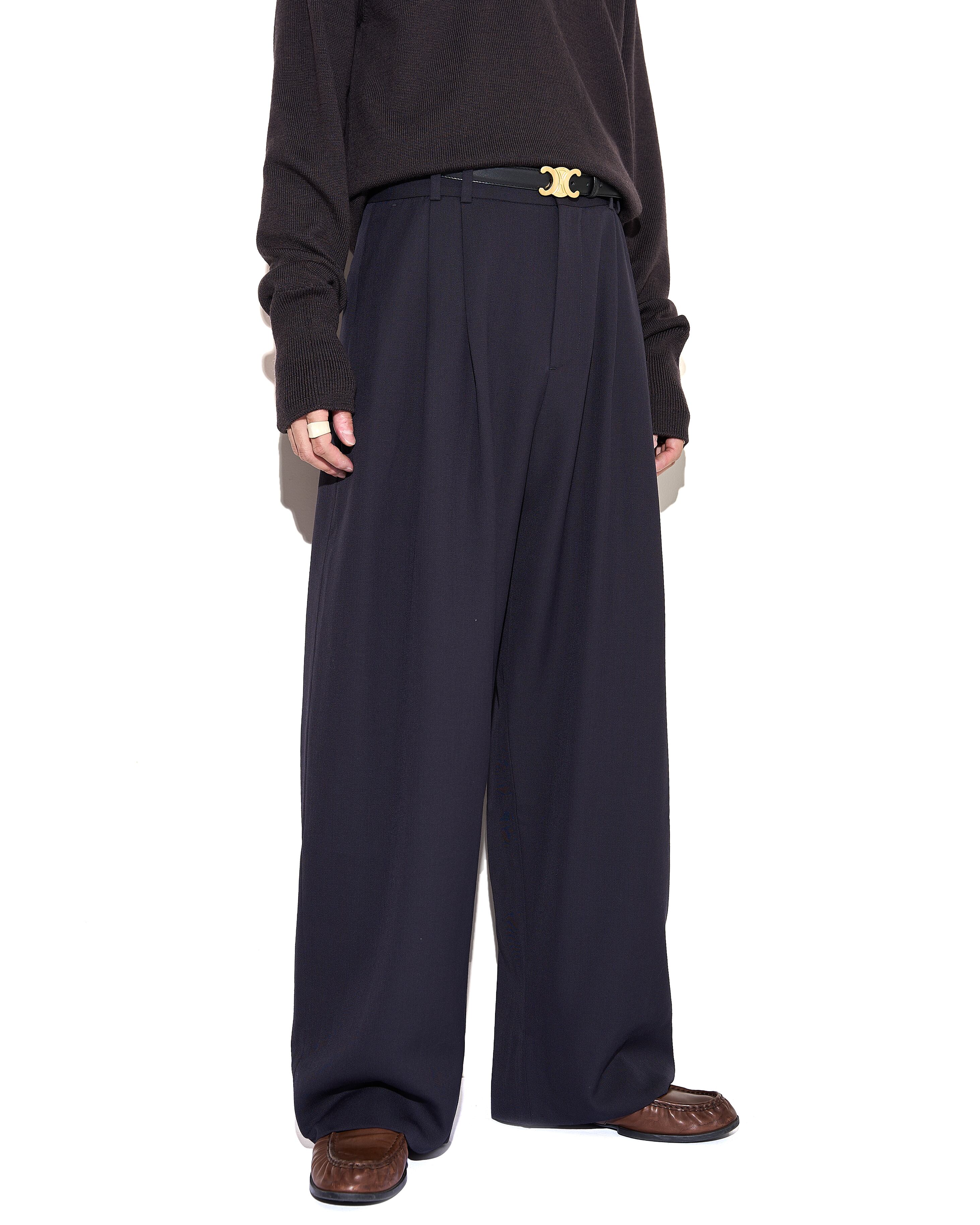 ウールポリエステルを使用した、ドレープの美しいワイドパンツ。深く入った2タック、曲線を描くような立体的なフォルムが特徴的で、90sのムードを漂わせつつ、ドレッシーに仕上げた一本です。PEWTERというチャコールグレーとネイビーを混ぜたような絶妙なカラーも魅力的。