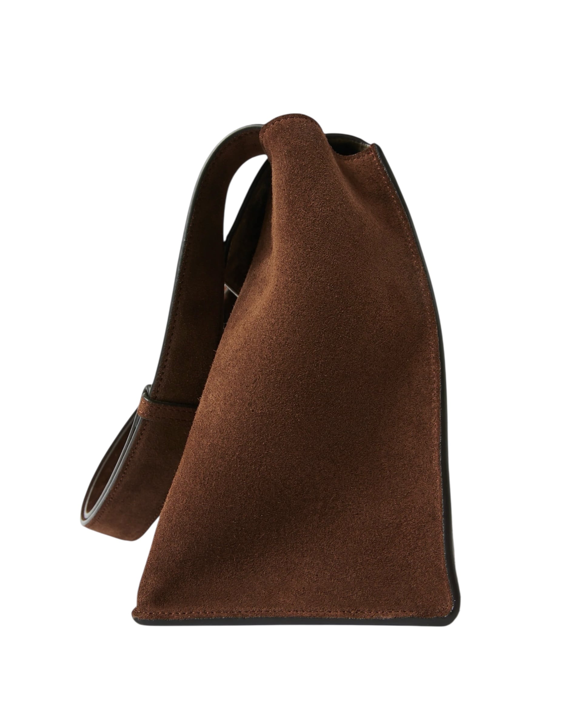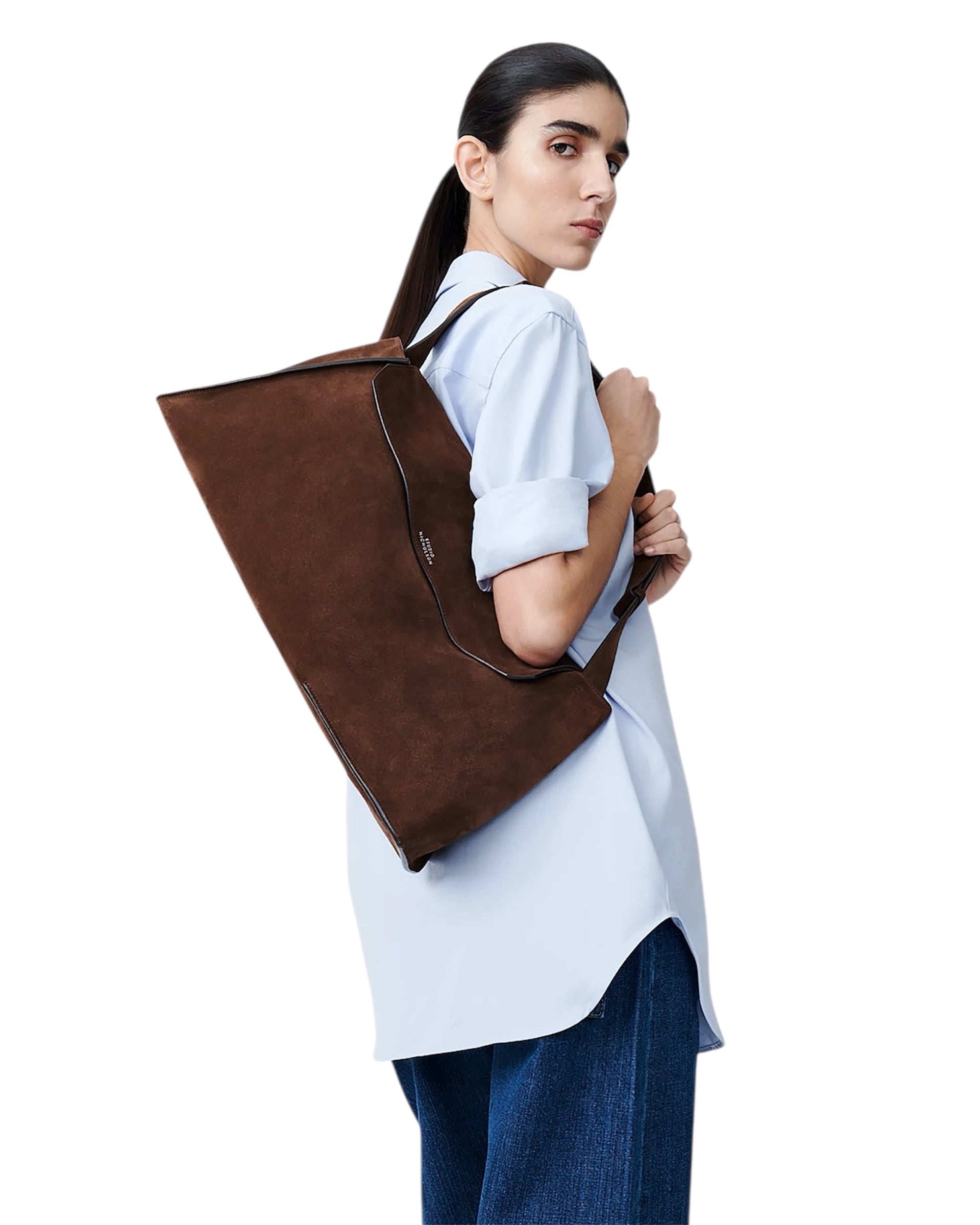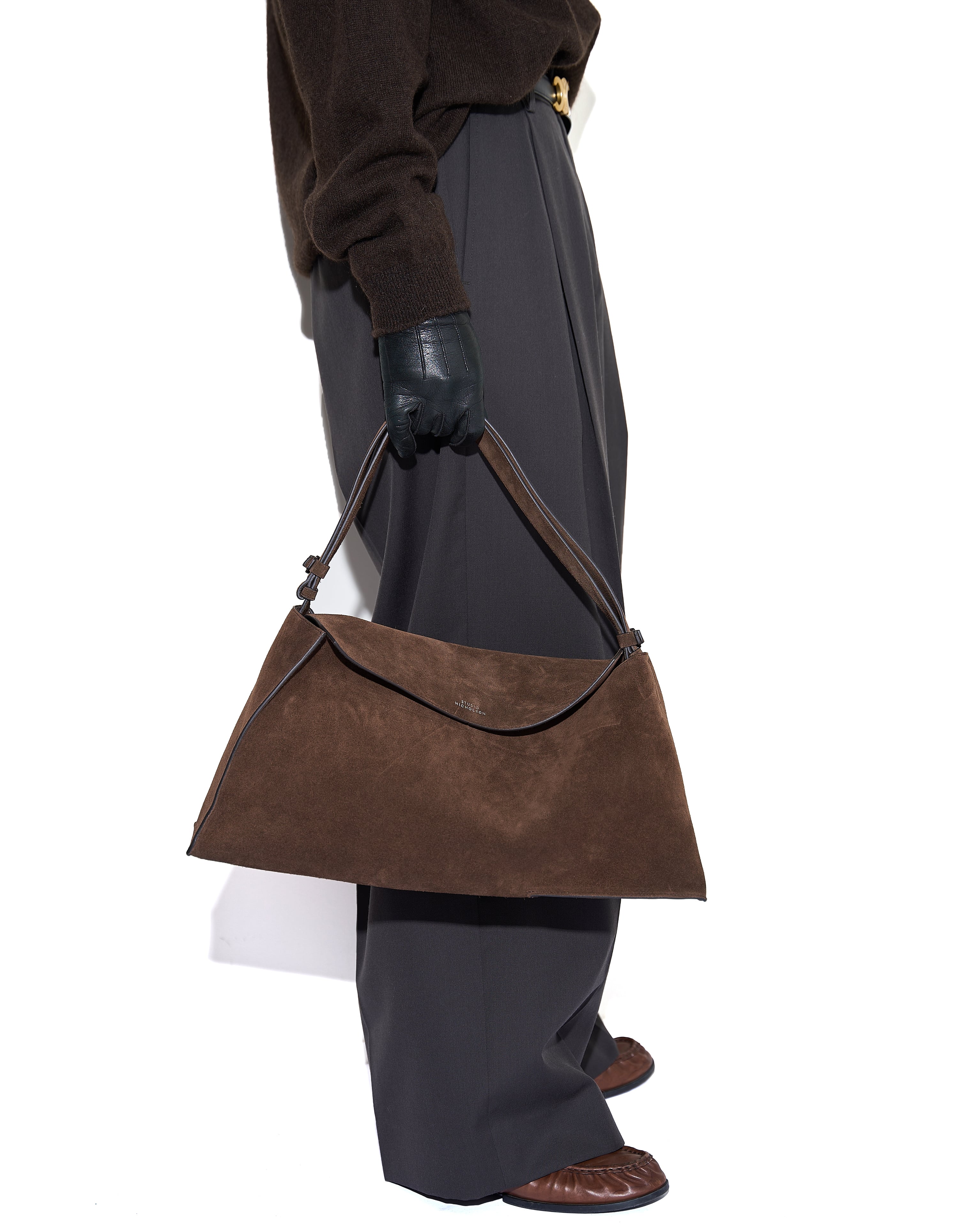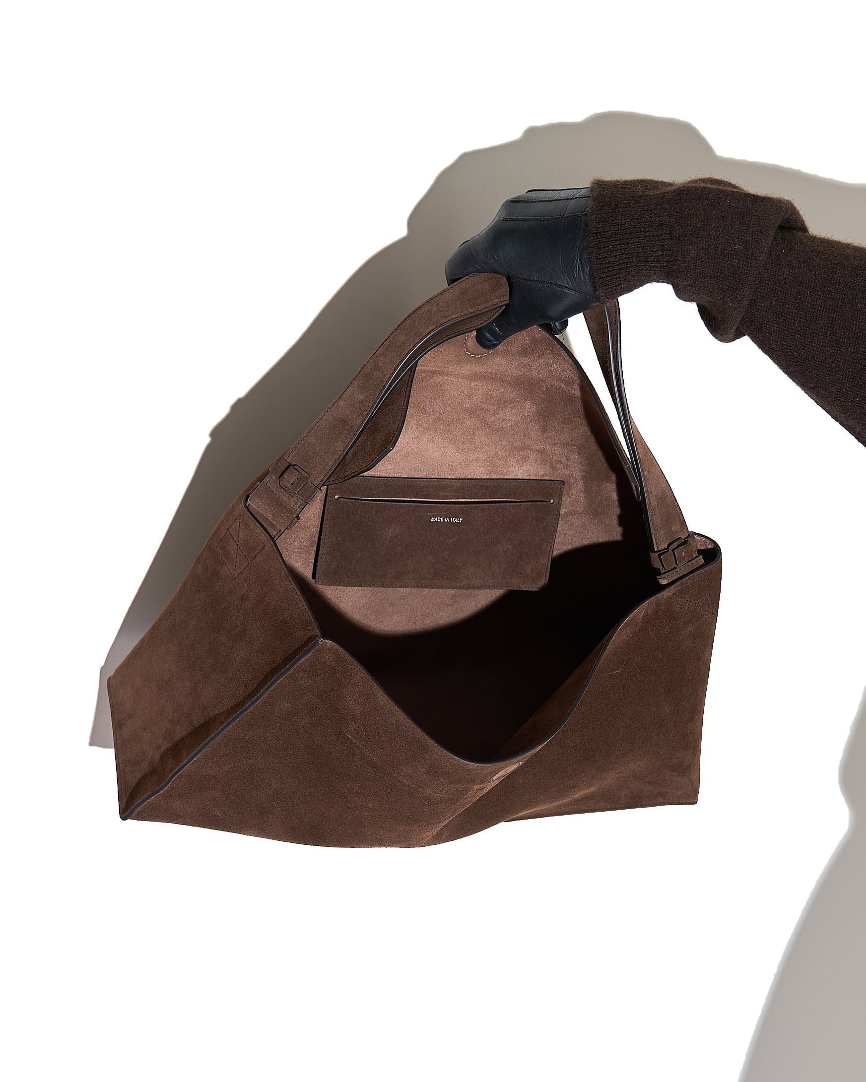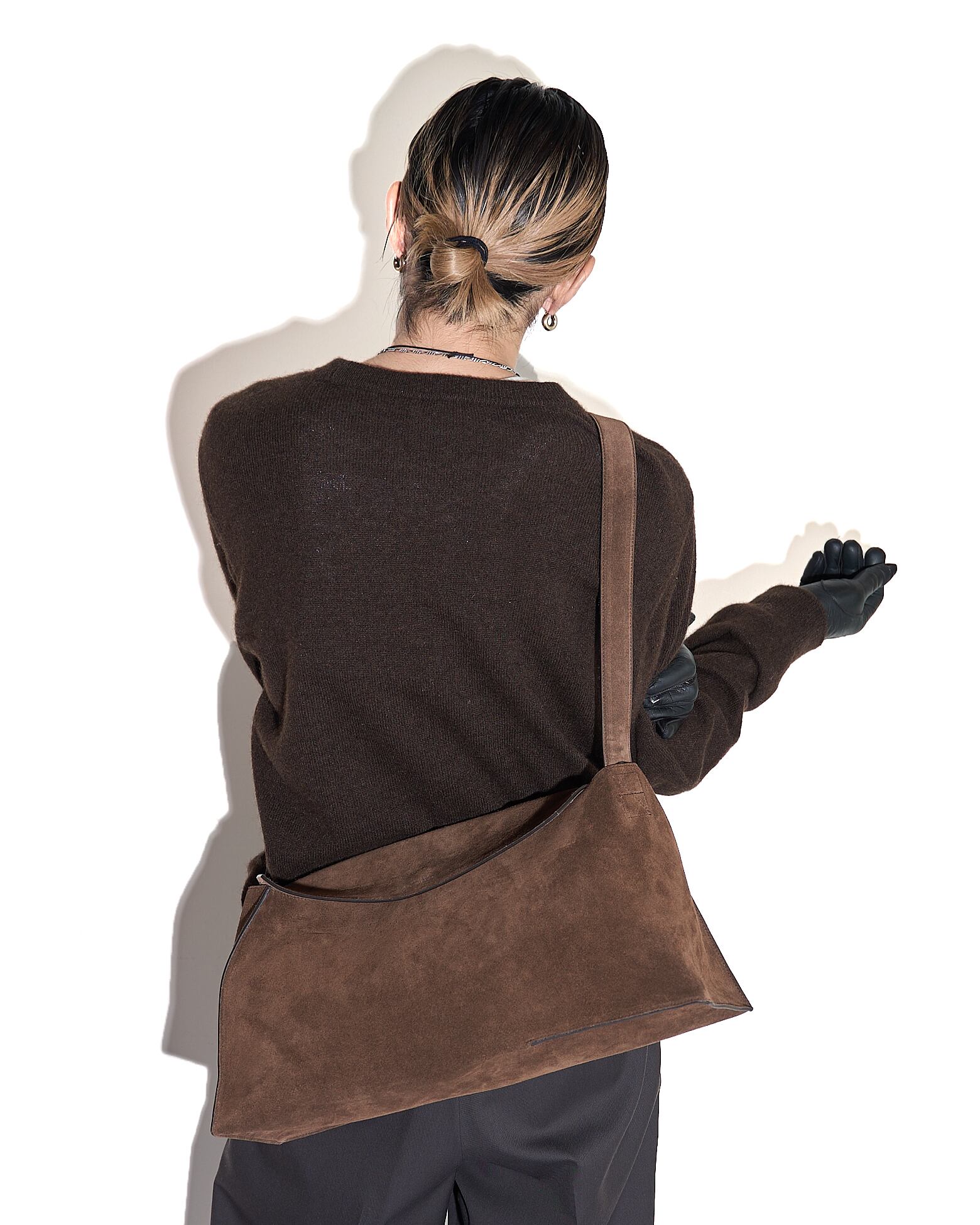 左右非対称にデザインされた台形の形にすることで、リラックスした面構えに仕上げているバッグ。建築などに関心のあるデザイナーならではの発想から、構造的な魅力を感じる作りとなっています。フラップ部分には隠しマグネットがあり、ストラップは"絞る"ことで調節が可能な、ミニマルかつ、機能的な逸品。