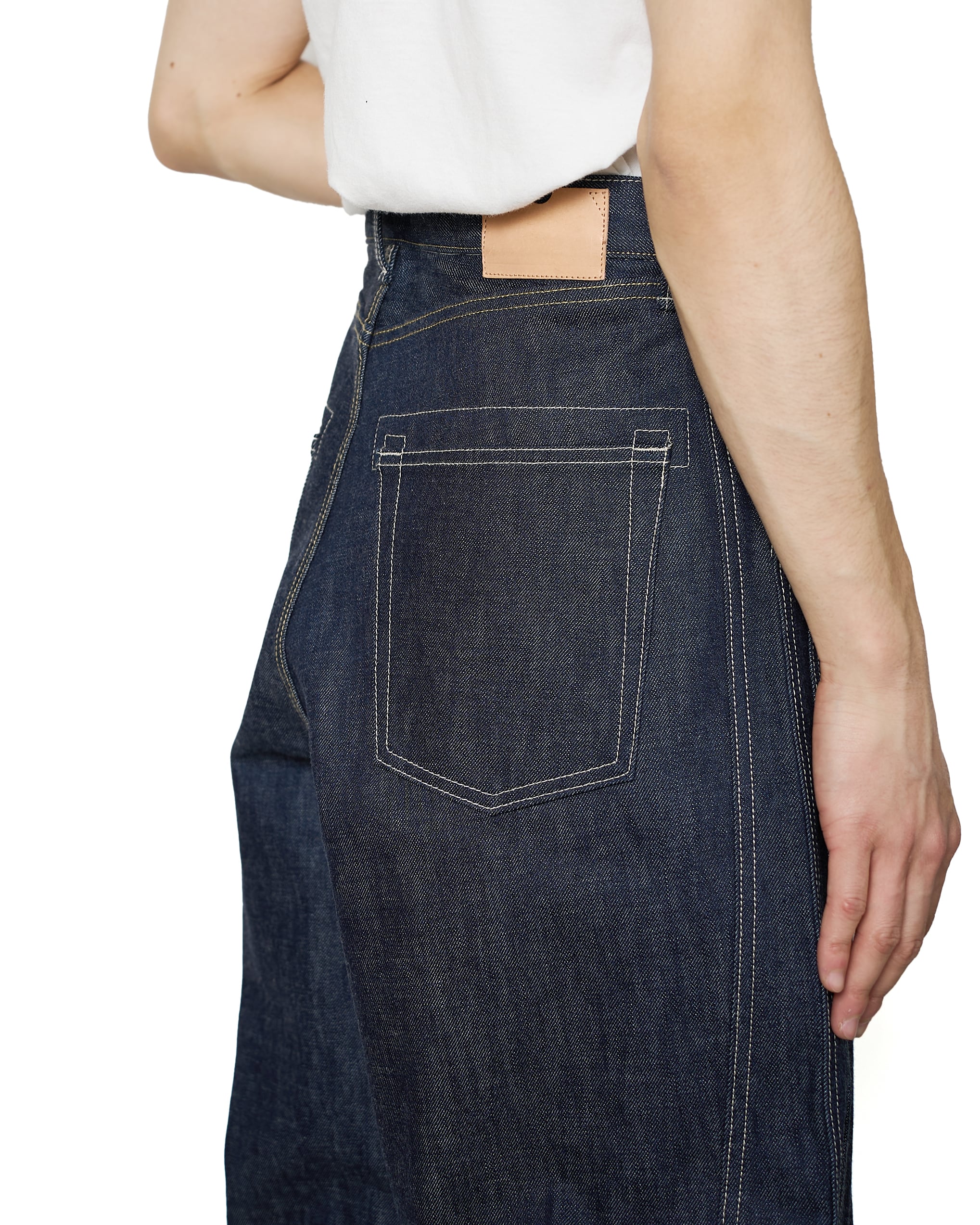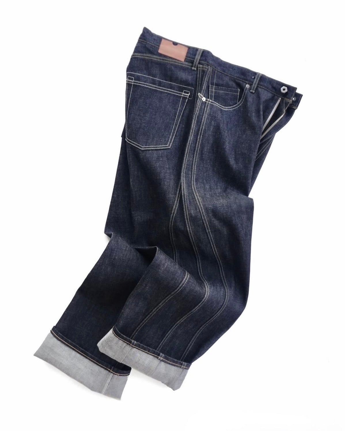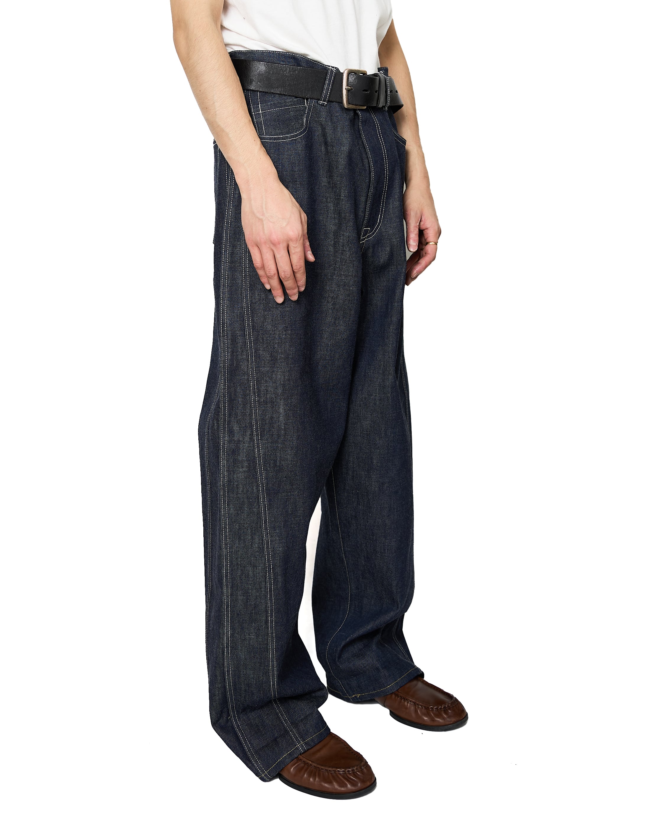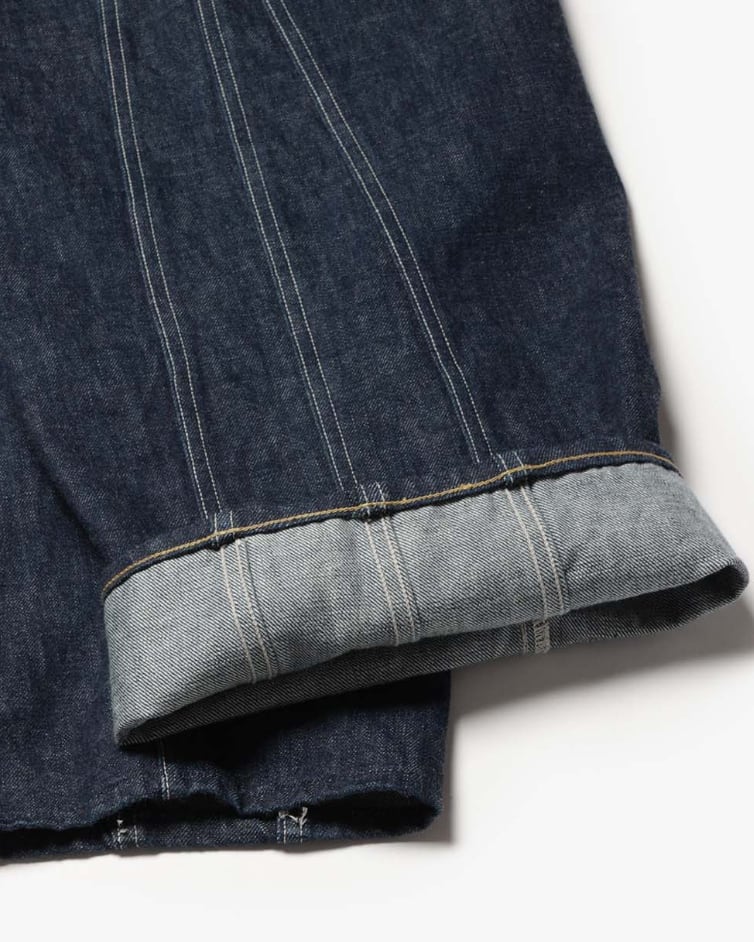 サイドシームが3本配置されたワイドシルエットの6ポケットデニム。13ozのリジッドデニムを採用し、右前部にはコインポケット、左前部にはキーホルダー用ループを備え、腰部のパッチは小さなポケットにアレンジ。バックポケットには補強用テープを配し、一本のデニムに多機能なディテールを凝縮。