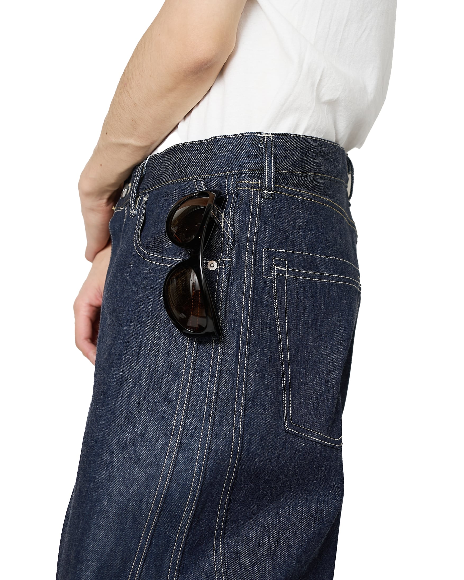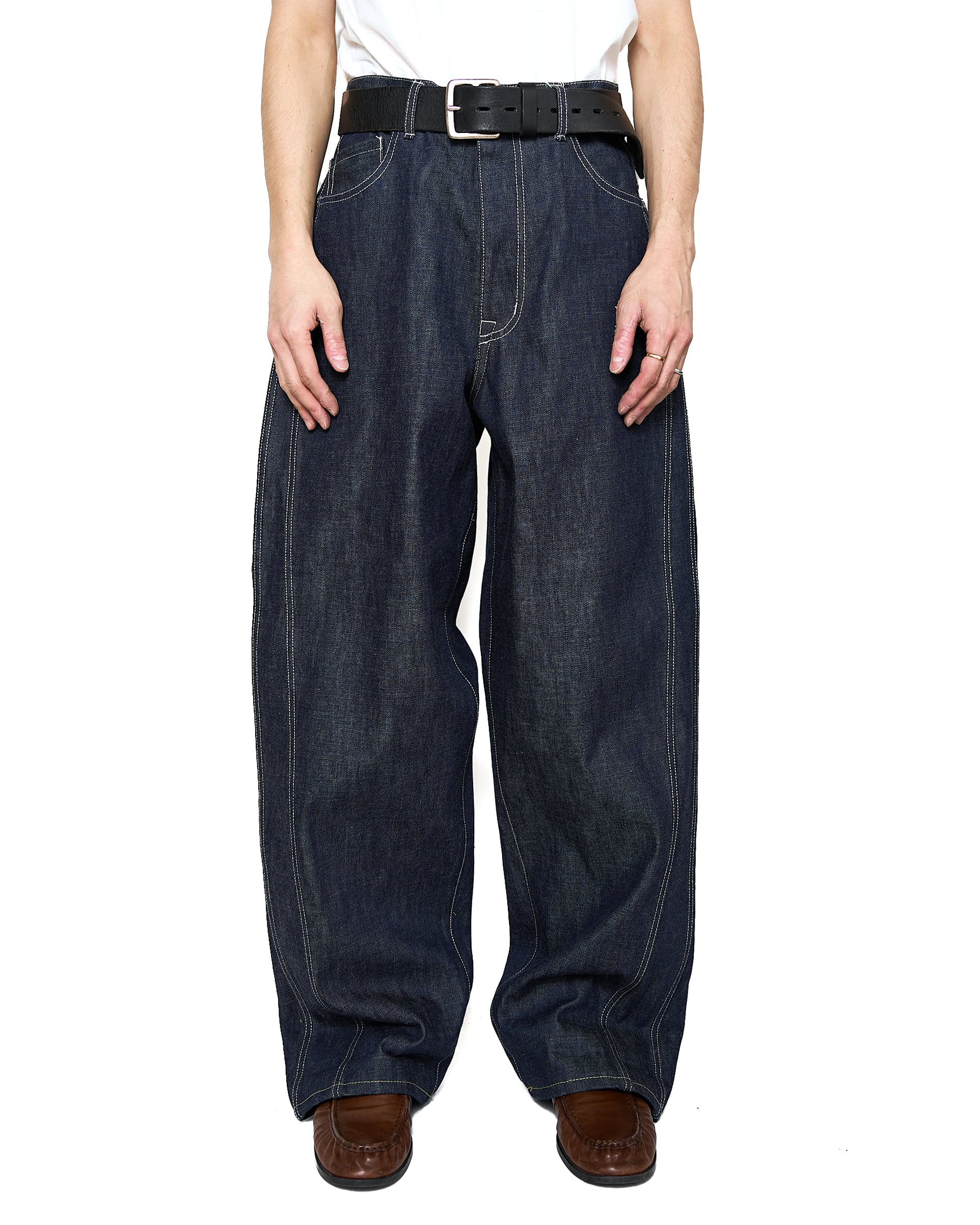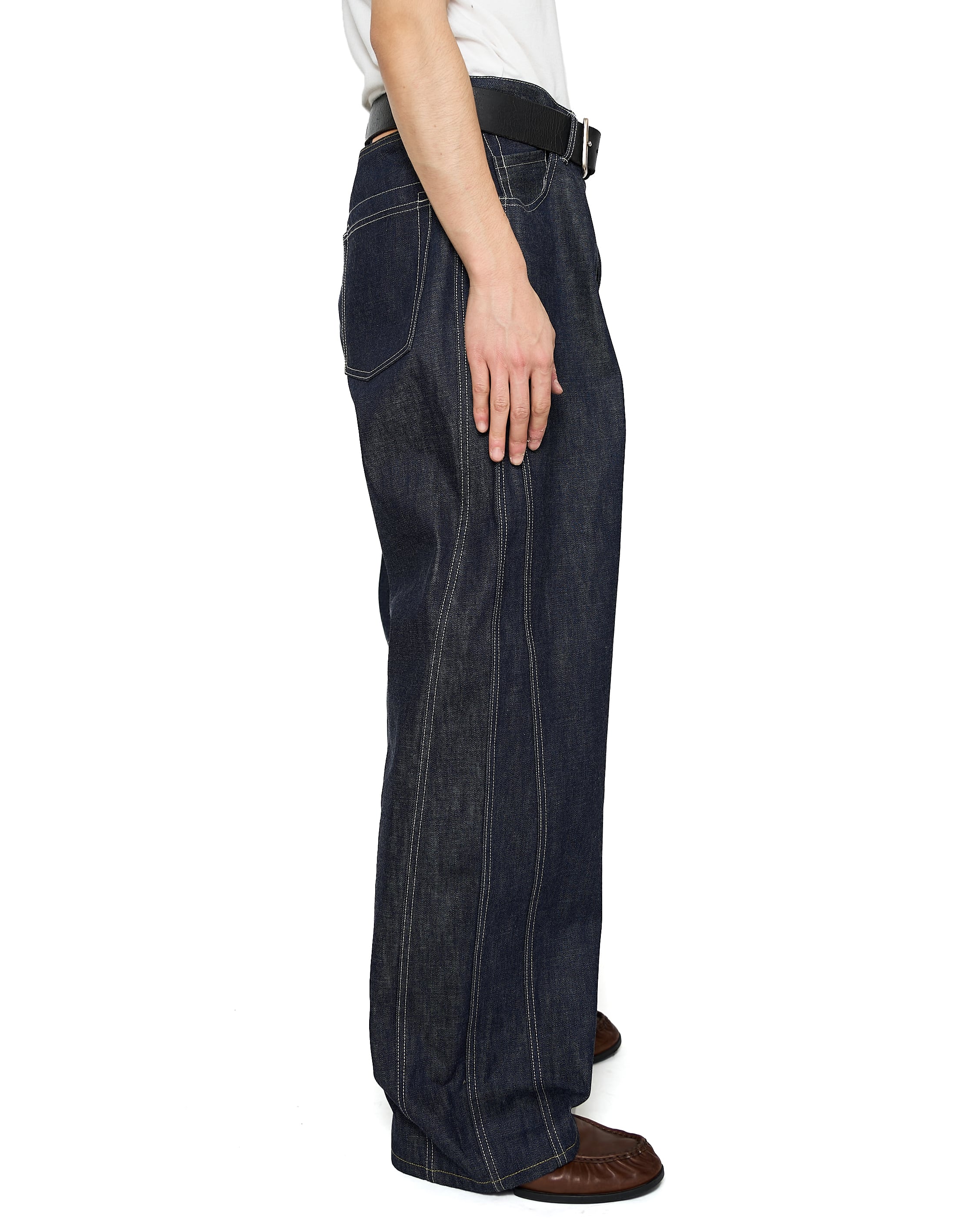 サイドシームが3本配置されたワイドシルエットの6ポケットデニム。13ozのリジッドデニムを採用し、右前部にはコインポケット、左前部にはキーホルダー用ループを備え、腰部のパッチは小さなポケットにアレンジ。バックポケットには補強用テープを配し、一本のデニムに多機能なディテールを凝縮。