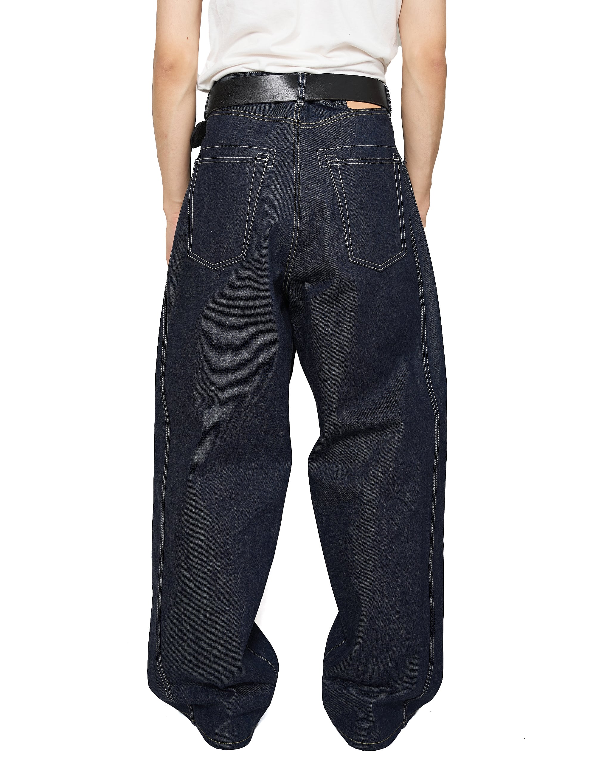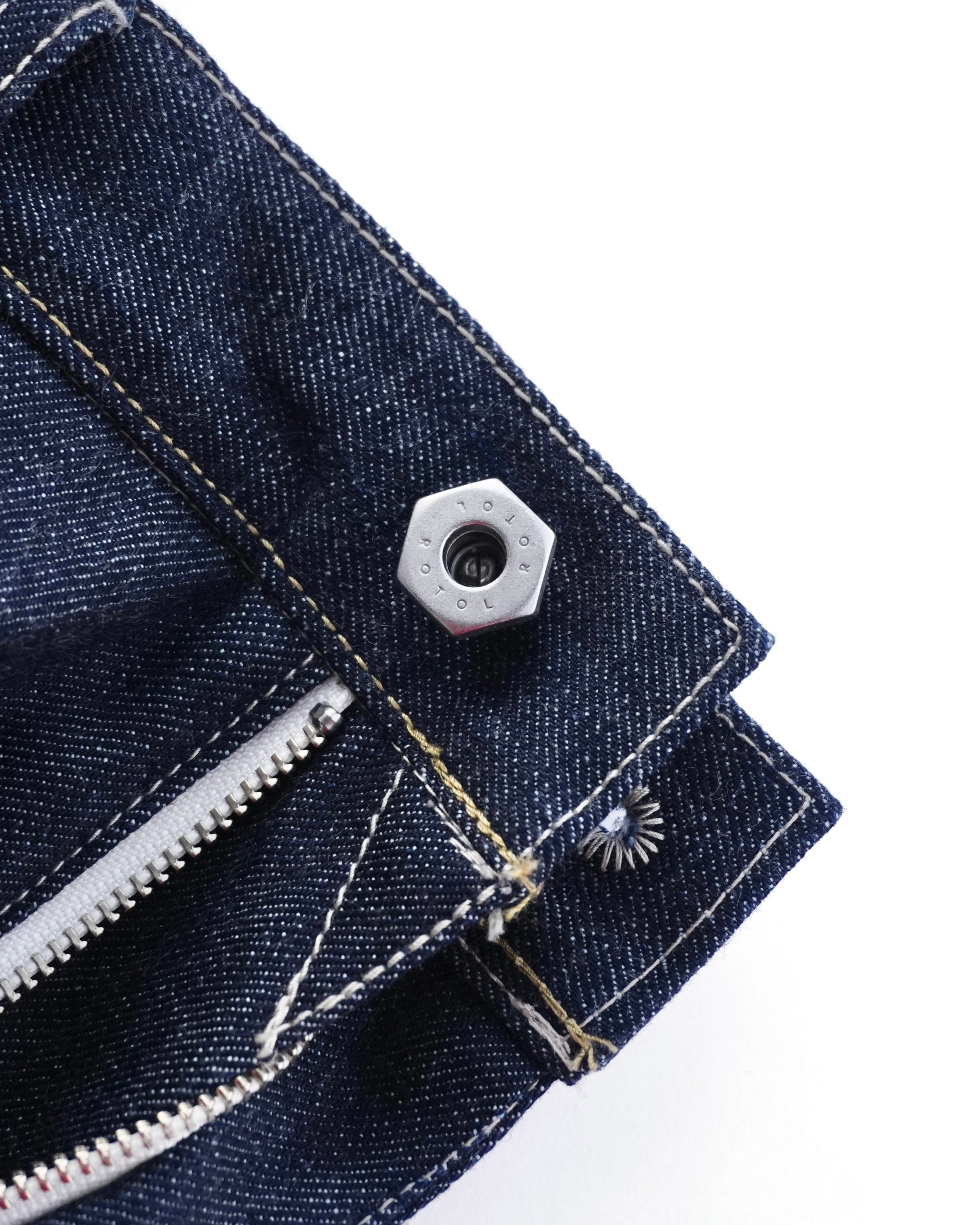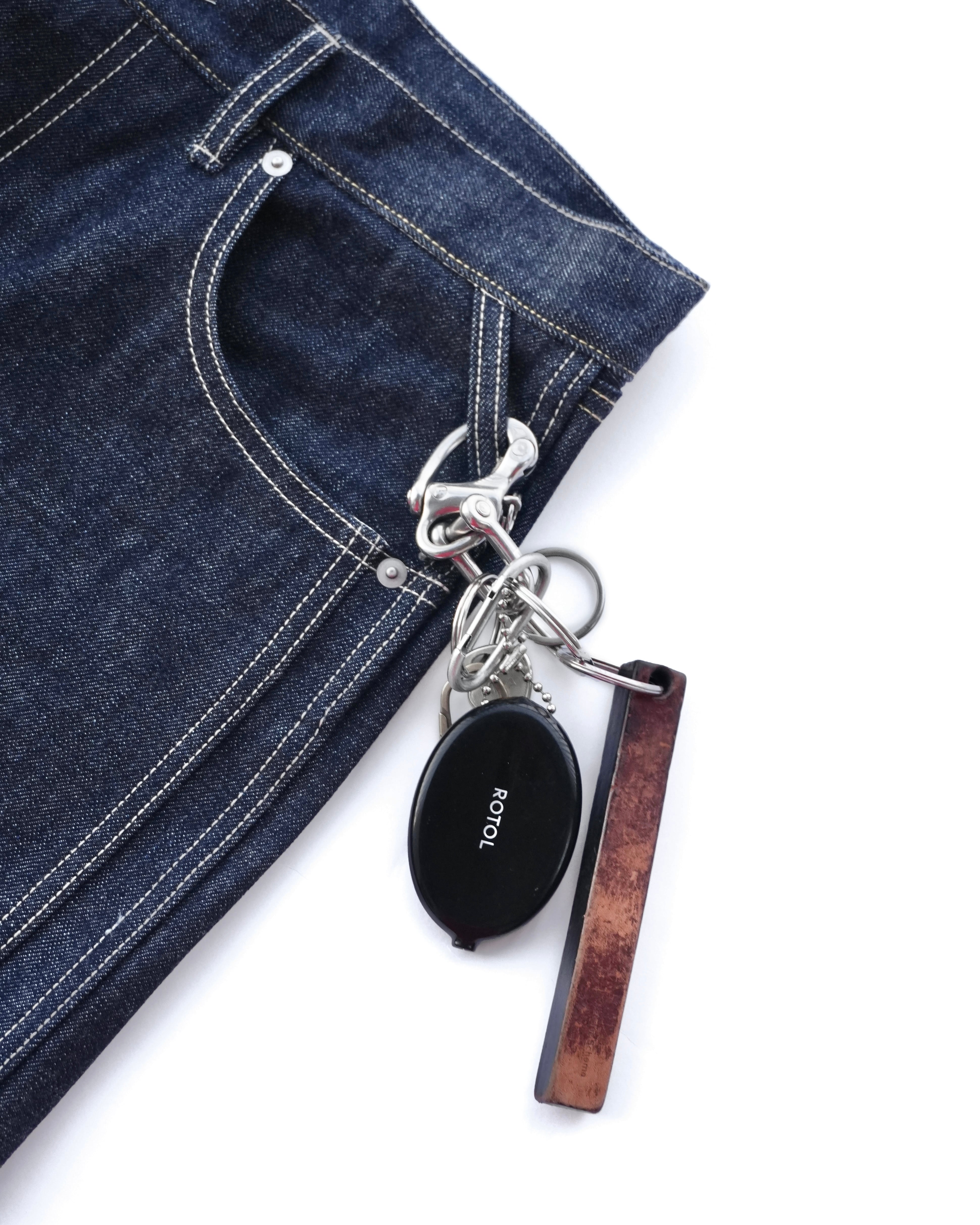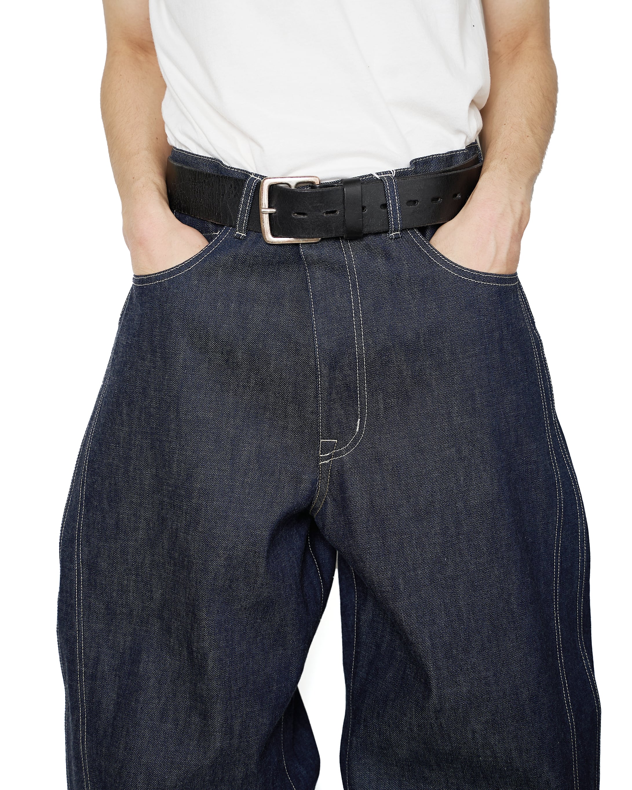 サイドシームが3本配置されたワイドシルエットの6ポケットデニム。13ozのリジッドデニムを採用し、右前部にはコインポケット、左前部にはキーホルダー用ループを備え、腰部のパッチは小さなポケットにアレンジ。バックポケットには補強用テープを配し、一本のデニムに多機能なディテールを凝縮。