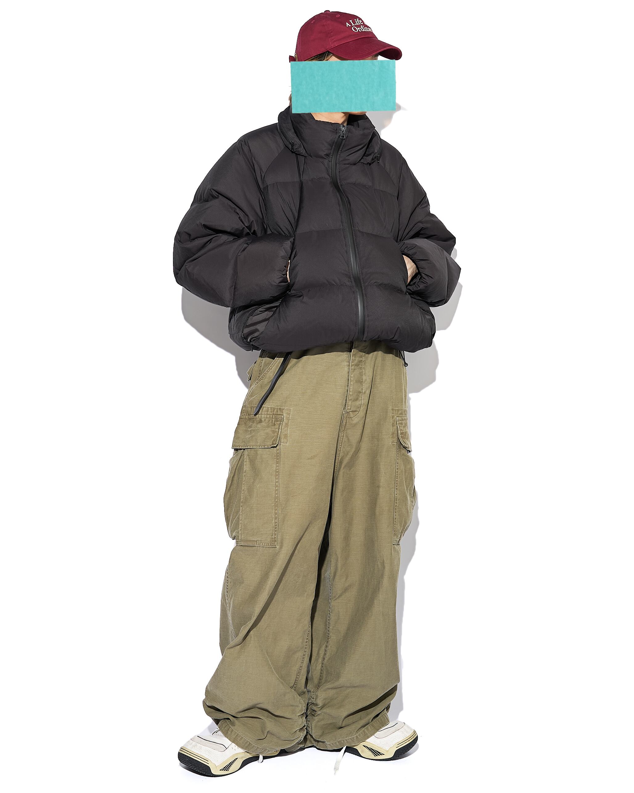 肩はラグランスリーブ仕様、袖口と裾口にドローコードを配することでシルエットを調整することも可能で、ボリューム感に対して軽く、タウンユースに優れています。