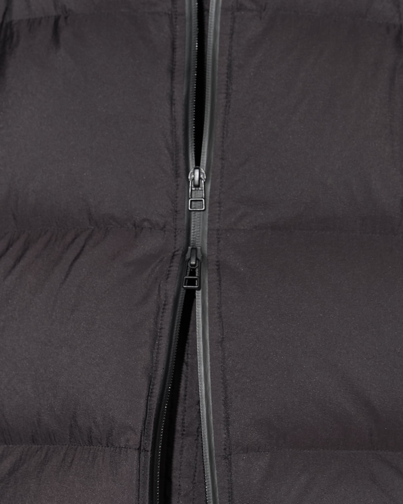 ステッチデザインによるカーブと首に付けられた収納フードが特徴のダウンジャケット。