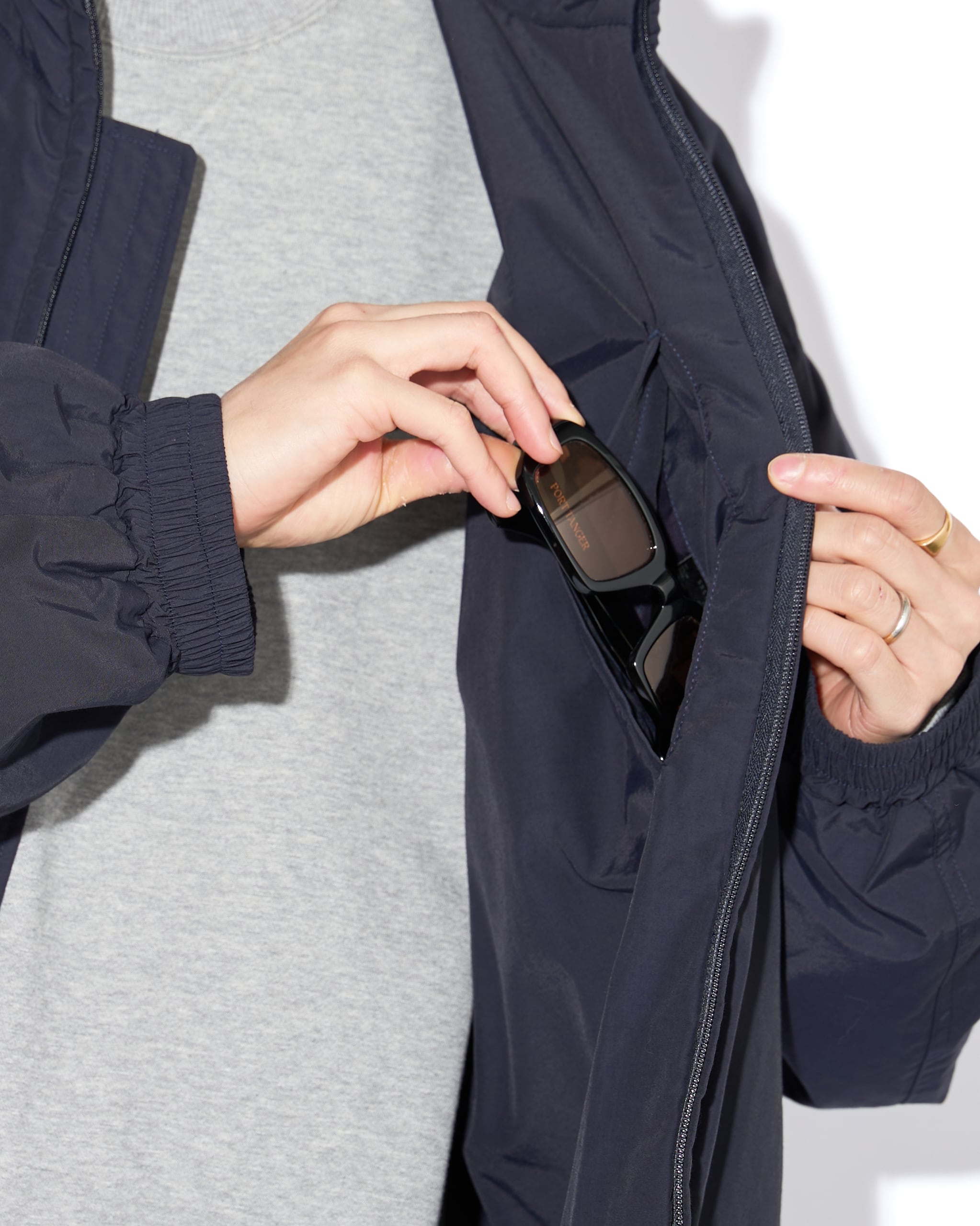 柔らかなコットンナイロン素材を使用した中綿のジャケット。左胸、左の袖口にはブランドロゴ刺繍を施し、袖口・裾にギャザーを寄せることで、ほどよいフィット感と丸みのあるフォルムに。撥水加工も施された有用性の高い1着。