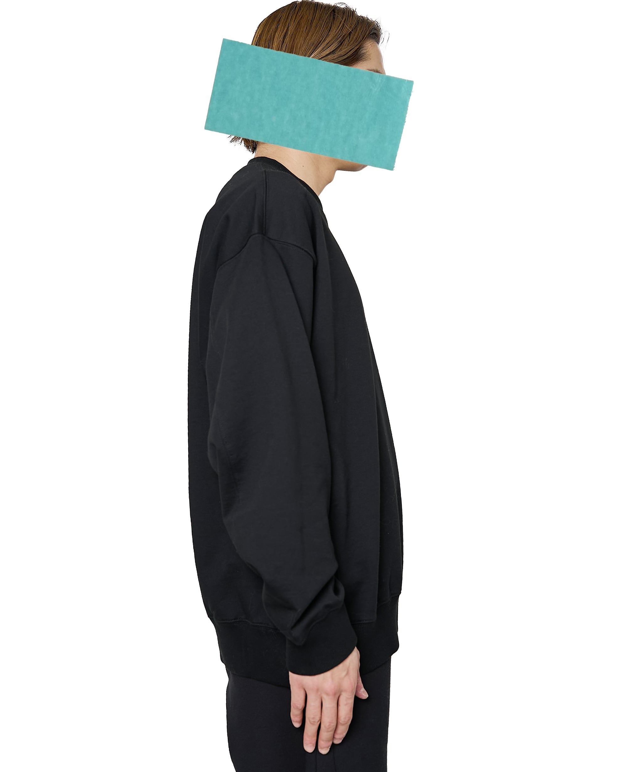通常だと18Gで編む番手を、28G編み機で超度詰めに編み立てたハイゲージ裏毛生地を使用し、目面の美しい表面感と、シルケット加工による光沢感、適度のハリ感が特徴的なスウェット。左胸、左袖部分にはブランドロゴ刺繍を配置しています。