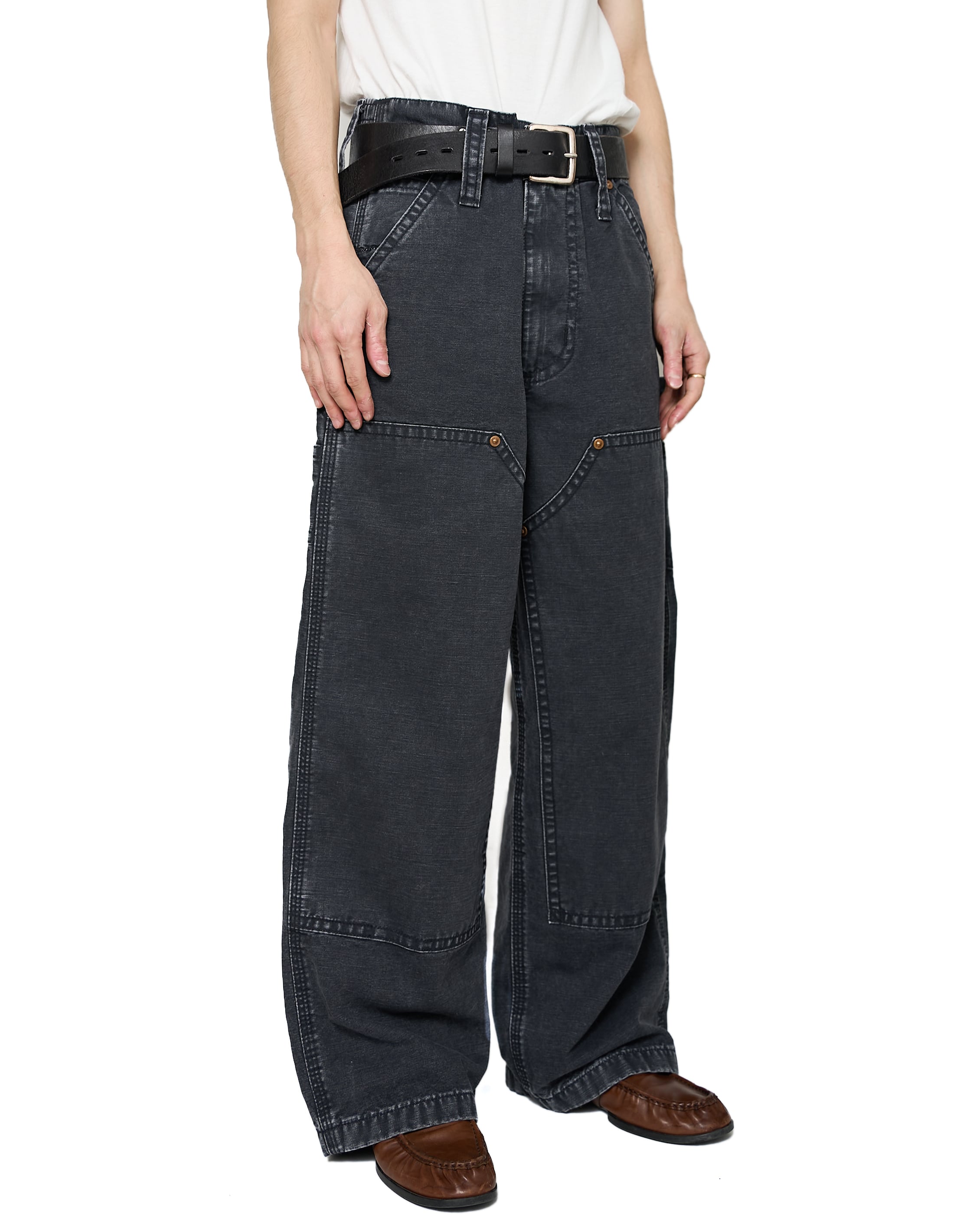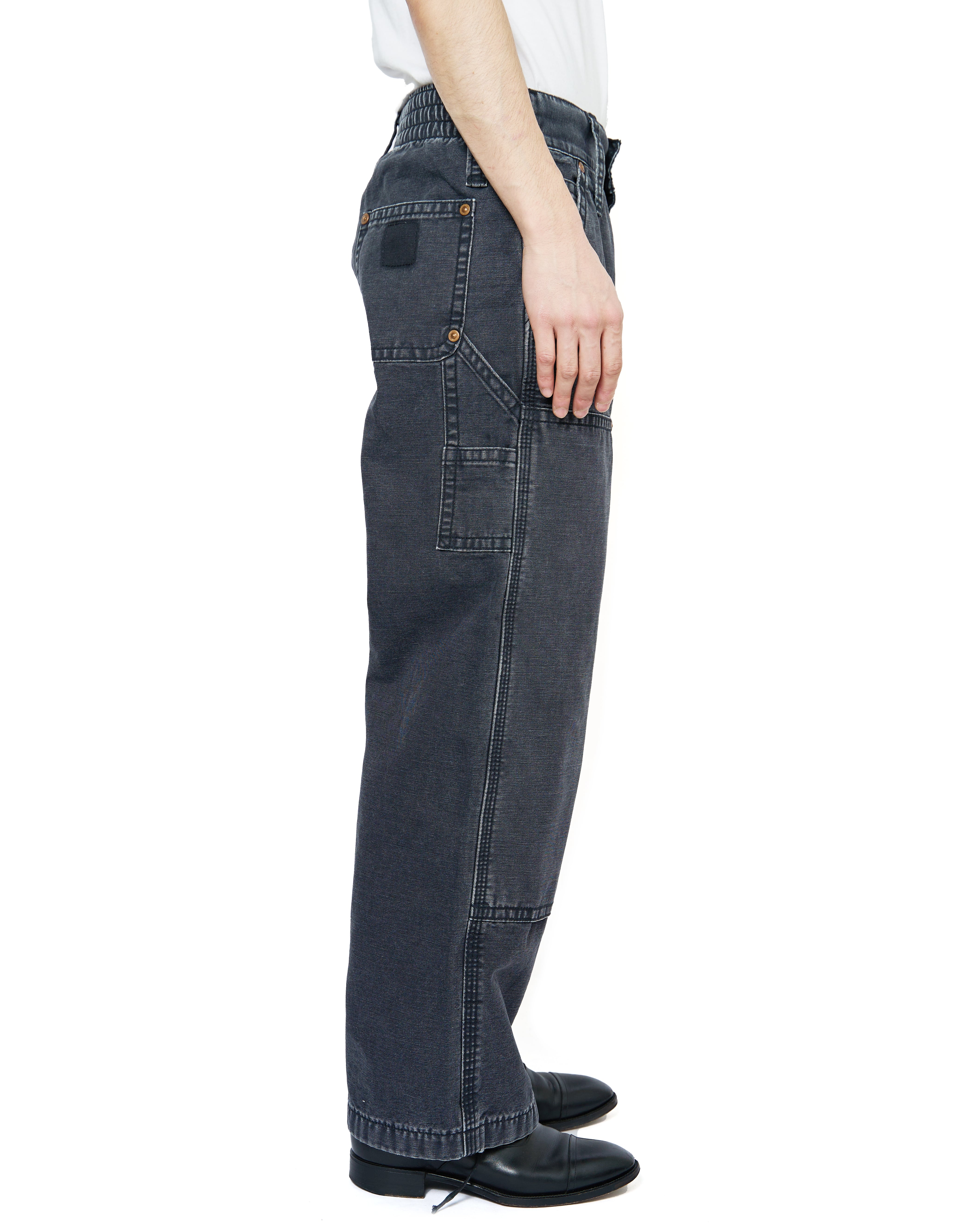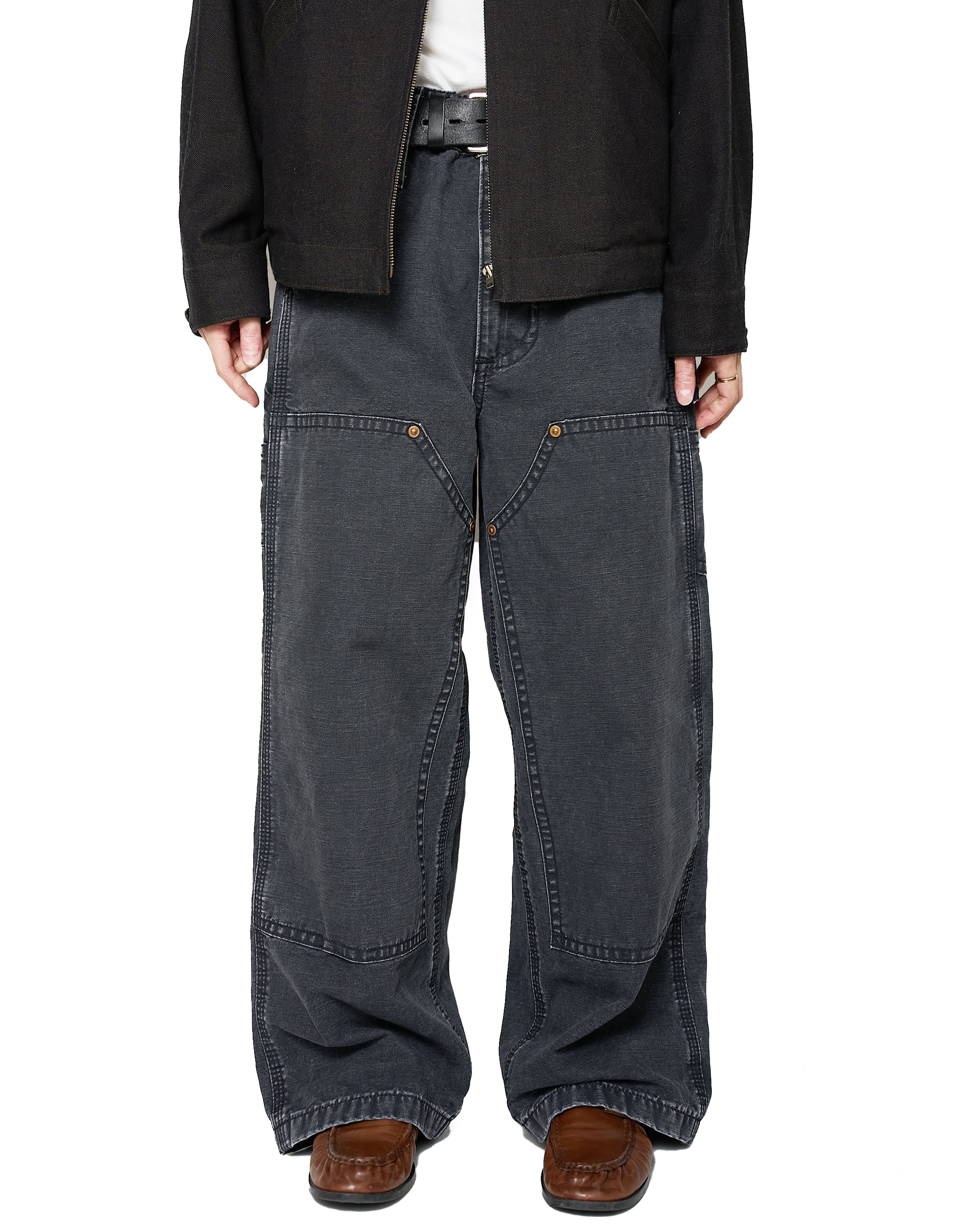 キッズサイズのCarharttのダブルニーパンツをモチーフに仕上げられたダックパンツ。ヴィンテージのような面構えの加工や、KOOKY ZOOならではのリベットのサイズや巻き縫い幅、どこか違和感がありつつも、本格的な加工と相まった新鮮なアプローチ。
