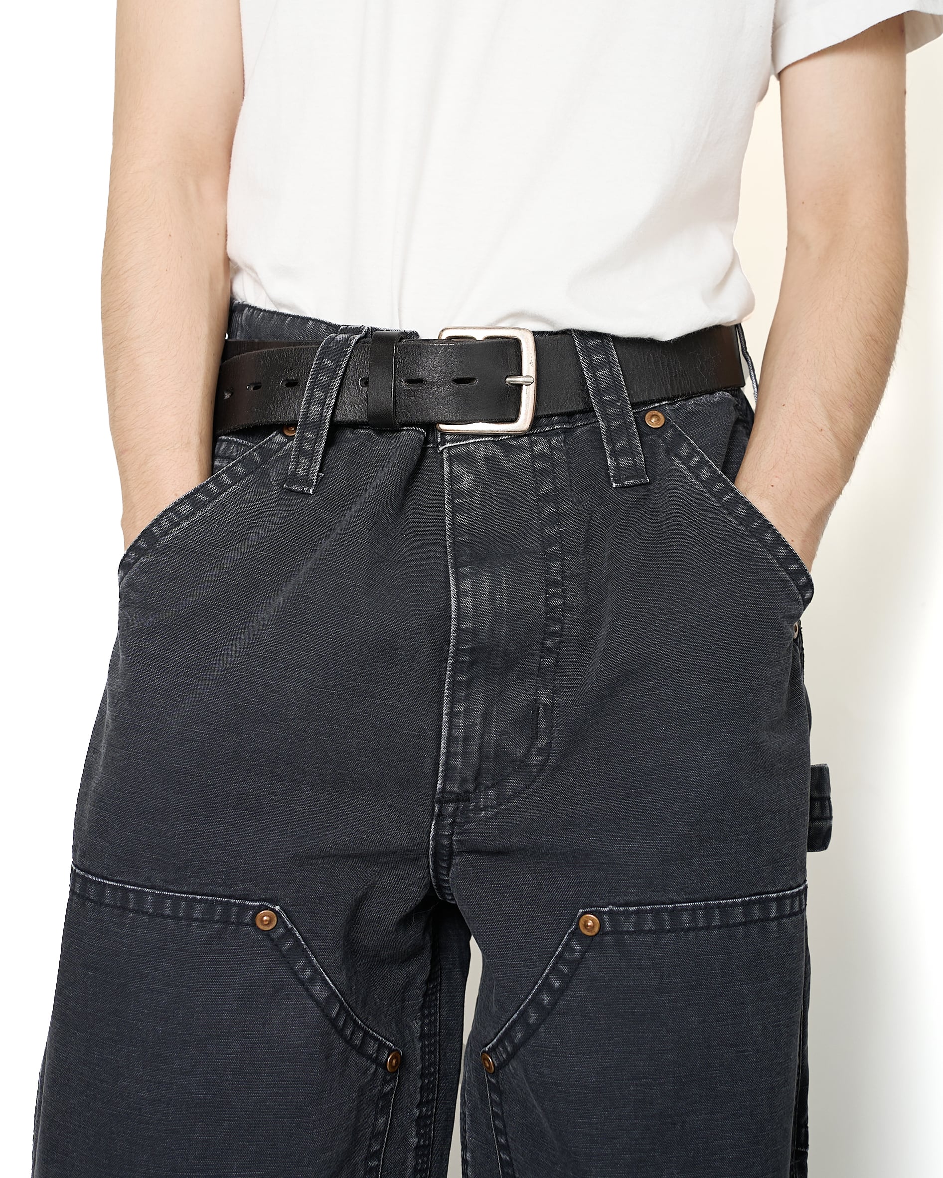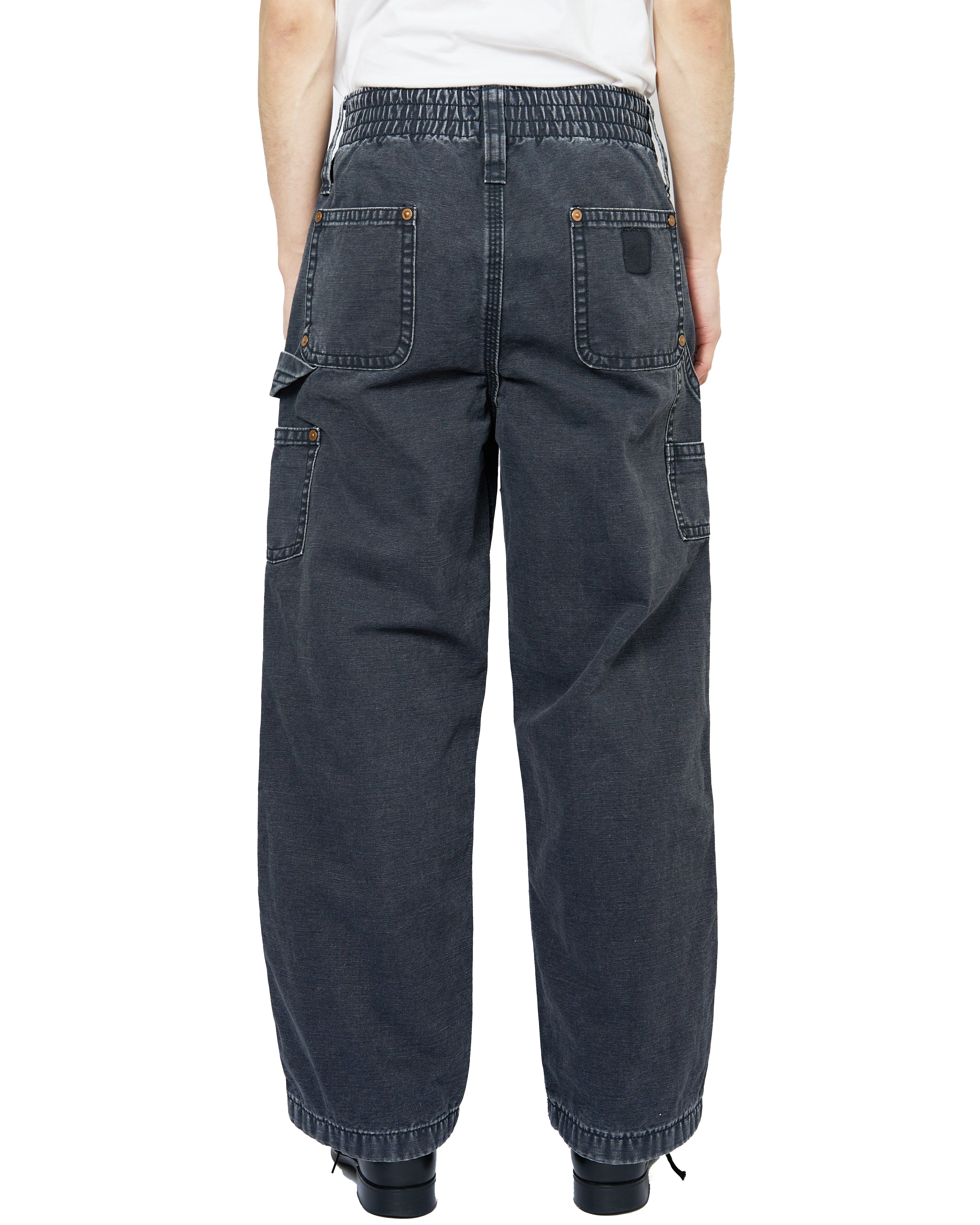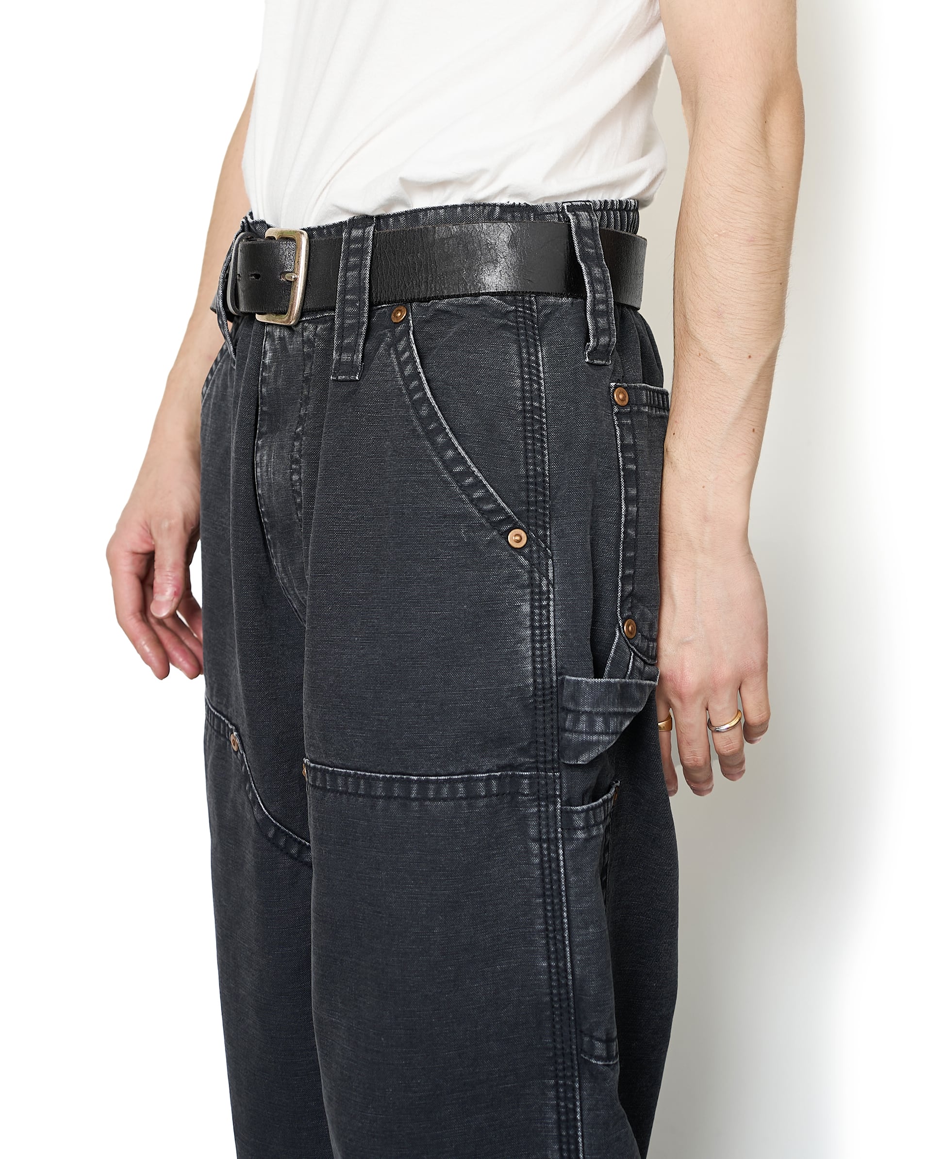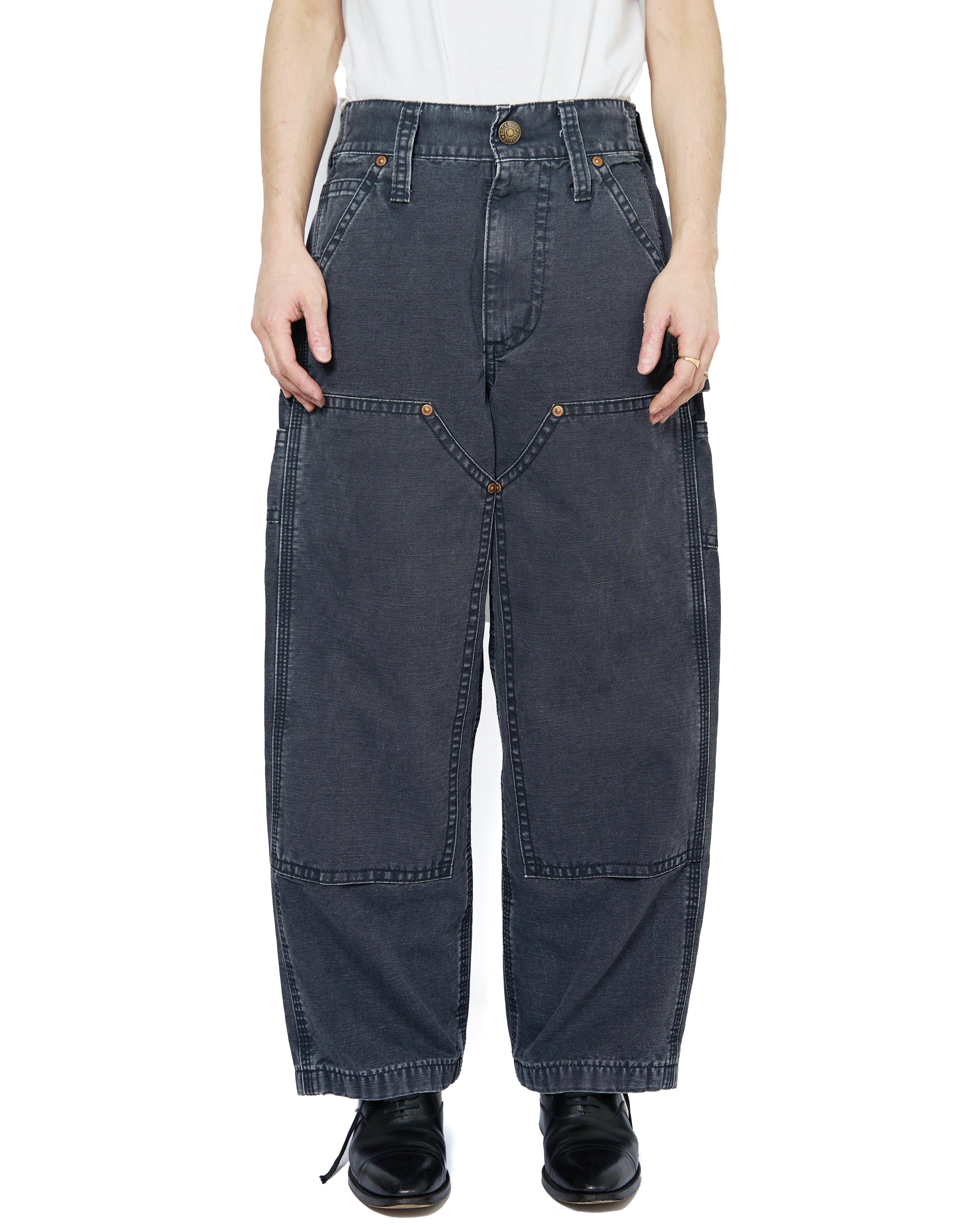 キッズサイズのCarharttのダブルニーパンツをモチーフに仕上げられたダックパンツ。ヴィンテージのような面構えの加工や、KOOKY ZOOならではのリベットのサイズや巻き縫い幅、どこか違和感がありつつも、本格的な加工と相まった新鮮なアプローチ。