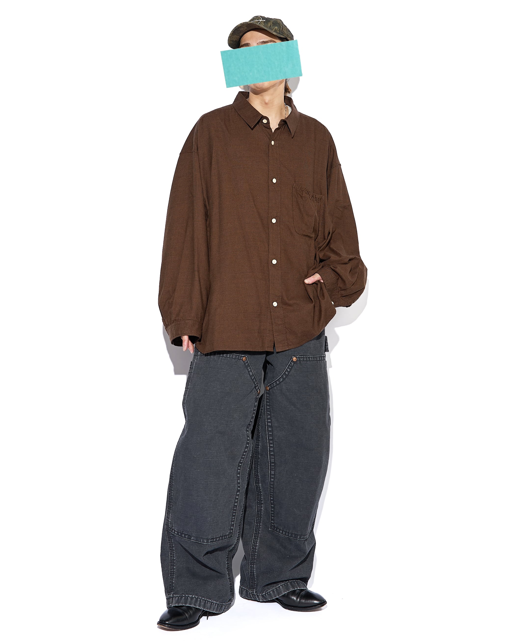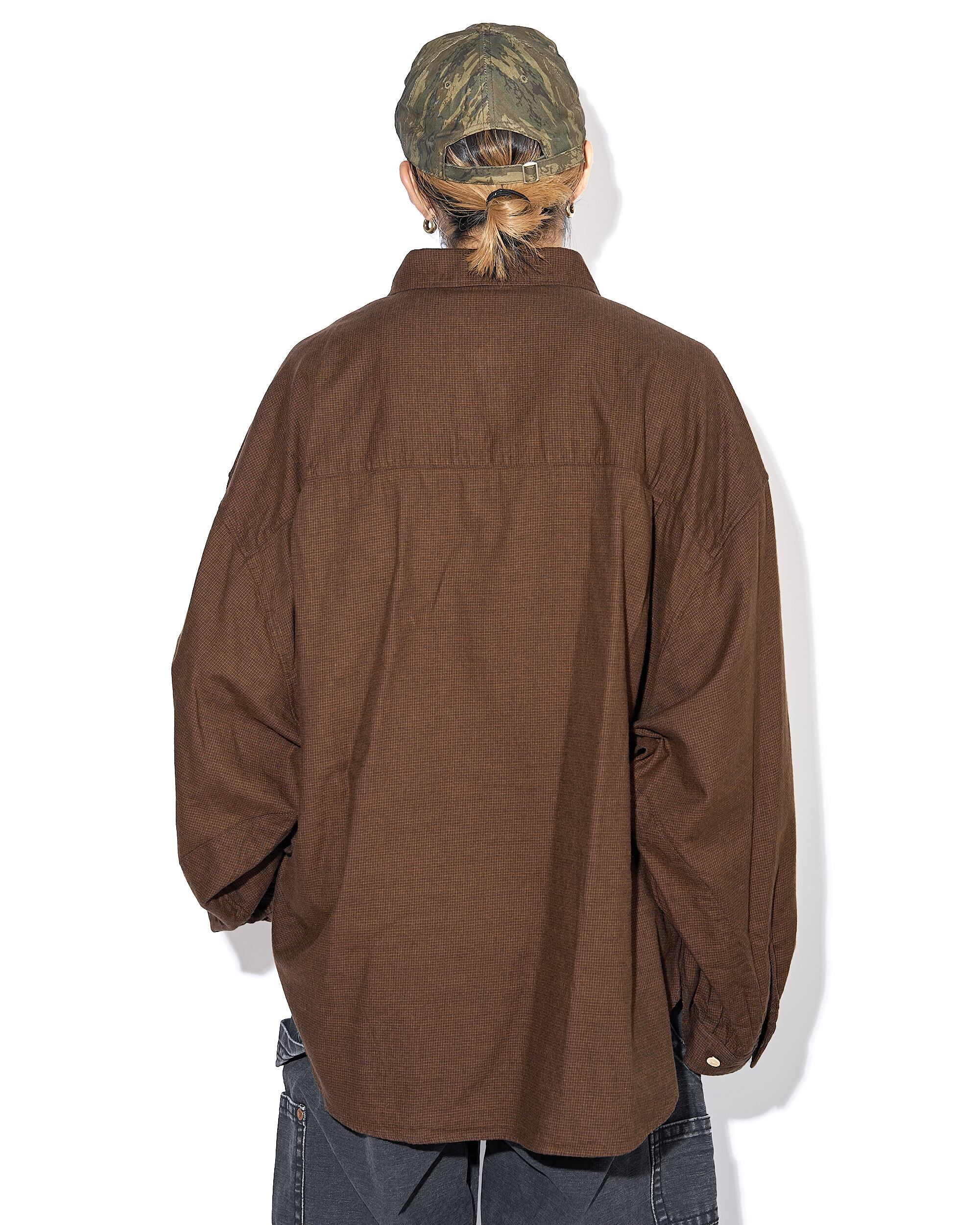肩を落とし、ルーズに仕上げたオーバーサイズシャツ。背中にはタックを余分に取り、袖には別地でパッチを施しているのもアクセントに。コットンテンセルを使用したウールライクな起毛ネルは程よい厚みで、パーカーなどと合わせてジャケットのように使うのも良さそうです。