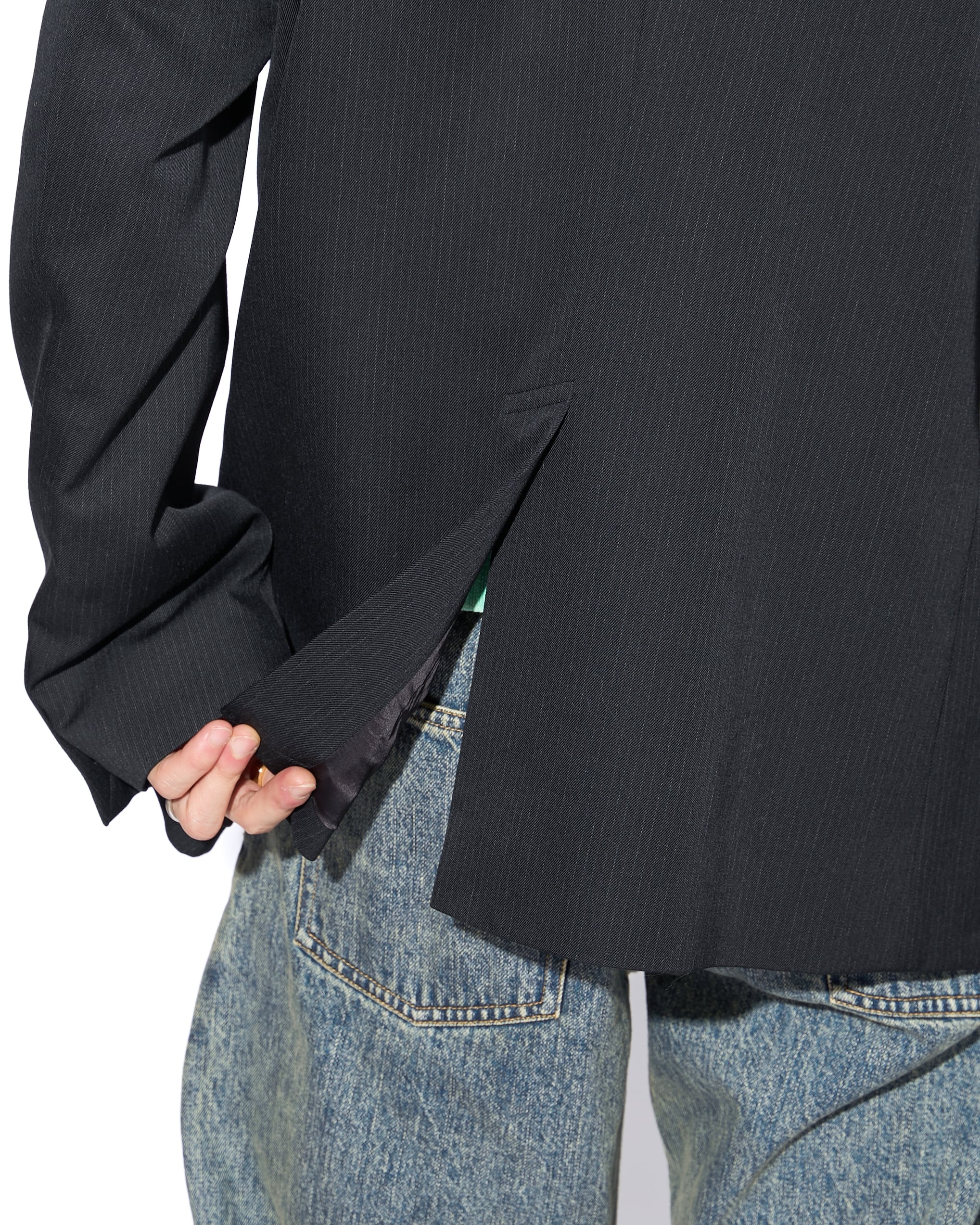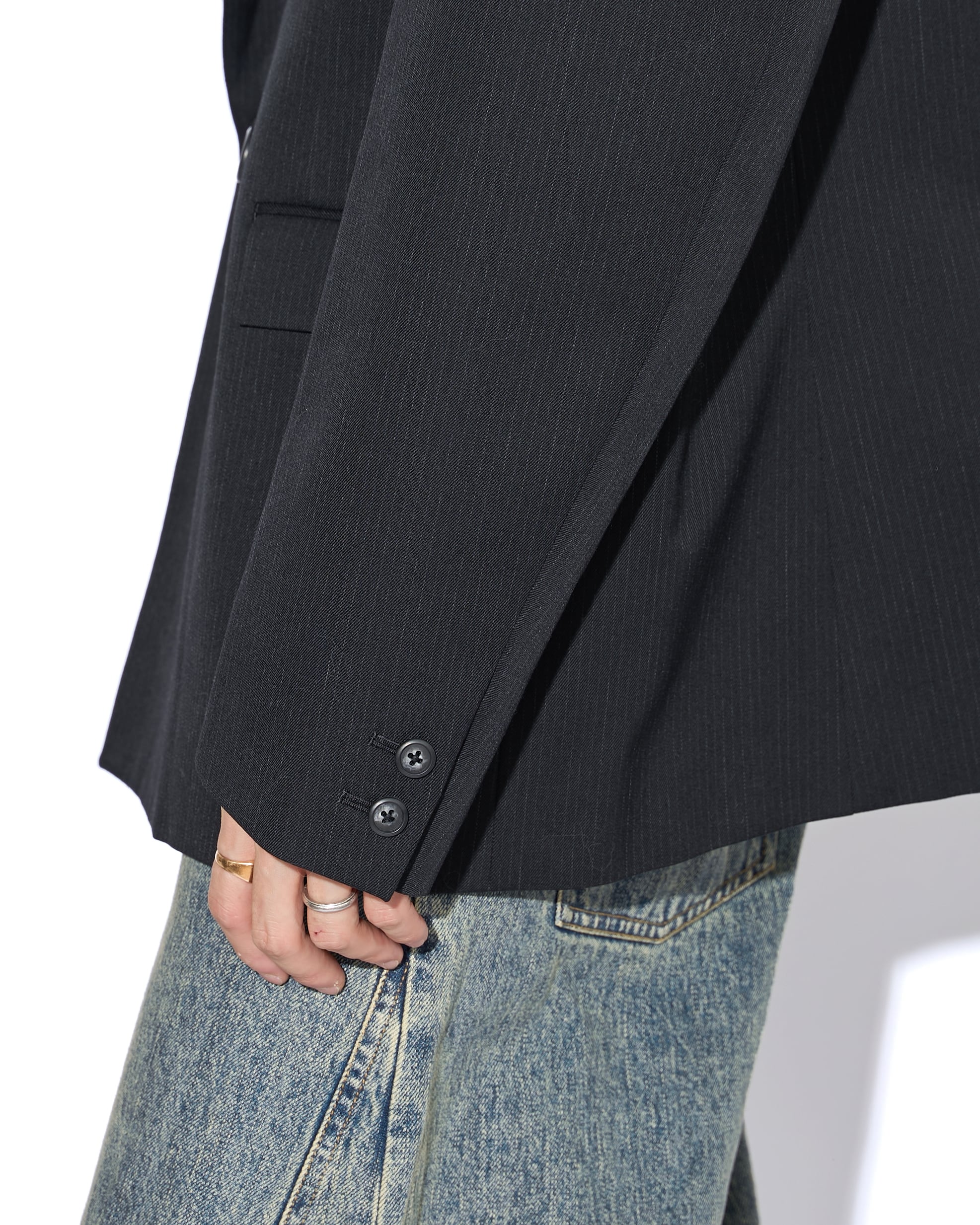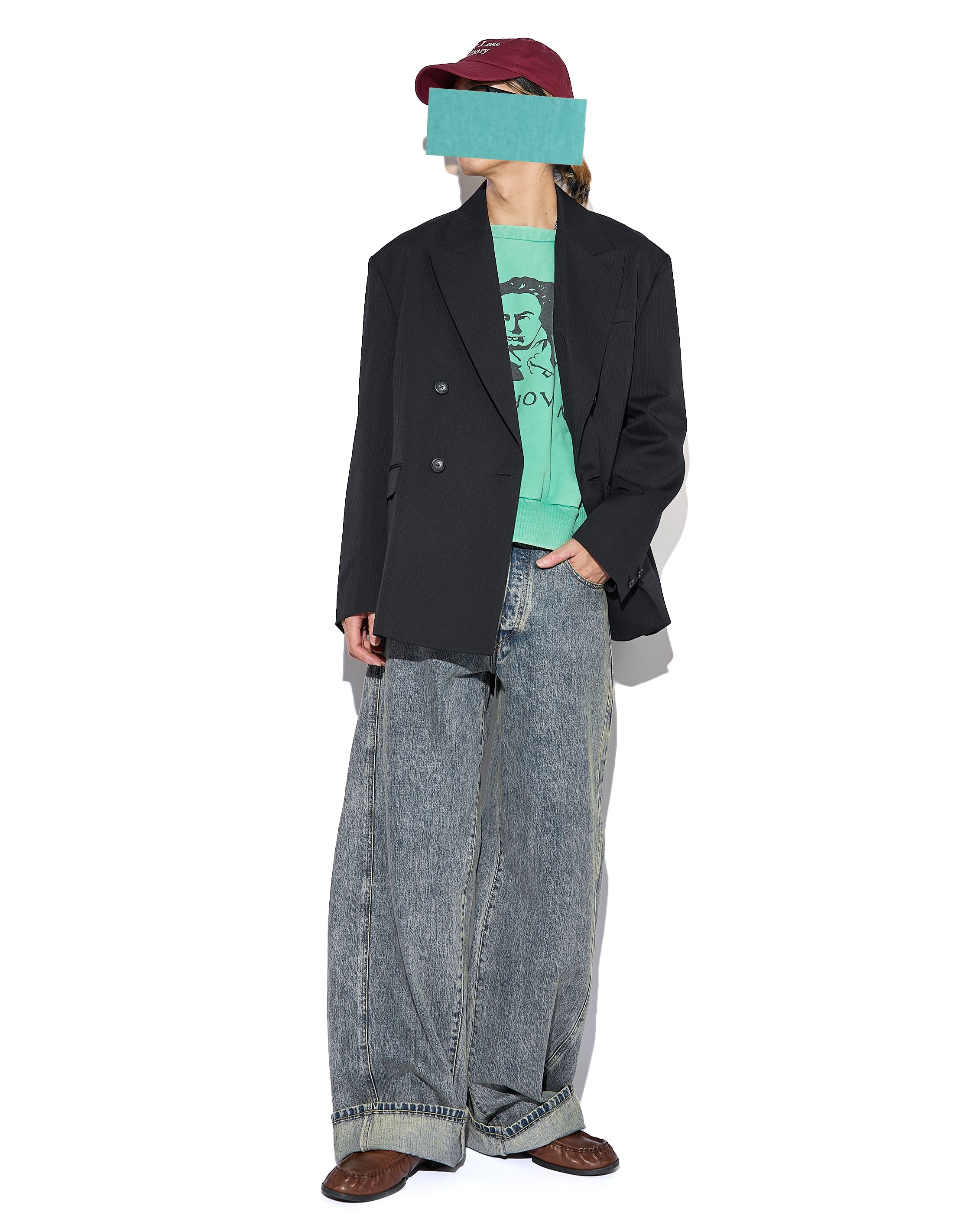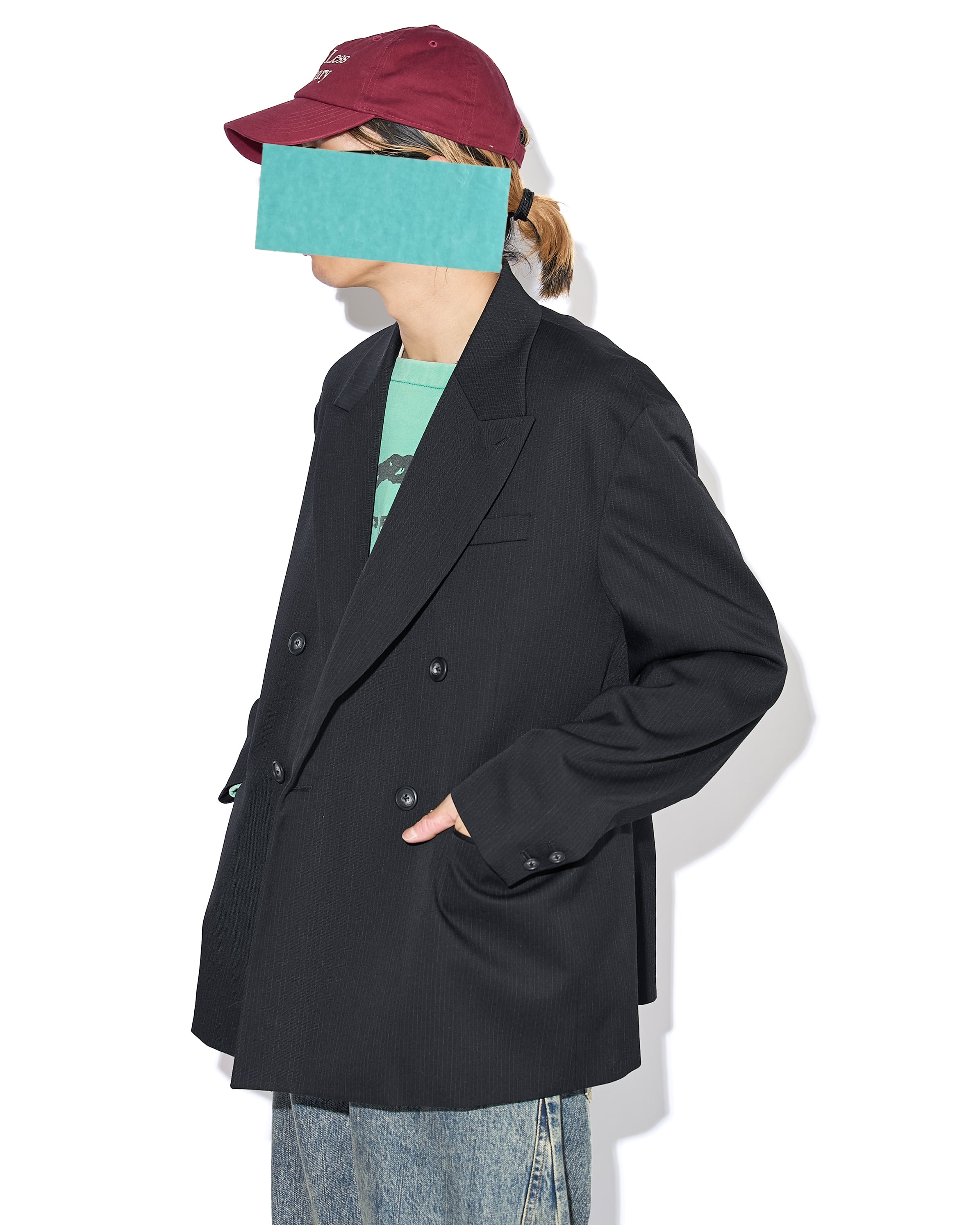 某歴史的ワークウェアブランドのストーリーをイメージしたダブルジャケット。 60/2ウール糸を高密度に織り上げ、ウレタン含浸加工を施すことで独特の反発感を持たせたた、程よいハリとコシが特徴的。ボックスシルエットでゆったりとしながらも、クリーンな雰囲気漂い、構築的なシルエットを引き立てる1着です。