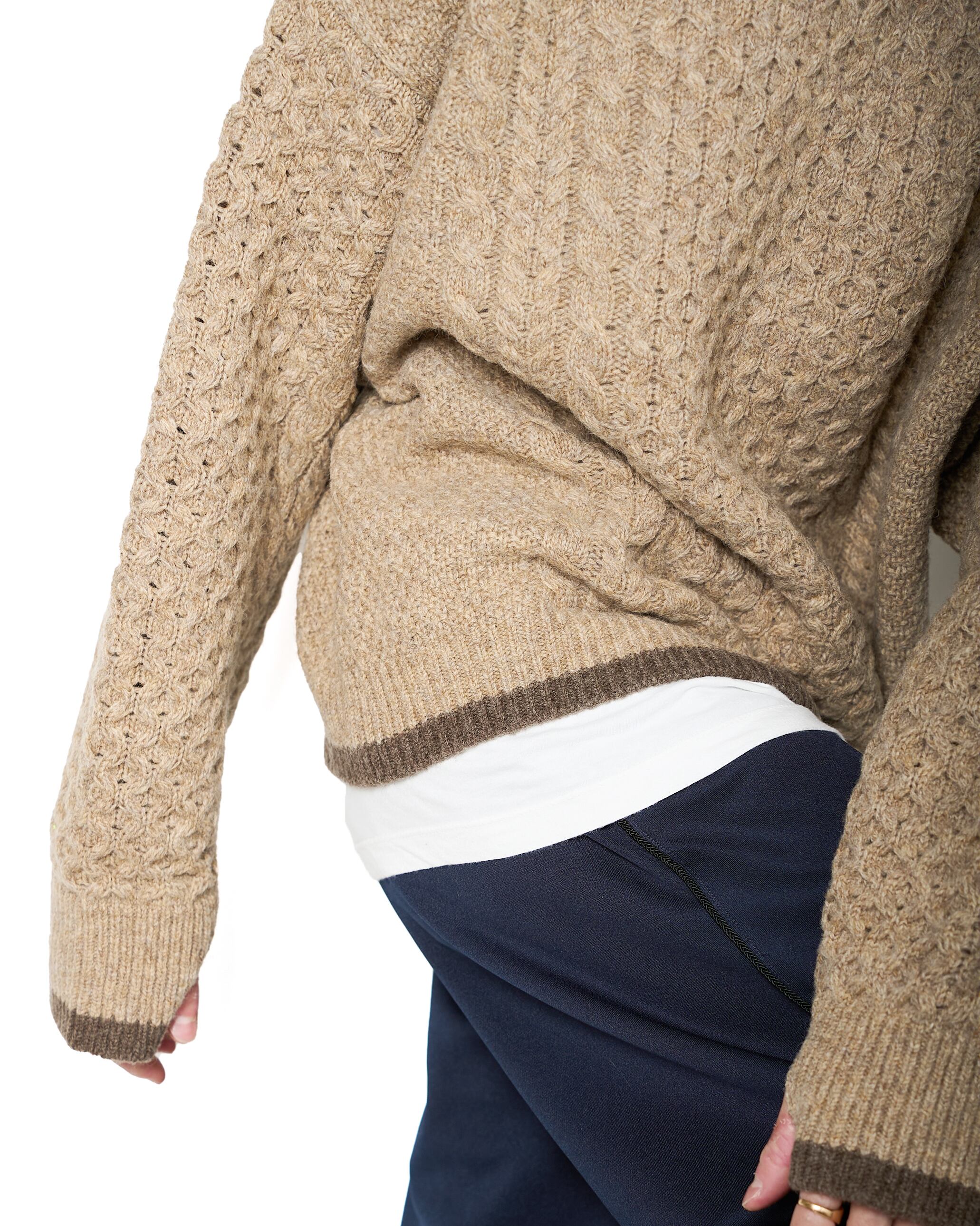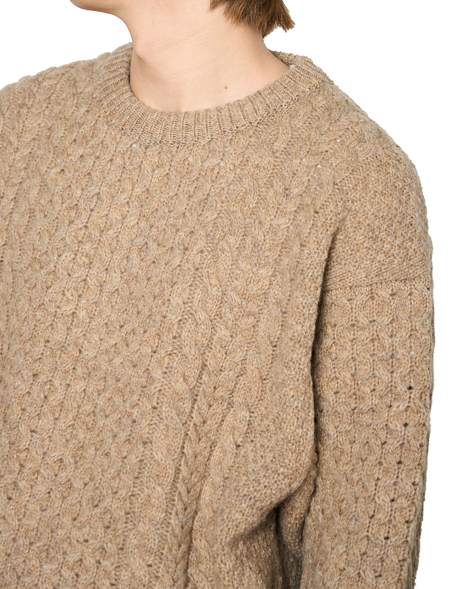糸はハリのあるドライな風合いのウール糸を使用し、 ハリのある素材がケーブル編みを際立たセているのも魅力的。袖口は指貫仕様になっているので、手袋が不要なシーンもあるかもしれません。