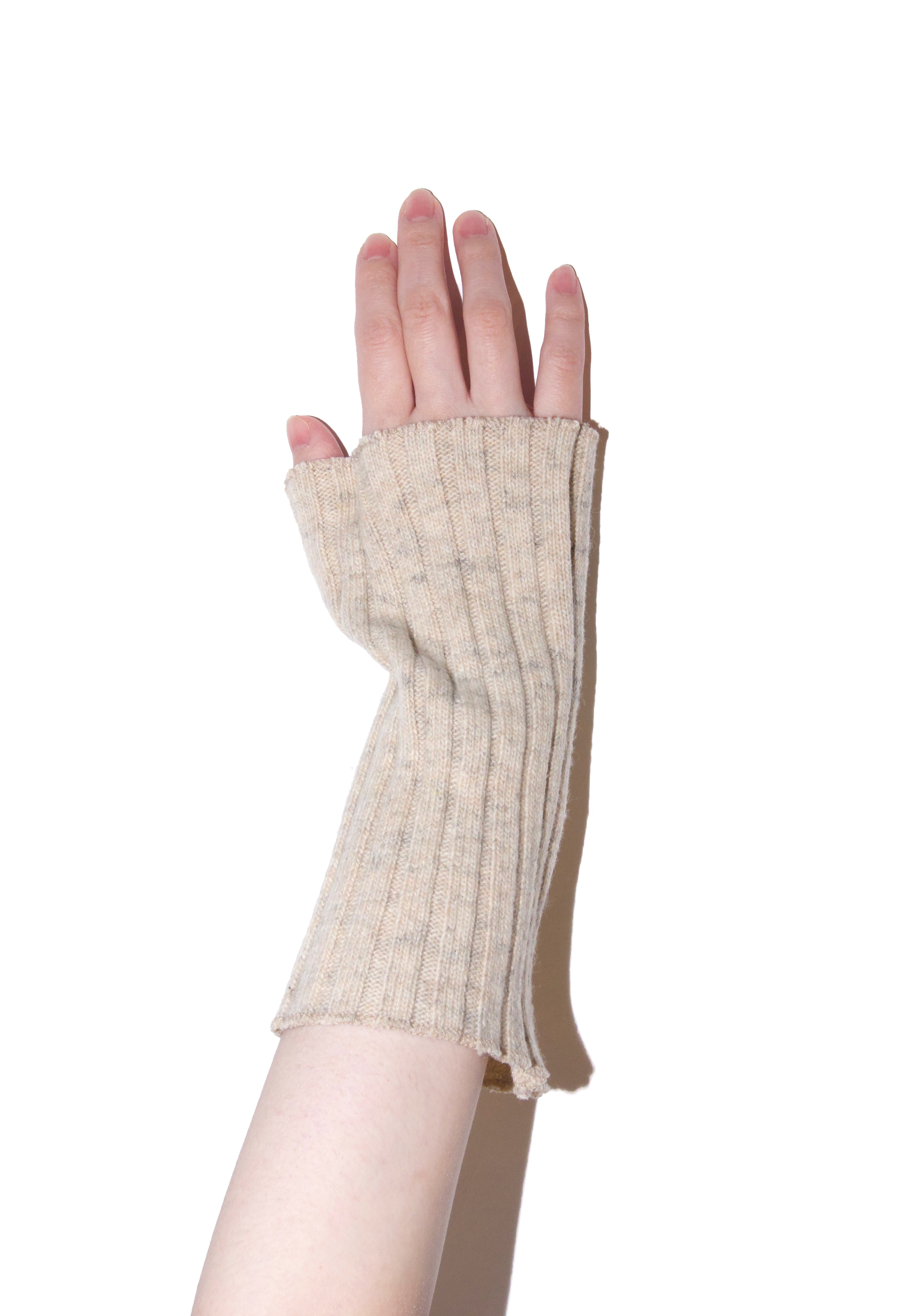 ”軍手”をイメージして作られたアームウォーマー。素材は太番手紡毛糸を限界まで打ち込んで編んだウールリブニット素材で、生地にストレスをかけない様に低速で編み上げ、 整理段階で型に入れ熱圧縮し、凹凸を作ることで粗野な雰囲気を纏います。