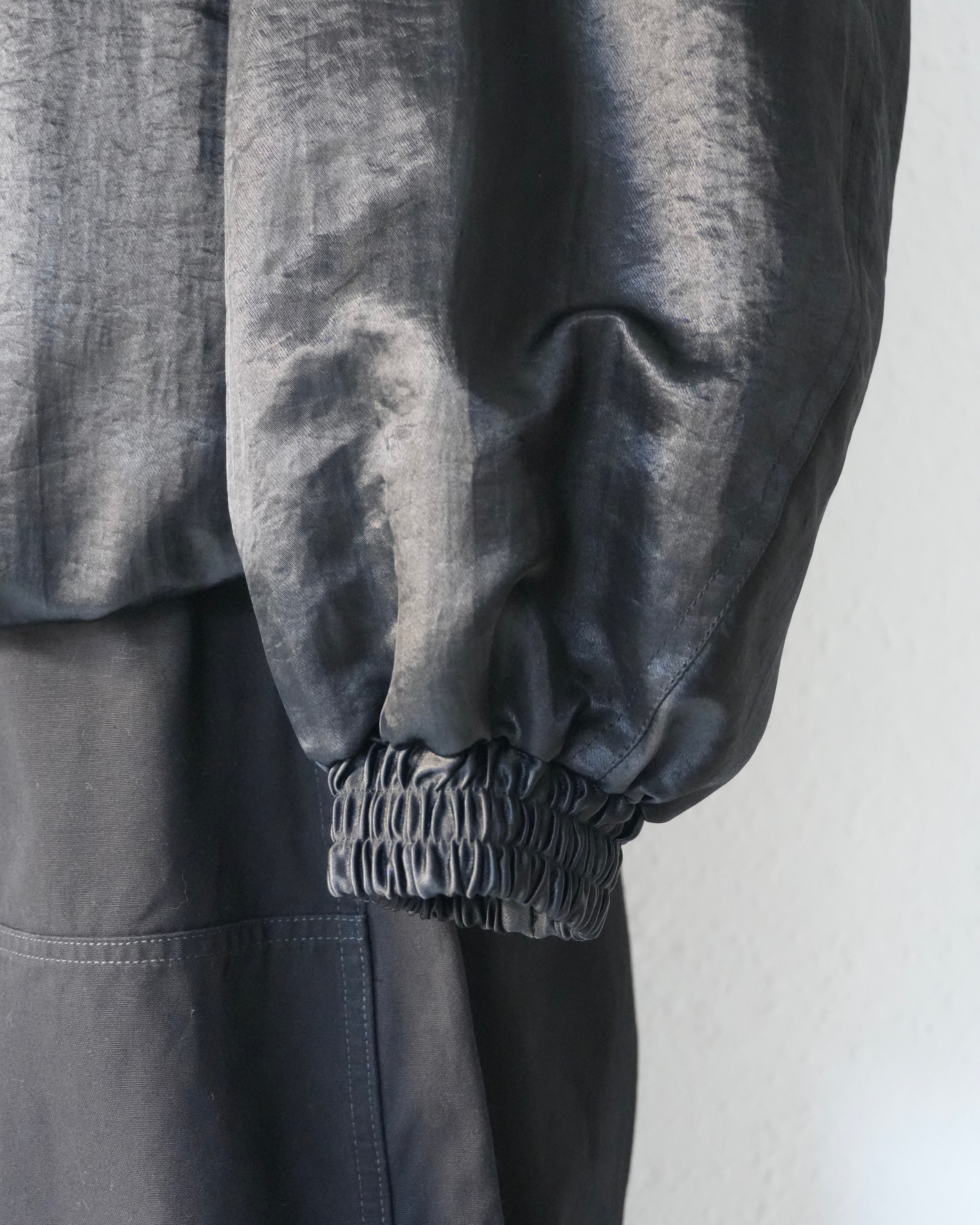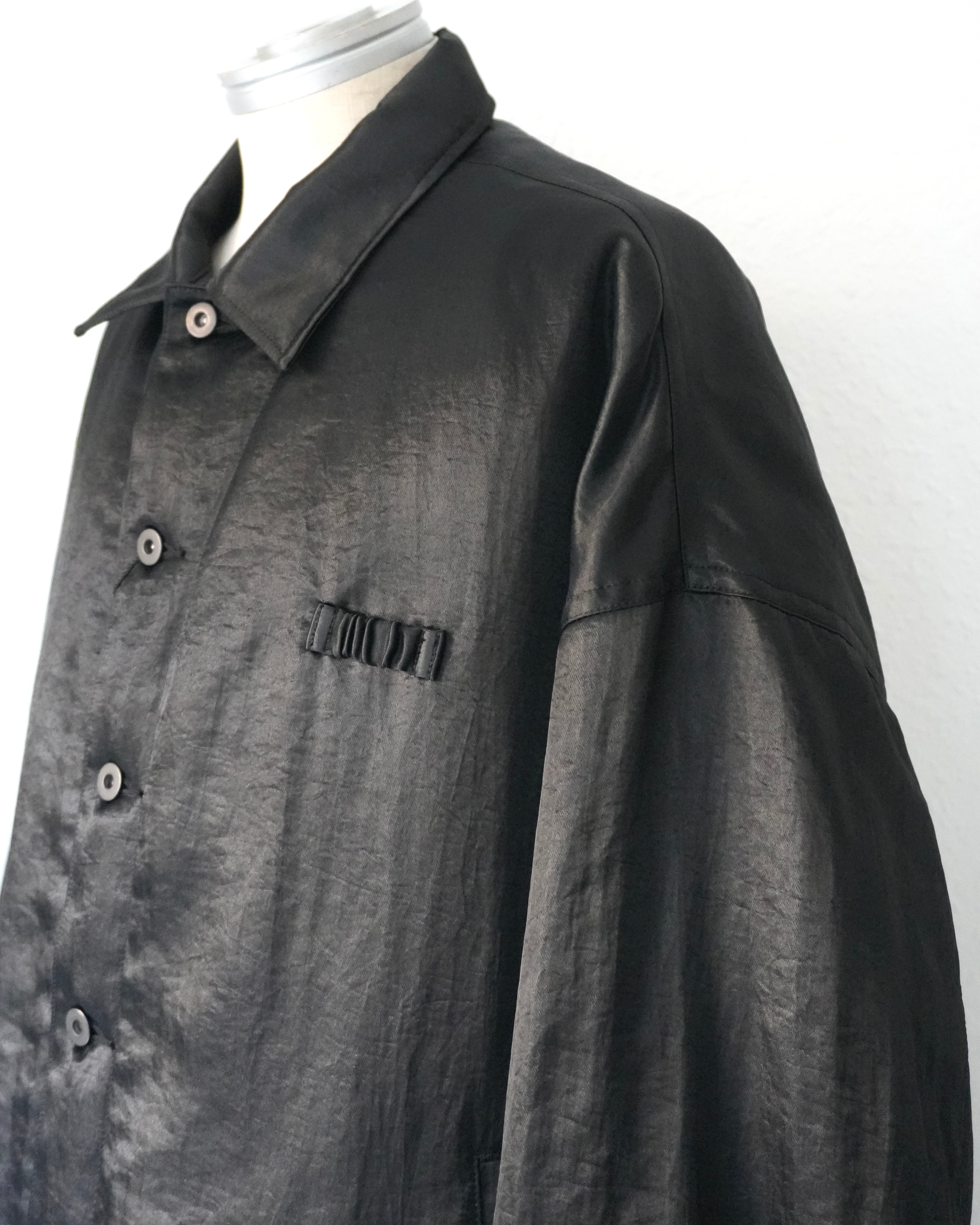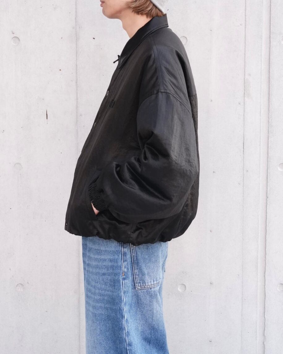 歴史的ワークウェアから各ディテールを取り除き、 ナイロンサテンにコーティングを施し、タンブラー加工によってヴィンテージ感のある光沢を表現したナイロンジャケット。左胸には、refomedの象徴ともいえるゴムディテールで表現したタグを配し、アイコニックなアクセントを加えています。トラッカージャケットとコーチジャケットなど、様々なディテールが混在しているのが特徴的。