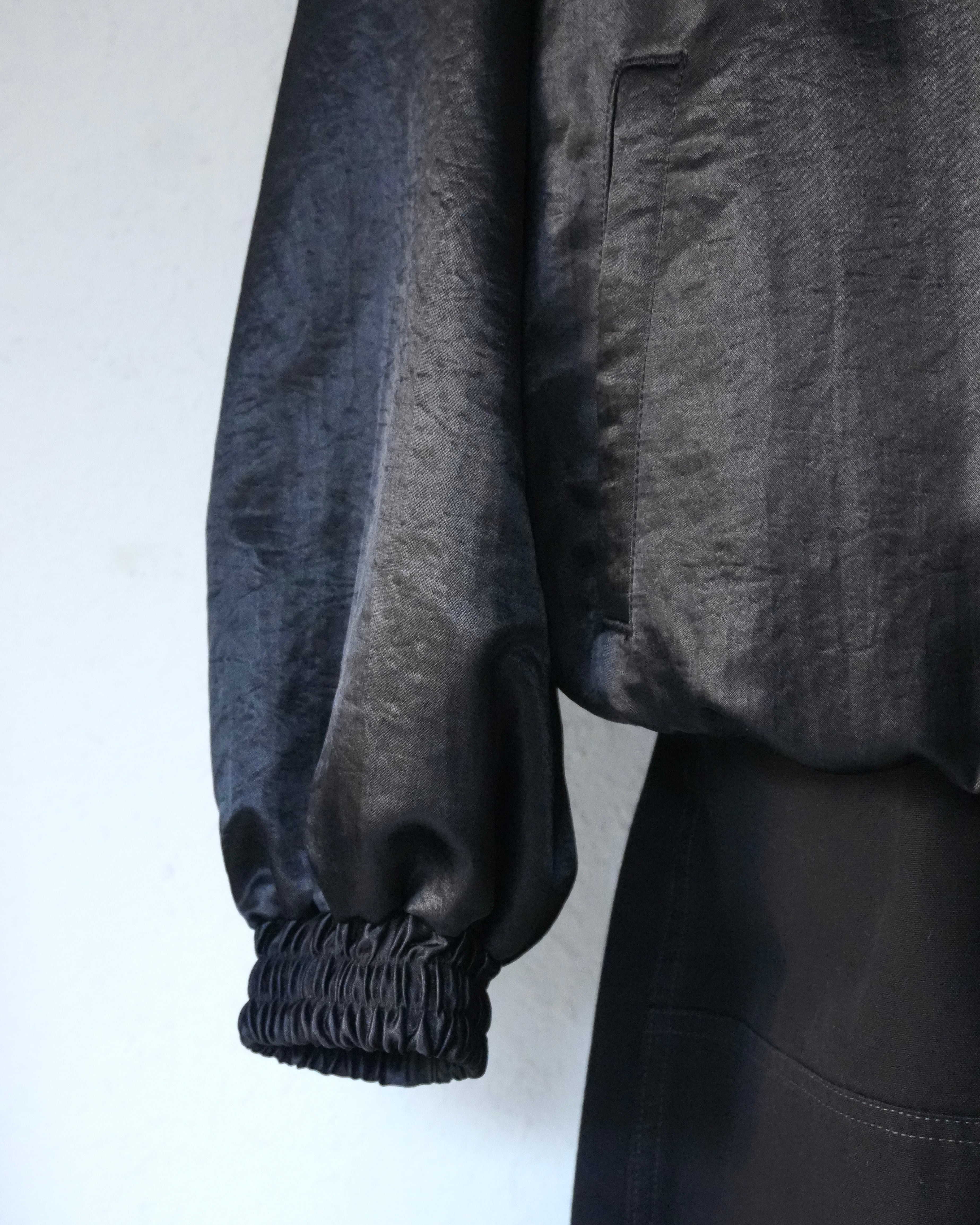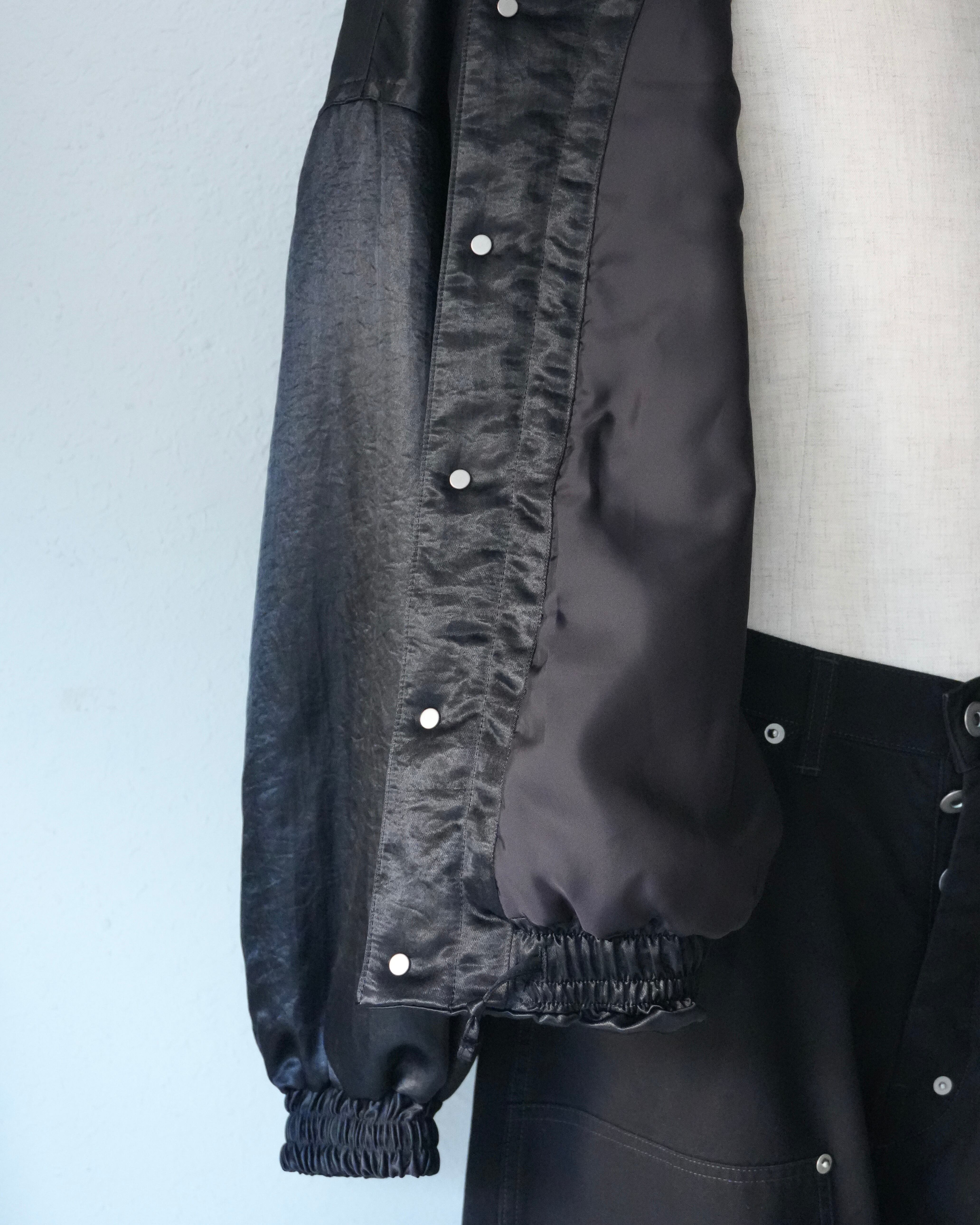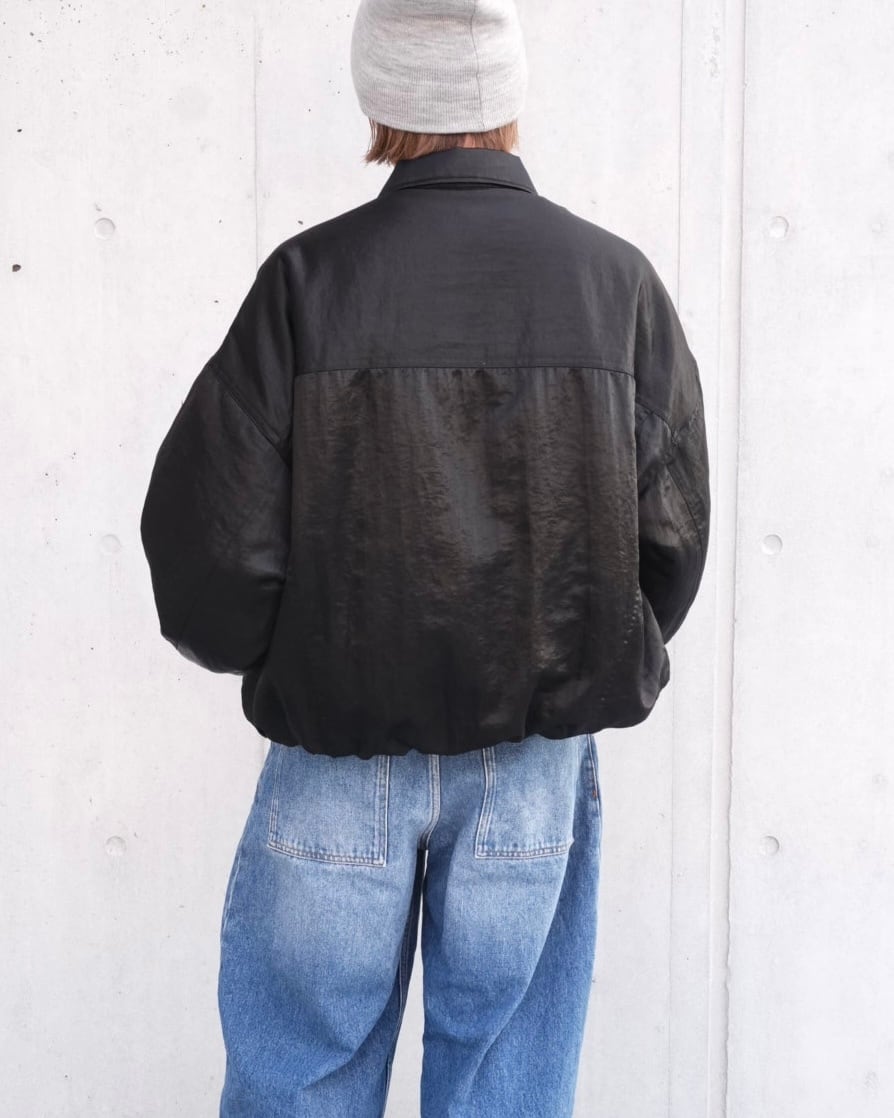歴史的ワークウェアから各ディテールを取り除き、 ナイロンサテンにコーティングを施し、タンブラー加工によってヴィンテージ感のある光沢を表現したナイロンジャケット。左胸には、refomedの象徴ともいえるゴムディテールで表現したタグを配し、アイコニックなアクセントを加えています。トラッカージャケットとコーチジャケットなど、様々なディテールが混在しているのが特徴的。