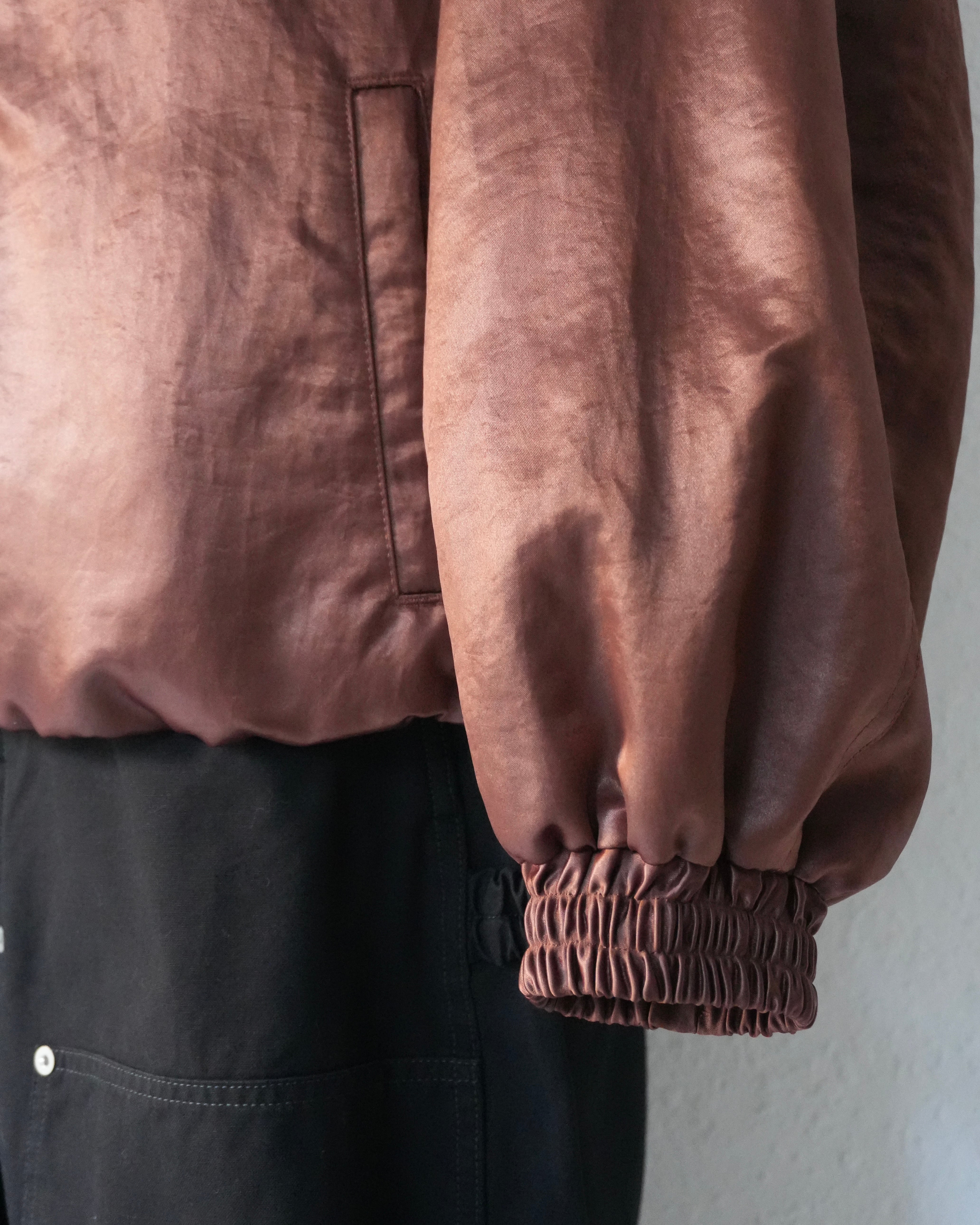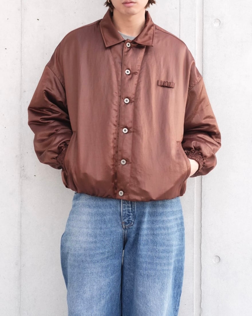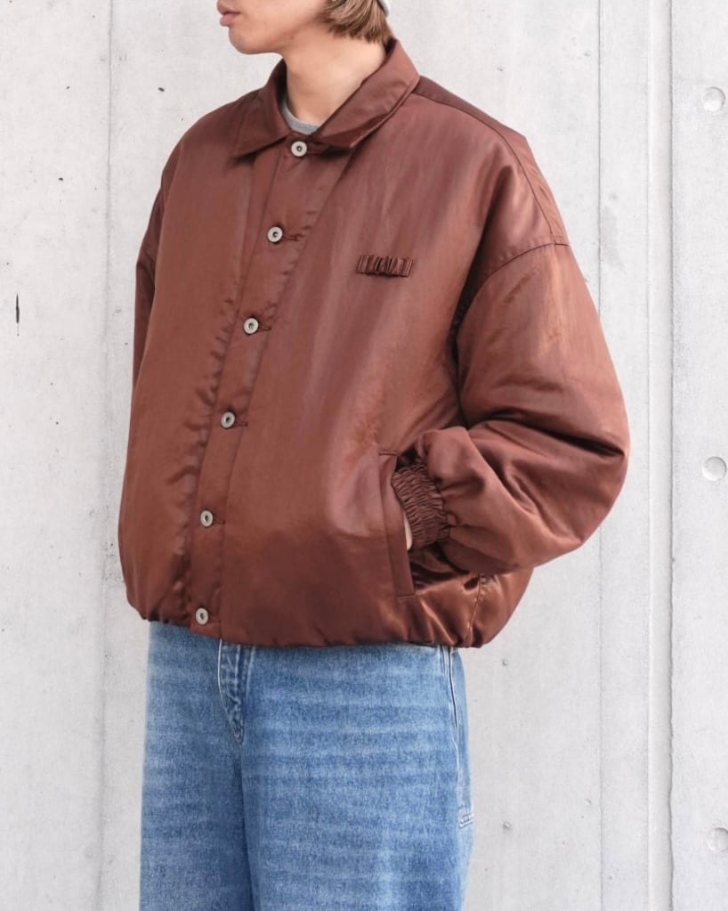 歴史的ワークウェアから各ディテールを取り除き、 ナイロンサテンにコーティングを施し、タンブラー加工によってヴィンテージ感のある光沢を表現したナイロンジャケット。左胸には、refomedの象徴ともいえるゴムディテールで表現したタグを配し、アイコニックなアクセントを加えています。トラッカージャケットとコーチジャケットなど、様々なディテールが混在しているのが特徴的。