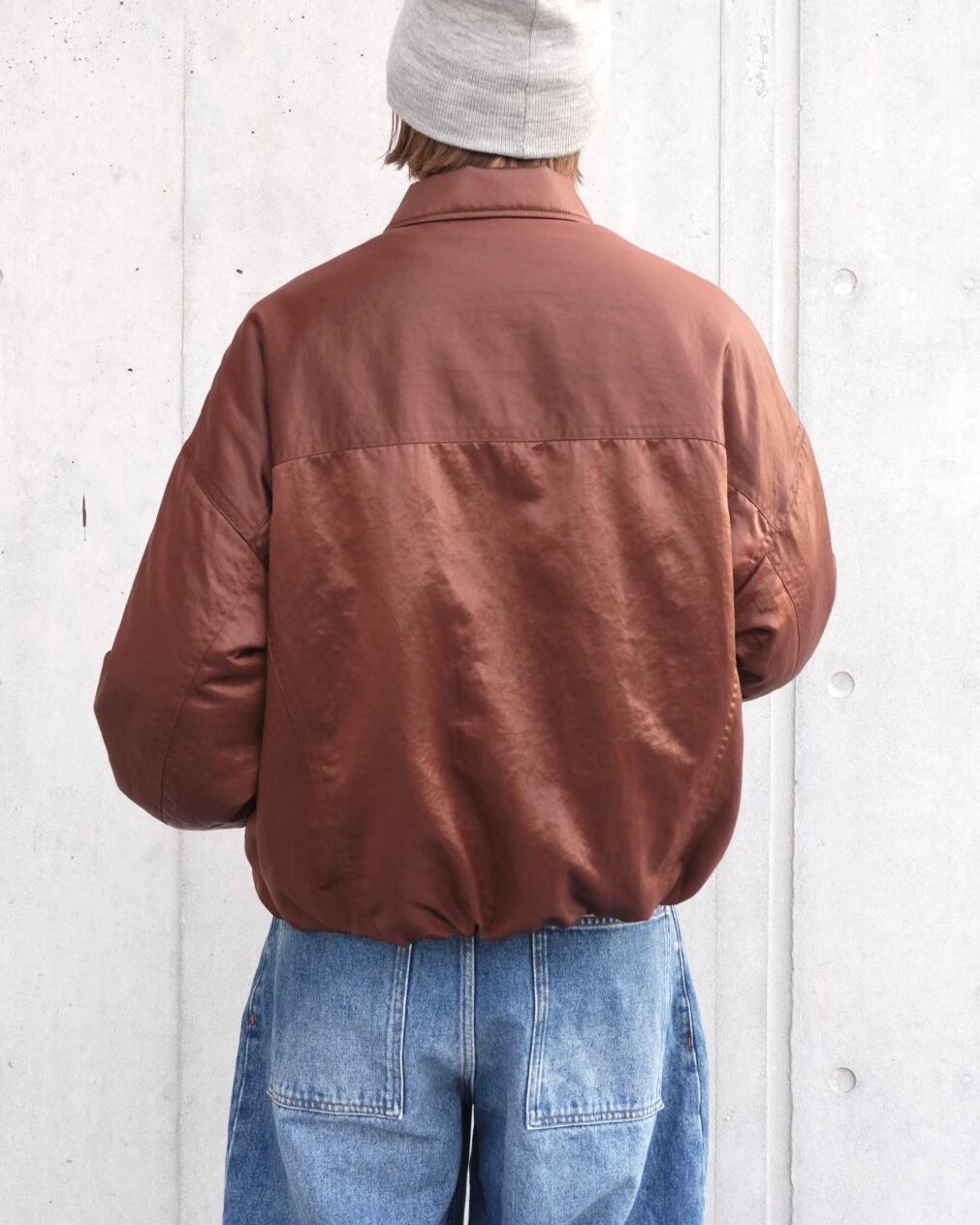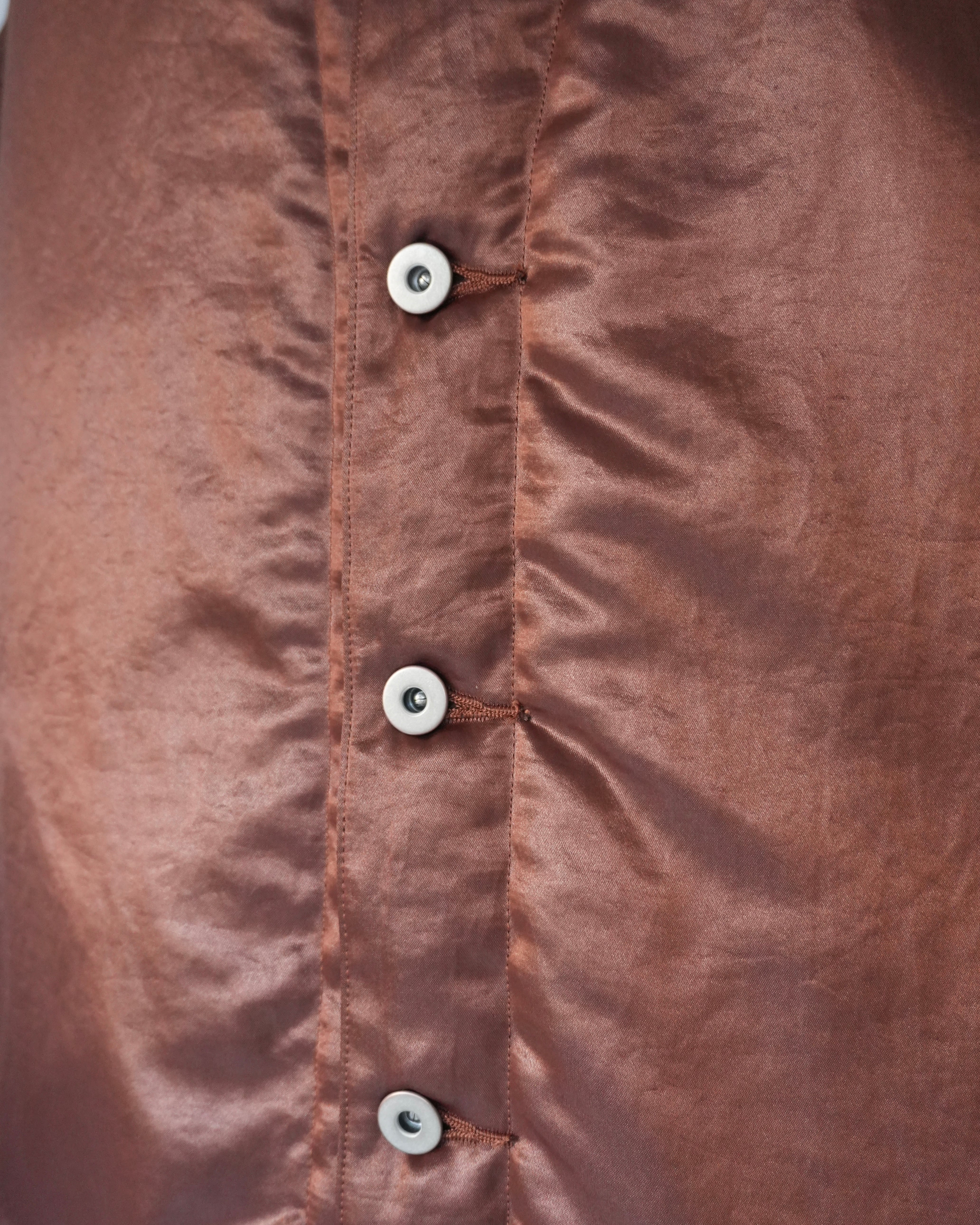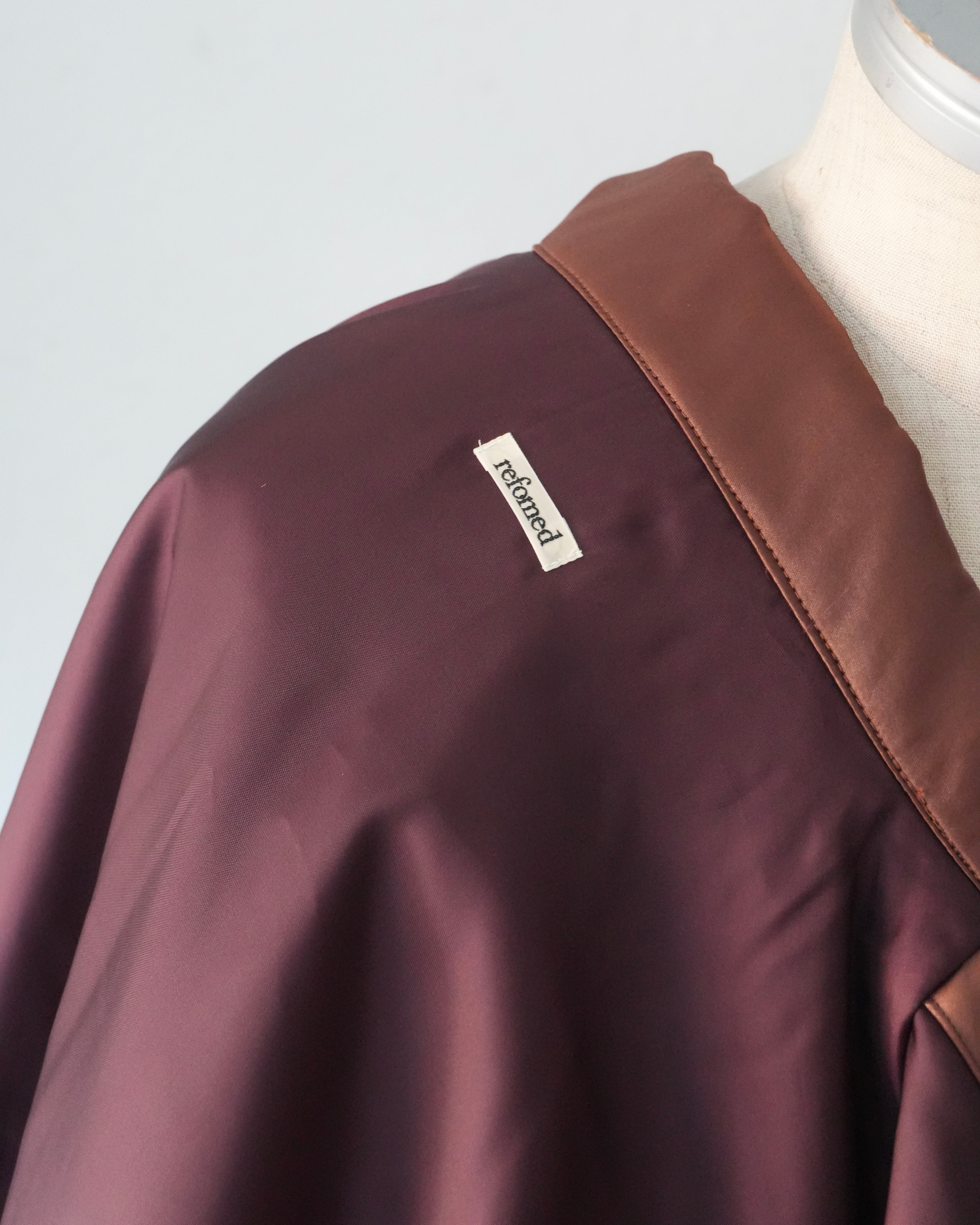 歴史的ワークウェアから各ディテールを取り除き、 ナイロンサテンにコーティングを施し、タンブラー加工によってヴィンテージ感のある光沢を表現したナイロンジャケット。左胸には、refomedの象徴ともいえるゴムディテールで表現したタグを配し、アイコニックなアクセントを加えています。トラッカージャケットとコーチジャケットなど、様々なディテールが混在しているのが特徴的。