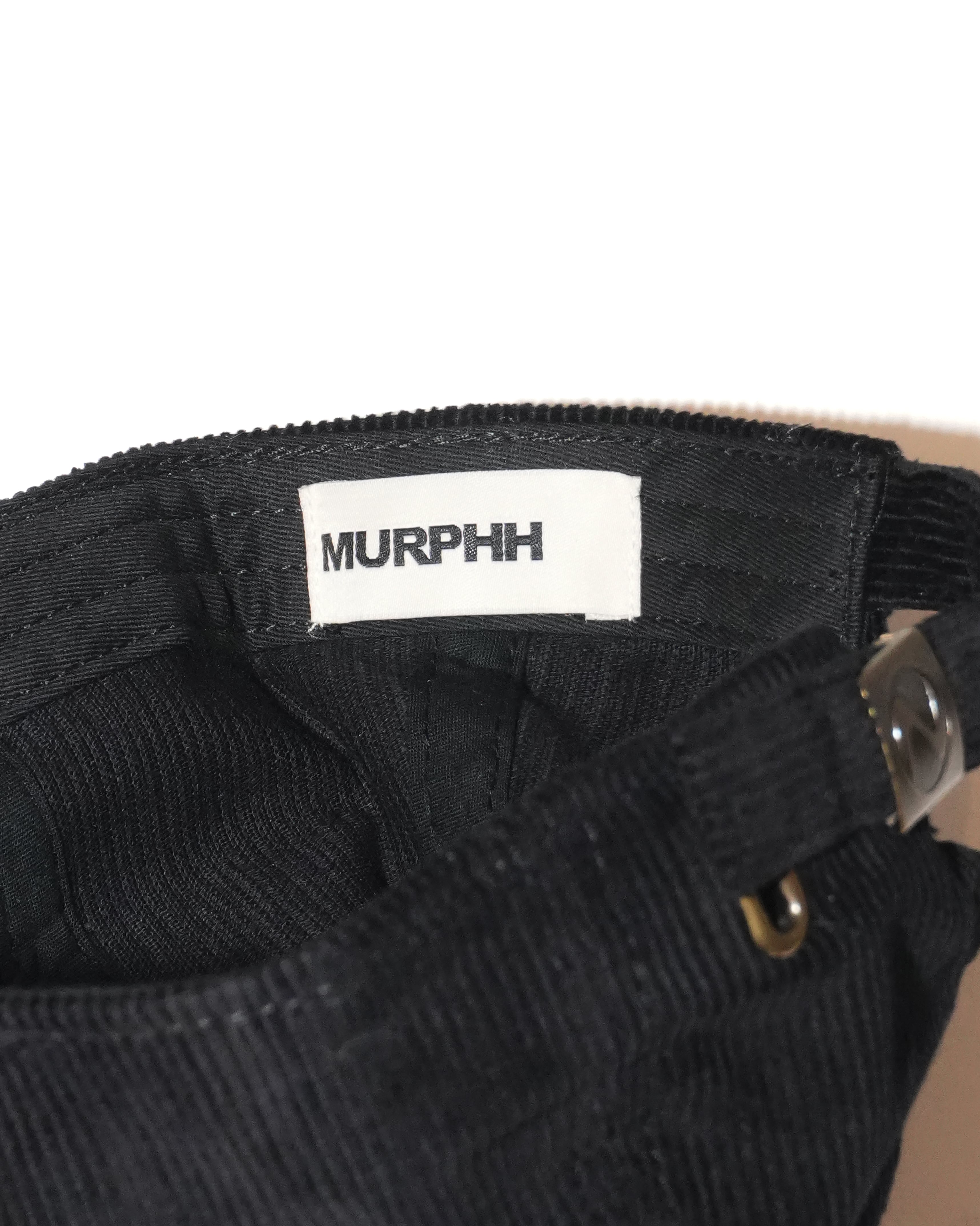 コンセプトを刺繍したベースボールキャップ。深みが出て秋冬のムードに馴染むコーデュロイを使用し、使い込んだ後の表情も楽しみです。バックには”MURPHH”を4mm傾けて刺繍。