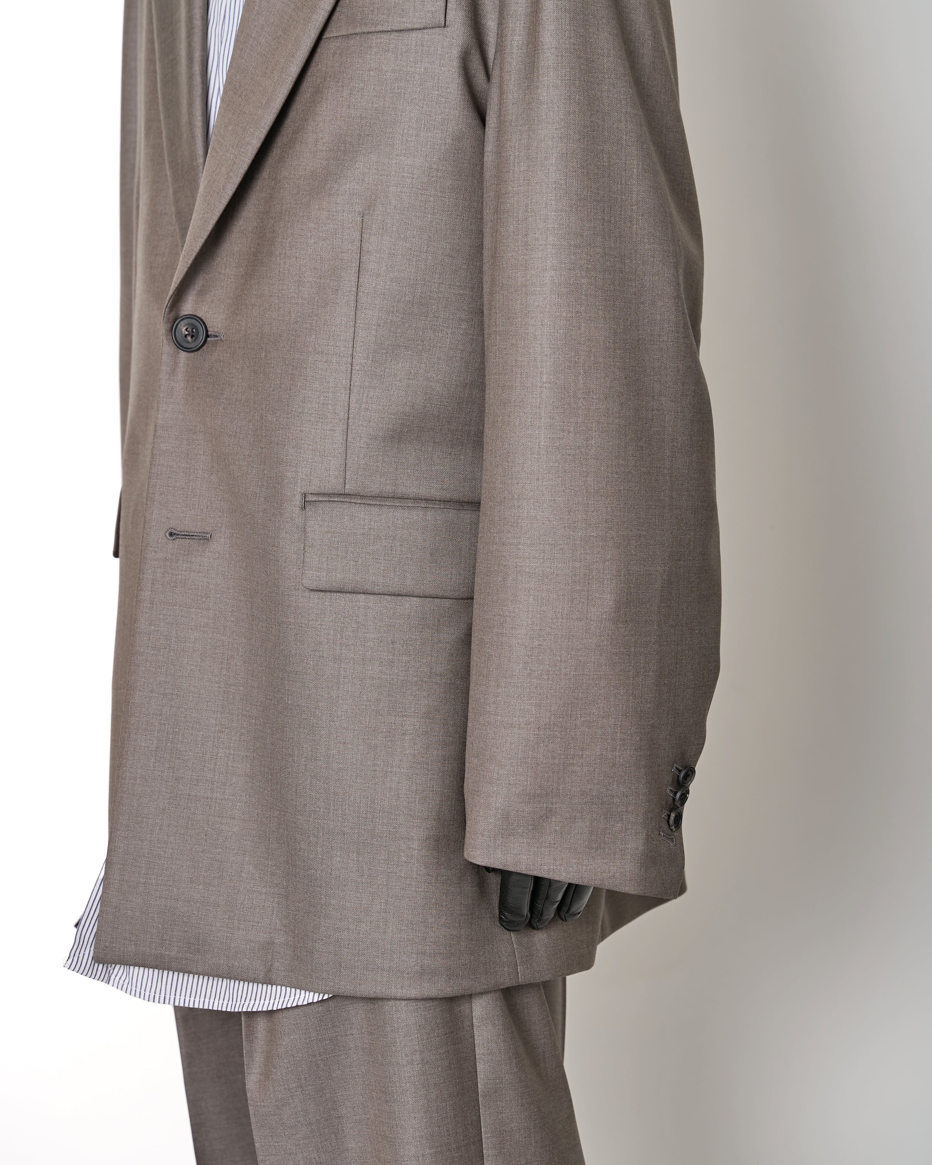 ANGELICO社の非常に上質なSuper140’s WOOL TWILLを使用した定番のロングジャケット。圧倒的な原料の良さから生まれる自然な光沢と、ドレープ性が最大の特徴。独特なFinishing工程を施し、Woolの上品な艶感を引き出しています。