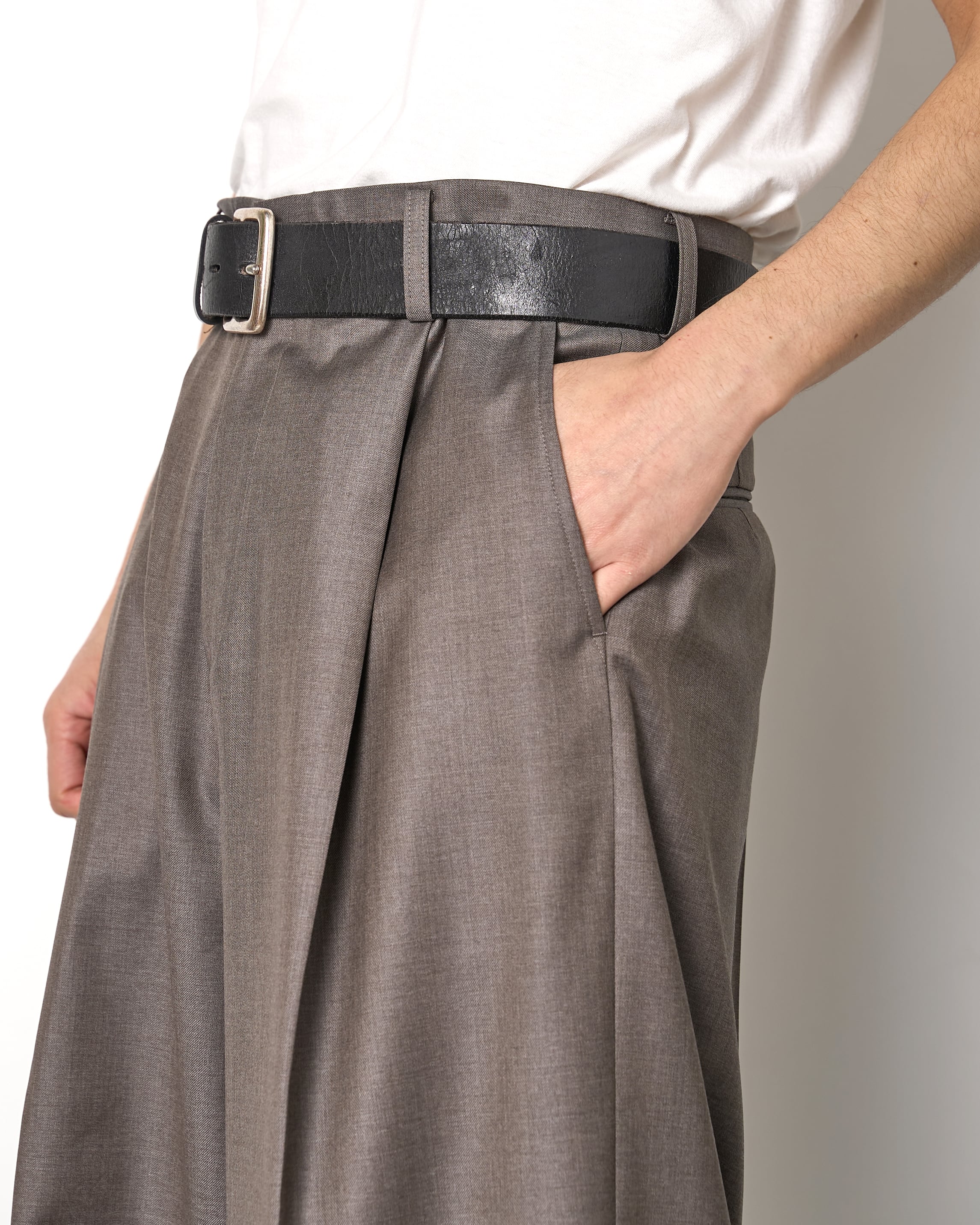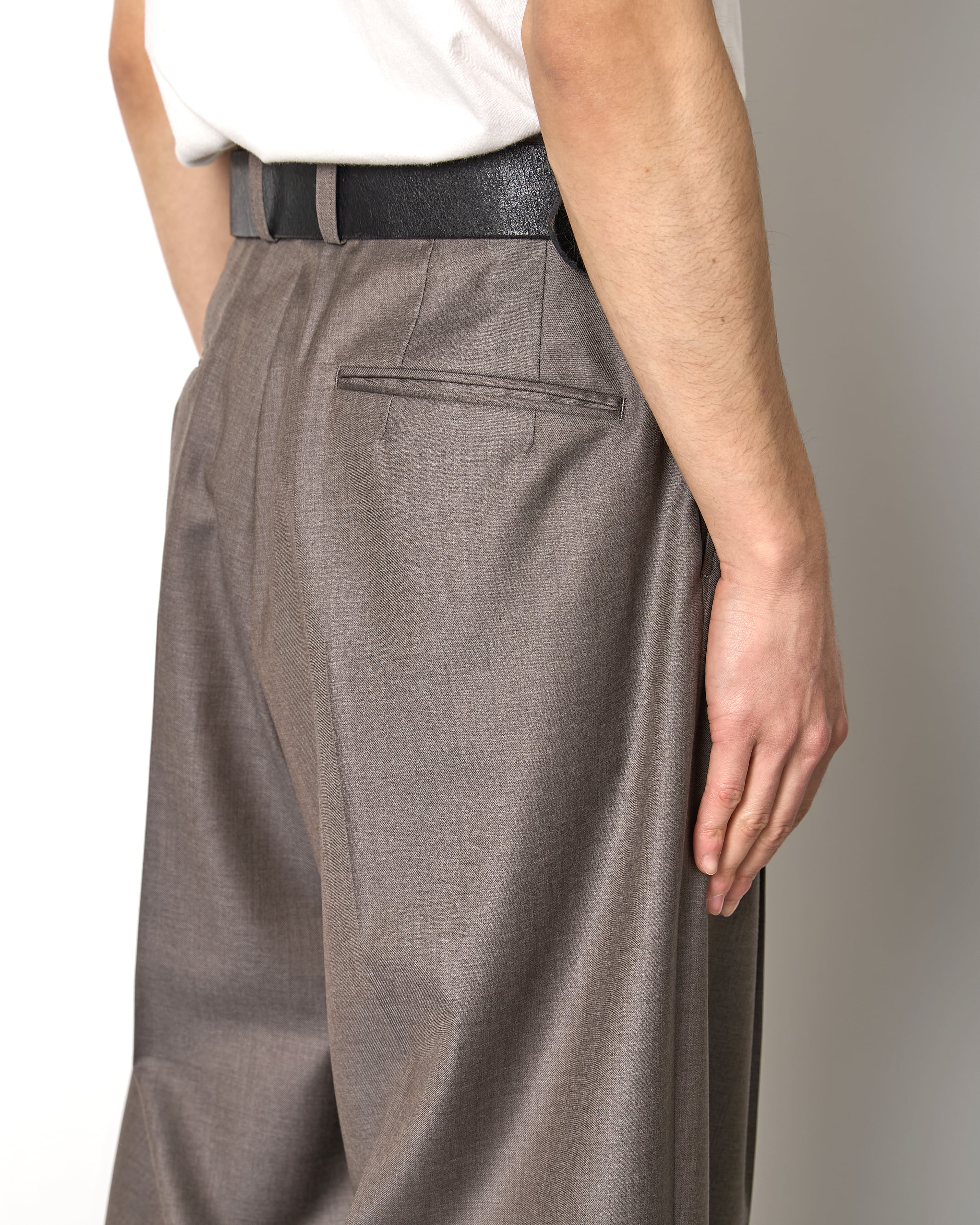 ANGELICO社の非常に上質なSuper140’s WOOL TWILLを使用した、わたり幅から裾幅までスーパーワイドに設定している深めのワンタックトラウザーズ。腰回りはすっきりとしたフィット感になるよう調整し、ワイドなシルエットながら上品な、エレガントなバランスは、セーターやスウェットだけで様になり、コートなどにもボリューム負けしないインパクトのある一本。