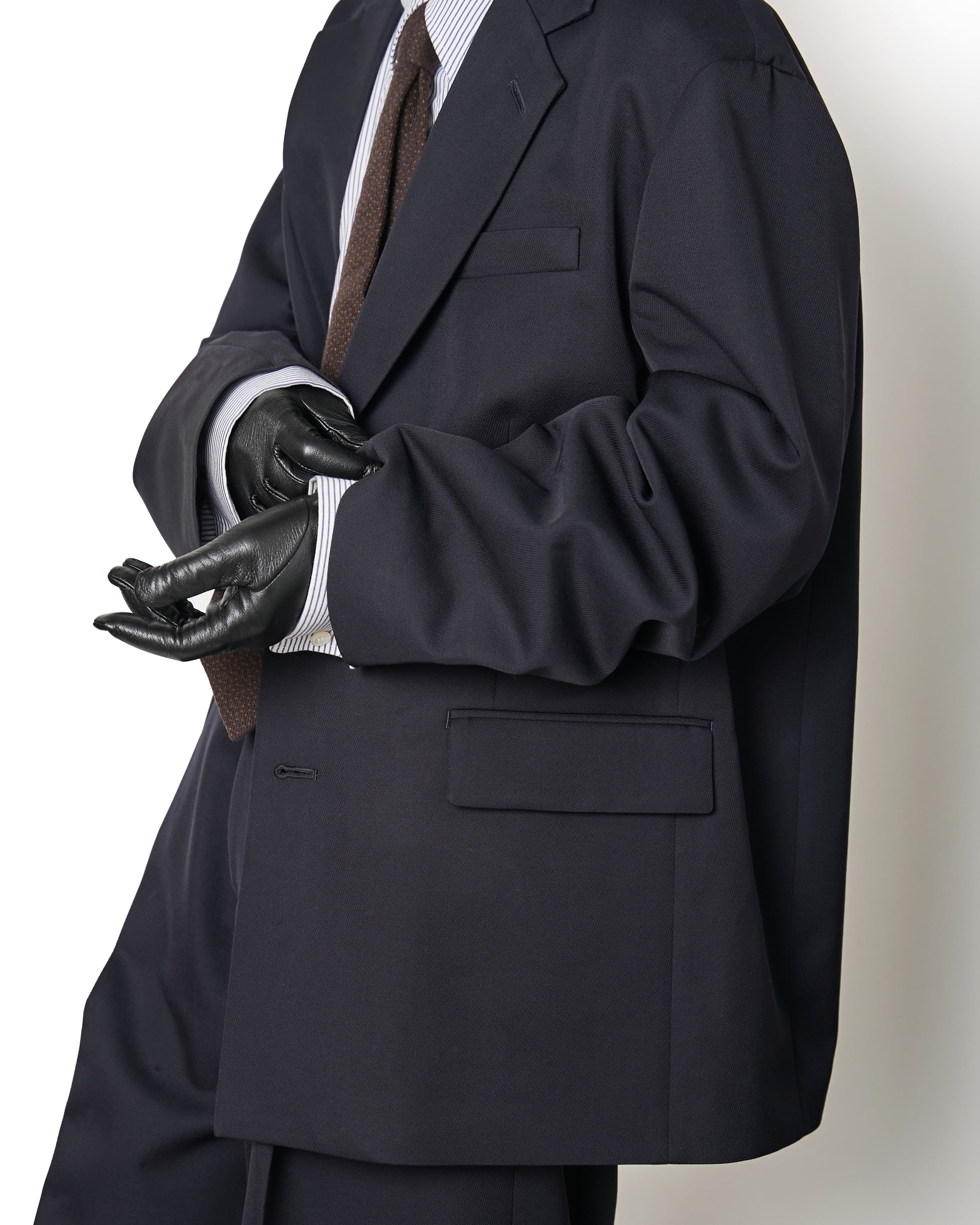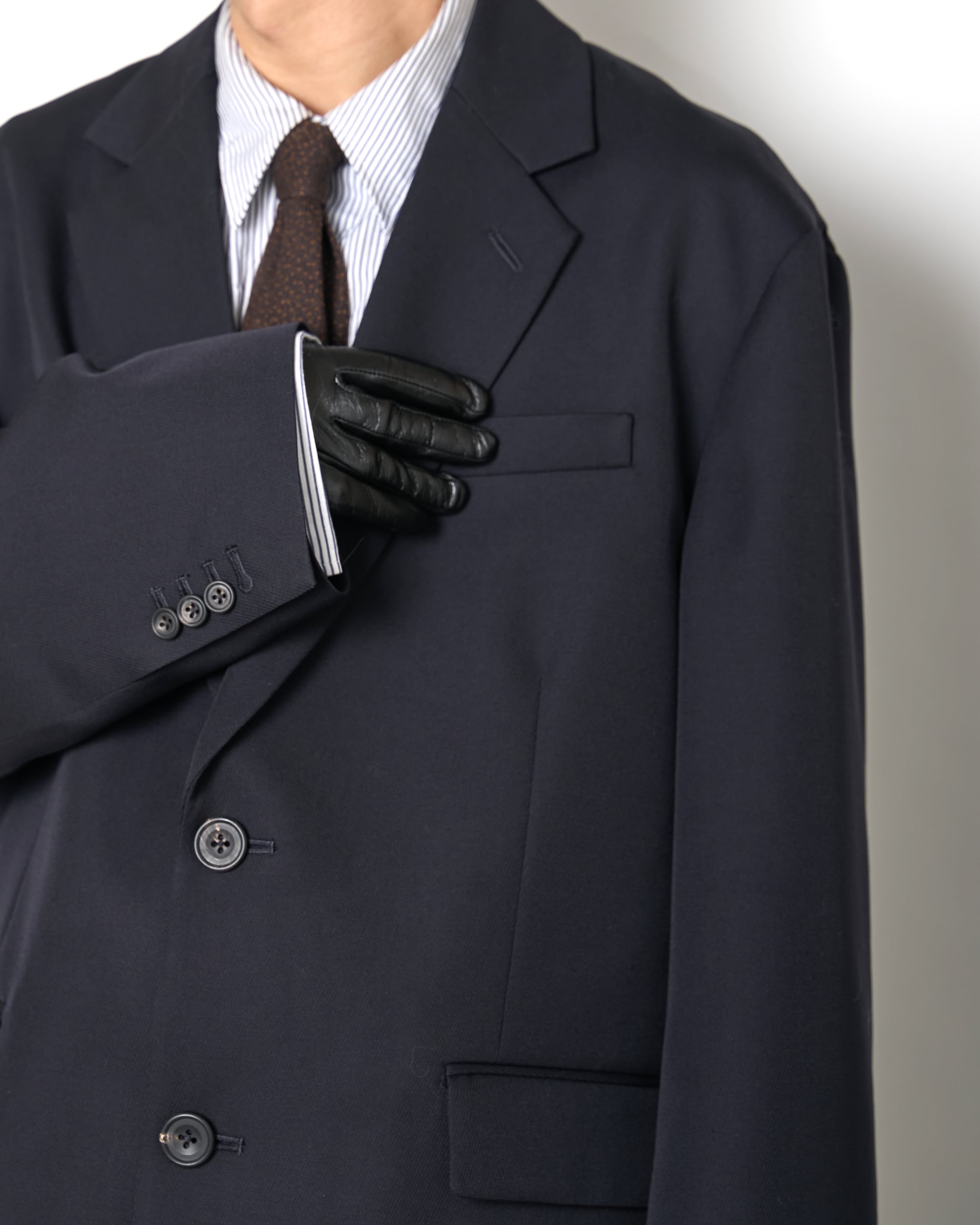 タテ×ヨコ上質なSuper100’s原料の80番双糸を贅沢に使用した、畝感をしっかり出す為にカルゼ組織に織り上げたジャケット。従来のロングジャケットに比べて着丈など、全体的なバランスをコンパクトに仕上げているのが特徴ですが、広めにとられた肩幅、身幅に対して縦方向のシルエットの出るよう肩周りの山の角度、袖の長さを調整。モードな雰囲気を醸し出しつつも、クラシックな印象を与えるような落ち着いた仕上がりとなっています。