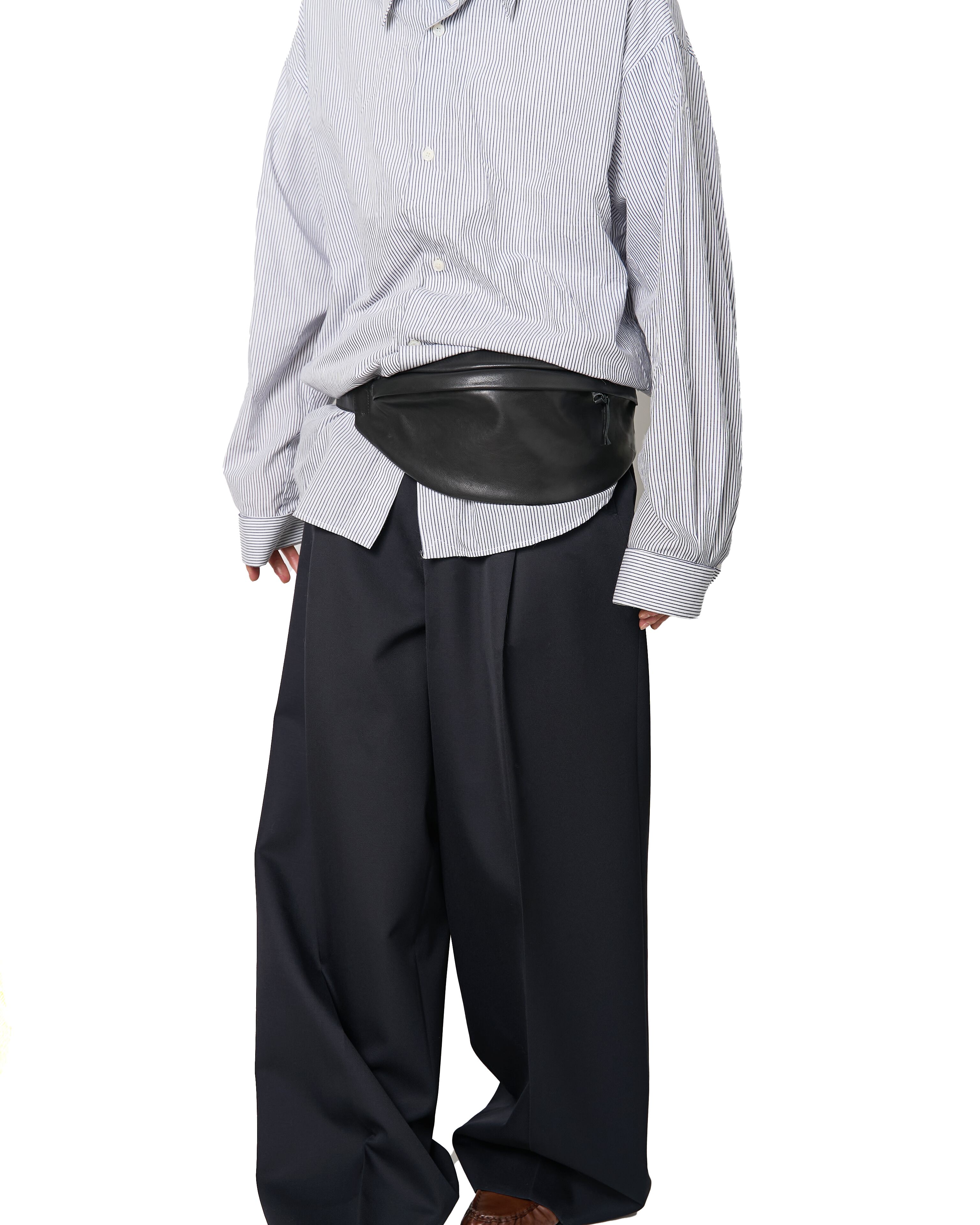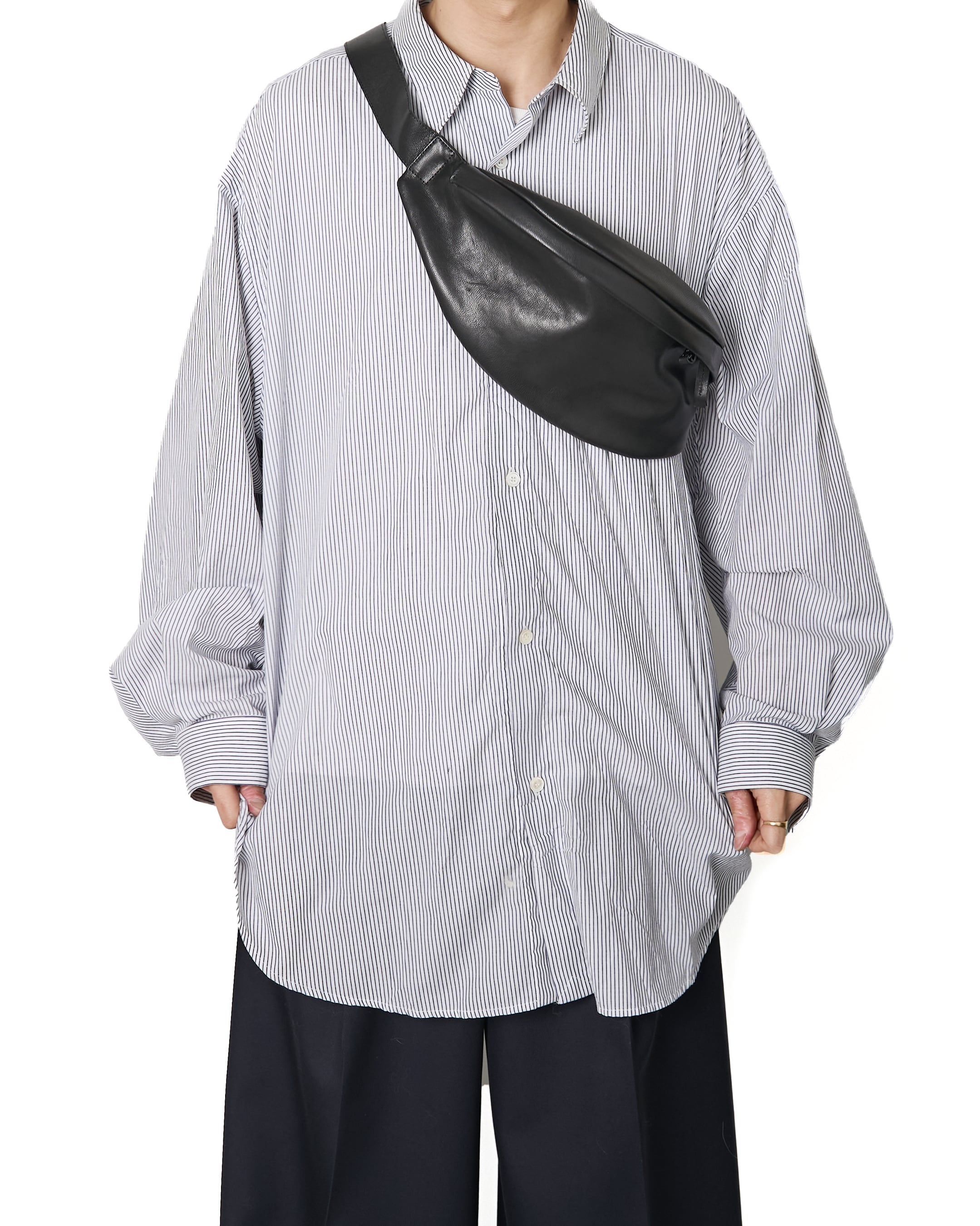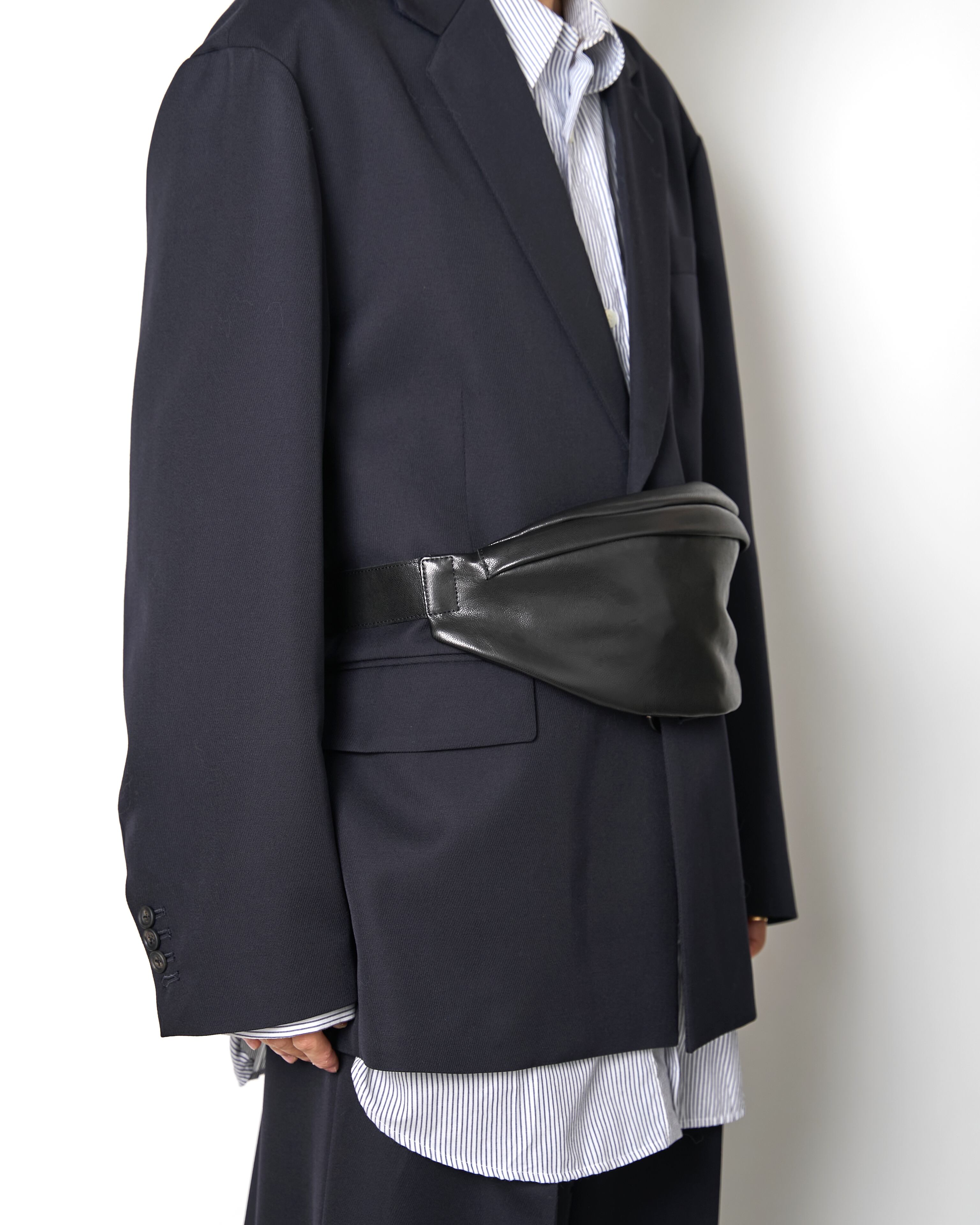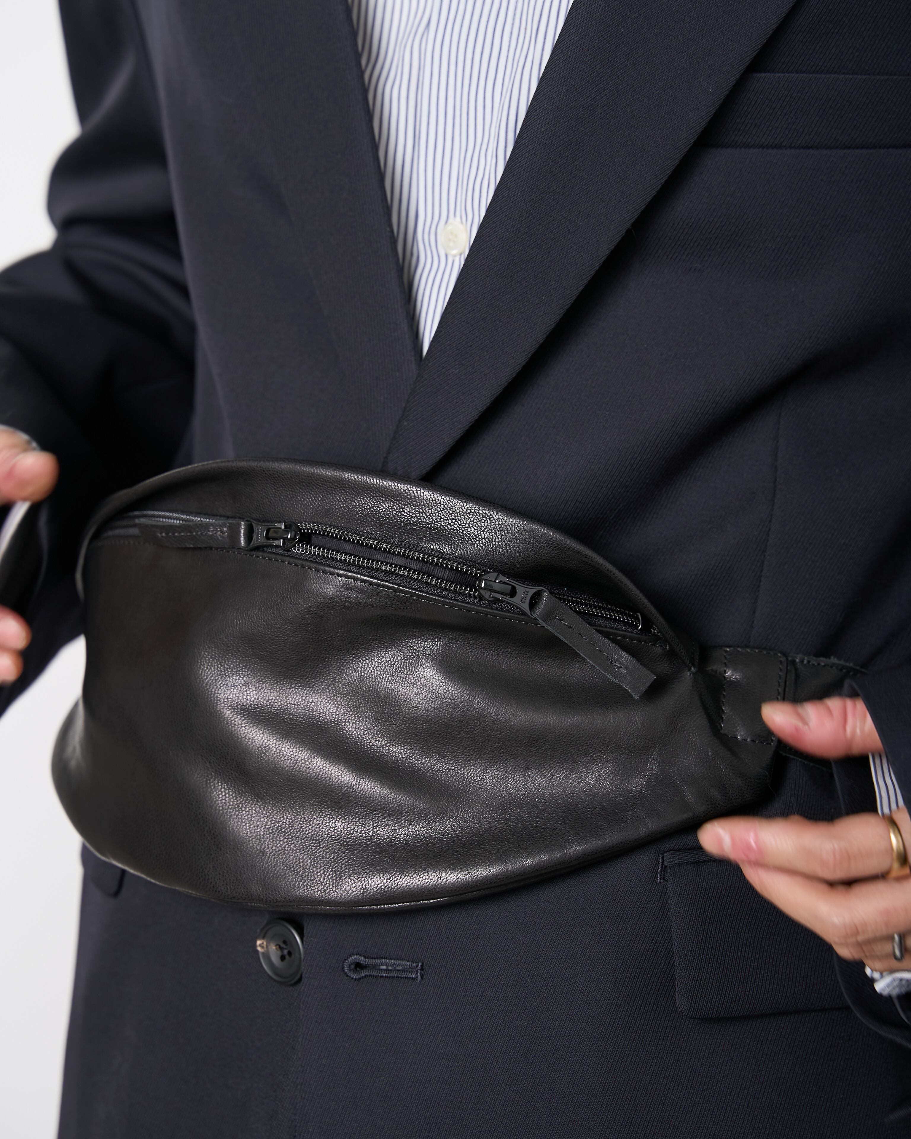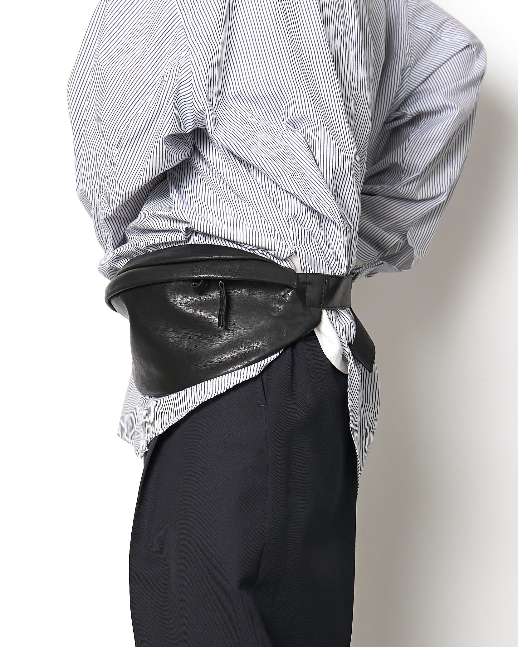ゴートレザーを使用したミニマルな雰囲気のウエストバッグ。やや大きめに作られ、財布や携帯など、最低限の収納が可能な仕上がりです。